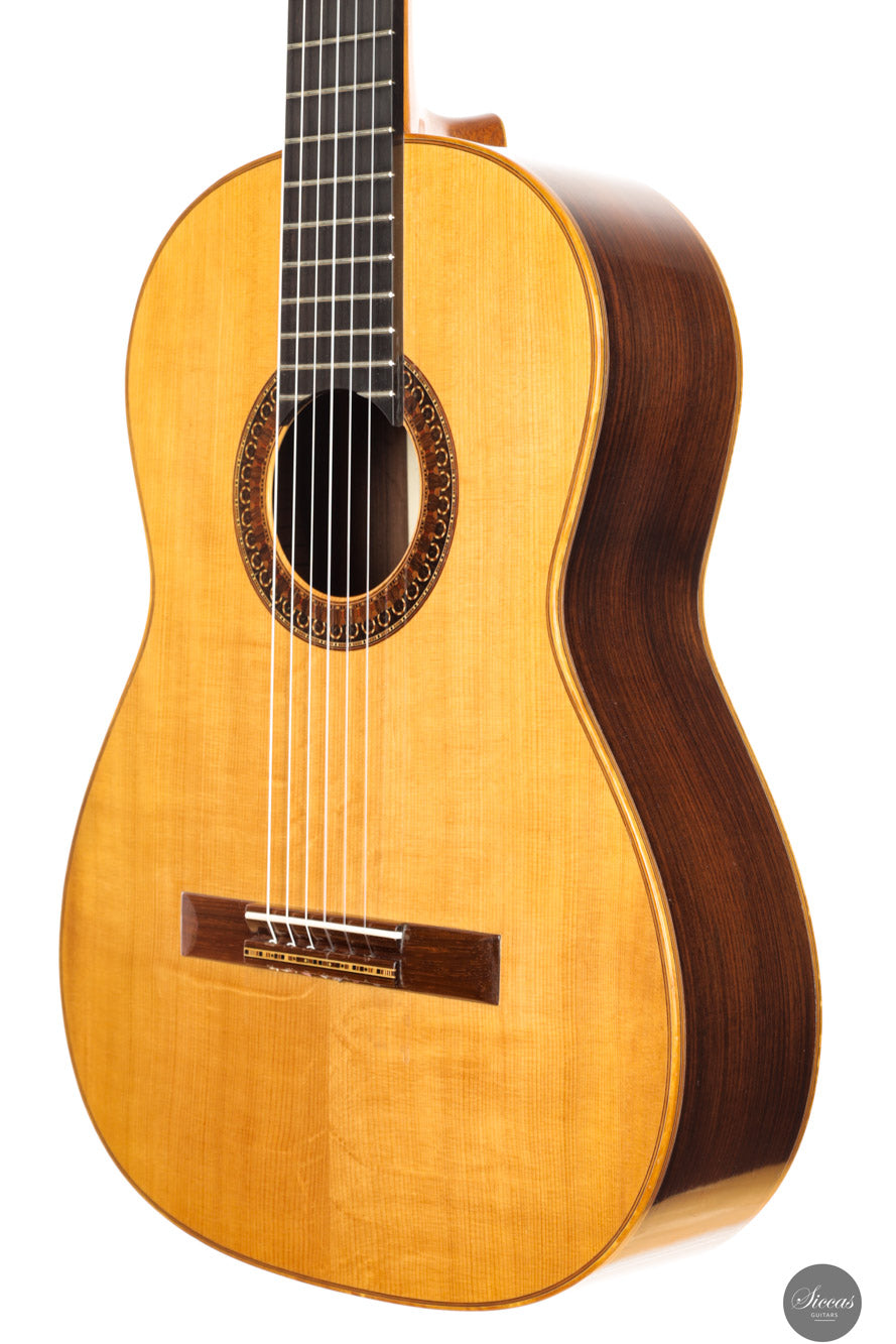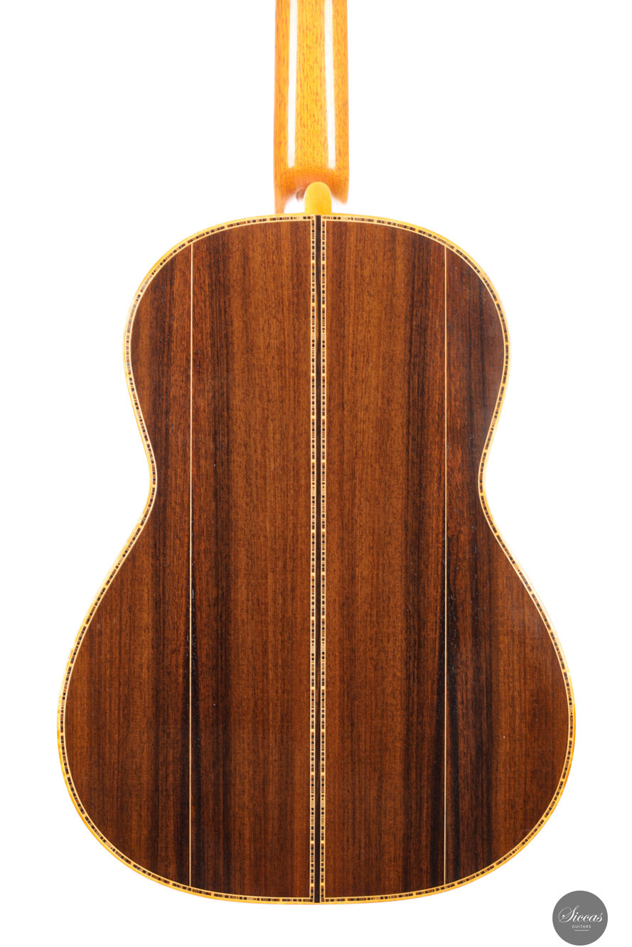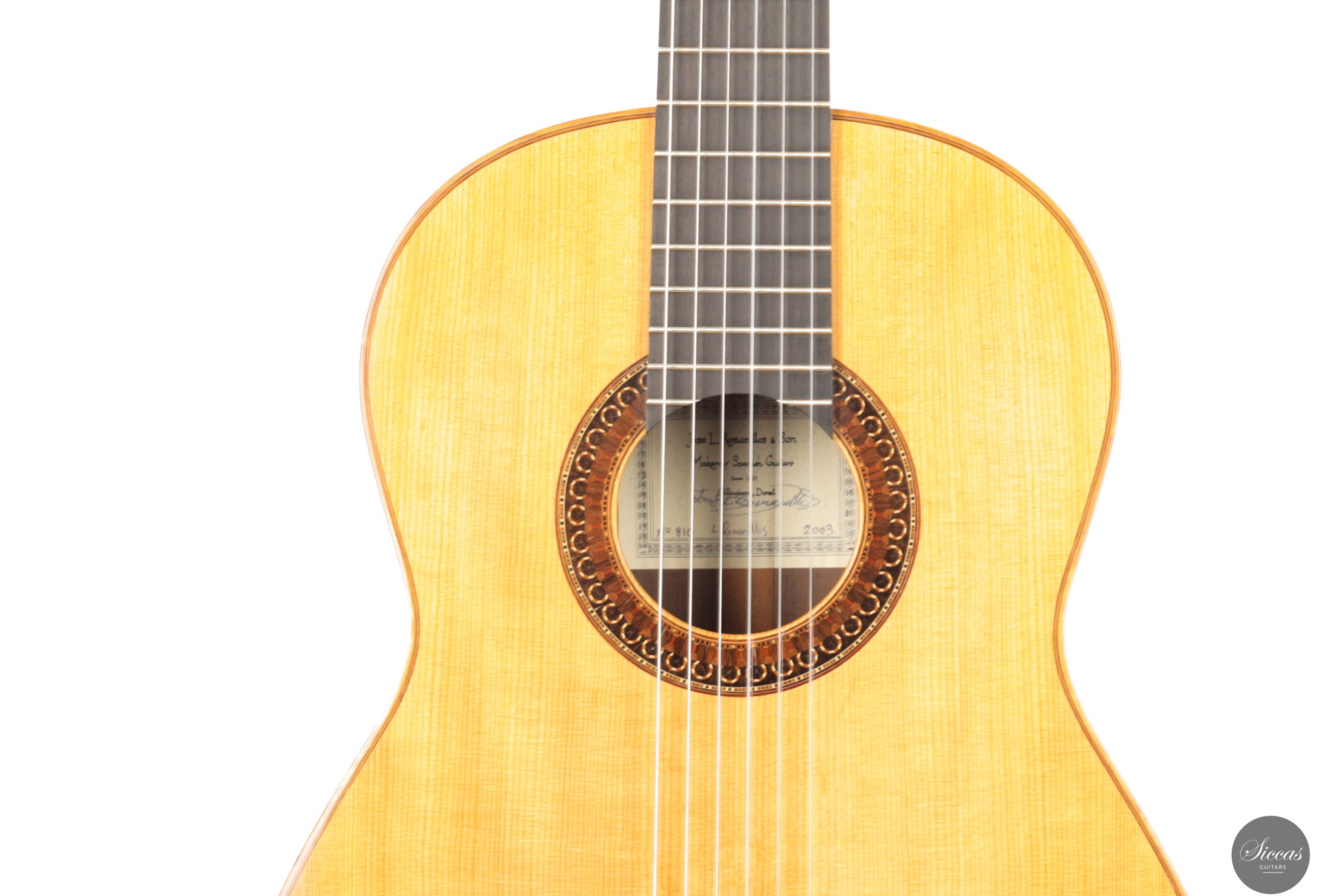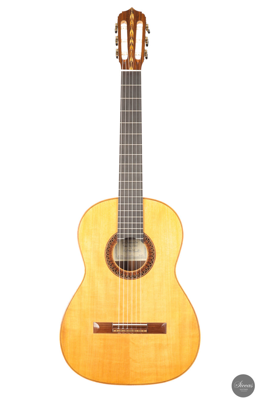 Diese wunderschöne Gitarre aus dem Jahr 2003 ist ein herausragendes Beispiel für das Können von José L. Romanillos und kann sogar als eines seiner besten Werke angesehen werden. Die Gitarre trägt den Namen „La Lluvia“ („Der Regen“) und ist mit der Nummer 810 versehen. Sie zeichnet sich durch eine besonders reichhaltige Verzierung aus. Eine besonders bemerkenswerte Eigenschaft ist die außergewöhnlich tiefe Korpusresonanz zwischen E und F – ein seltenes Merkmal bei Romanillos-Gitarren – das dieser Gitarre eine ganz besondere klangliche Ausstrahlung verleiht. Der Boden ist relativ leicht und erzeugt beim Klopfen einen hellen, klaren Ton, der auf eine hohe Frequenzreaktion hinweist. Die Höhen sind außergewöhnlich gleichmäßig und verfügen über ein langes Sustain – ein Kunststück, das nur wenigen Gitarrenbauern gelingt, vor allem in Kombination mit so tiefen und resonanten Bässen. Diese Romanillos-Gitarre aus dem Jahr 2003 wurde von José Romanillos persönlich gebaut. Es handelt sich um ein seltenes und historisch bedeutendes Instrument, das zwei originale Signaturen von José Romanillos unter der Decke trägt – ein klarer Beleg für seine direkte Urheberschaft.
