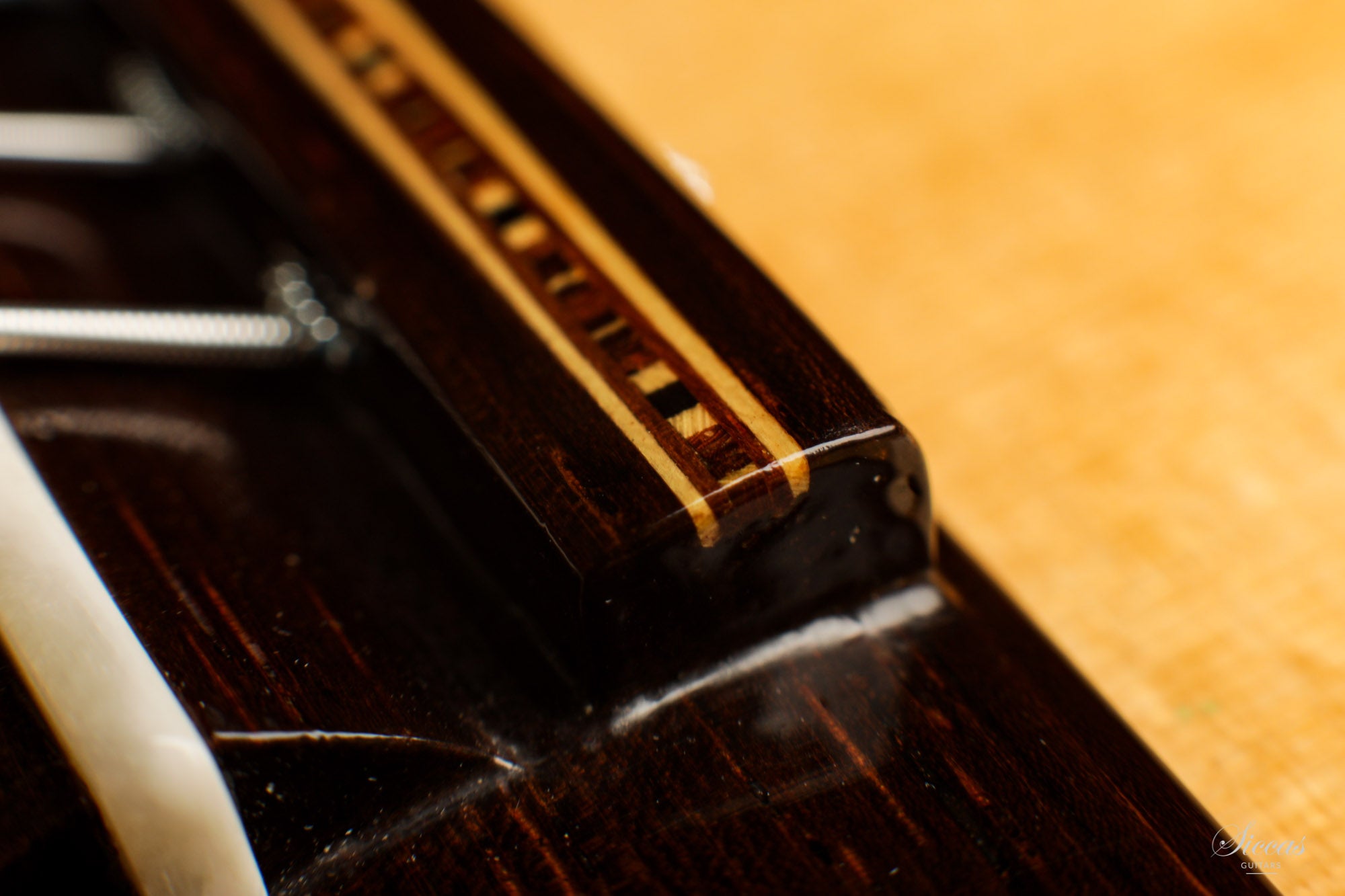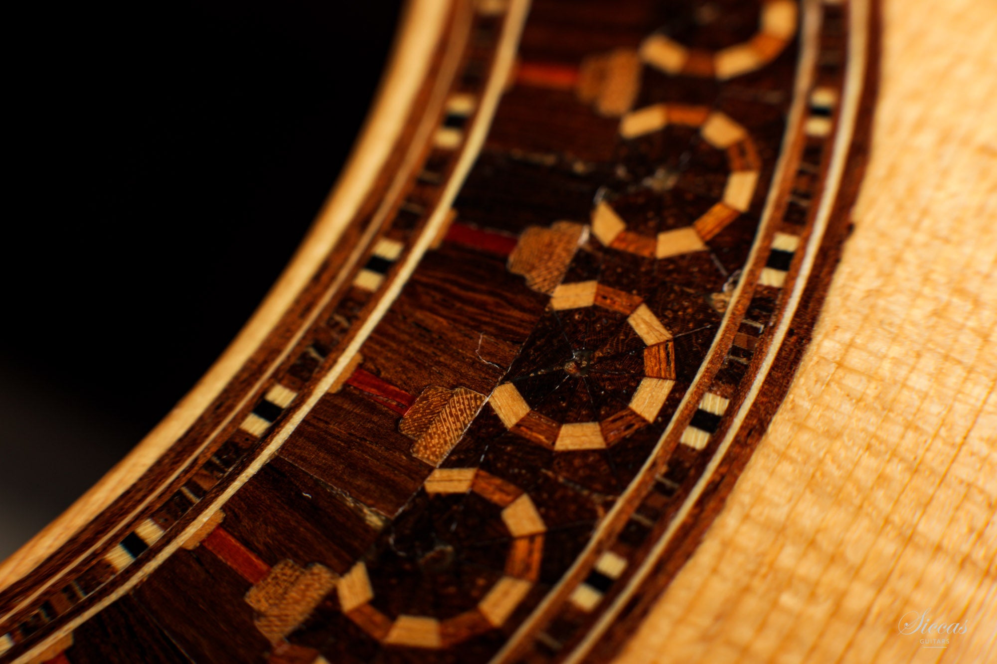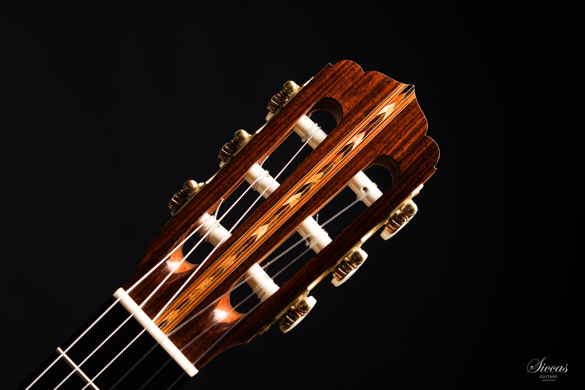 This guitar is named "La Campanula", reminiscent of the beautiful little purple Bellflower. Built in 2016 and numbered 867, it is signed on the label as well as inside the soundboard by both father and son. It is a superb concert model, richly inlaid and featuring the legendary rosette inspired by the mosque of Cordoba. The back is constructed of four pieces of Indian rosewood. The top is also shaped by four pieces, the reason was to select spruce from the most precious and best quarter sawn parts from the raw material. The latter has taken on a magnificent honey colour over the last four years and has few playing marks. A thin, superficial split of about five centimetres, parallel to the joint on the lower left bout has been perfectly stabilized. It is almost not visible and has absolutely no effect on the sound of the instrument.