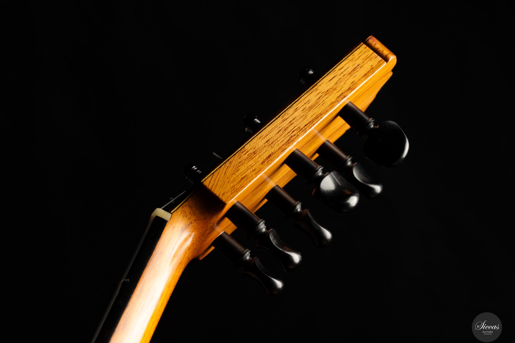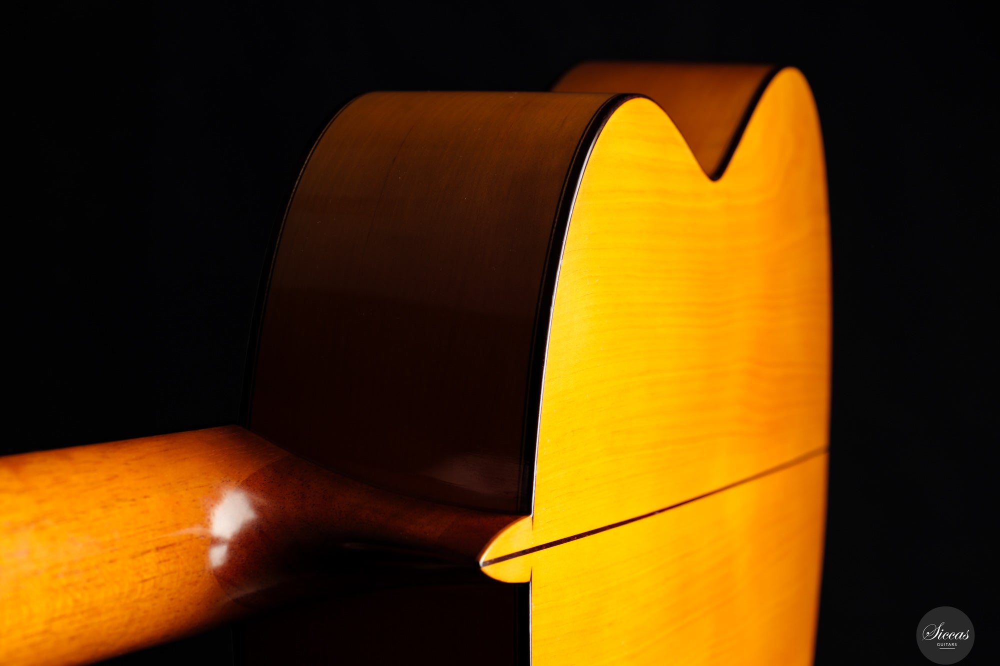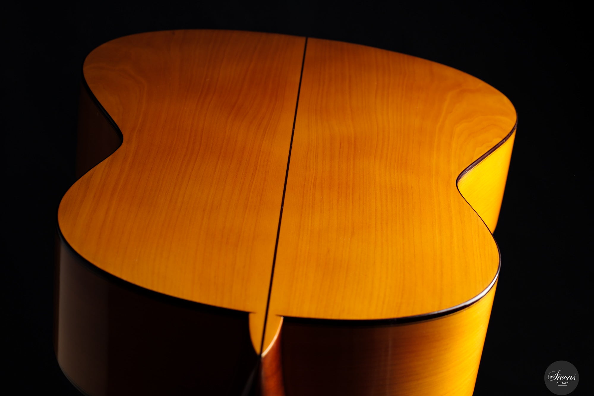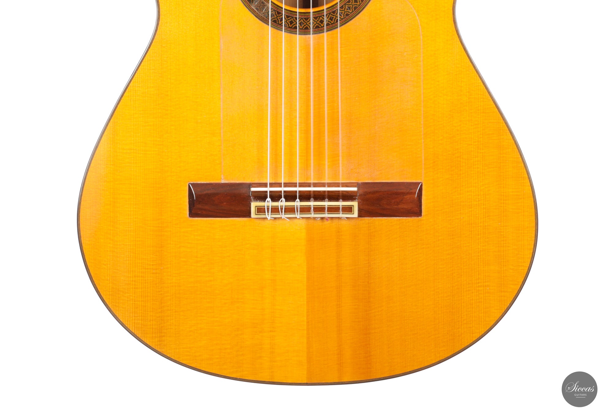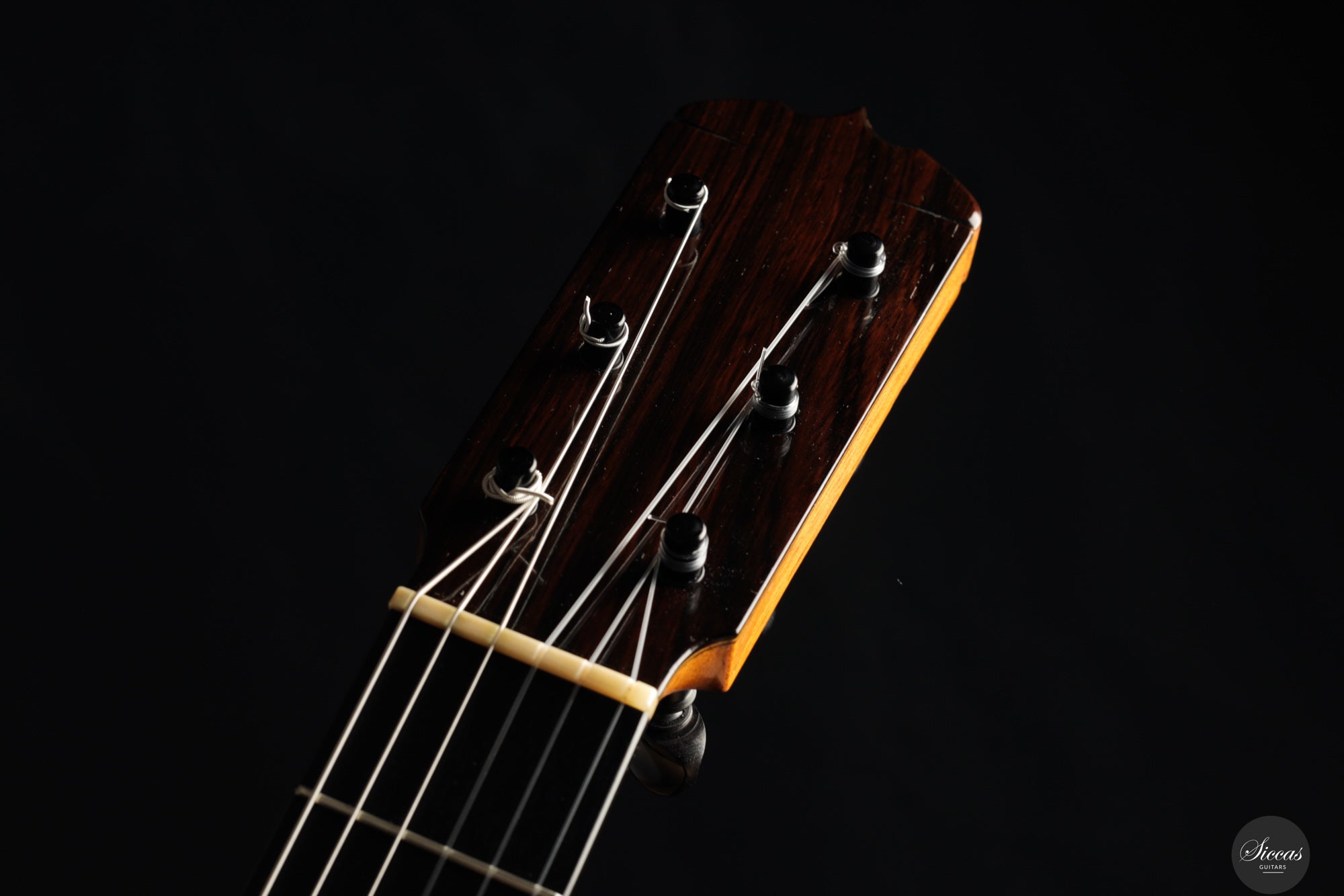 Klanglich präsentiert sich die Gitarre direkt, kraftvoll und durchsetzungsfähig mit sehr schneller Ansprache. Der Ton spricht unmittelbar an und unterstützt die rhythmische Präzision, die für den Flamencostil essenziell ist. Der Klang bleibt dabei fokussiert und substanzreich und verliert auch bei hoher Dynamik nicht an Kern. Intern trägt die Gitarre den Stempel mit den Initialen AM, die sehr wahrscheinlich Antonio Martínez Ortega zuzuordnen sind, einem Gitarrenbauer, der unter anderem Instrumente für Andrés Segovia und Christopher Parkening gefertigt hat. Diese Zuordnung verankert die Gitarre klar in der Tradition der Madrider Werkstattarbeit dieser Epoche.