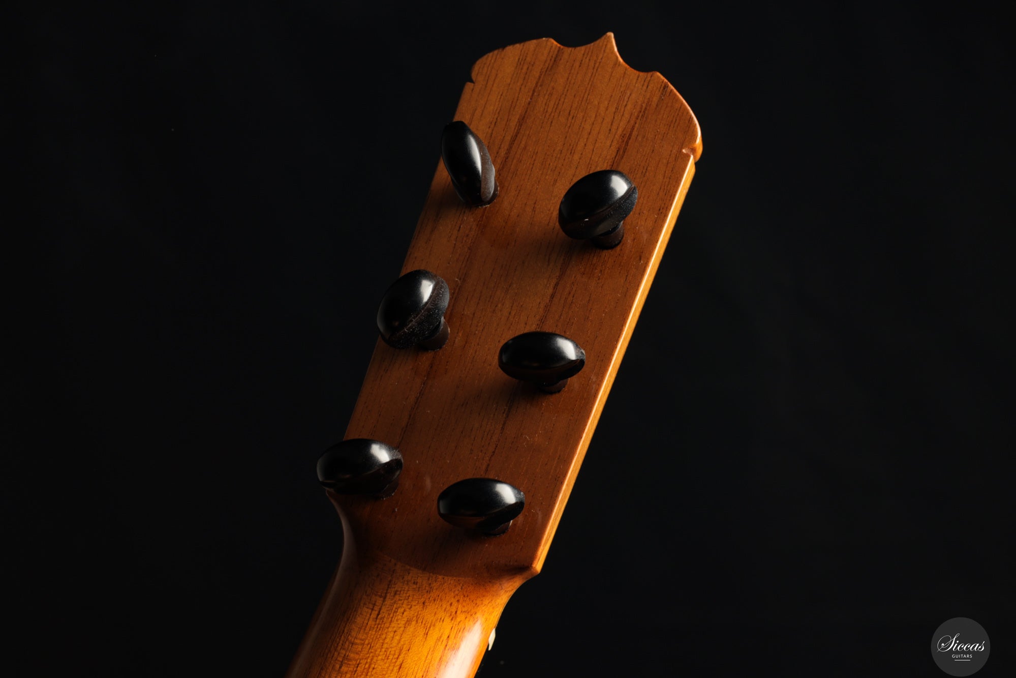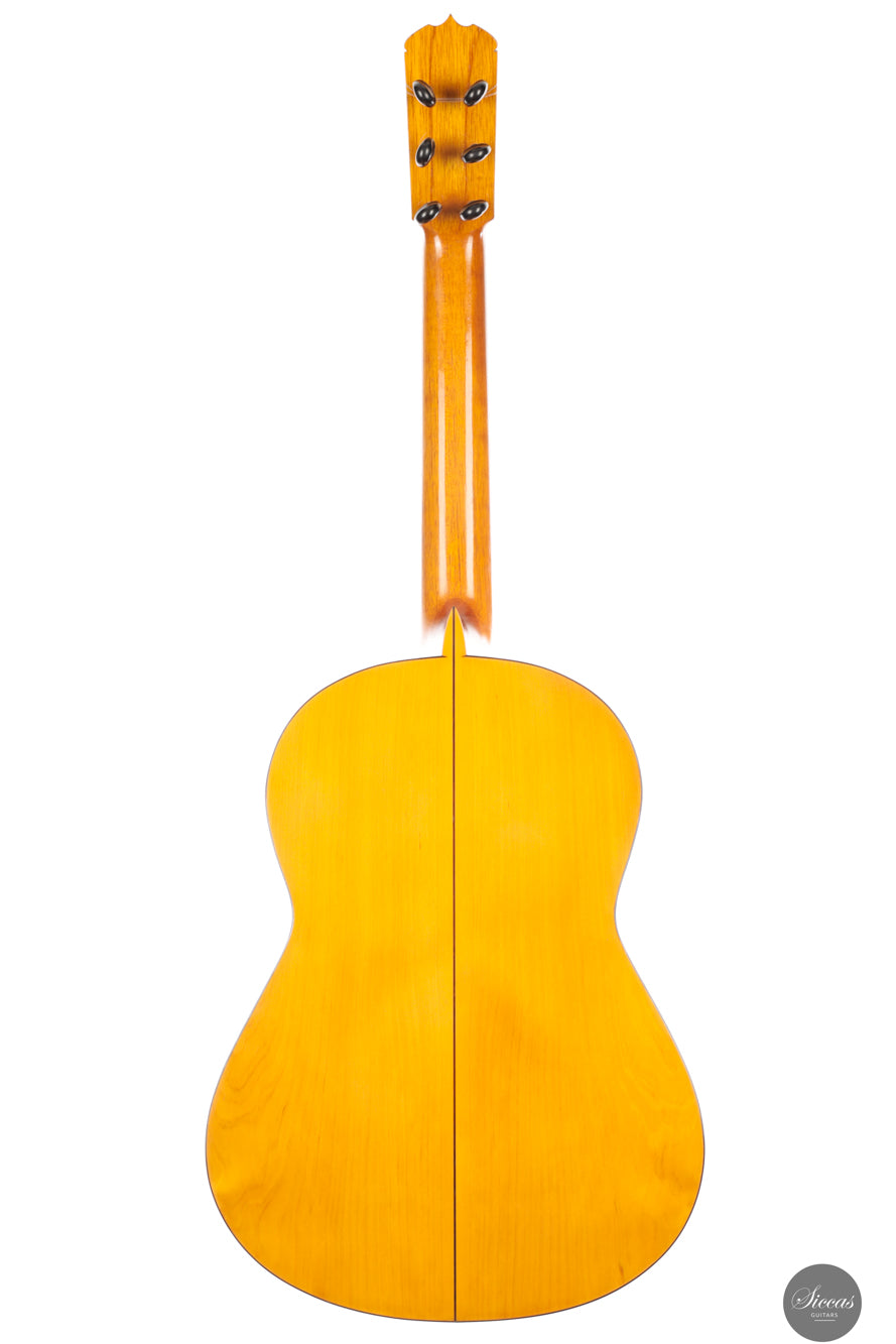 Diese Flamencogitarre aus dem Jahr 1959 ist ein außergewöhnlich gut erhaltenes Beispiel aus der Werkstatt von José Ramírez III und stammt aus einer prägenden Phase der Madrider Schule. Die Gitarre ist traditionell gebaut mit einer Fichtendecke sowie Boden und Zargen aus Zypresse. Die leichte Konstruktion und die fünf flach ausgeführten Fächerleisten entsprechen der klassischen Bauweise für Flamencogitarren. Das Instrument stammt aus der Augustinc Sammlung und bewahrt einen bemerkenswert ursprünglichen Charakter.