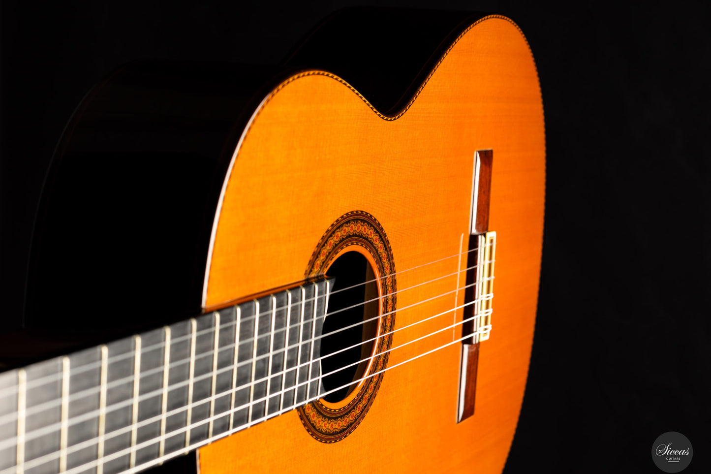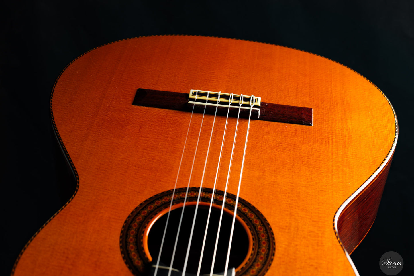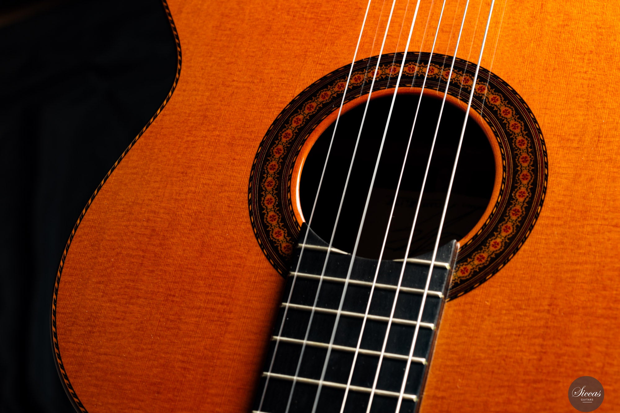The Ramirez family has been building fine and high-quality guitars since 1882 already. Their instruments have been and are played by some of the greatest guitarists in the world, such as Julian Bream, Andres Segovia, Laurindo Almeida, Oscar Ghiglia, José Luis Gonzales, and many others. Ramirez is an integral part of the history of guitar building. José Ramirez I (1858-1923) trained many guitar builders in his workshop at the end of the nineteenth and beginning of the twentieth century. And José Ramirez III (1922-1995) pioneered using cedarwood as top wood for guitars and built several guitars for Andres Segovia. José Ramirez III (1922-1995) pioneered cedar tops for guitars. His instruments gained international fame in the 1960s through Andrés Segovia and his many students. In 1965, José Ramirez III began developing a new instrument built with a top made of Western Red Cedar (Thuja plicata) and double sides (rosewood and cypress). This revolutionary new way of building guitars and using this innovative type of wood spread very quickly in the guitar world. In addition, Andrés Segovia played several J. Ramirez III was his main concert instrument. He played four instruments over an extended period [1962 (but dated 1963), Spruce, 1965, 1967, 1969 (all three cedar).About the guitar