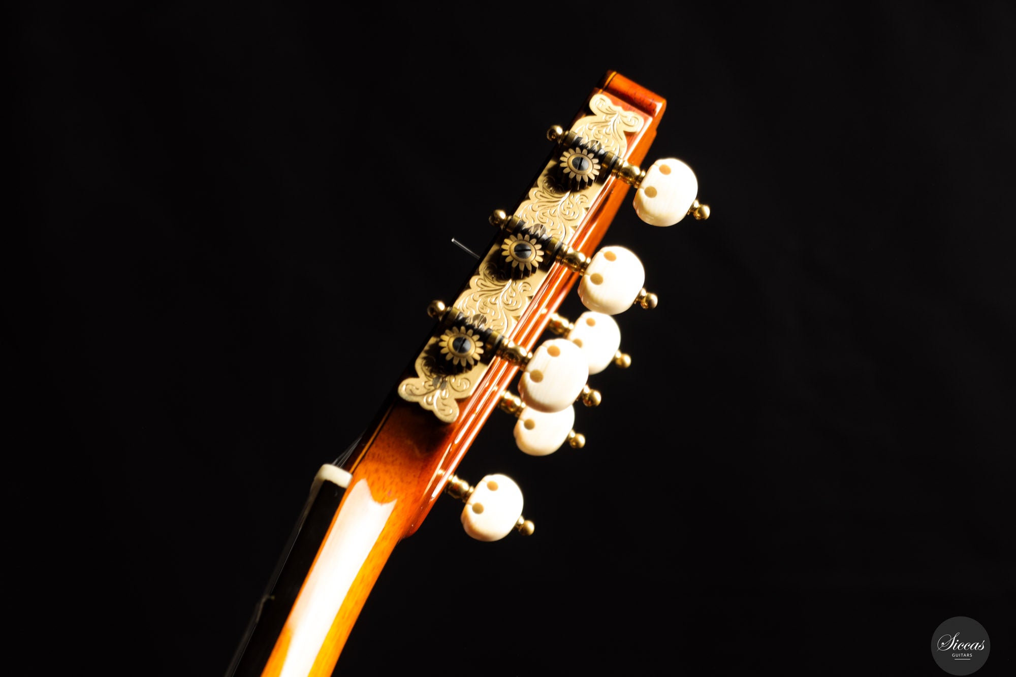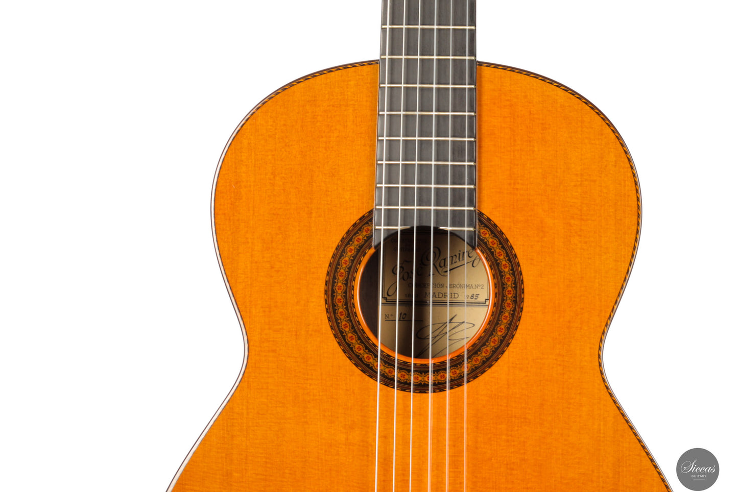 This exceptional 1985 José Ramirez guitar, model Elite, is widely regarded as one of the “holy grails” among Ramirez instruments. As the name suggests, it represents one of the highest-tier models ever produced by the legendary Madrid workshop. The CITES-certified Brazilian rosewood back and sides are truly to die for—this kind of wood is extremely rare nowadays, if not impossible to find. The guitar is also fitted with Rodgers tuning machines, which are widely considered the best in the business in terms of both functionality and craftsmanship. The guitar embodies the distinctive tonal characteristics for which Ramirez is celebrated: romantic, silky-smooth trebles that invite expressive portamento, and deep, mysterious basses that provide a rich foundation. Its impressive volume makes it a powerful concert instrument, suitable for any performance setting.Condition