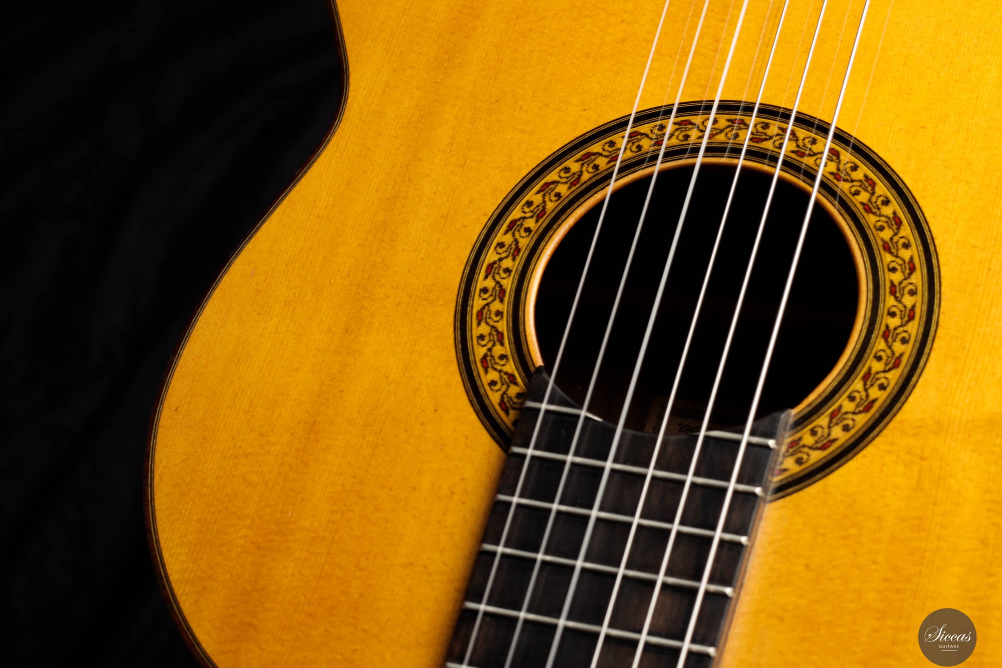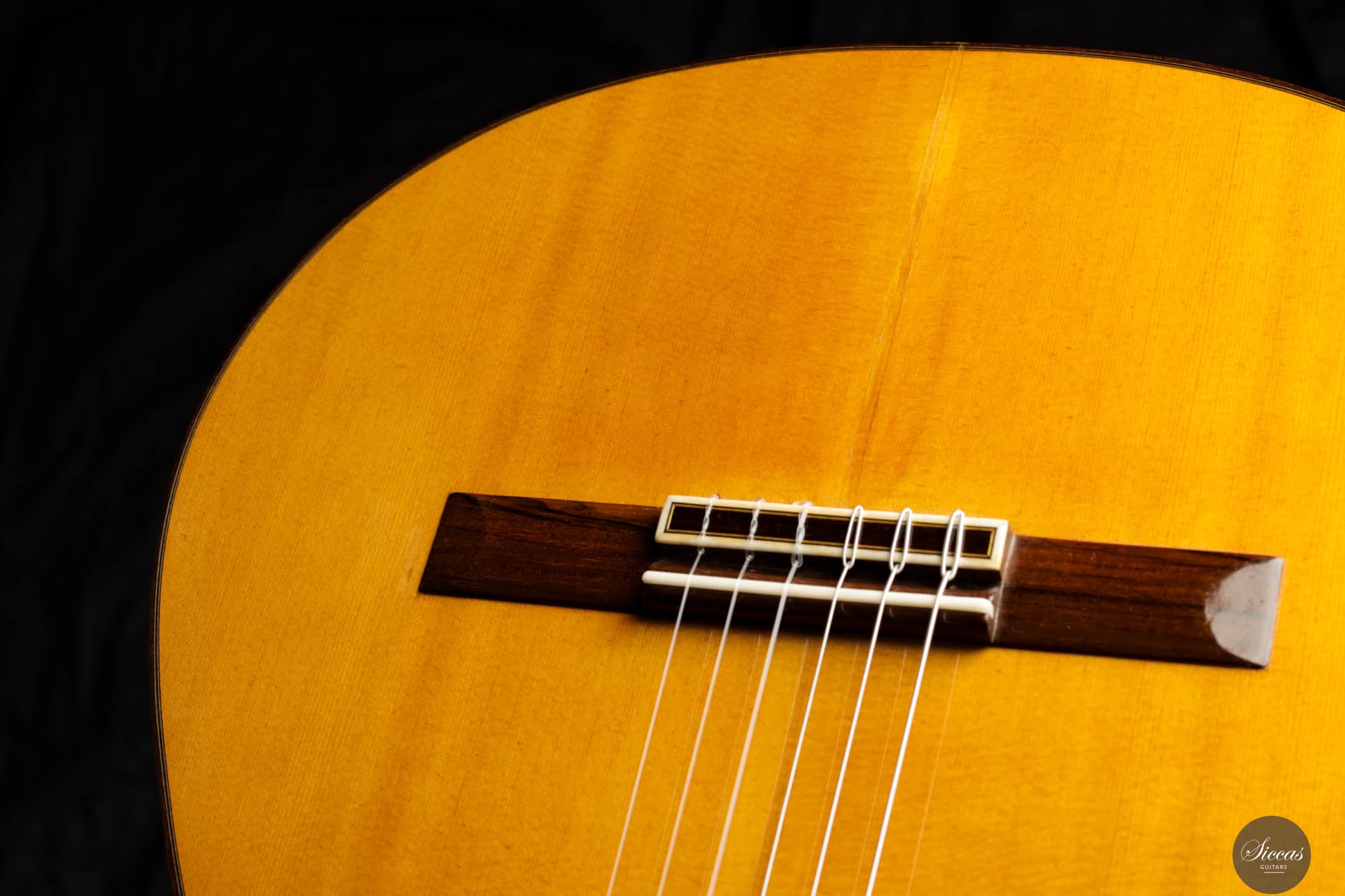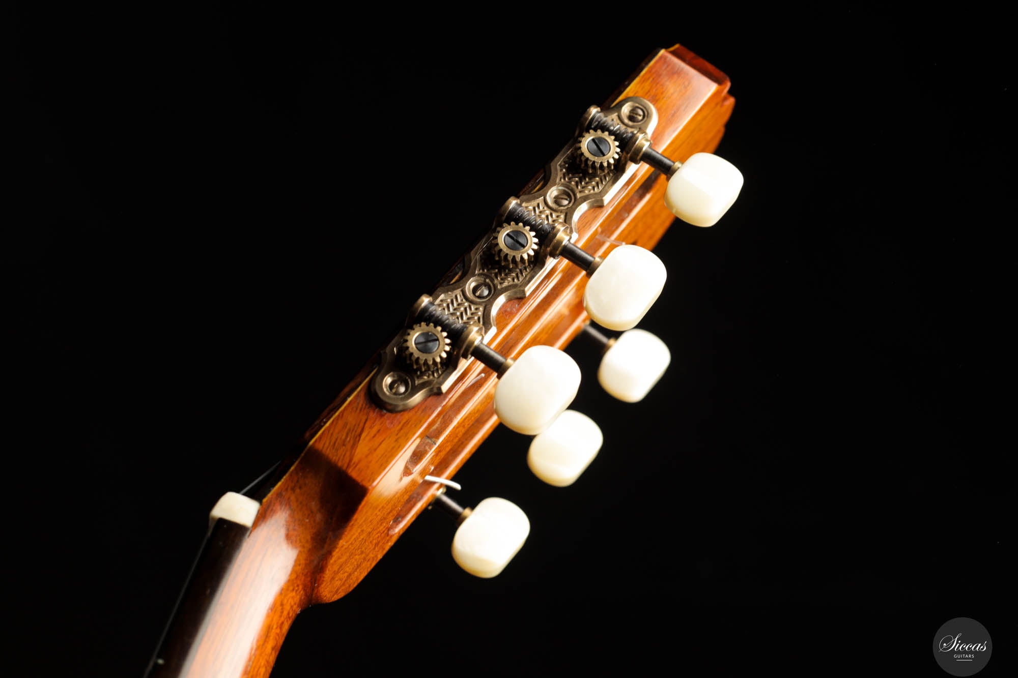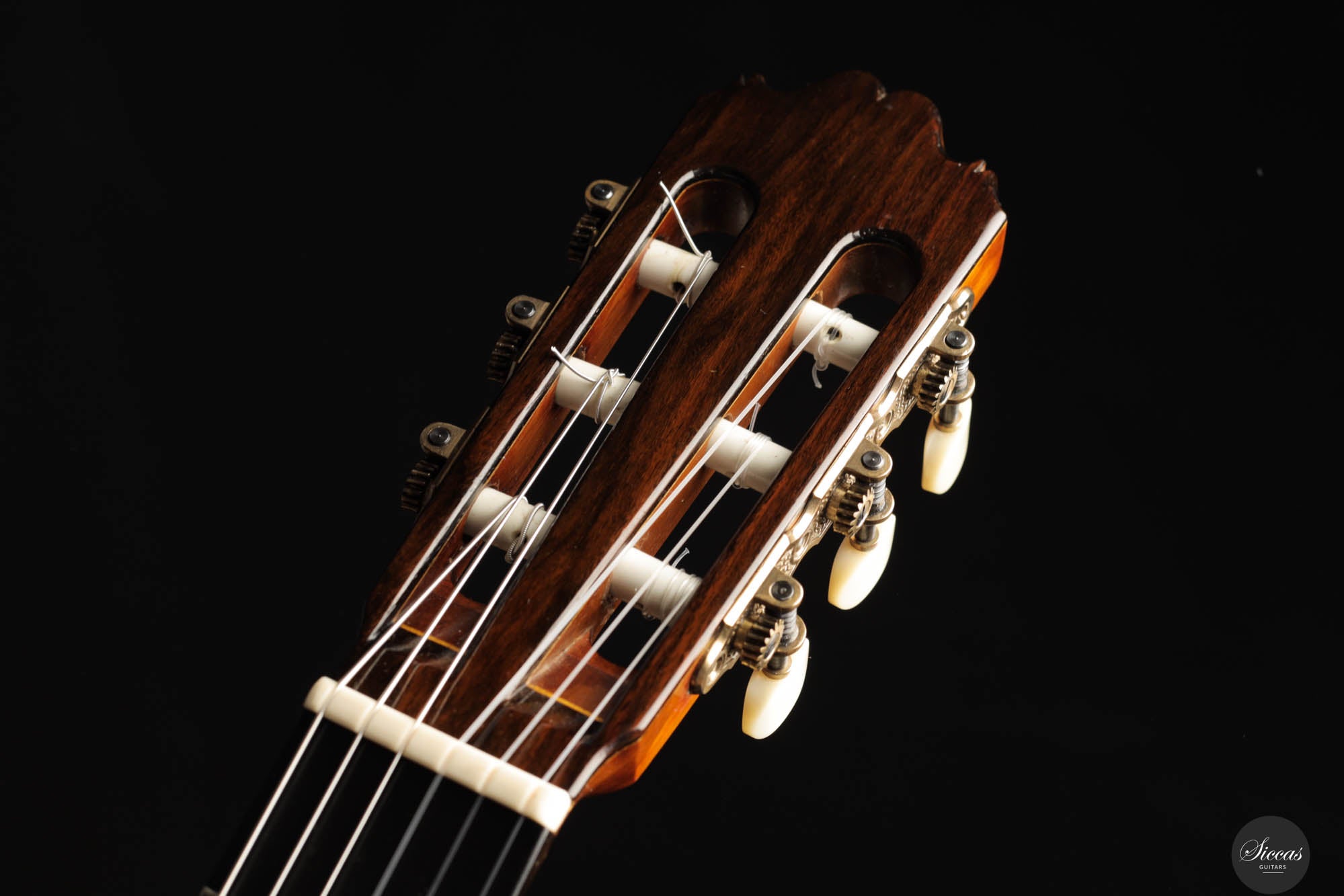 Trotz ihres größeren Halses und der langen Mensur bietet diese Rubio-Gitarre ein wunderschön glattes und elegantes Spielerlebnis. Die akribisch gefertigte Halsform trägt erheblich zur Bespielbarkeit bei und ermöglicht Komfort und Leichtigkeit, auch in komplexeren Stücken. Diese Gitarre ist nicht nur ein Instrument, sondern ein Zeugnis für Rubios meisterhaftes Design und seine Bauweisen. Ihre Präsenz im Buch "The Classical Guitar - A Complete History", abgebildet auf den Seiten 52-54, unterstreicht weiter ihren Status als bemerkenswertes Beispiel für hochwertiges Handwerk. Durch unsere Hände gegangen, repräsentiert diese Rubio-Gitarre eine seltene Gelegenheit, ein Stück der Geschichte der klassischen Gitarre zu besitzen, das sowohl einen reichen, resonanten Klang bietet als auch eine Verbindung zum Vermächtnis eines der großen Luthiers des zwanzigsten Jahrhunderts.