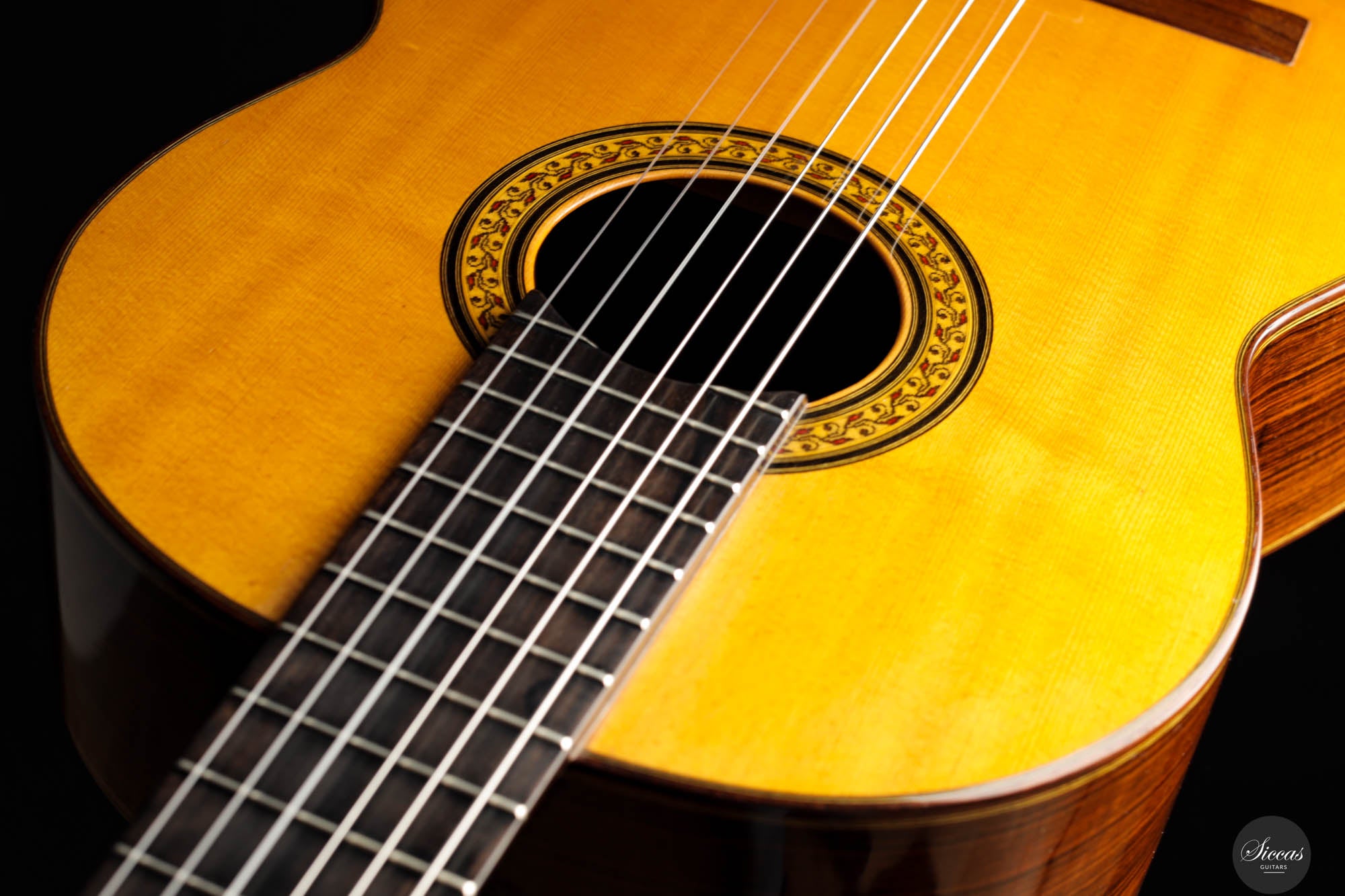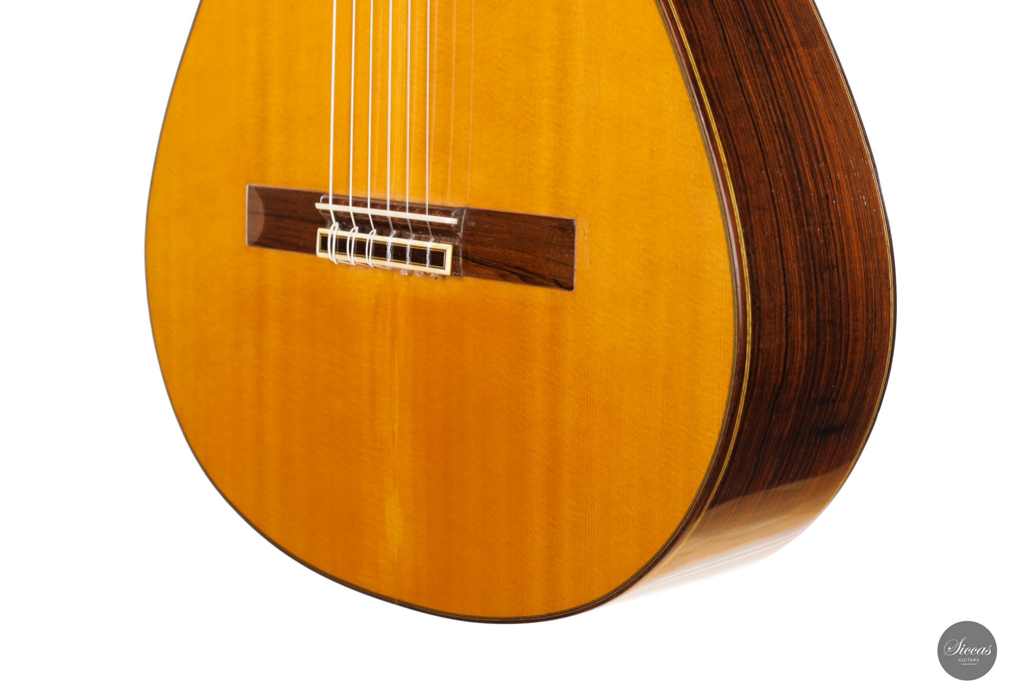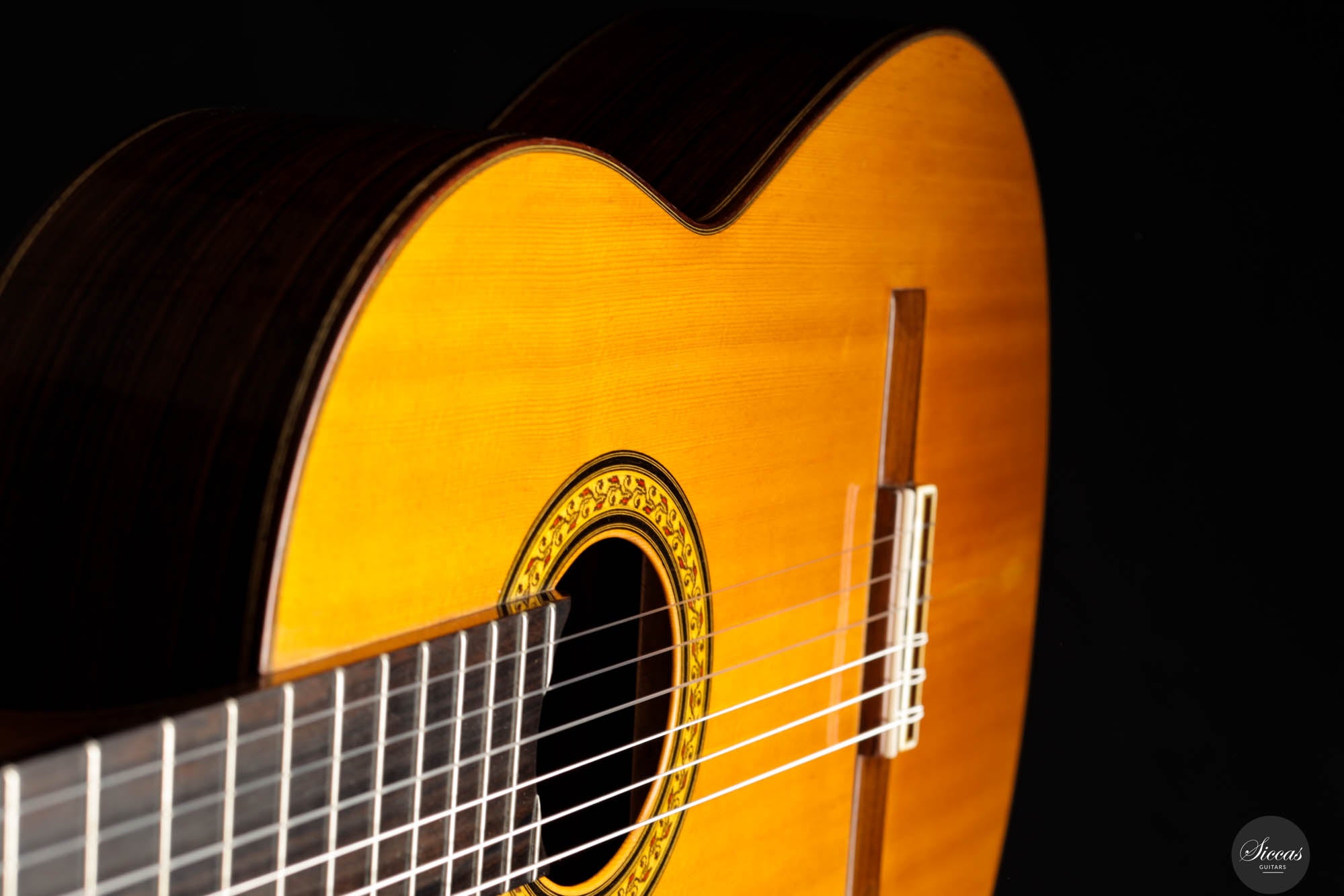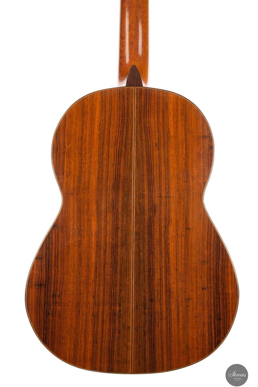 Trotz ihres größeren Halses und der langen Mensur bietet diese Rubio-Gitarre ein wunderschön glattes und elegantes Spielerlebnis. Die akribisch gefertigte Halsform trägt erheblich zur Bespielbarkeit bei und ermöglicht Komfort und Leichtigkeit, auch in komplexeren Stücken. Diese Gitarre ist nicht nur ein Instrument, sondern ein Zeugnis für Rubios meisterhaftes Design und seine Bauweisen. Ihre Präsenz im Buch "The Classical Guitar - A Complete History", abgebildet auf den Seiten 52-54, unterstreicht weiter ihren Status als bemerkenswertes Beispiel für hochwertiges Handwerk. Durch unsere Hände gegangen, repräsentiert diese Rubio-Gitarre eine seltene Gelegenheit, ein Stück der Geschichte der klassischen Gitarre zu besitzen, das sowohl einen reichen, resonanten Klang bietet als auch eine Verbindung zum Vermächtnis eines der großen Luthiers des zwanzigsten Jahrhunderts.