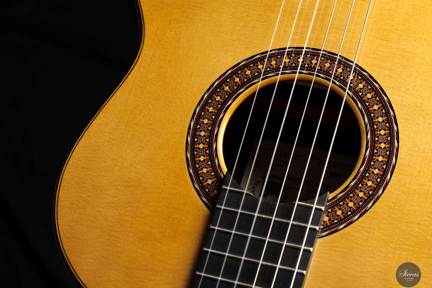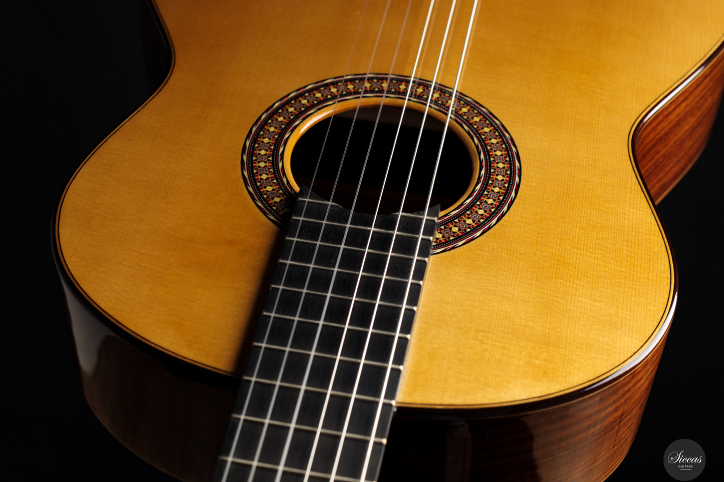 Diese brandneue Gitarre verfügt über eine Fichtendecke sowie Boden und Zargen aus indischem Palisander, mit einer hervorragenden Verarbeitung und eleganten Verzierungen. Ihr Klang zeichnet sich durch einen direkten Ton, lebendige Obertöne und eine schnelle Ansprache aus. Die PU-Lackierung bietet eine zusätzliche Schutzschicht, die es der Gitarre ermöglicht, kraftvolle Rasgueados, Alzapúas und verschiedene perkussive Techniken zu bewältigen, ohne dabei ihre ästhetische Anziehungskraft zu verlieren.