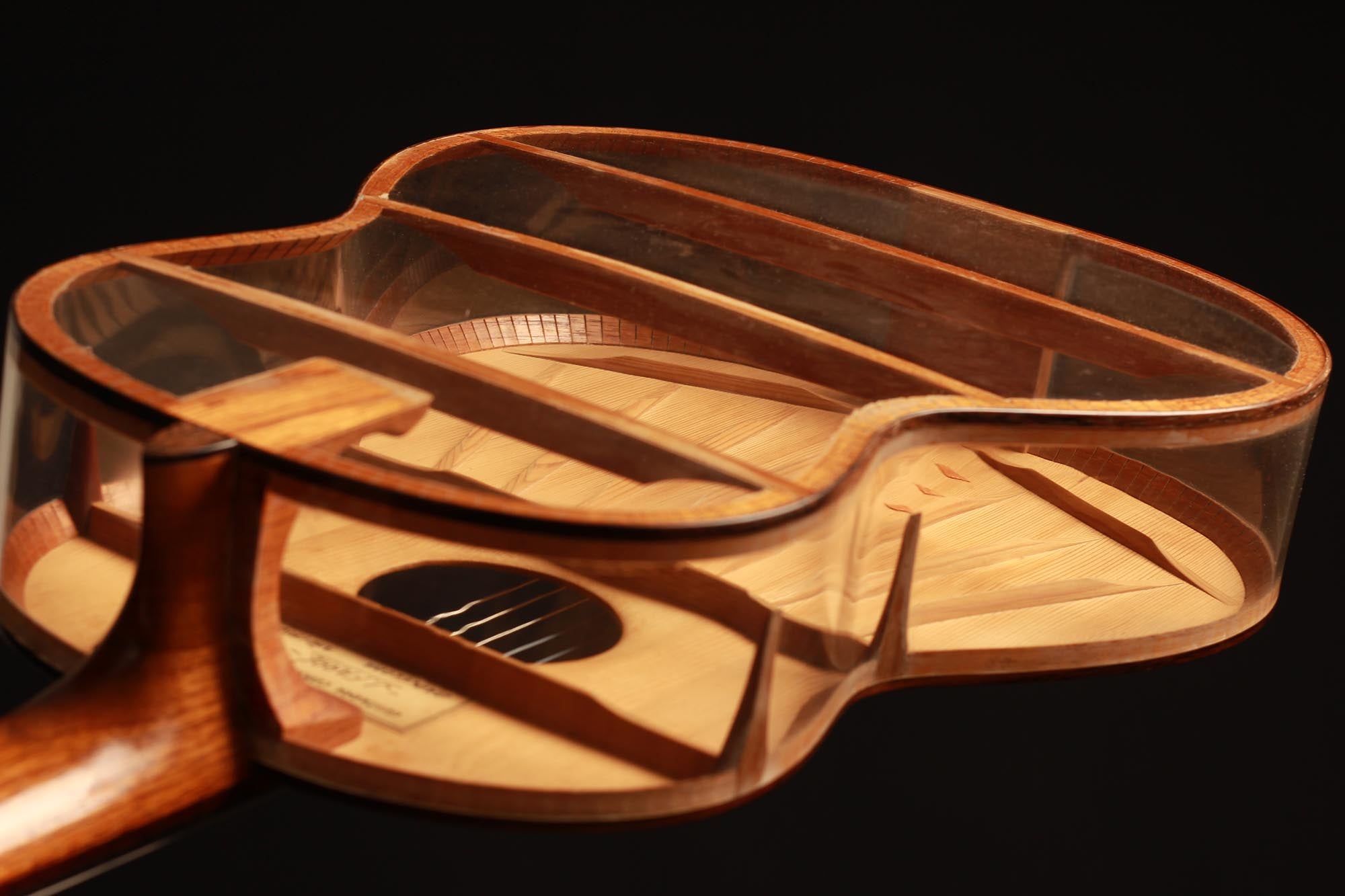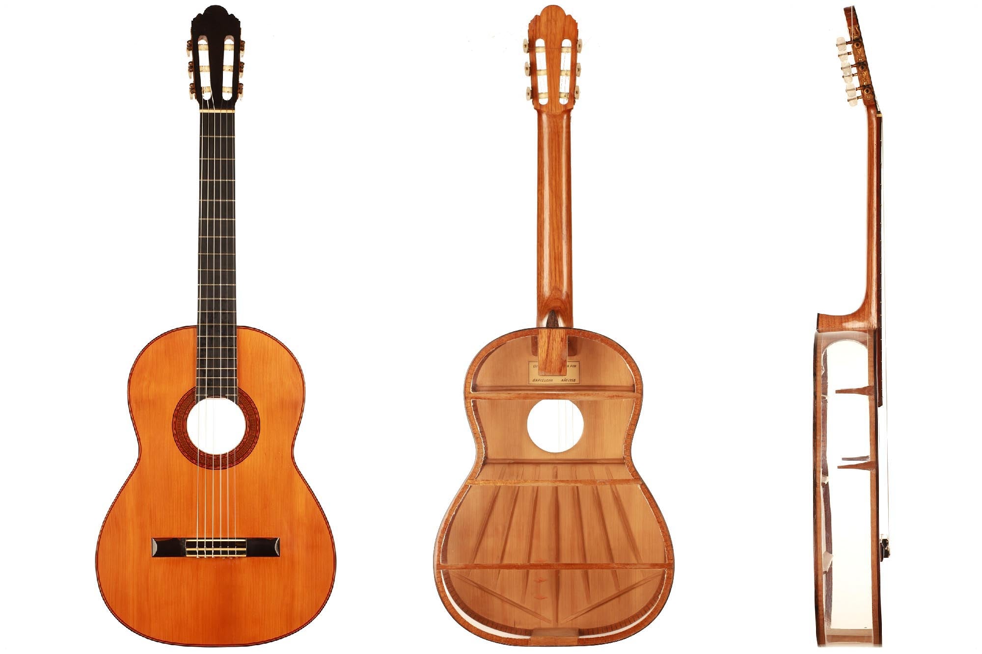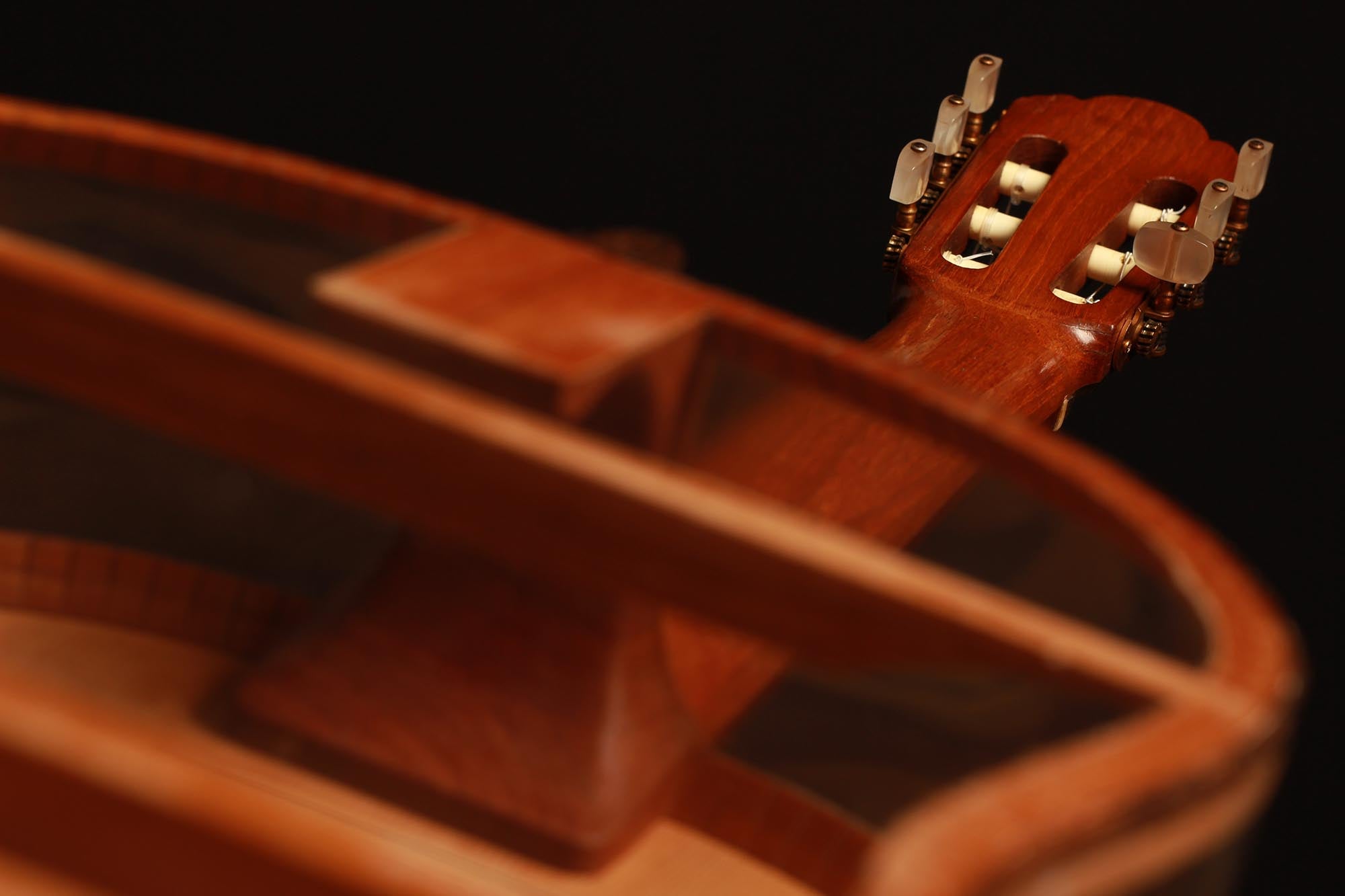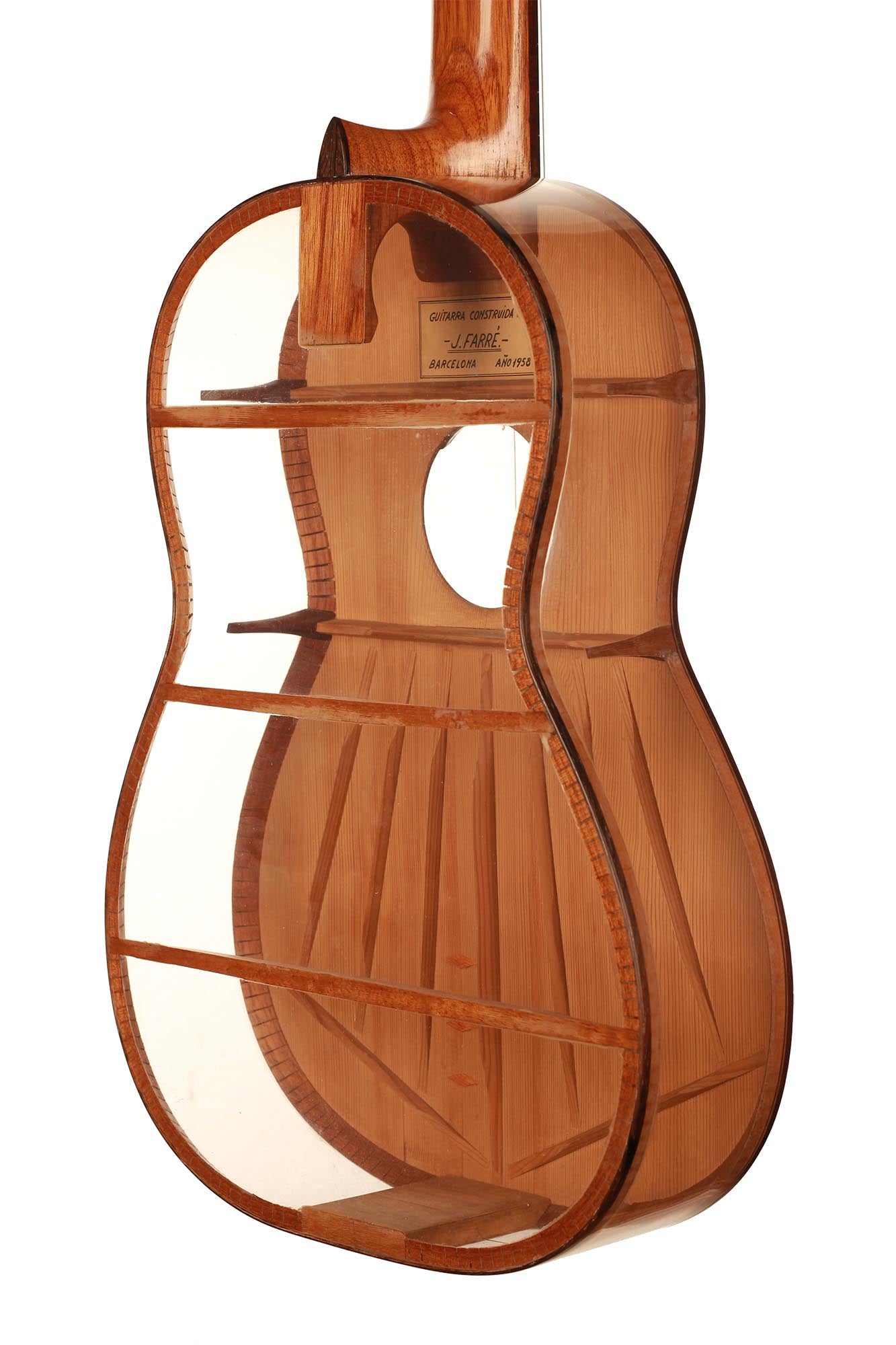 Was für eine unglaubliche Gitarre. Dieses Instrument ist ein Projekt von Josep Farré aus dem Jahr 1958, möglicherweise inspiriert von der Pappgitarre, die von Antonio de Torres im vorigen Jahrhundert gebaut wurde. Farré entwarf eine Gitarre, die fast wie ein anatomisches Modell wirkt. Tatsächlich erlaubt dies nicht nur, die Rolle der Decke beim Klang der Gitarre zu studieren, sondern auch einen klaren Einblick und ein besseres Verständnis für die innere Struktur dieses komplexen Instruments zu erlangen. Dies ist eine absolute Rarität in exzellentem Zustand und eine einzigartige Gitarre.