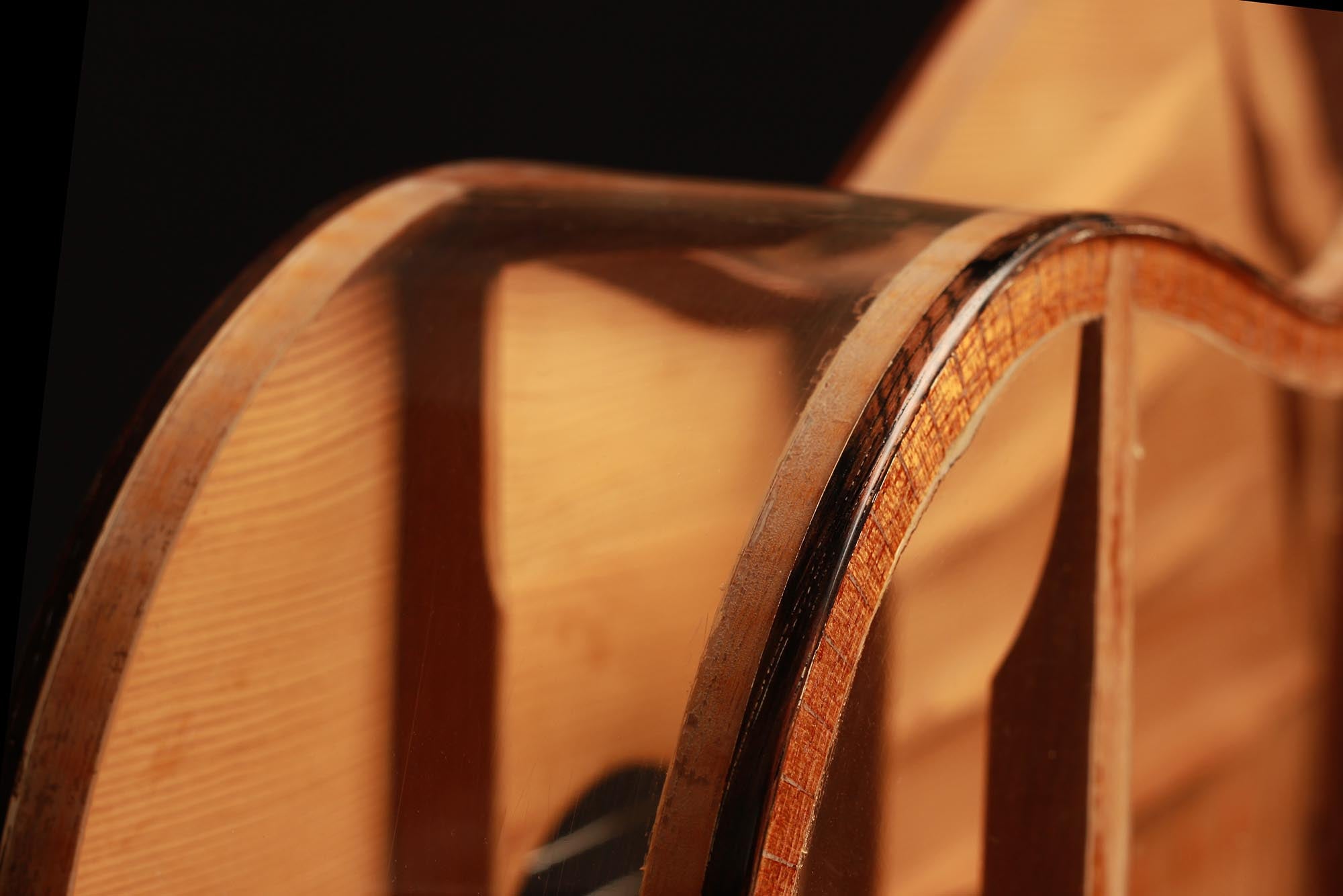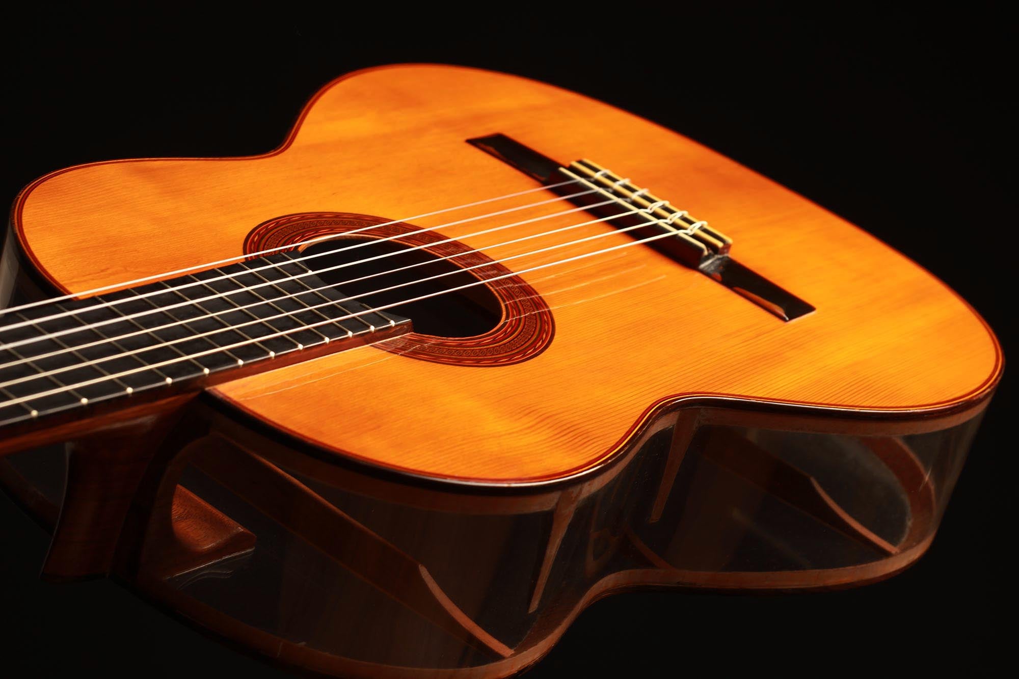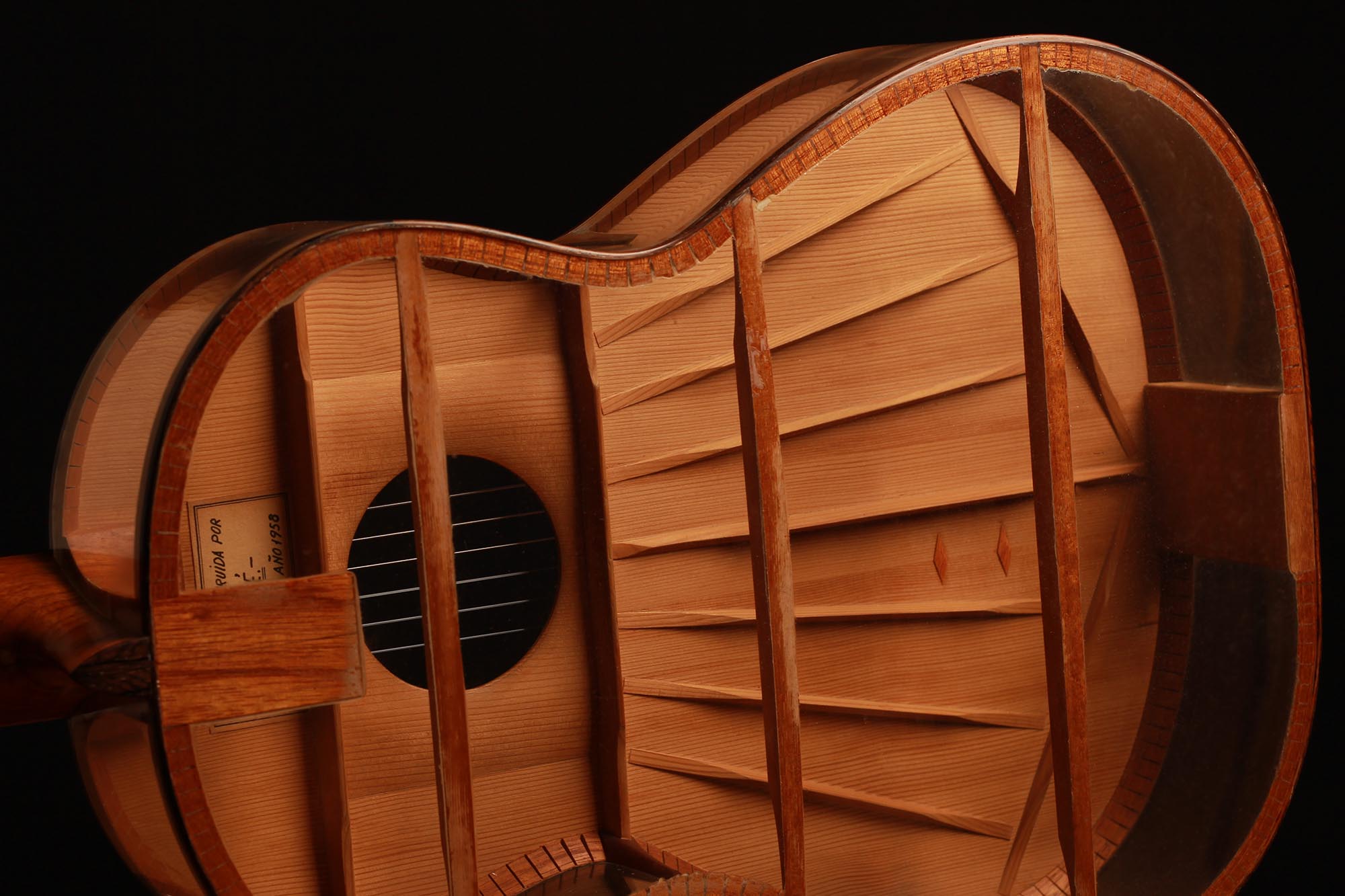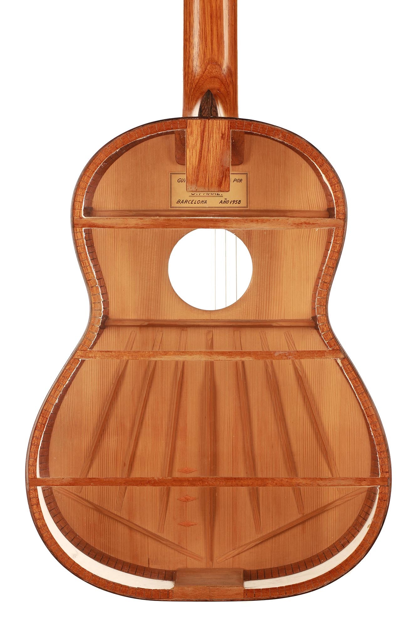 Was für eine unglaubliche Gitarre. Dieses Instrument ist ein Projekt von Josep Farré aus dem Jahr 1958, möglicherweise inspiriert von der Pappgitarre, die von Antonio de Torres im vorigen Jahrhundert gebaut wurde. Farré entwarf eine Gitarre, die fast wie ein anatomisches Modell wirkt. Tatsächlich erlaubt dies nicht nur, die Rolle der Decke beim Klang der Gitarre zu studieren, sondern auch einen klaren Einblick und ein besseres Verständnis für die innere Struktur dieses komplexen Instruments zu erlangen. Dies ist eine absolute Rarität in exzellentem Zustand und eine einzigartige Gitarre.