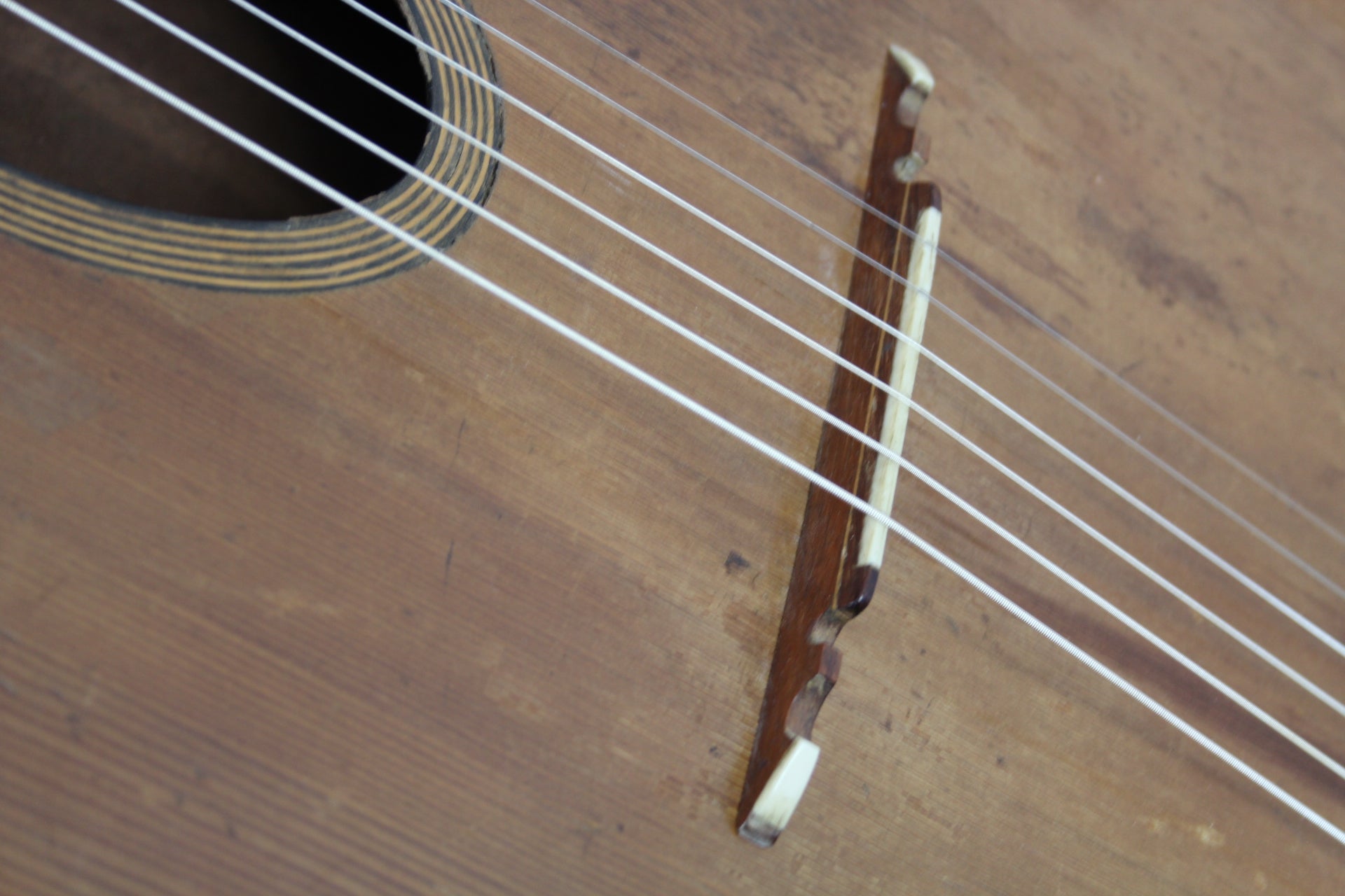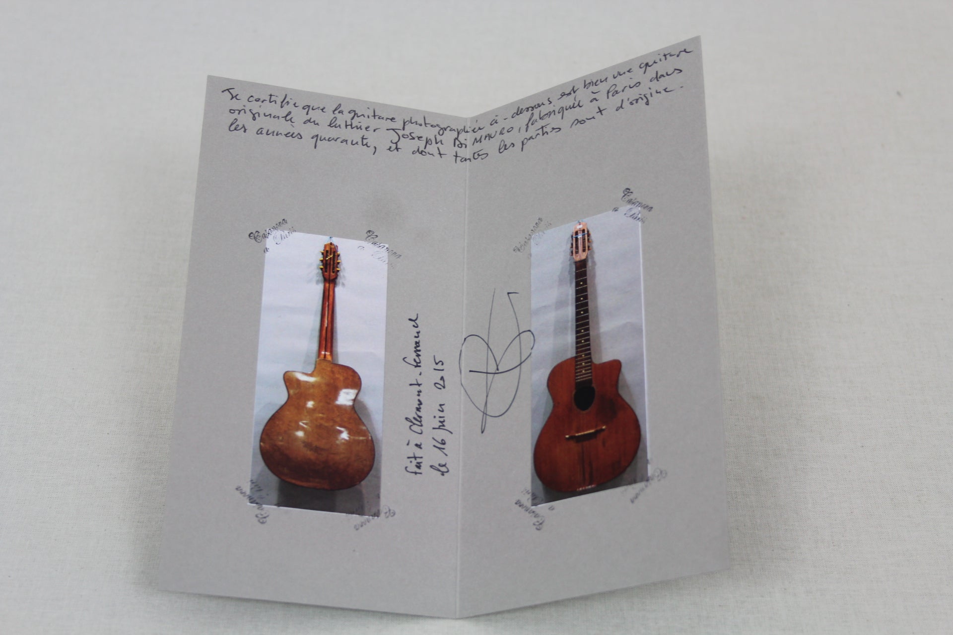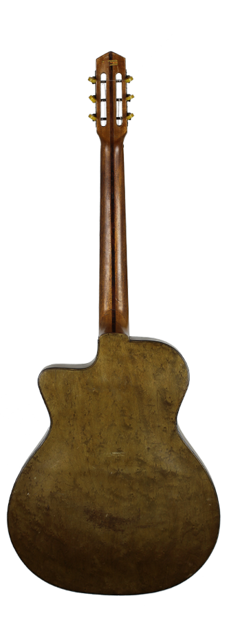 A wonderful old Gypsy Guitar made in the 40’s by Joseph di Mauro. Not to be confused with Antoine's son.. this is Antoine's brother. He worked on his own and his guitars are quite rare, initially. The guitar has a solid spruce top and laminated birdseye maple back and sides, 3-piece mahogany neck with rosewood stripe and fingerboard. Original tuners that turn backwards. Unfortunately the neck warped over time and some higher frets popped out a bit so at the moment playability is an issue. Therefore a professional refretting should be done to gain playability. Including a certificate of authenticity by Luthier Jérôme Casanova.