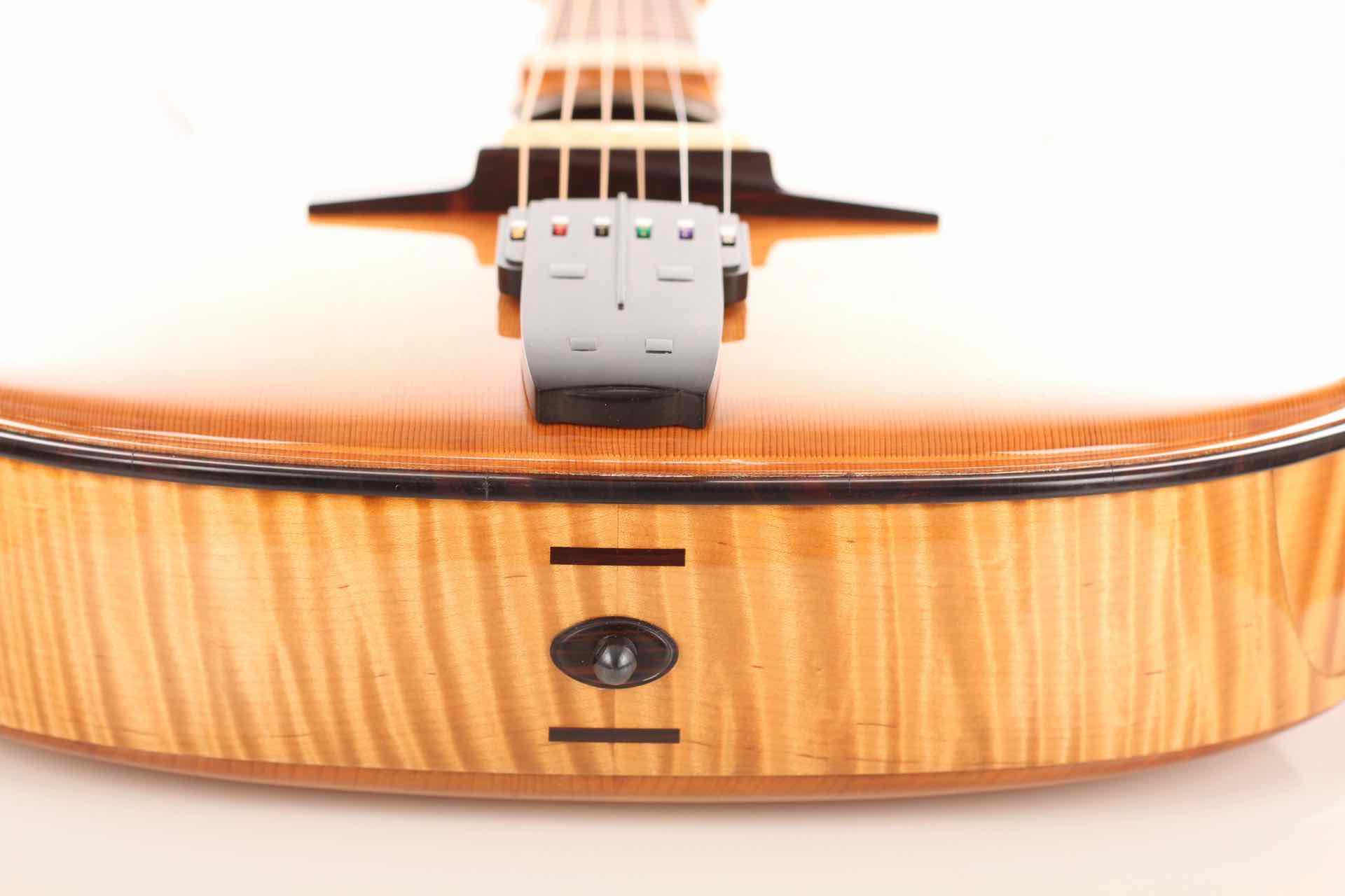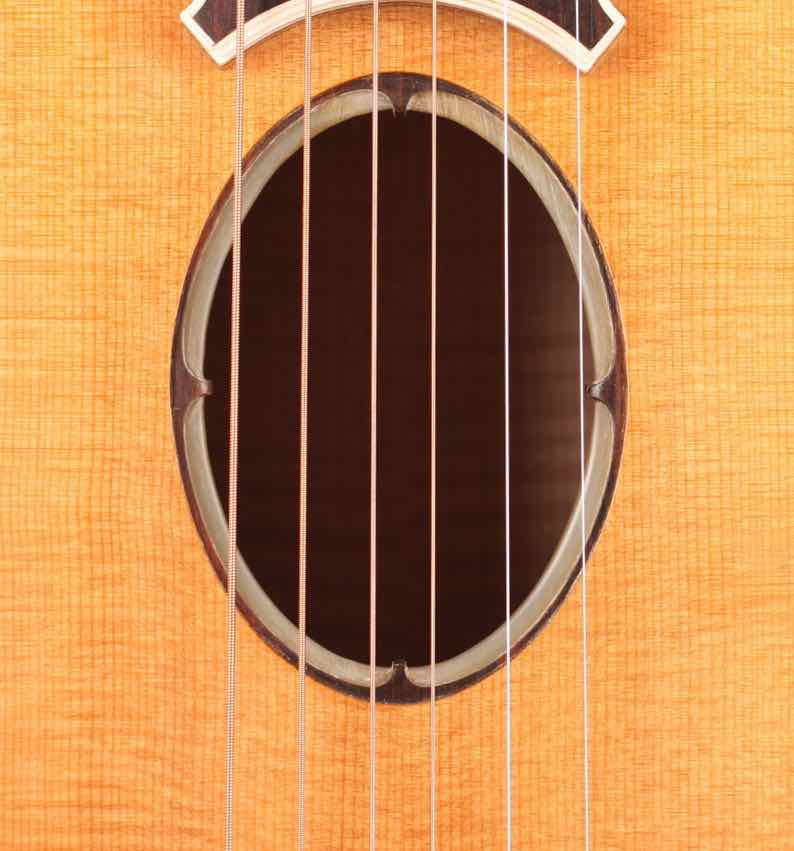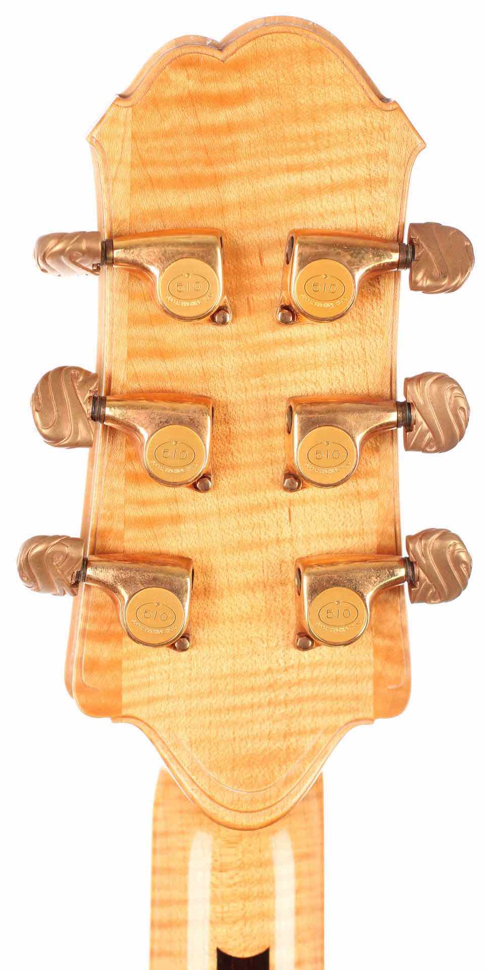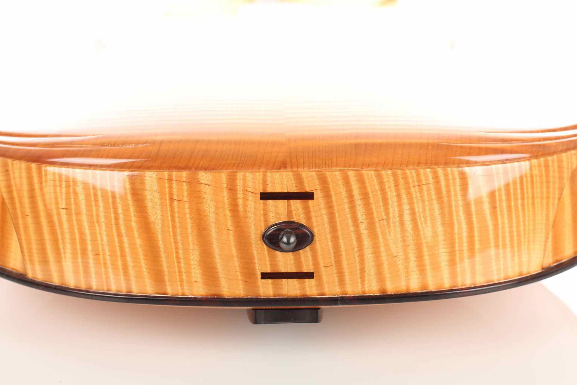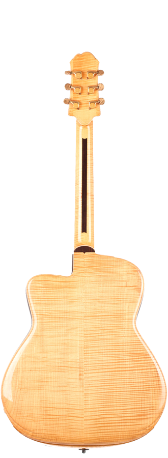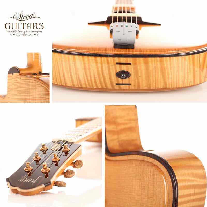 Here we have a one-off Oval Hole Model from about 2004 we got from a friend of Alan Rogan. This beauty features the typical attention to detail Mr. Jesselli is known for. Starting from a stunning carved spruce top over to the back and sides with highly flamed maple up to the wonderful headstock shape. Everywhere are beautiful little details. Apart from this it features a magnetic pickup under the upper fretboard and a piezo system in the bridge. This guitar ist especially designed for the use of the Pendulum Audio SPS-1 Stereo Acoustic Preamp which is included. Of course every other preamp can be used instead. There are too many details to mention everything so we can only sum up the basic information.