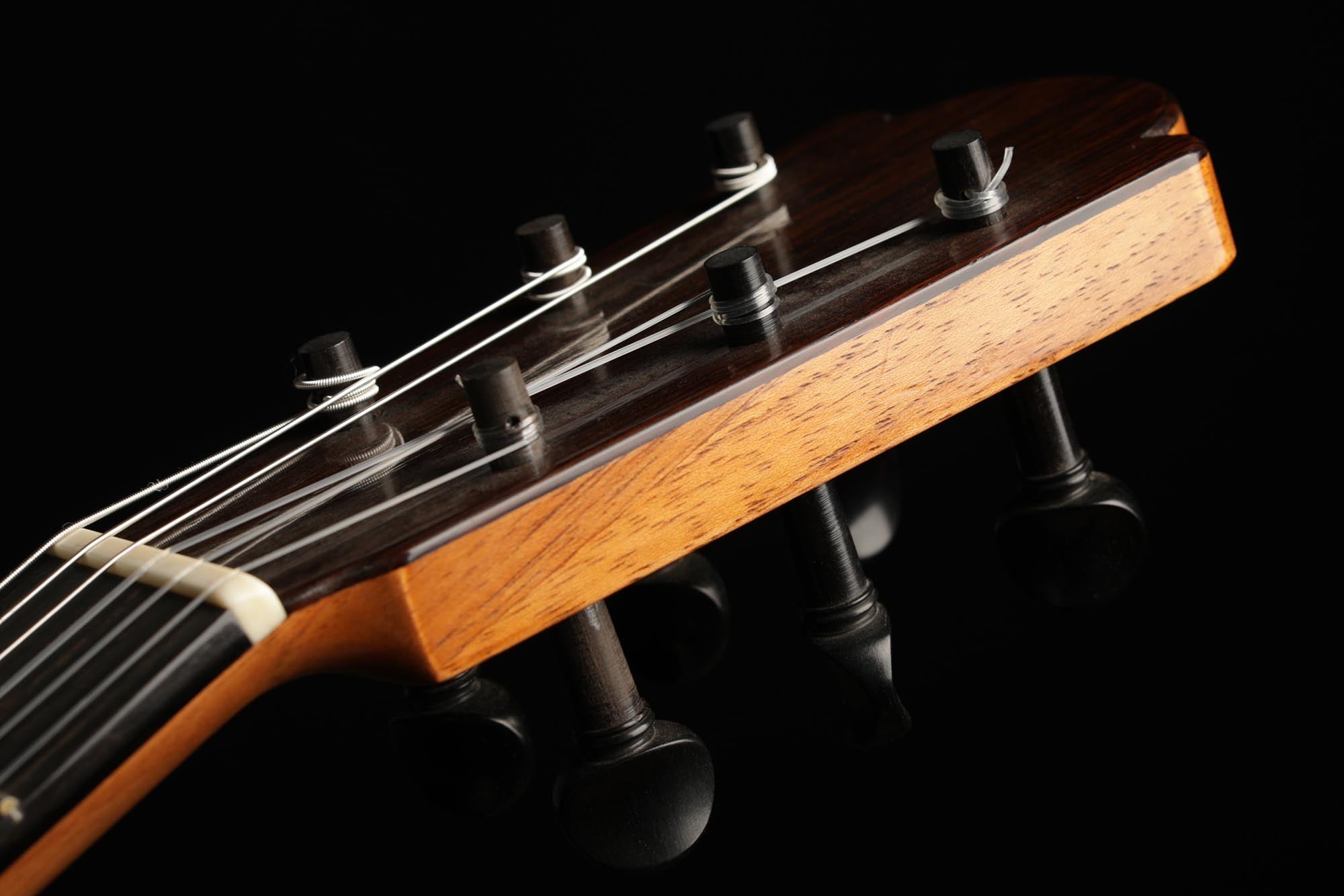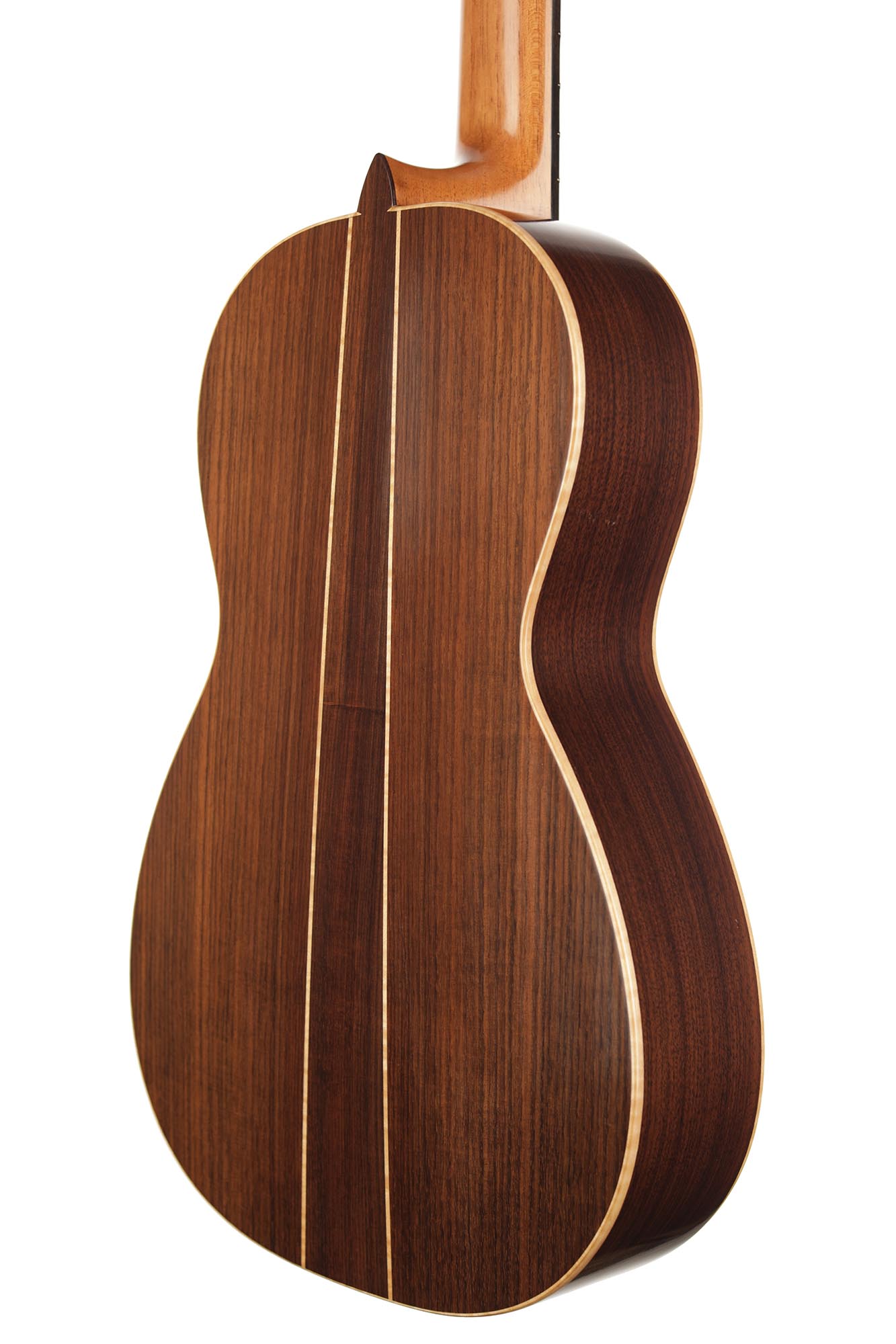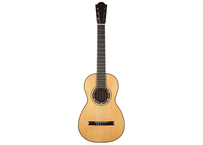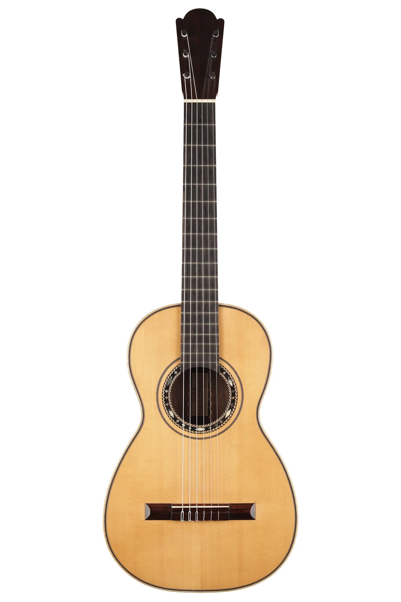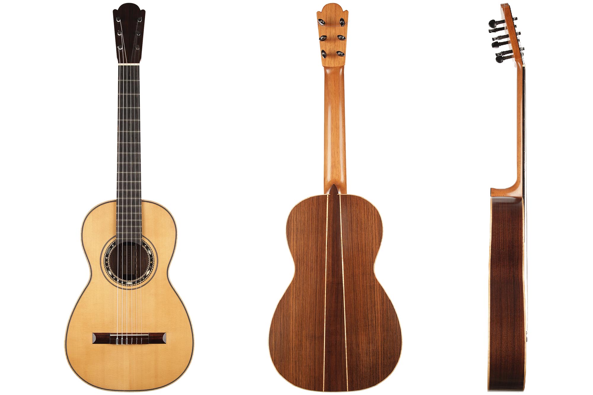 Die Gitarre ist als Kopie von einer Campo y Castro aus dem Jahr 1896 gebaut. Bei der Begutachtung des Instruments ist ersichtlich mit wieviel Finesse sie gebaut wurde, voller kleiner künstlerischer Details, die es schön und inspirierend zum Spielen machen. Ihr Timbre ist sehr süß mit einer Reihe von schimmernden Obertönen, die bei frühromantischen Instrumenten sehr präsent sind. Mit einer gleichmäßig gemaserten Fichtendecke und einem Boden und Zargen aus hochwertigem indischen Palisanderholz gebaut, ist das Volumen bei einem so kleinen Korpus überraschend. Sustain ist mehr als genug für alle Arten von Repertoire vorhanden. Die Wirbel im alten Stil sind leicht zu stimmen und halten sehr gut die Stimmung. Ein Hartschalenkoffer wird mitgeliefert.