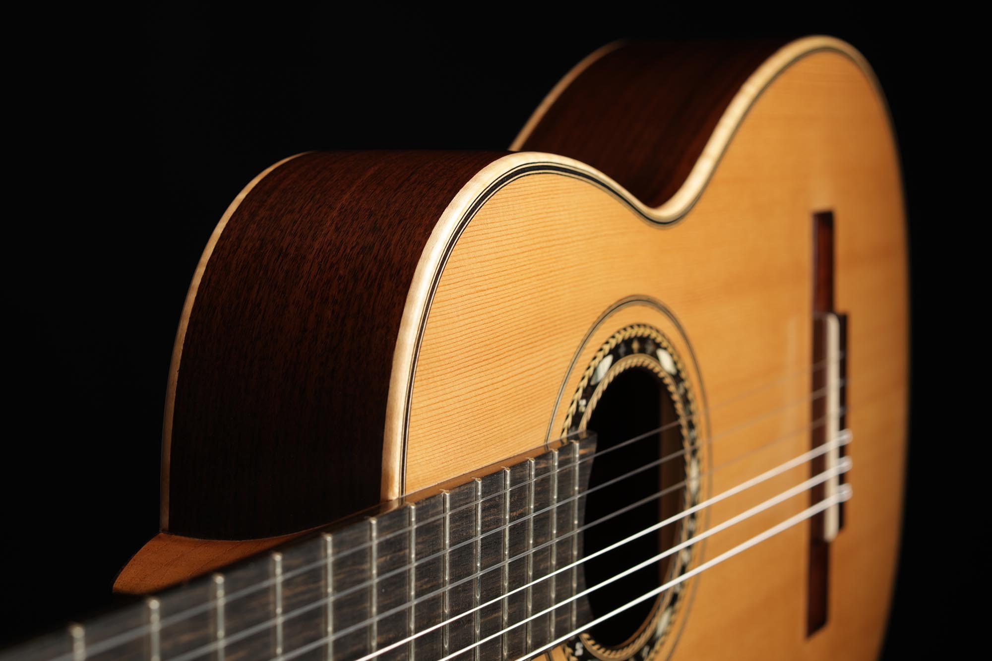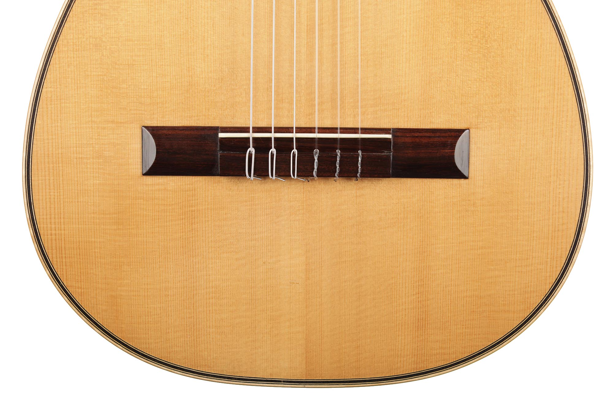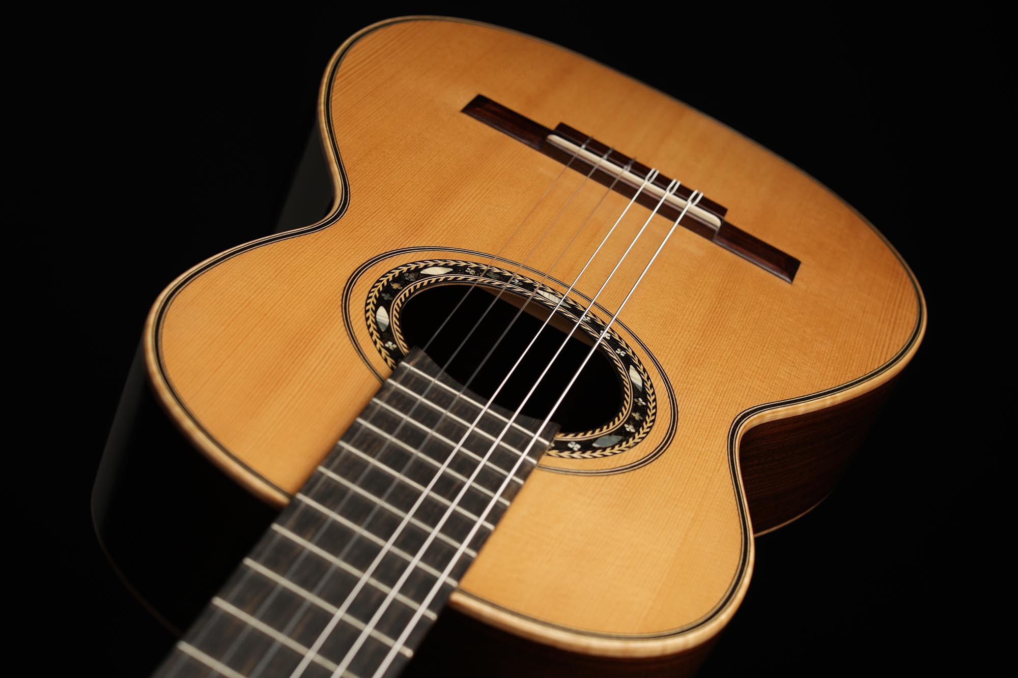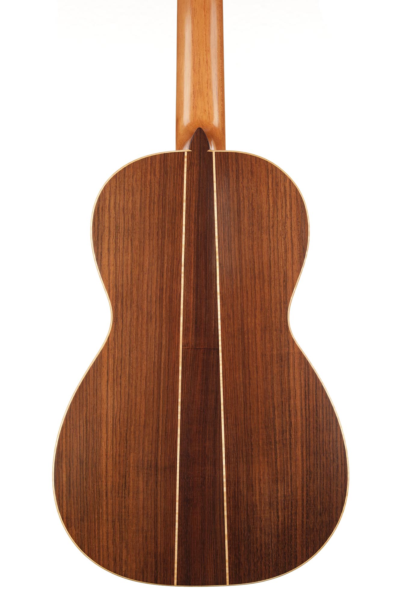 Die Gitarre ist als Kopie von einer Campo y Castro aus dem Jahr 1896 gebaut. Bei der Begutachtung des Instruments ist ersichtlich mit wieviel Finesse sie gebaut wurde, voller kleiner künstlerischer Details, die es schön und inspirierend zum Spielen machen. Ihr Timbre ist sehr süß mit einer Reihe von schimmernden Obertönen, die bei frühromantischen Instrumenten sehr präsent sind. Mit einer gleichmäßig gemaserten Fichtendecke und einem Boden und Zargen aus hochwertigem indischen Palisanderholz gebaut, ist das Volumen bei einem so kleinen Korpus überraschend. Sustain ist mehr als genug für alle Arten von Repertoire vorhanden. Die Wirbel im alten Stil sind leicht zu stimmen und halten sehr gut die Stimmung. Ein Hartschalenkoffer wird mitgeliefert.