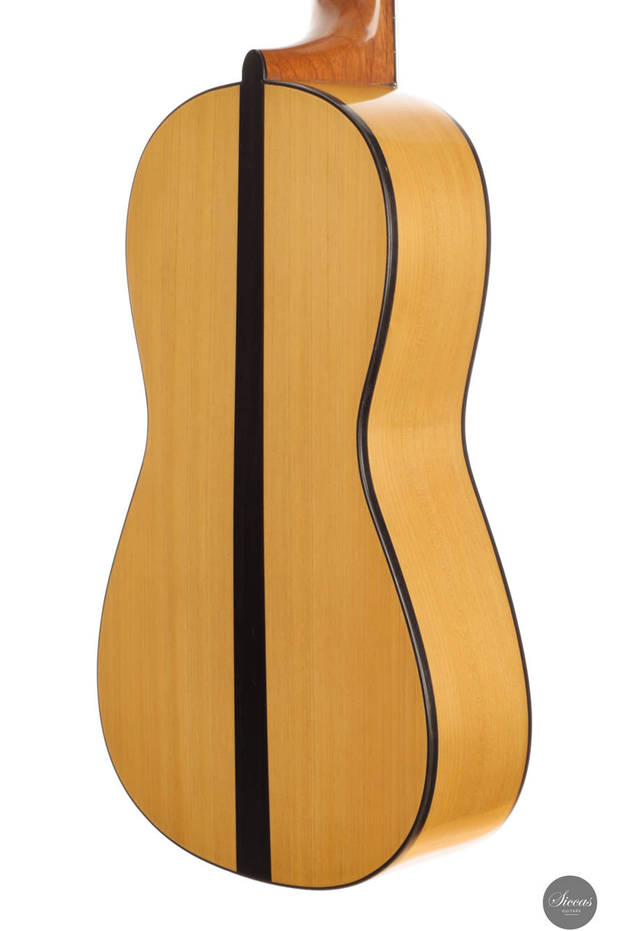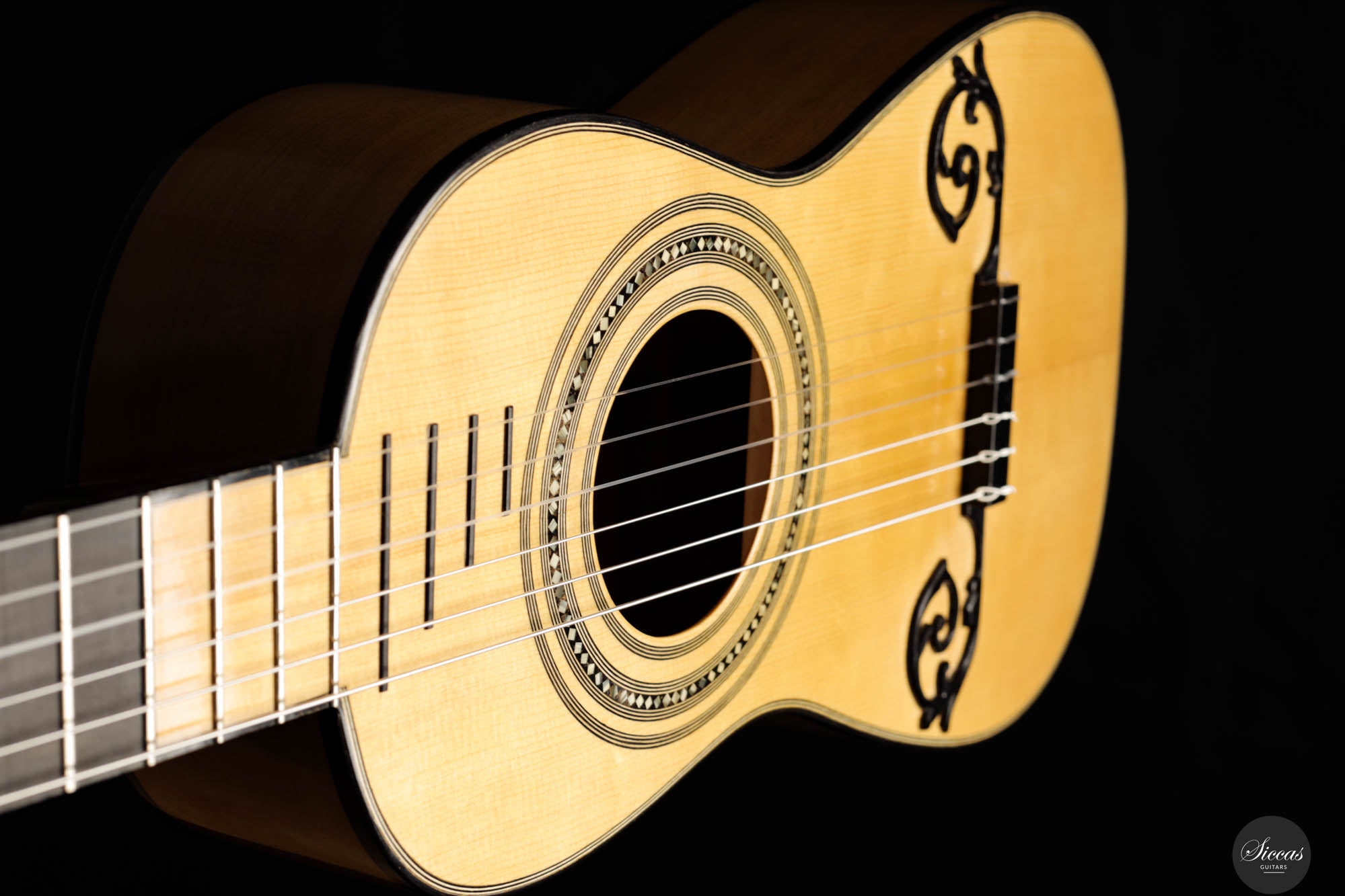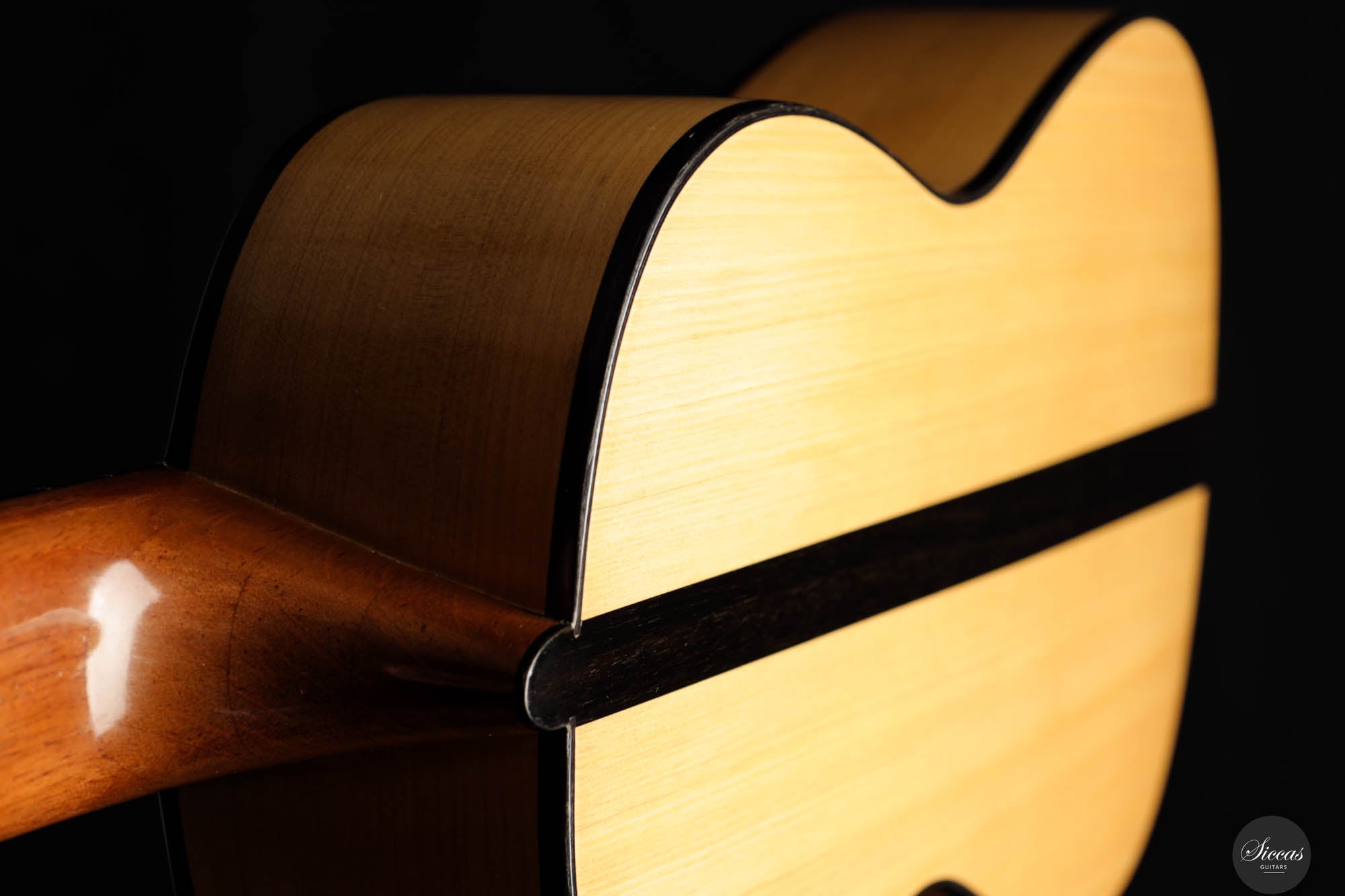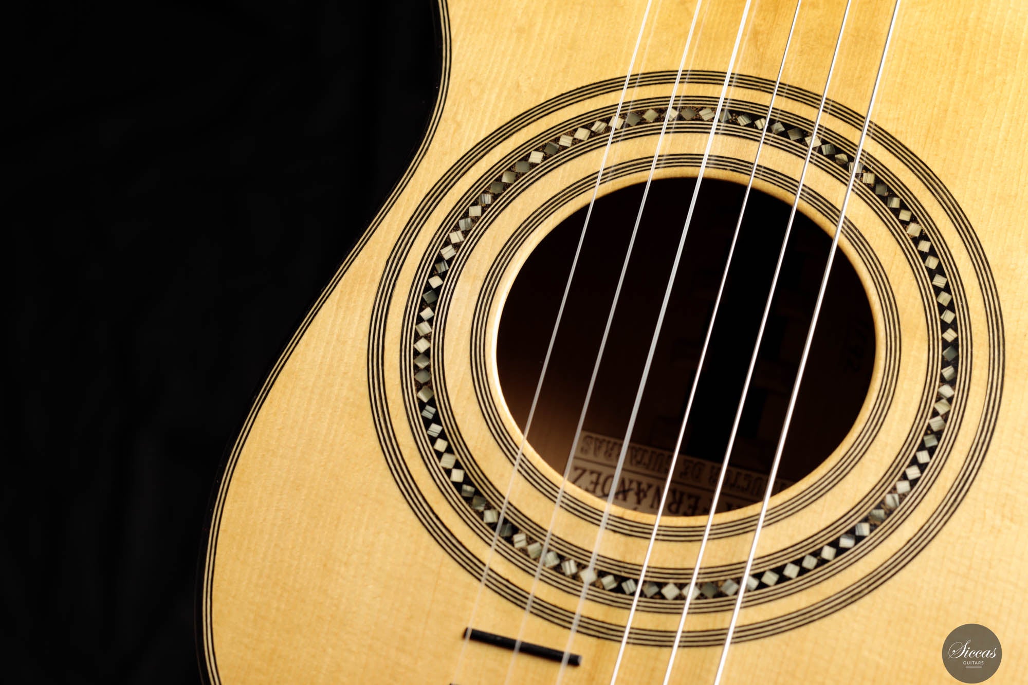 Wenn man die Saiten dieses zarten Instruments zupft, erzeugt die Schwingung der Fichte eine erhabene Empfindung; man fühlt die Ehrfurcht vor der Geschichte. Zart und süß kommt einem in Bezug auf den Ton in den Sinn, eine sehr ansprechende und leicht zu spielende Gitarre in jeder Hinsicht. Die Bauqualität ist hervorragend und zeigt ihr aufwendiges Design und ihre Verzierungen, wie die wunderschön handgeschnitzte Brücke. Ein aromatischer Duft von Zypresse steigt aus dem Schallloch beim Spielen auf und verweilt im Raum.