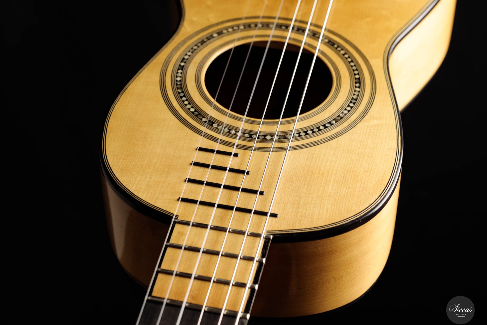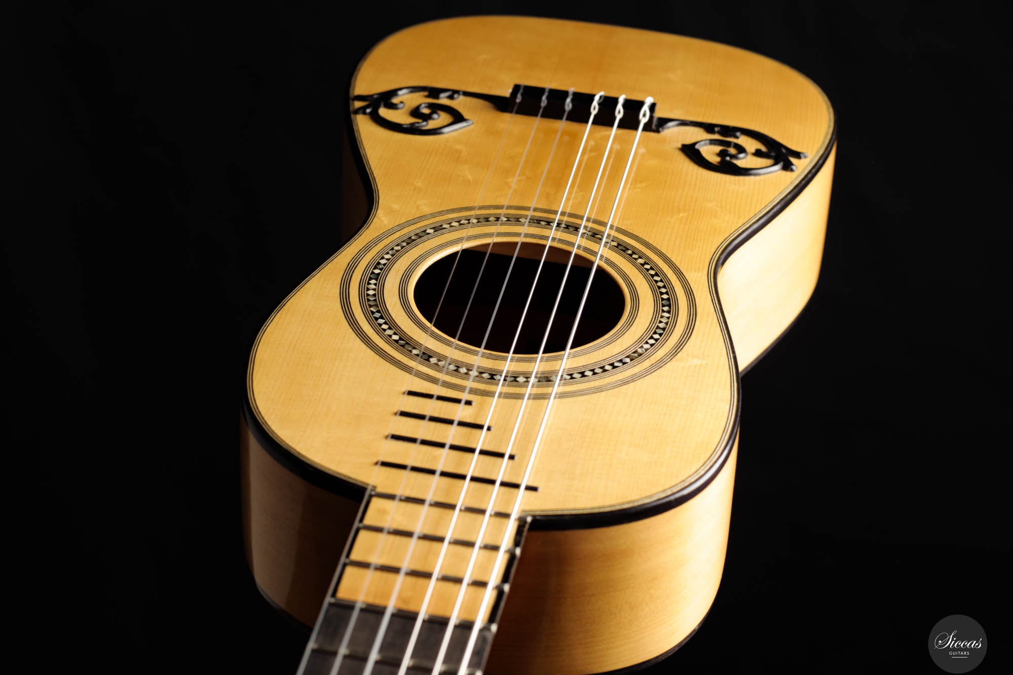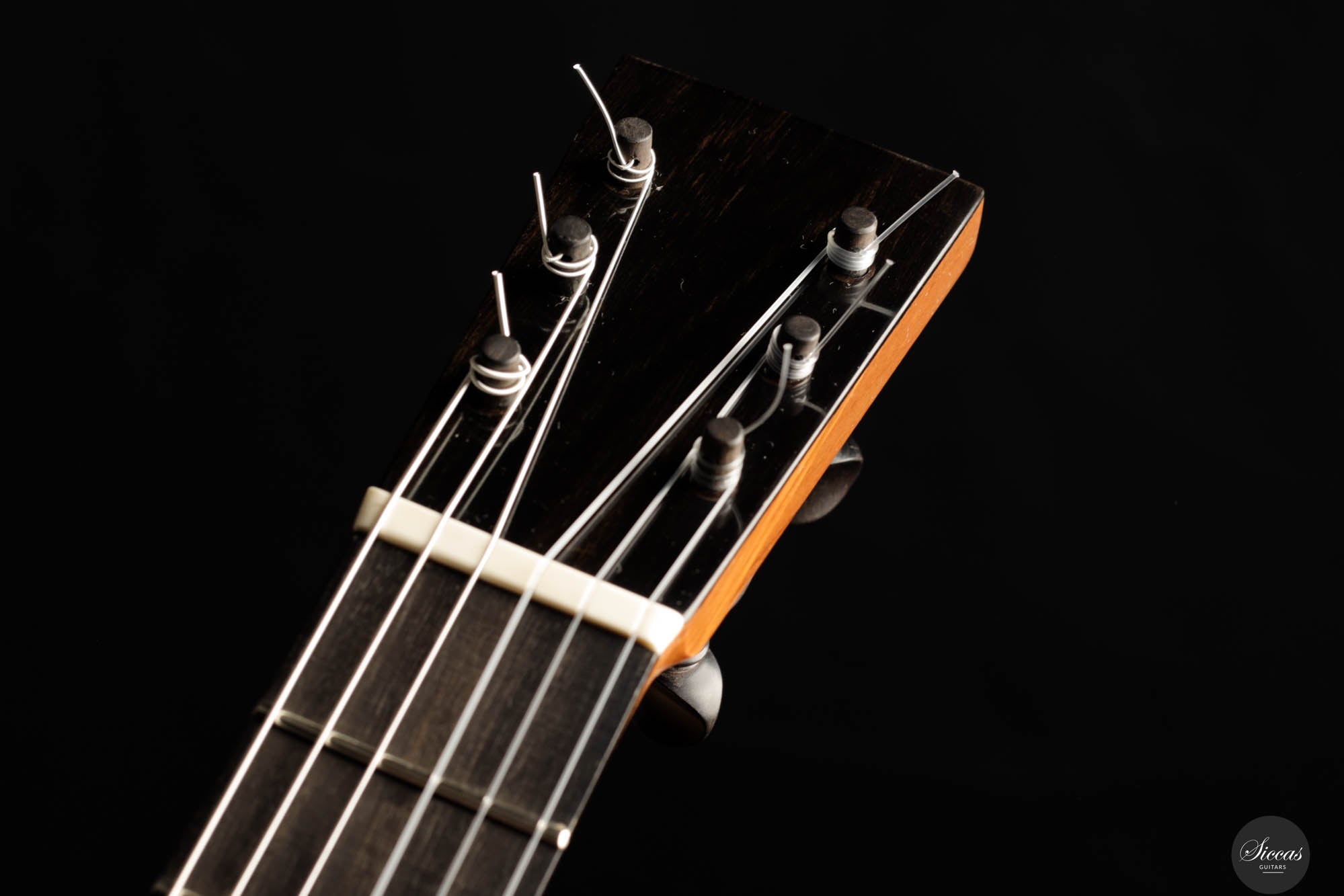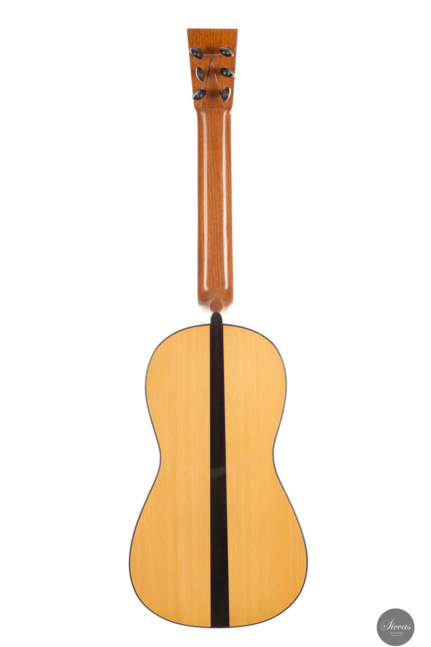 Wenn man die Saiten dieses zarten Instruments zupft, erzeugt die Schwingung der Fichte eine erhabene Empfindung; man fühlt die Ehrfurcht vor der Geschichte. Zart und süß kommt einem in Bezug auf den Ton in den Sinn, eine sehr ansprechende und leicht zu spielende Gitarre in jeder Hinsicht. Die Bauqualität ist hervorragend und zeigt ihr aufwendiges Design und ihre Verzierungen, wie die wunderschön handgeschnitzte Brücke. Ein aromatischer Duft von Zypresse steigt aus dem Schallloch beim Spielen auf und verweilt im Raum.