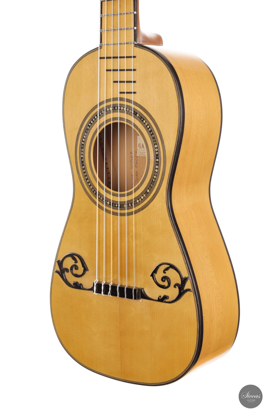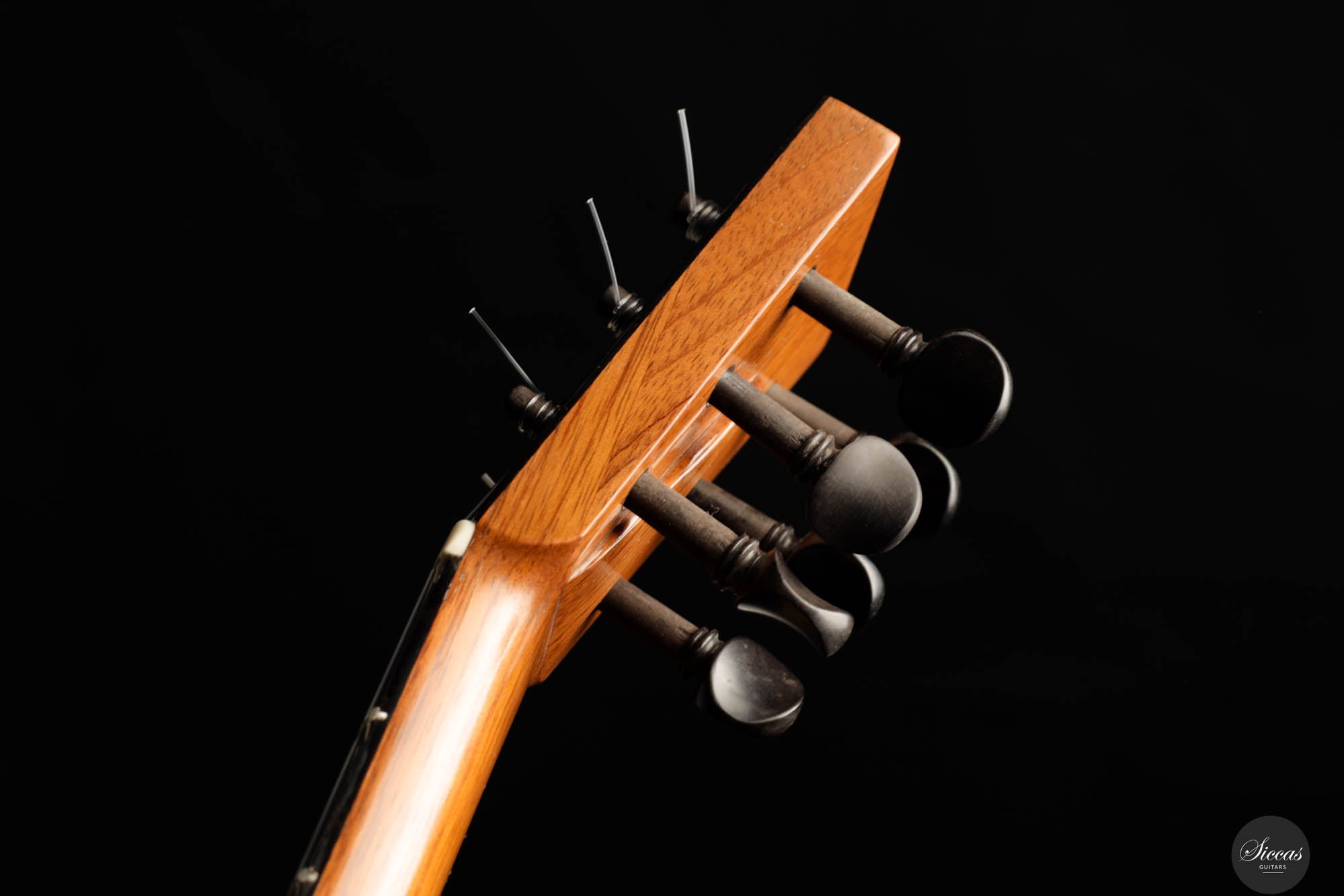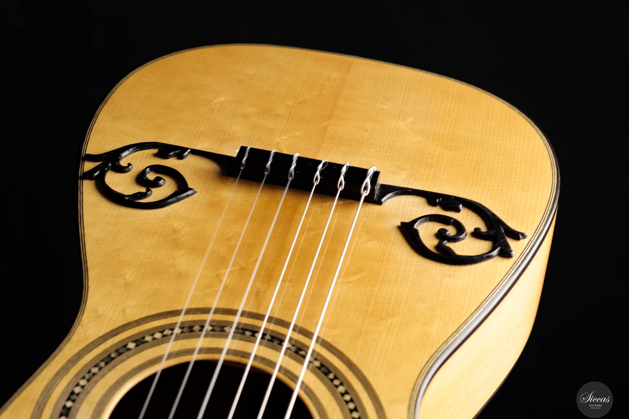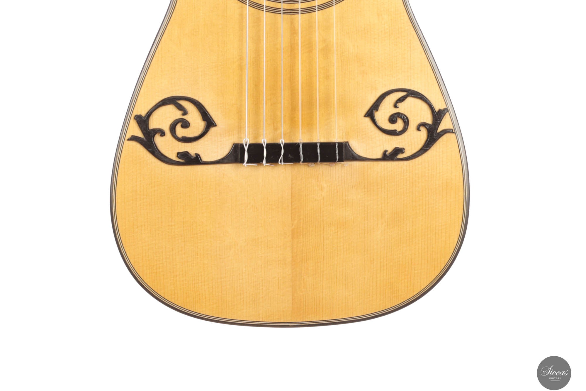 Wenn man die Saiten dieses zarten Instruments zupft, erzeugt die Schwingung der Fichte eine erhabene Empfindung; man fühlt die Ehrfurcht vor der Geschichte. Zart und süß kommt einem in Bezug auf den Ton in den Sinn, eine sehr ansprechende und leicht zu spielende Gitarre in jeder Hinsicht. Die Bauqualität ist hervorragend und zeigt ihr aufwendiges Design und ihre Verzierungen, wie die wunderschön handgeschnitzte Brücke. Ein aromatischer Duft von Zypresse steigt aus dem Schallloch beim Spielen auf und verweilt im Raum.