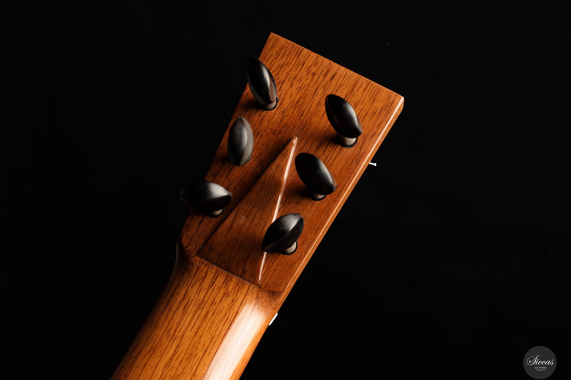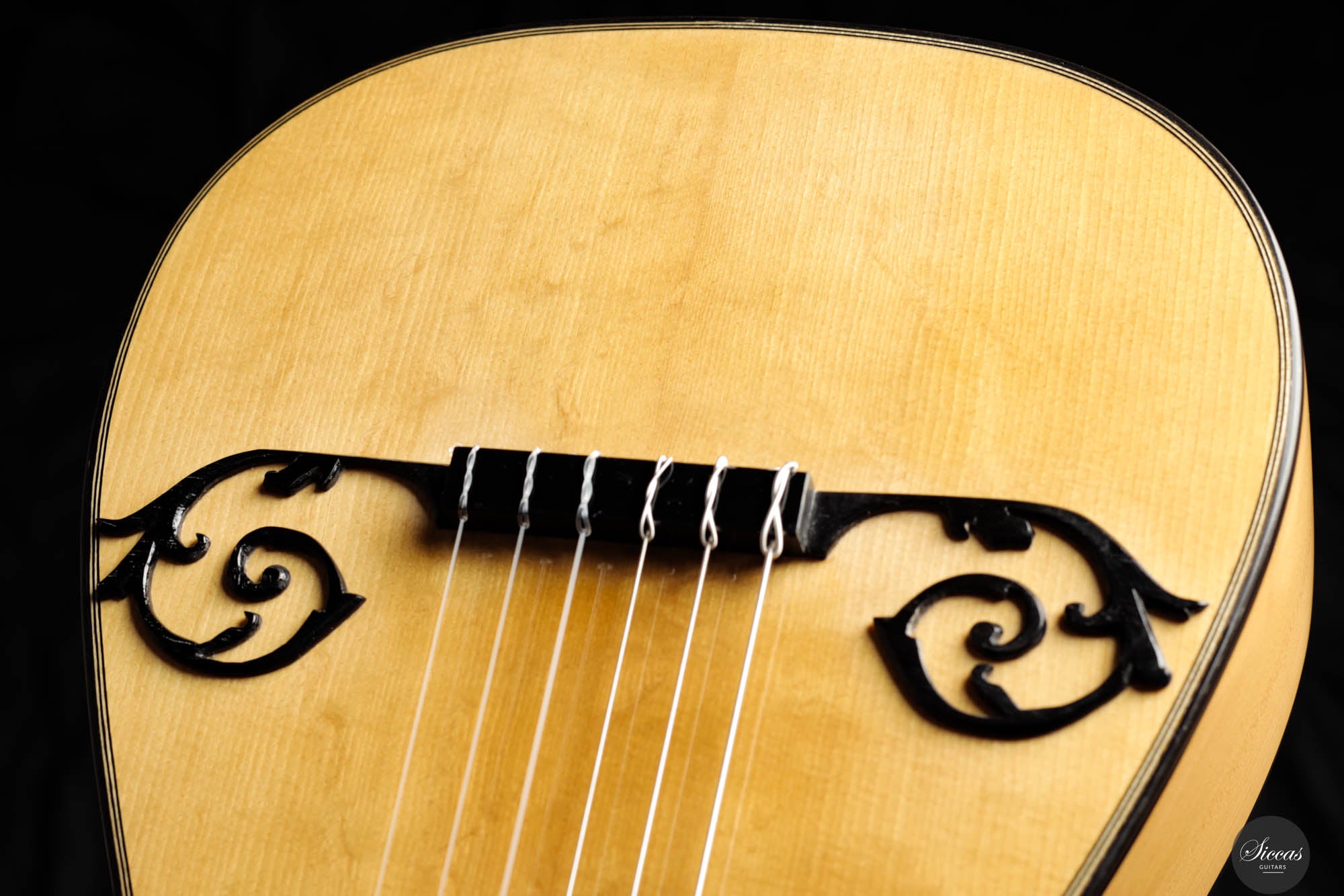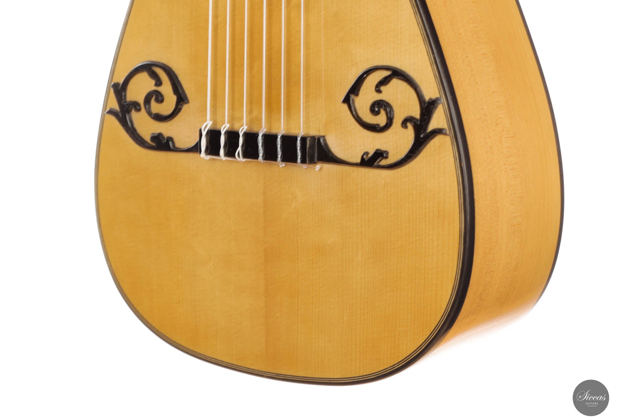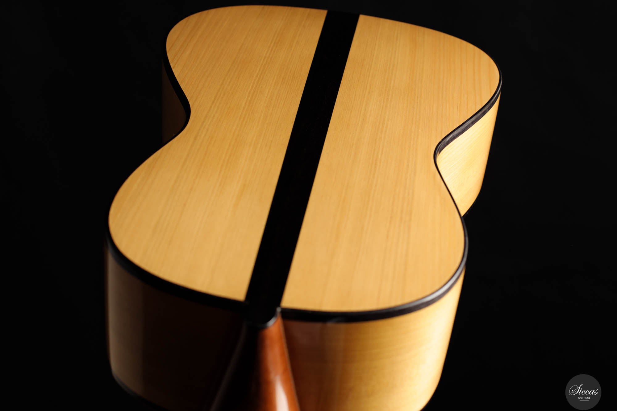 Wenn man die Saiten dieses zarten Instruments zupft, erzeugt die Schwingung der Fichte eine erhabene Empfindung; man fühlt die Ehrfurcht vor der Geschichte. Zart und süß kommt einem in Bezug auf den Ton in den Sinn, eine sehr ansprechende und leicht zu spielende Gitarre in jeder Hinsicht. Die Bauqualität ist hervorragend und zeigt ihr aufwendiges Design und ihre Verzierungen, wie die wunderschön handgeschnitzte Brücke. Ein aromatischer Duft von Zypresse steigt aus dem Schallloch beim Spielen auf und verweilt im Raum.