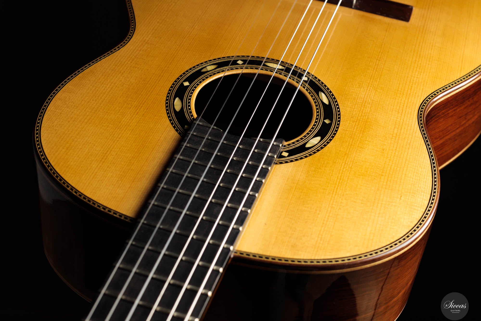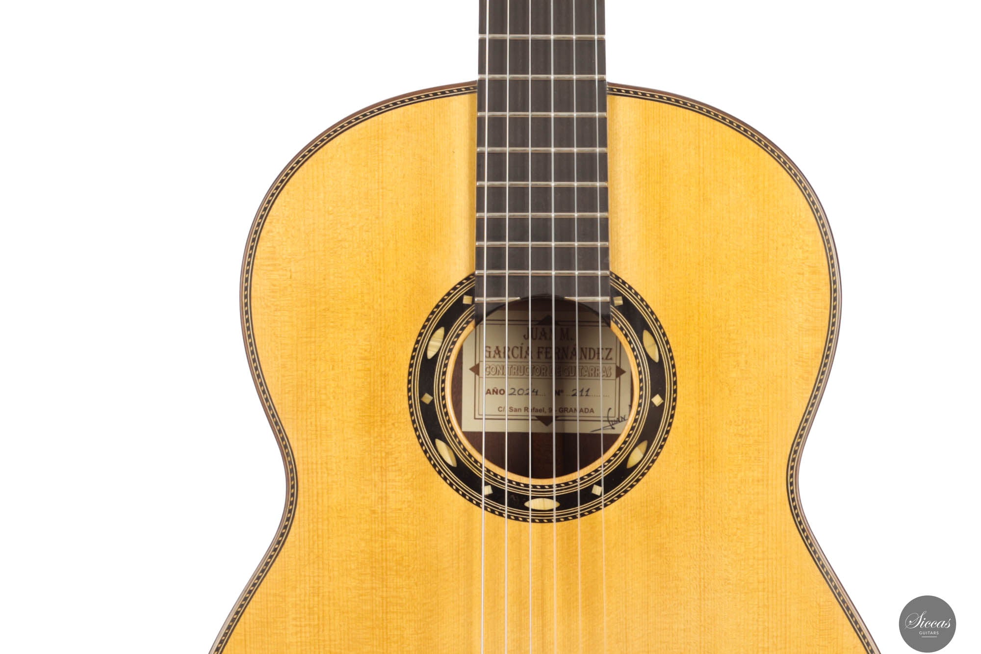 Juan Manuel García Fernández, ein erfahrener Gitarrenbauer aus Granada, stellt seit 1991 Gitarren her. Ausgebildet unter prominenten Gitarrenbaumeistern wie Miguel Carmona, Jesús López, Manuel López Bellido und Rafael Moreno, hat Fernández einen einzigartigen Stil entwickelt, der traditionelle Techniken mit seiner persönlichen Note verbindet. In seiner Werkstatt im Herzen Granadas fertigt Fernández seit 2003 Gitarren, die für ihre Spielbarkeit, ihren süßen Klang und ihre Ausgewogenheit bekannt sind. Diese Eigenschaften spiegeln sein Fachwissen und sein Engagement für Qualität wider und machen seine Instrumente zu einer bevorzugten Wahl für Musiker, die auf der Suche nach hochwertiger Handwerkskunst und außergewöhnlicher akustischer Leistung sind. Zusammenfassend lässt sich sagen, dass Juan Manuel García Fernández ein geschätzter Gitarrenbauer ist, dessen Gitarren für ihre leichte Spielbarkeit, ihre süße Klangqualität und ihren ausgewogenen Klang bekannt sind. Seine Instrumente, die im Herzen Granadas gefertigt werden, verkörpern seine jahrzehntelange Erfahrung und die unschätzbaren Lehren seiner Mentoren. Das Ergebnis sind Stücke, die den Höhepunkt der Gitarrenbautradition Granadas widerspiegeln.