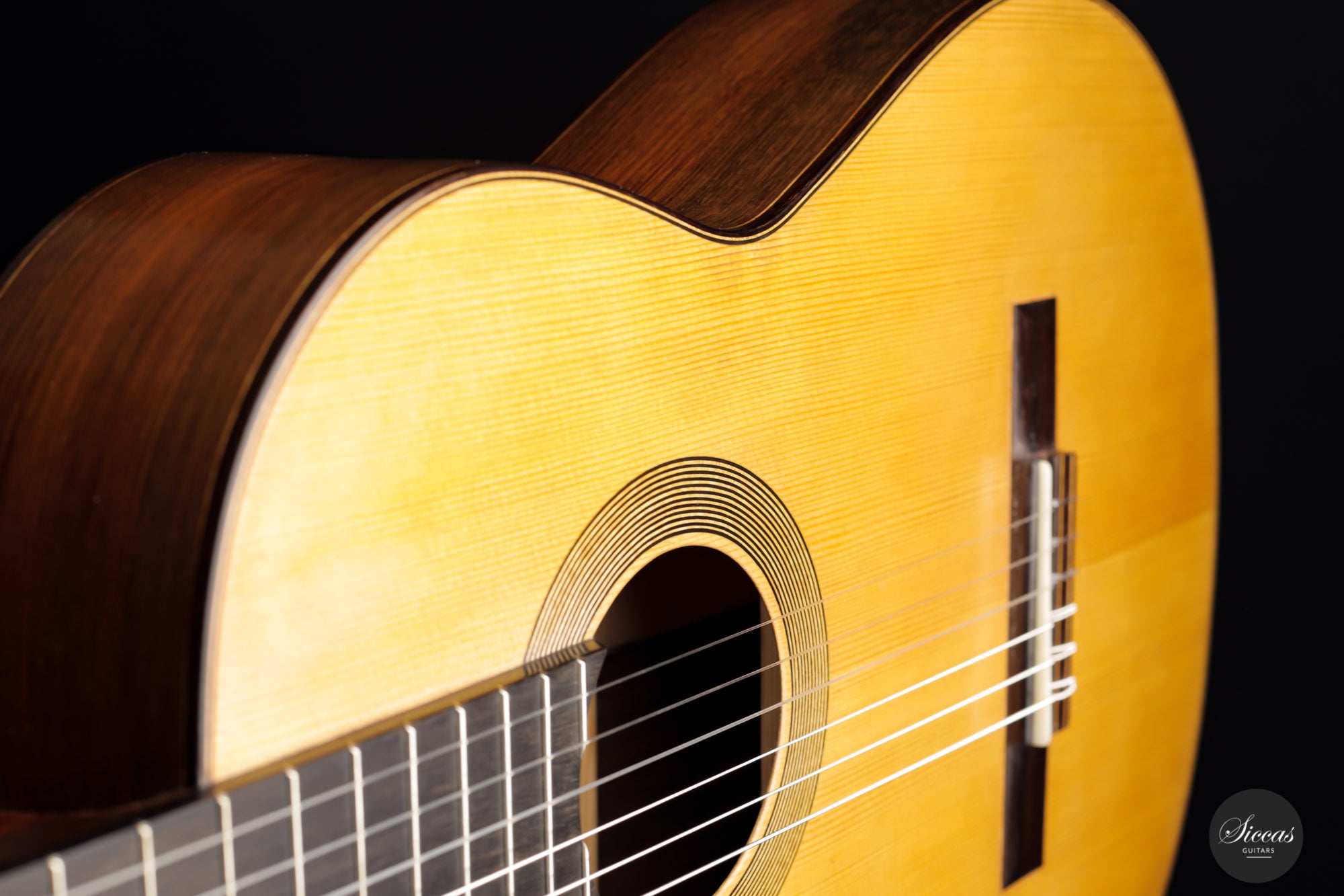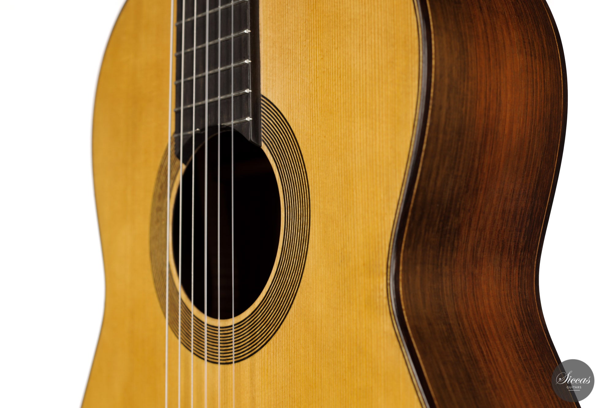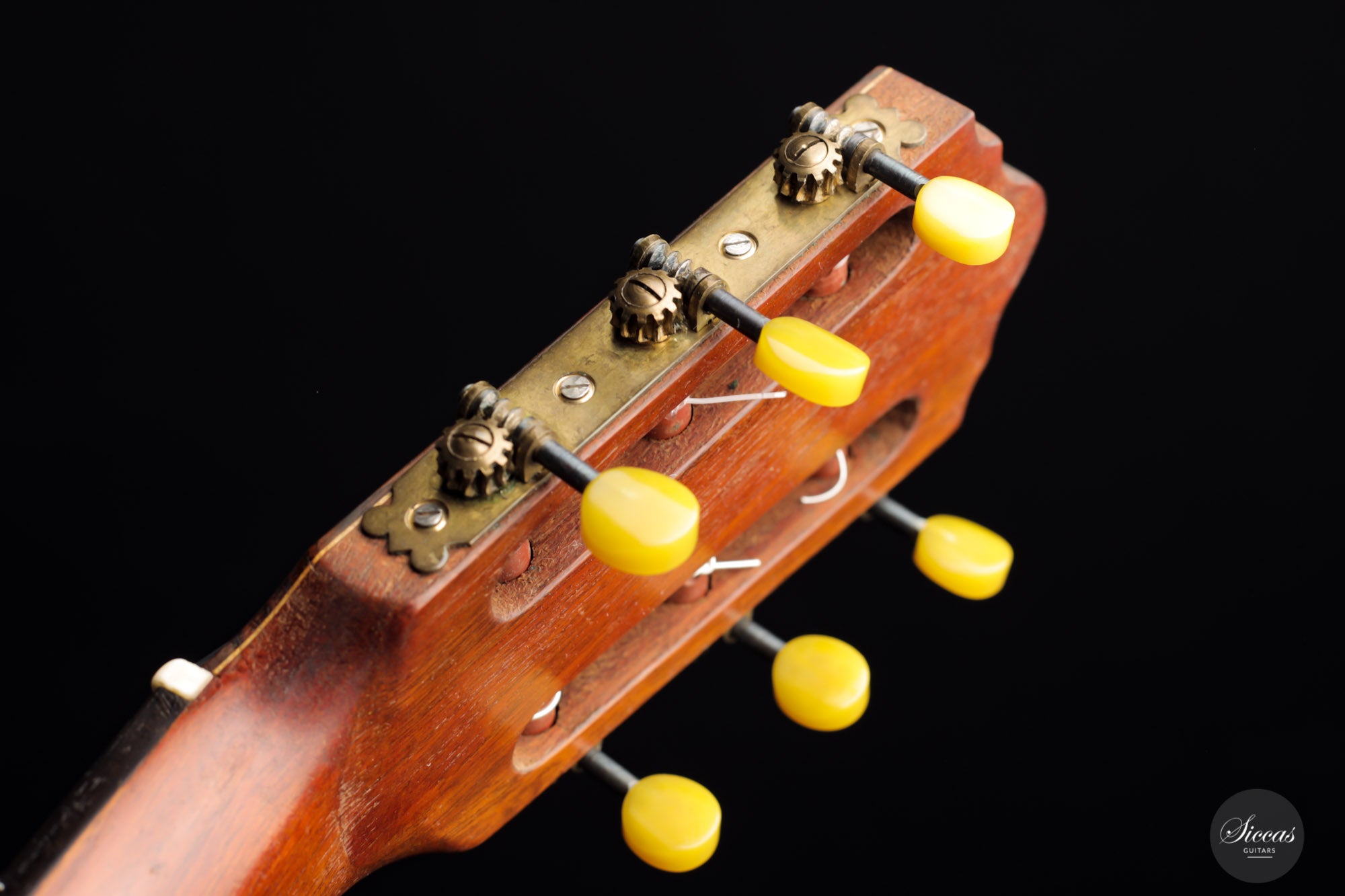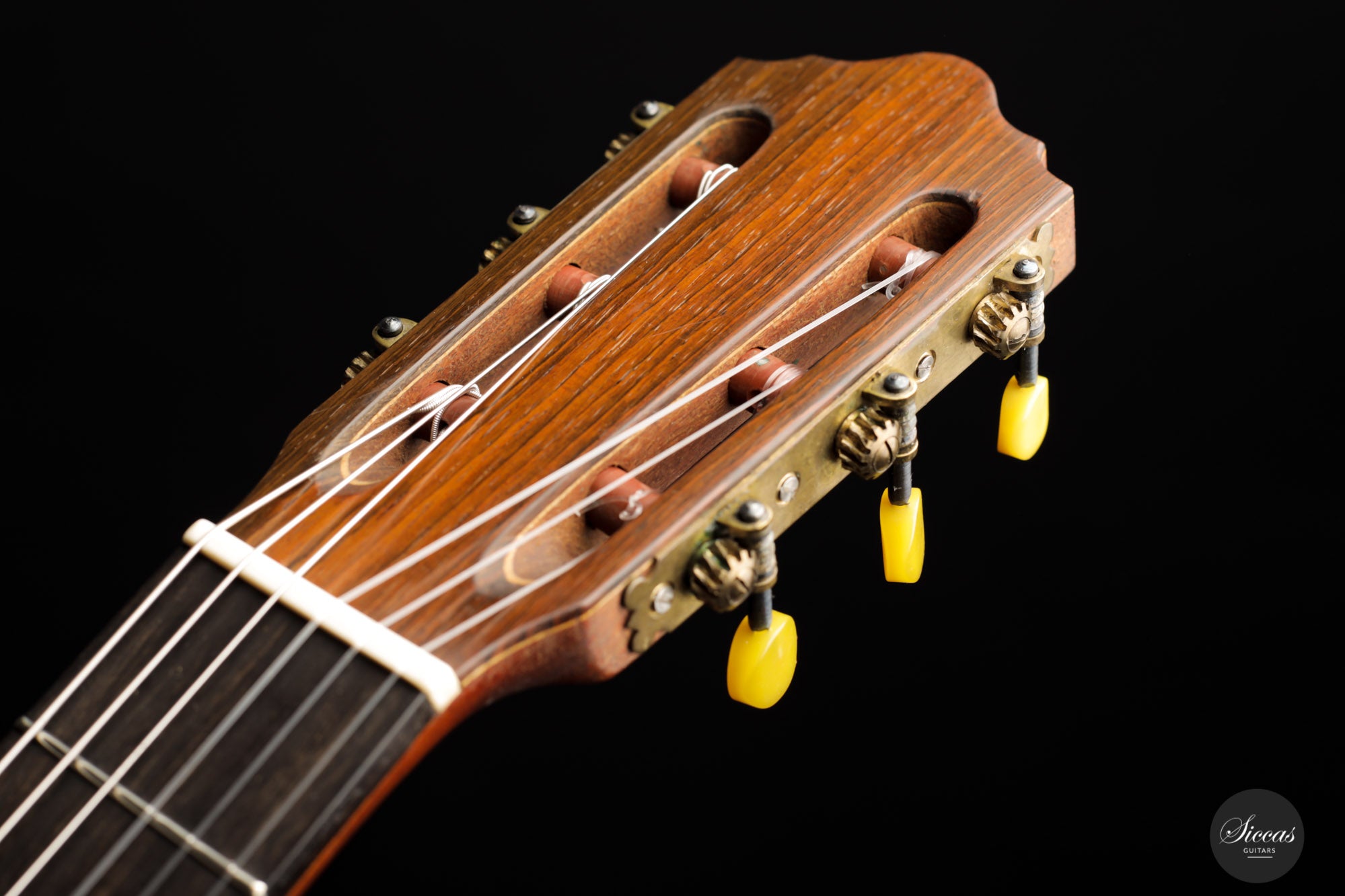 Darüber hinaus hat diese Gitarre nur einen feinen Haarriss am Boden, was für ein über 80 Jahre altes Instrument nicht ungewöhnlich und auch unbedenklich ist. Einige wenige ältere Spielspuren zeugen zudem davon, dass sie vor langer Zeit gespielt wurde, und tragen zum Charme dieses erstaunlich gut erhaltenen Instruments bei. Nicht zuletzt ist die Aufschrift "Buena Epoca" auf dem Etikett unseres Wissens einzigartig. Sie verdeutlicht den hohen Stellenwert welches dieses Instrument für Julían Gomez Ramirez gehabt haben muss und macht dieses Instrument zu einer absoluten Rarität.