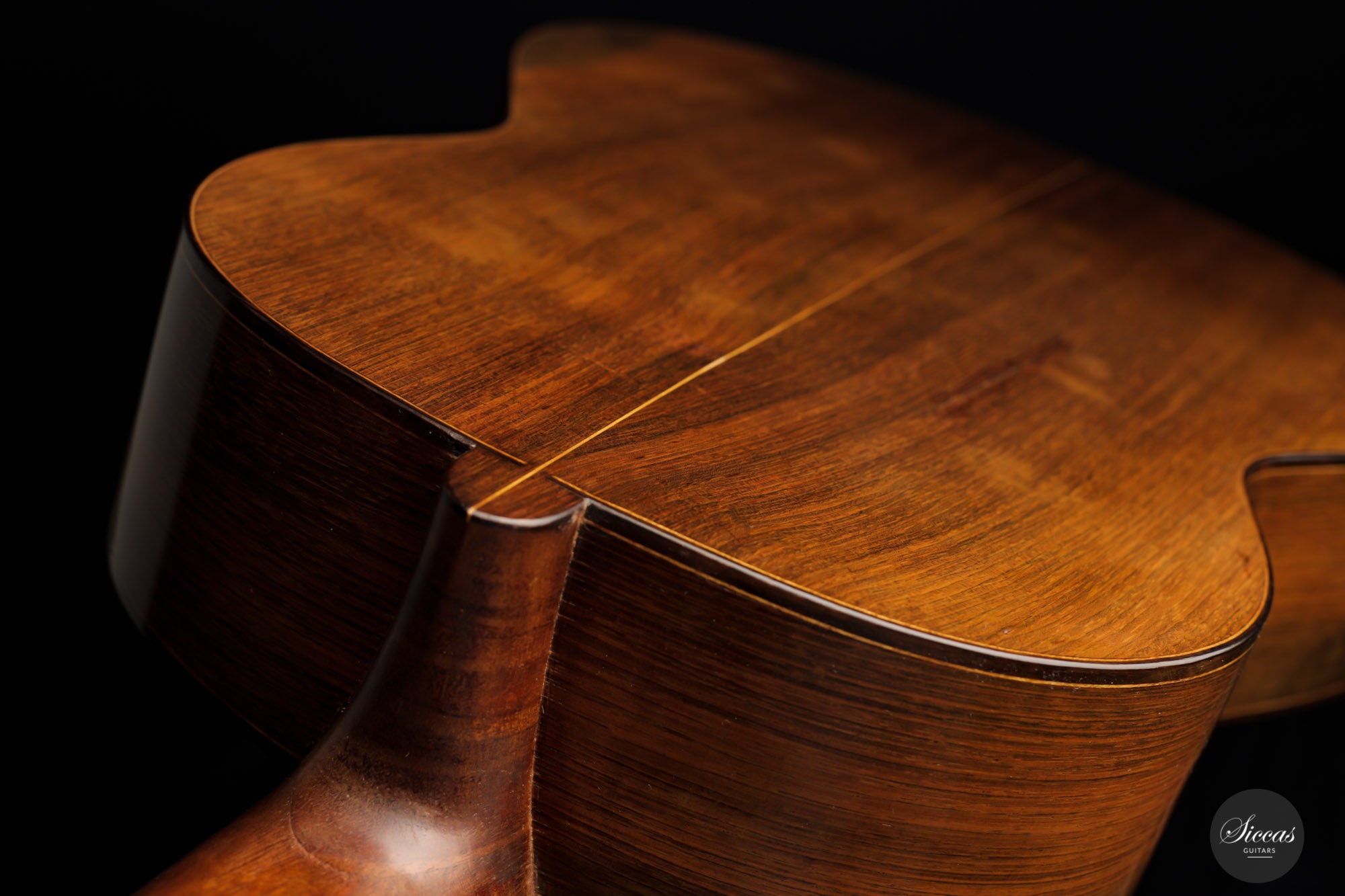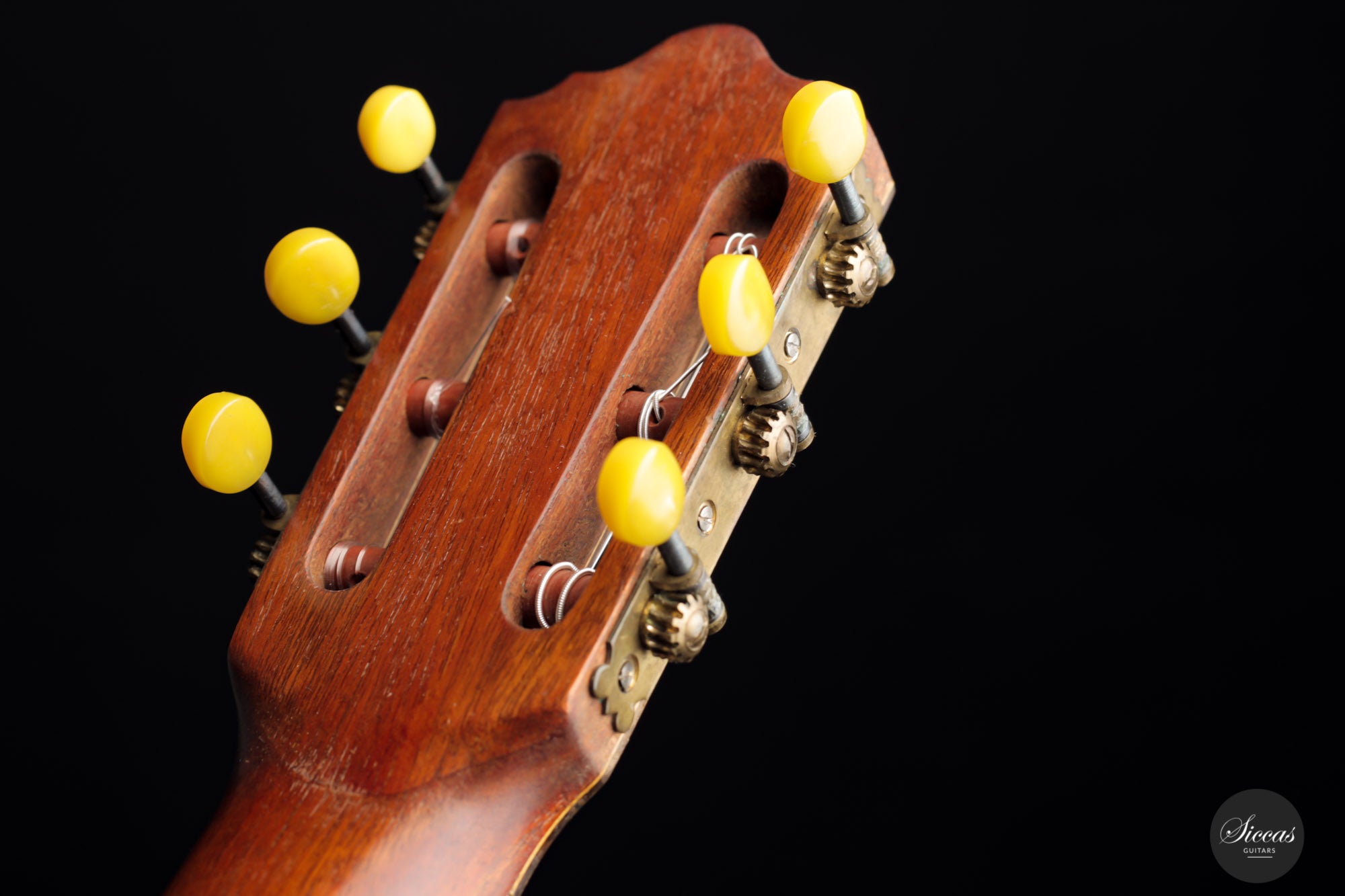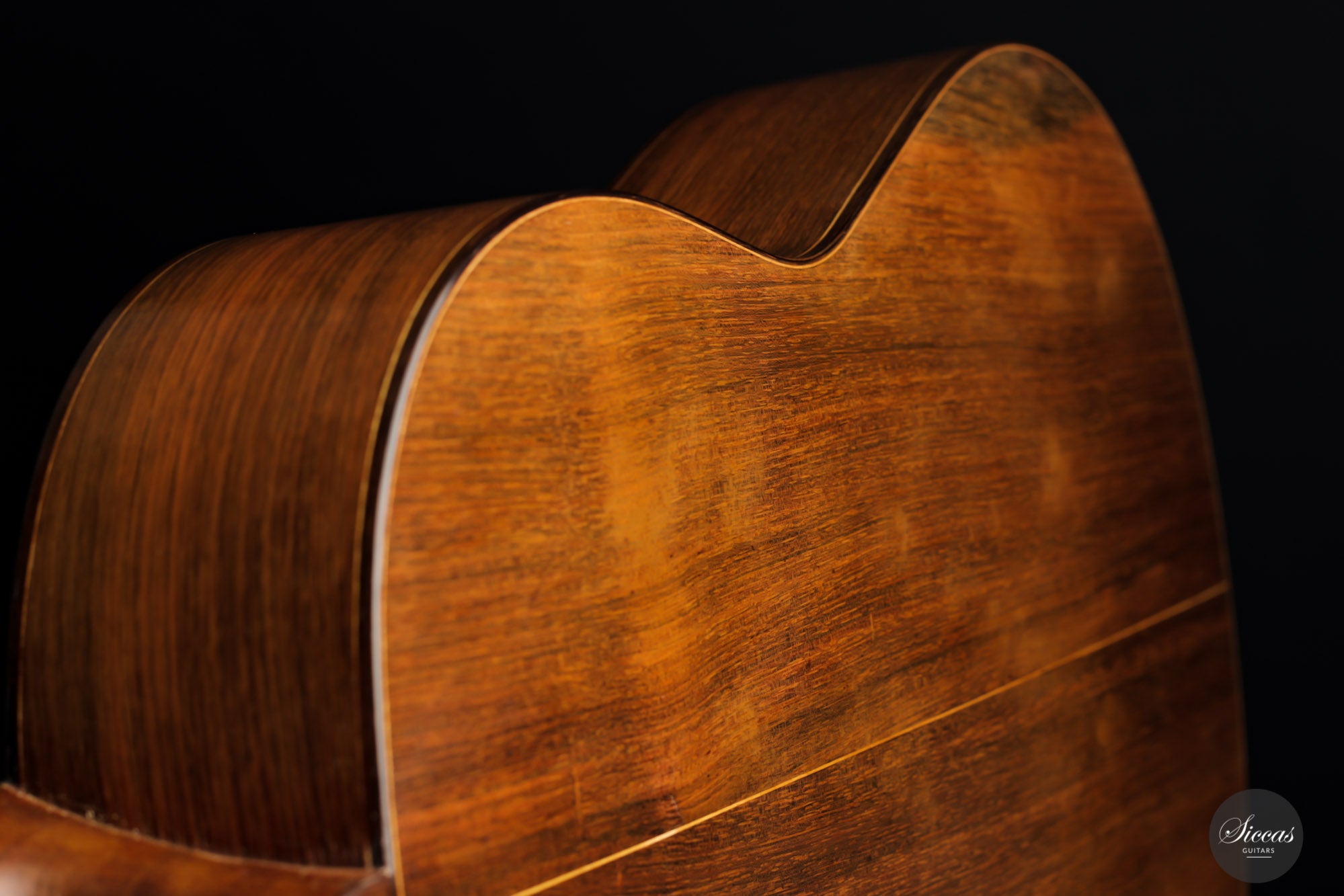 Darüber hinaus hat diese Gitarre nur einen feinen Haarriss am Boden, was für ein über 80 Jahre altes Instrument nicht ungewöhnlich und auch unbedenklich ist. Einige wenige ältere Spielspuren zeugen zudem davon, dass sie vor langer Zeit gespielt wurde, und tragen zum Charme dieses erstaunlich gut erhaltenen Instruments bei. Nicht zuletzt ist die Aufschrift "Buena Epoca" auf dem Etikett unseres Wissens einzigartig. Sie verdeutlicht den hohen Stellenwert welches dieses Instrument für Julían Gomez Ramirez gehabt haben muss und macht dieses Instrument zu einer absoluten Rarität.