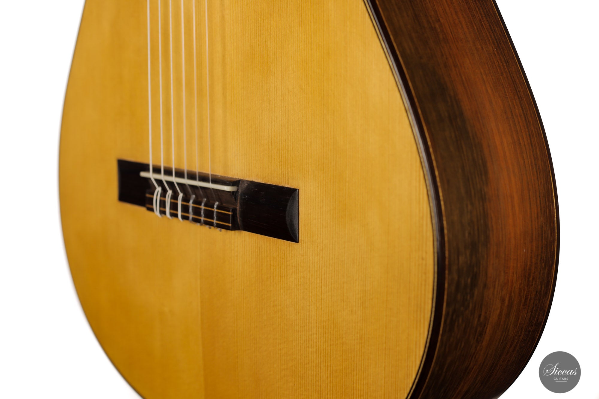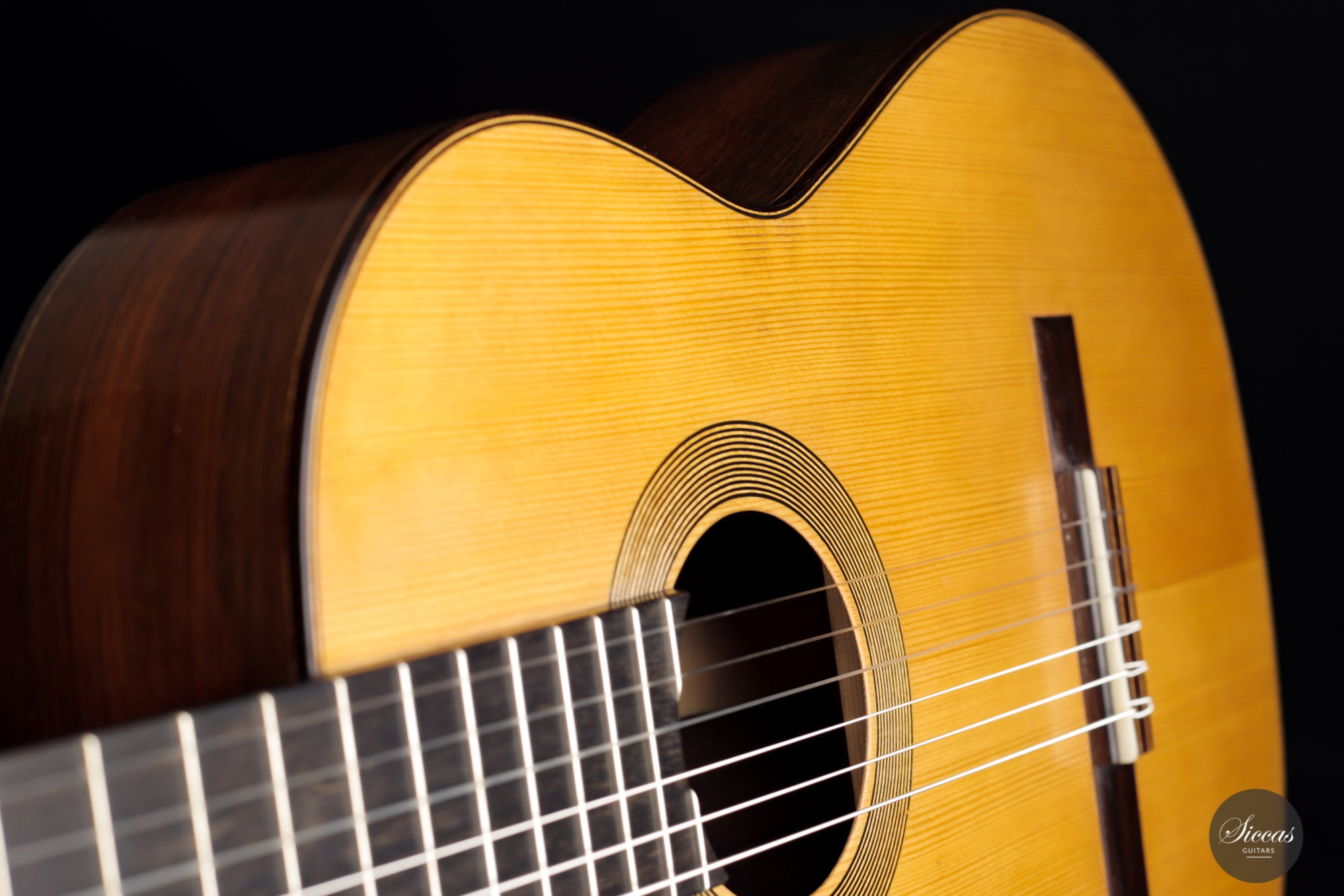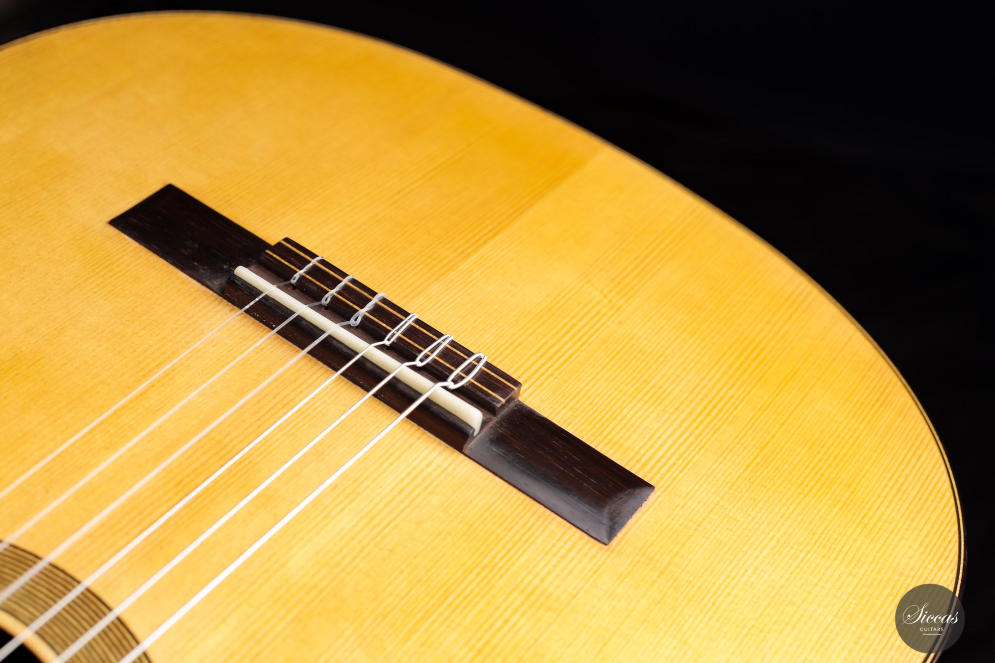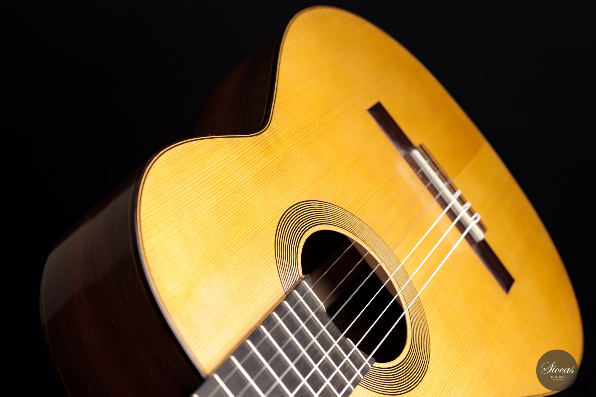 Darüber hinaus hat diese Gitarre nur einen feinen Haarriss am Boden, was für ein über 80 Jahre altes Instrument nicht ungewöhnlich und auch unbedenklich ist. Einige wenige ältere Spielspuren zeugen zudem davon, dass sie vor langer Zeit gespielt wurde, und tragen zum Charme dieses erstaunlich gut erhaltenen Instruments bei. Nicht zuletzt ist die Aufschrift "Buena Epoca" auf dem Etikett unseres Wissens einzigartig. Sie verdeutlicht den hohen Stellenwert welches dieses Instrument für Julían Gomez Ramirez gehabt haben muss und macht dieses Instrument zu einer absoluten Rarität.