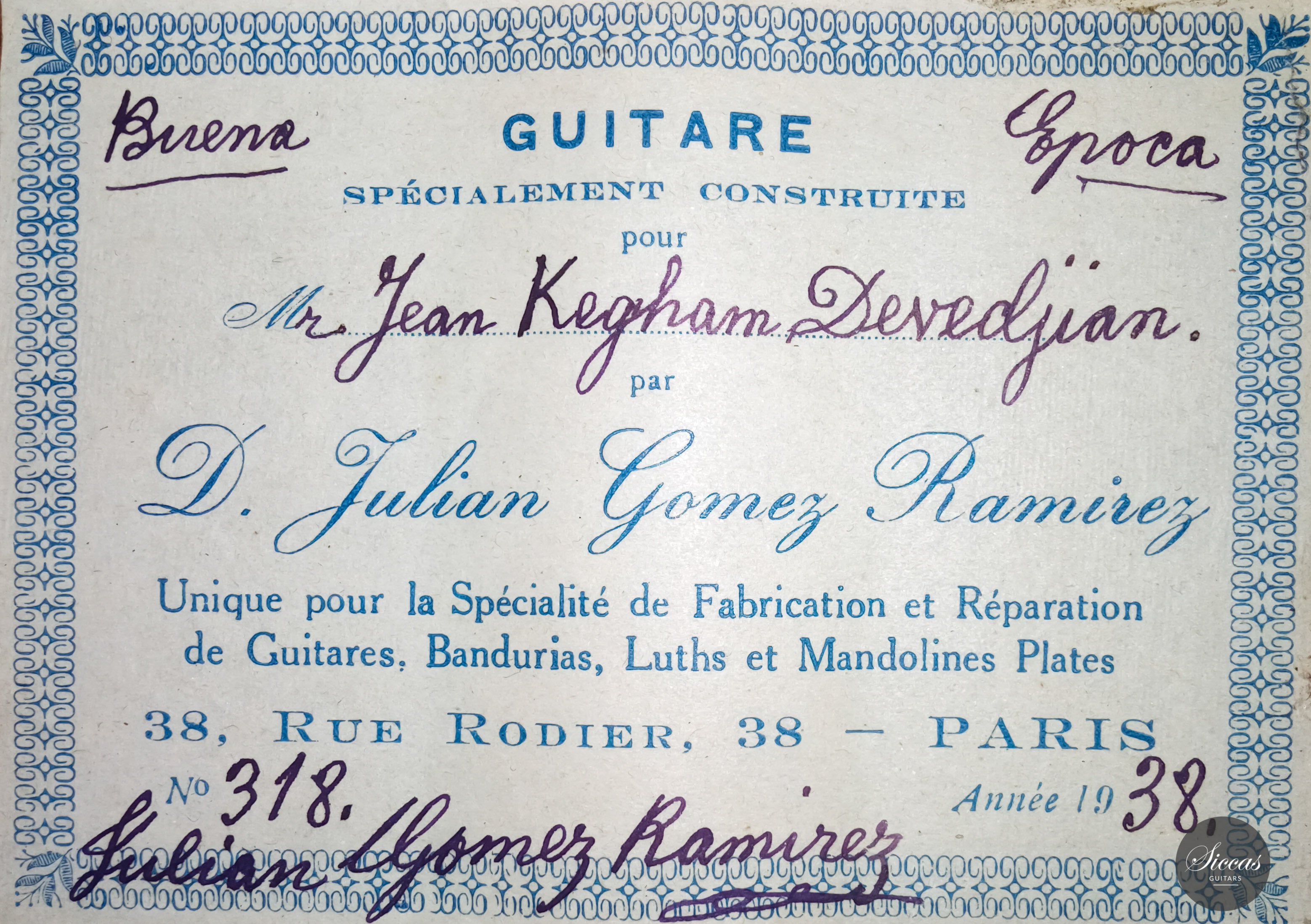 Julían Gómez Ramírez wurde 1879 in Madrid geboren. Schon mit 13 Jahren begann er in der Werkstatt von Augustín Andrés zu arbeiten. Mit 31 Jahren, im Jahr 1910, arbeitete er bei José Ramirez I. Nach dieser lehrreichen Zeit kam er vermutlich im Jahr 1914 als der erste Vertreter der spanischen Gitarrenbaukunst nach Paris und revolutionierte den Gitarrenbau in Frankreich. Zu jener Zeit war die französische Gitarrenbaukunst mit ihren romantischen Gitarren aufgrund der großen Beliebtheit des Klaviers unpopulär geworden. Im Jahr 1938 lernte Julían Gómez Ramírez Robert Bouchet (1898-1986) kennen, als dieser eine Gitarre von ihm kaufte. Es entwickelte sich zwischen ihnen eine Freundschaft und J. G. Ramírez lehrte schließlich Robert Bouchet den Gitarrenbau. Später gab Robert Bouchet sein Wissen an Christian Aubin weiter, welcher in den 1950er Jahren Daniel Friederich sein Wissen weitergab.