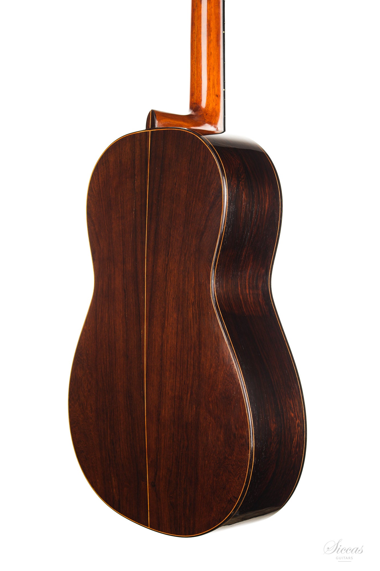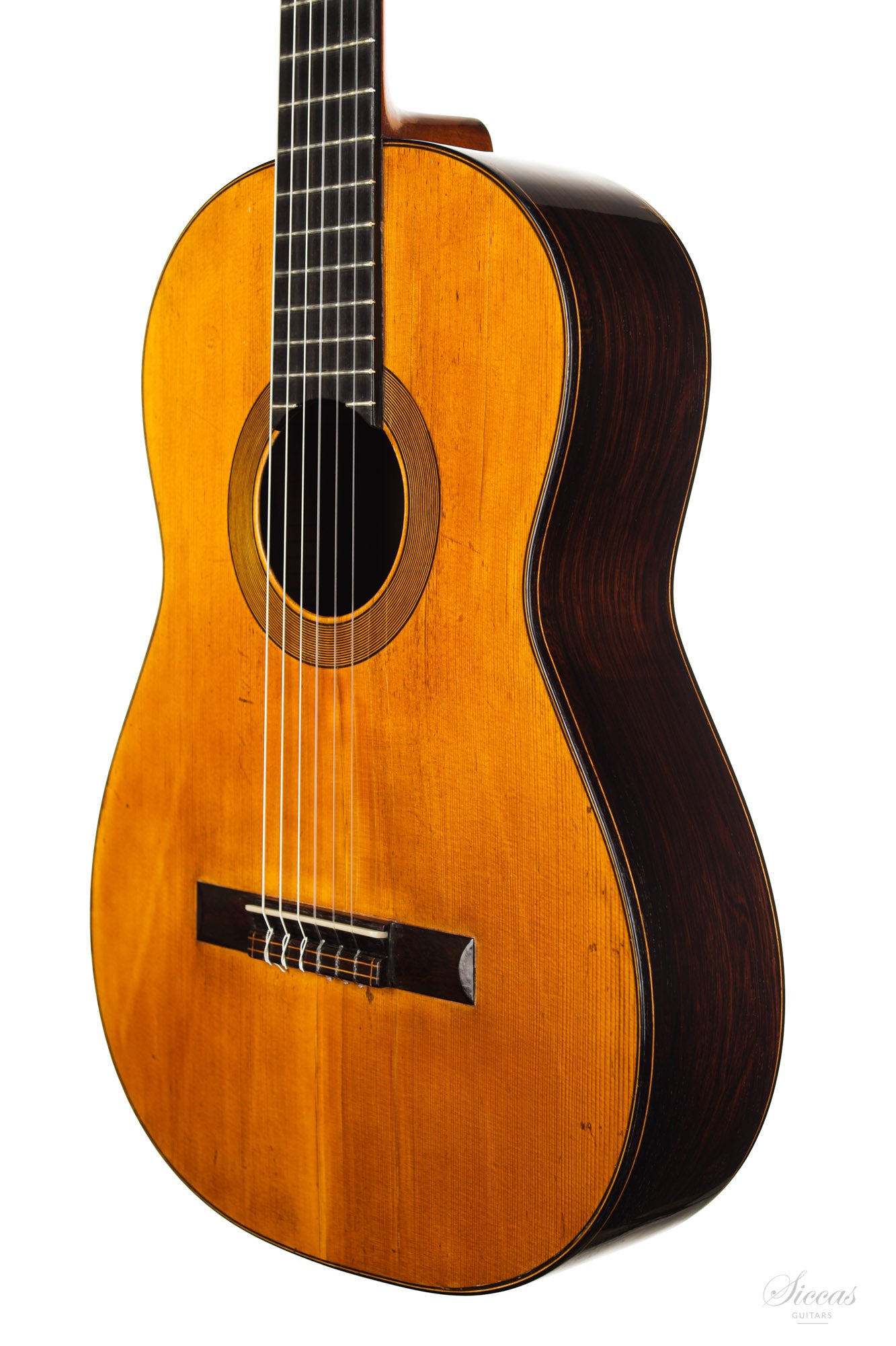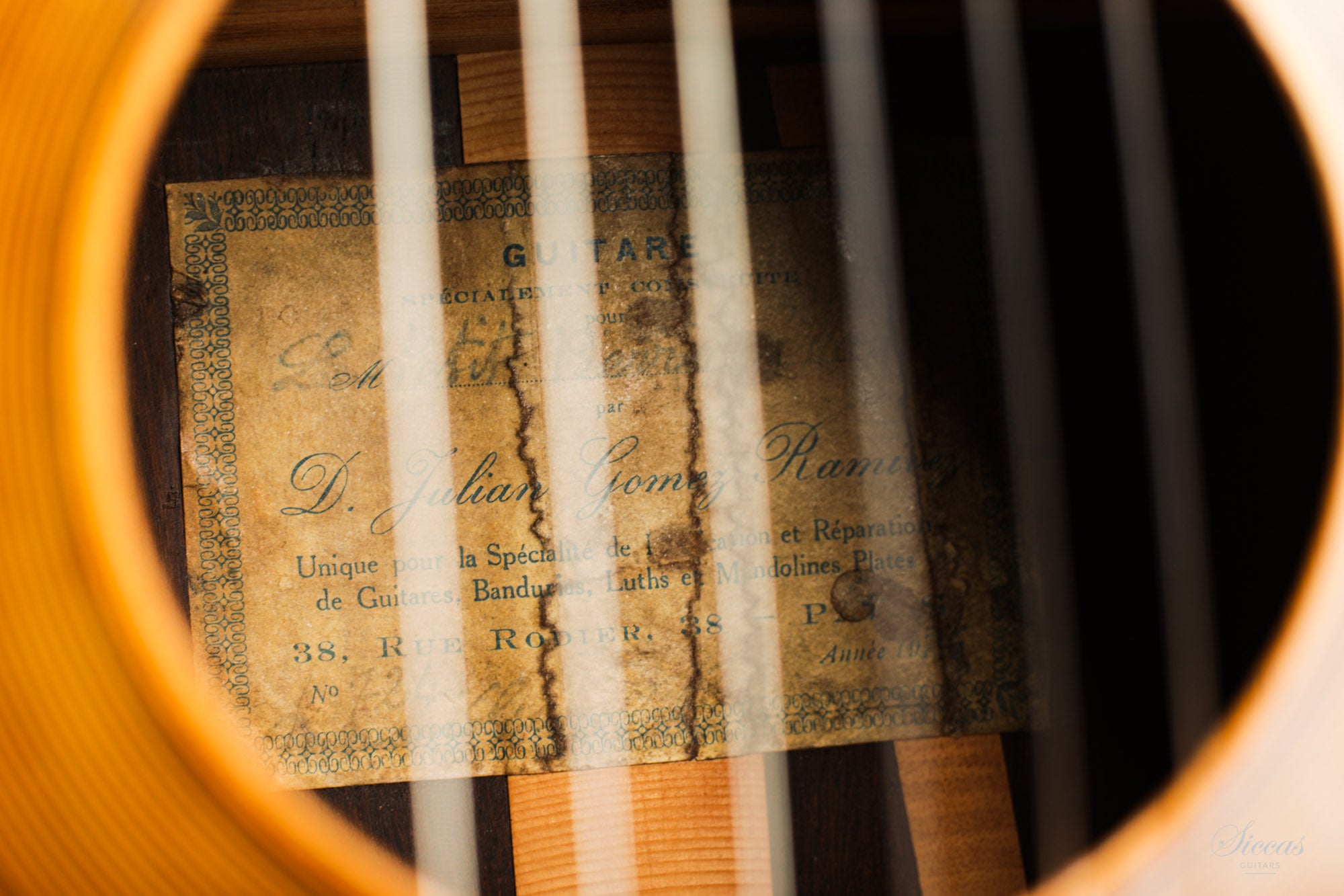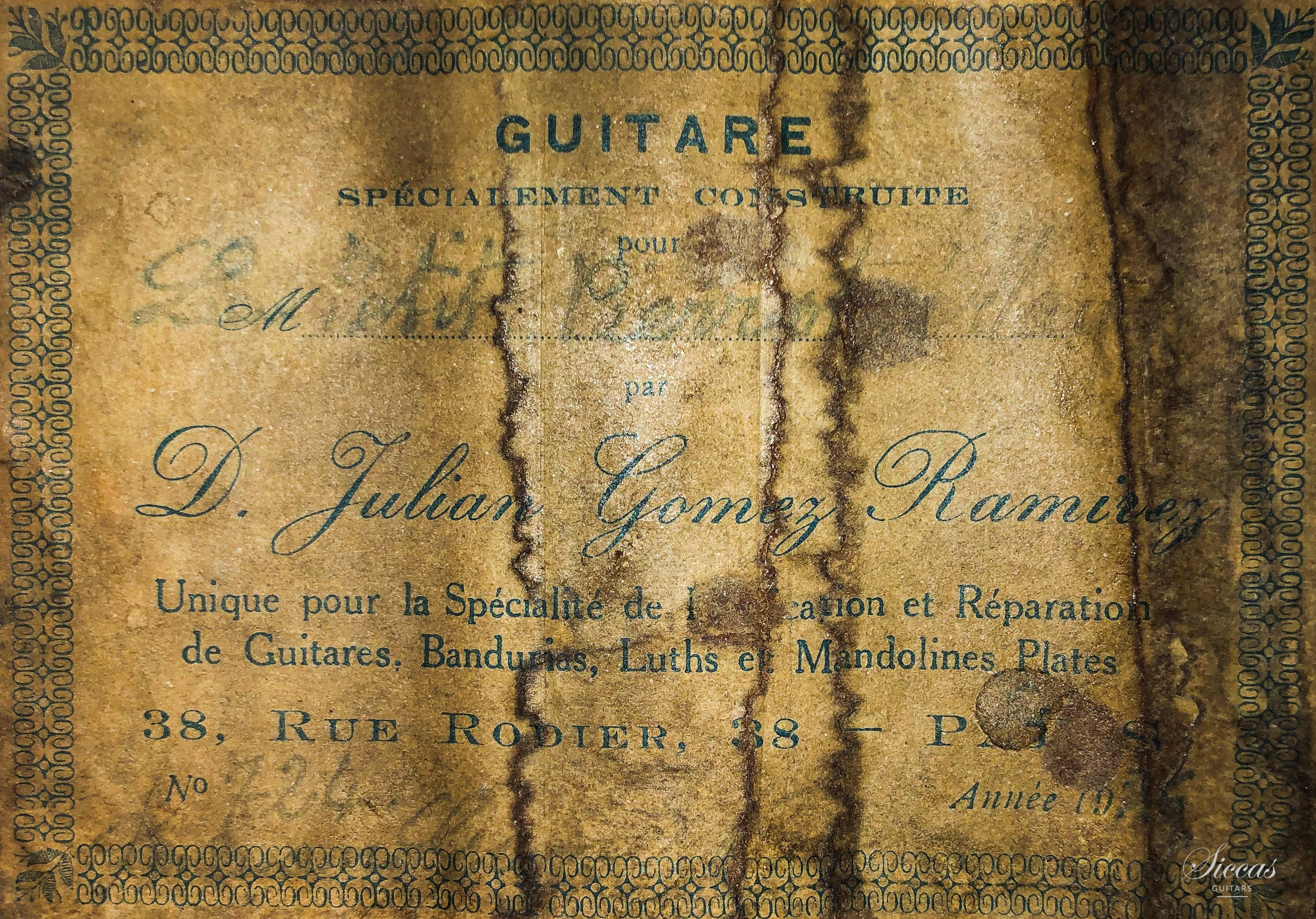 This guitar was built in 1936 by Julian Gomez Ramirez in his Parisian workshop in the Rue Rodier and is an excellent example of his finest guitar. Numbered 724 and hand-signed by the famous luthier, it has the characteristics of careful and meticulous work for this special order of "Le Petit Pierrot [...]" (partially readable on the label). As a sign of the special care and attention to detail that went into this custom order, this guitar has Rio Rosewood (pre-CITES) back and sides, a top made of high-quality spruce with a very narrow grain, a light neck reinforcement of wood in the continuity of the center filet of the back, an ebony fingerboard and a bridge that is also decorated with fine ornaments. This guitar, which is now in perfect playing condition, has been restored several times in the course of its almost one hundred year history. The cracks on the top and the back have been stabilized and the varnish renewed so that this is a restored instrument ready to be played.