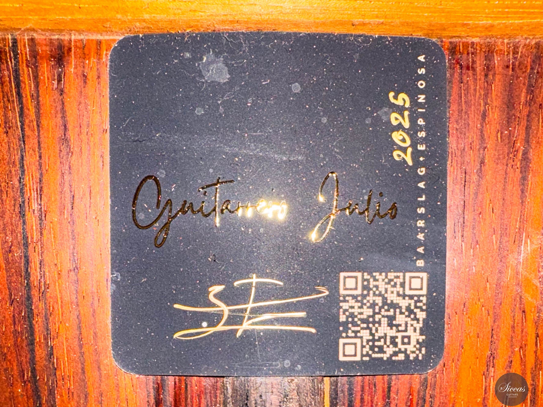 Julio Baarslag Espinosa führt die Tradition zweier renommierter Gitarrenbauerfamilien fort. Aufgewachsen in einer Werkstatt, die seit 1980 besteht, beschreibt er sich selbst als jemand, der „seit Geburt in der Werkstatt gelebt hat“ – stets ermutigt, eigene Wege zu gehen und handwerklich zu experimentieren. Parallel zu seiner Ausbildung im Bereich erneuerbare Energien absolvierte er eine vollständige Lehre im Gitarrenbau und widmete sich schließlich ganz dem Familienhandwerk. Unter Anleitung seiner Eltern entwickelte er ein eigenes Modell, das die Tradition der Granadiner Schule mit modernen Bauprinzipien verbindet – eine Synthese, die sein individuelles klangliches Profil prägt.