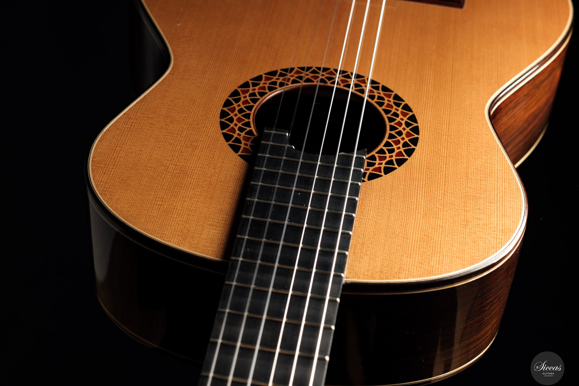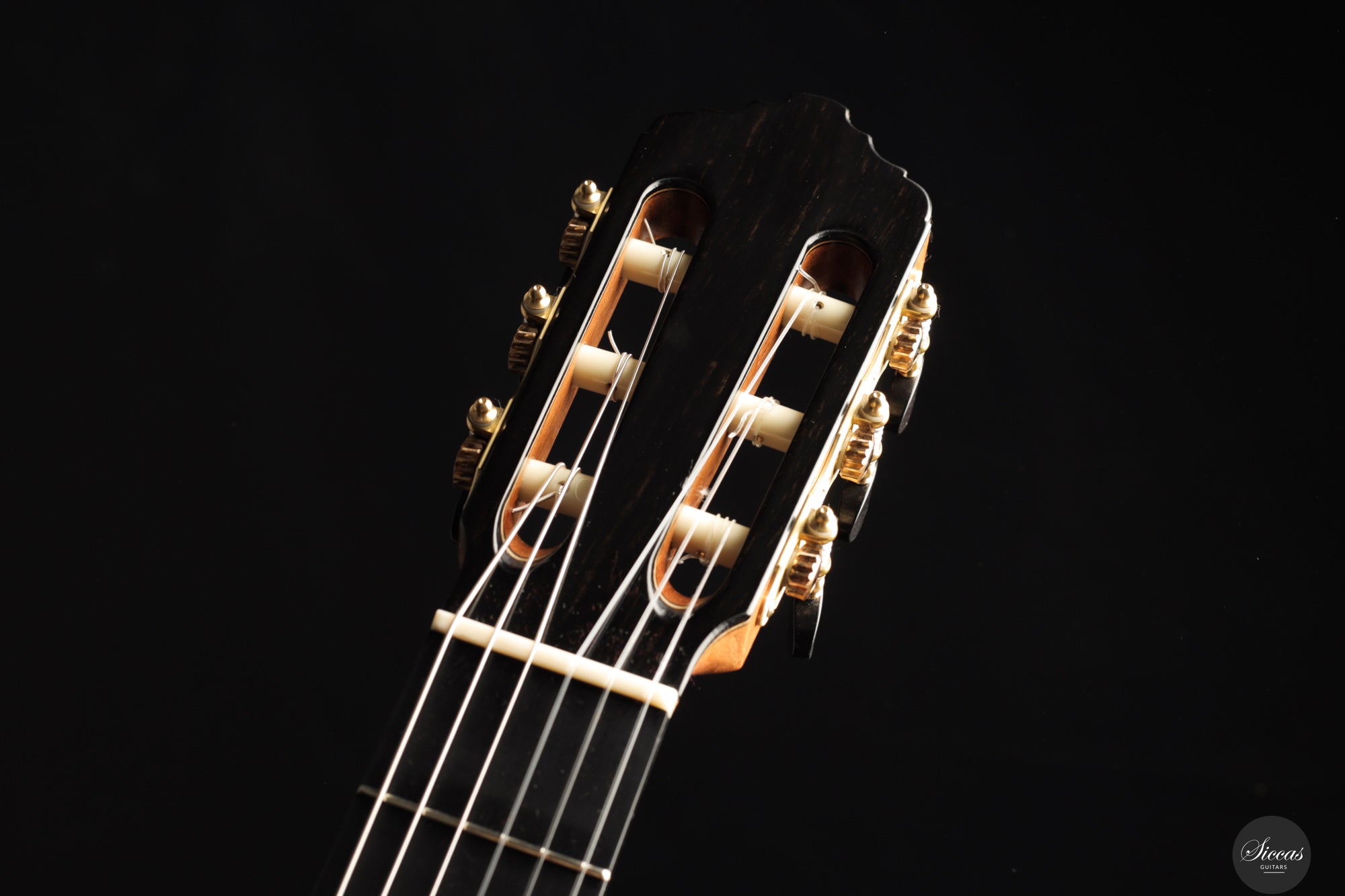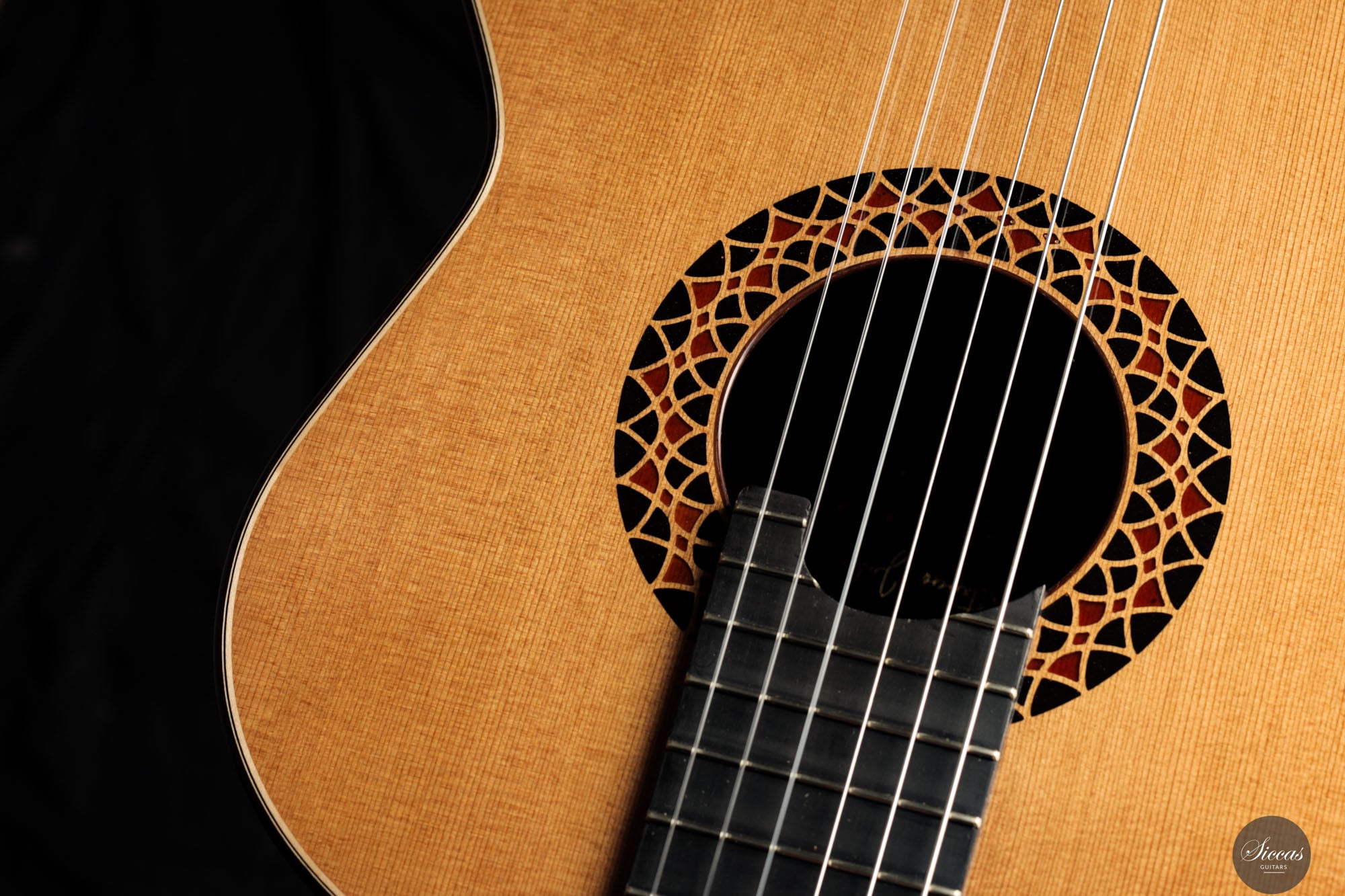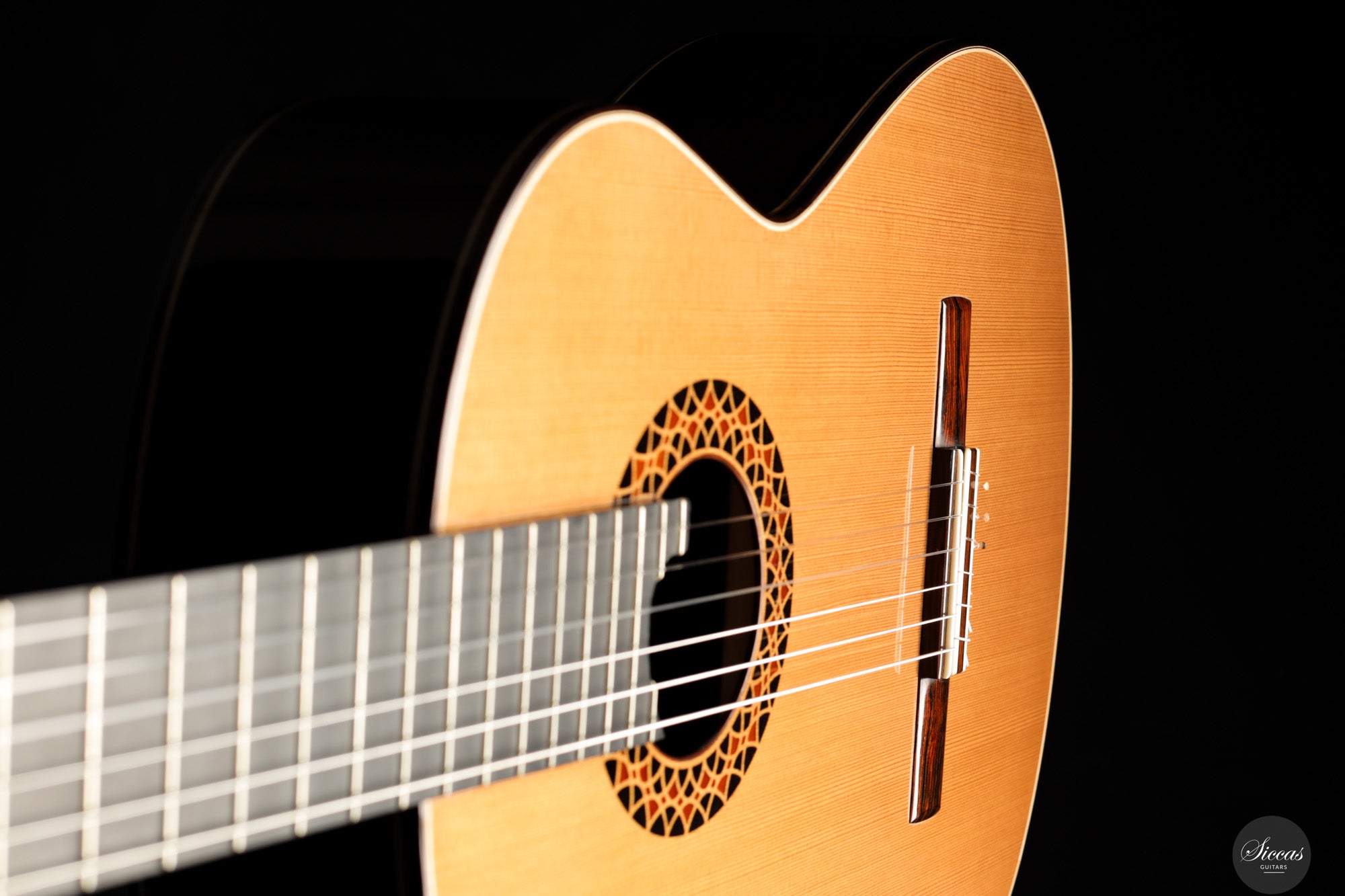 Klanglich überzeugt die Gitarre durch ein weiches, warmes Timbre mit reaktionsfreudiger Ansprache über alle Register hinweg. Die erste Saite glänzt durch ihren lebendigen, gesanglichen Charakter. Die Zederndecke sorgt für Wärme und Direktheit, während der madagassische Palisander die klangliche Tiefe und Projektion verstärkt. Trotz ihrer modernen Tragfähigkeit bleibt die Gitarre tonal der spanischen Klangtradition treu – mit klarer Stimmtrennung und farbenreicher Ausdruckskraft im Sinne der Granadiner Schule. Die Eigenresonanz liegt zwischen Fis und G und verleiht der Gitarre ein stabiles akustisches Fundament.