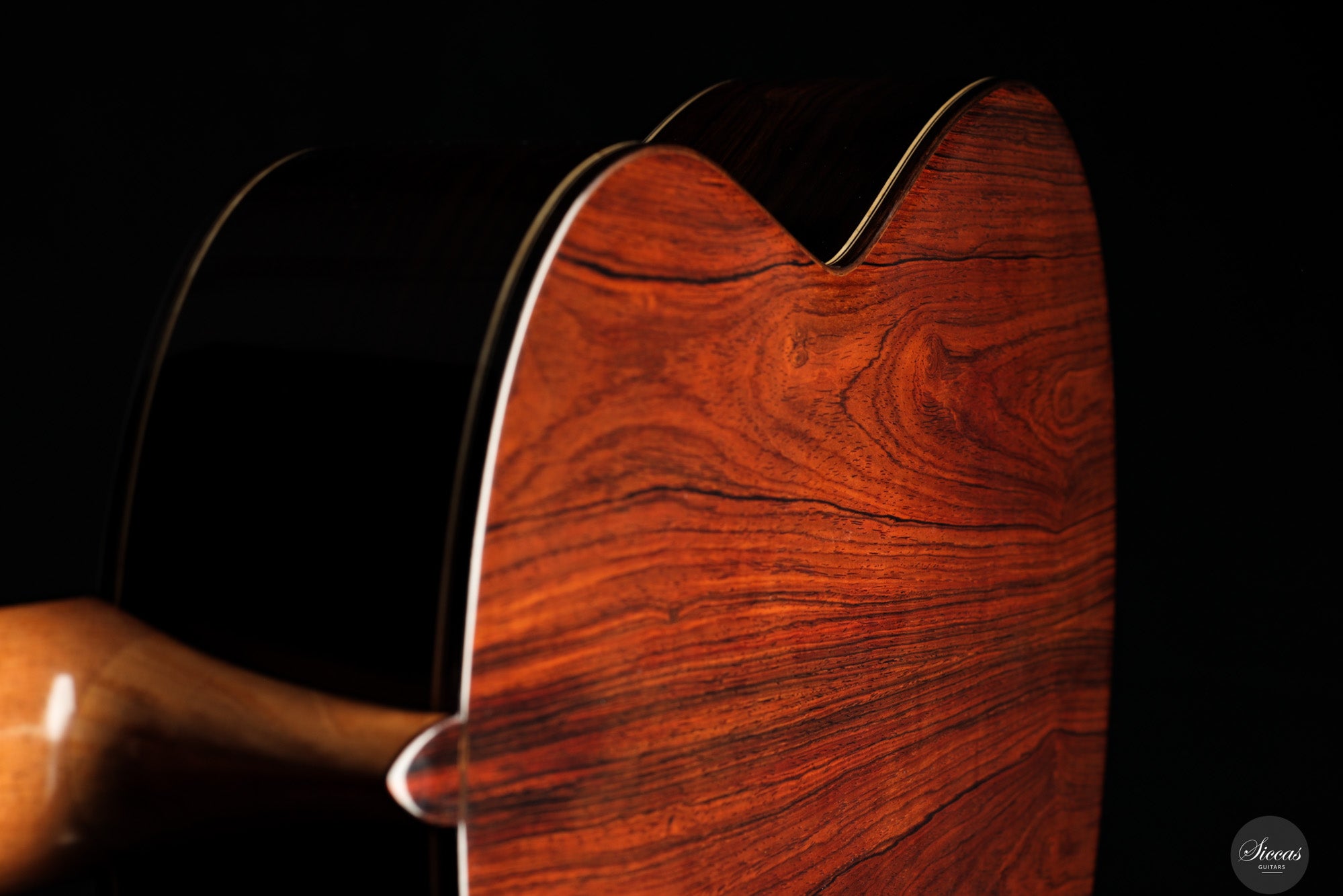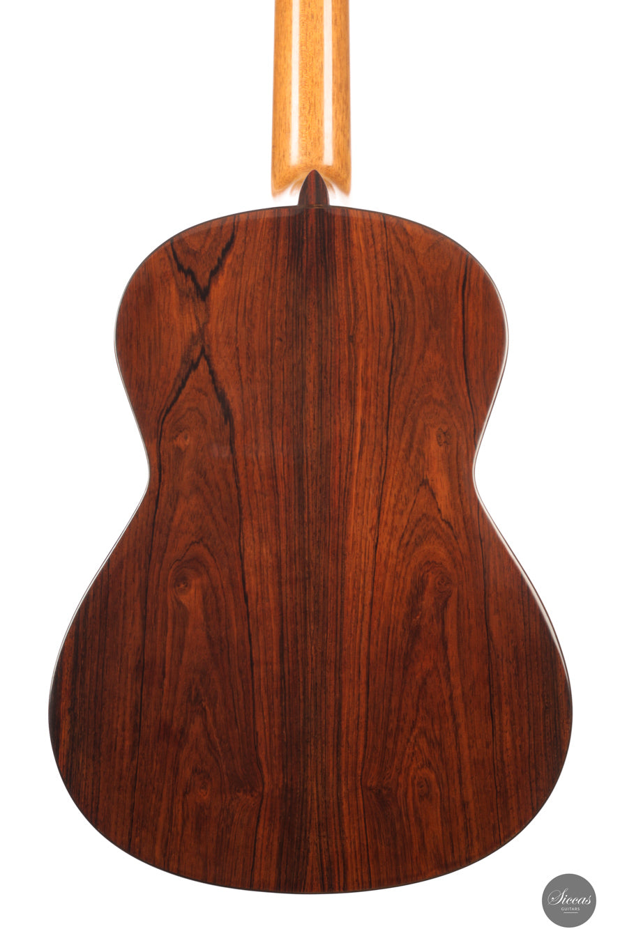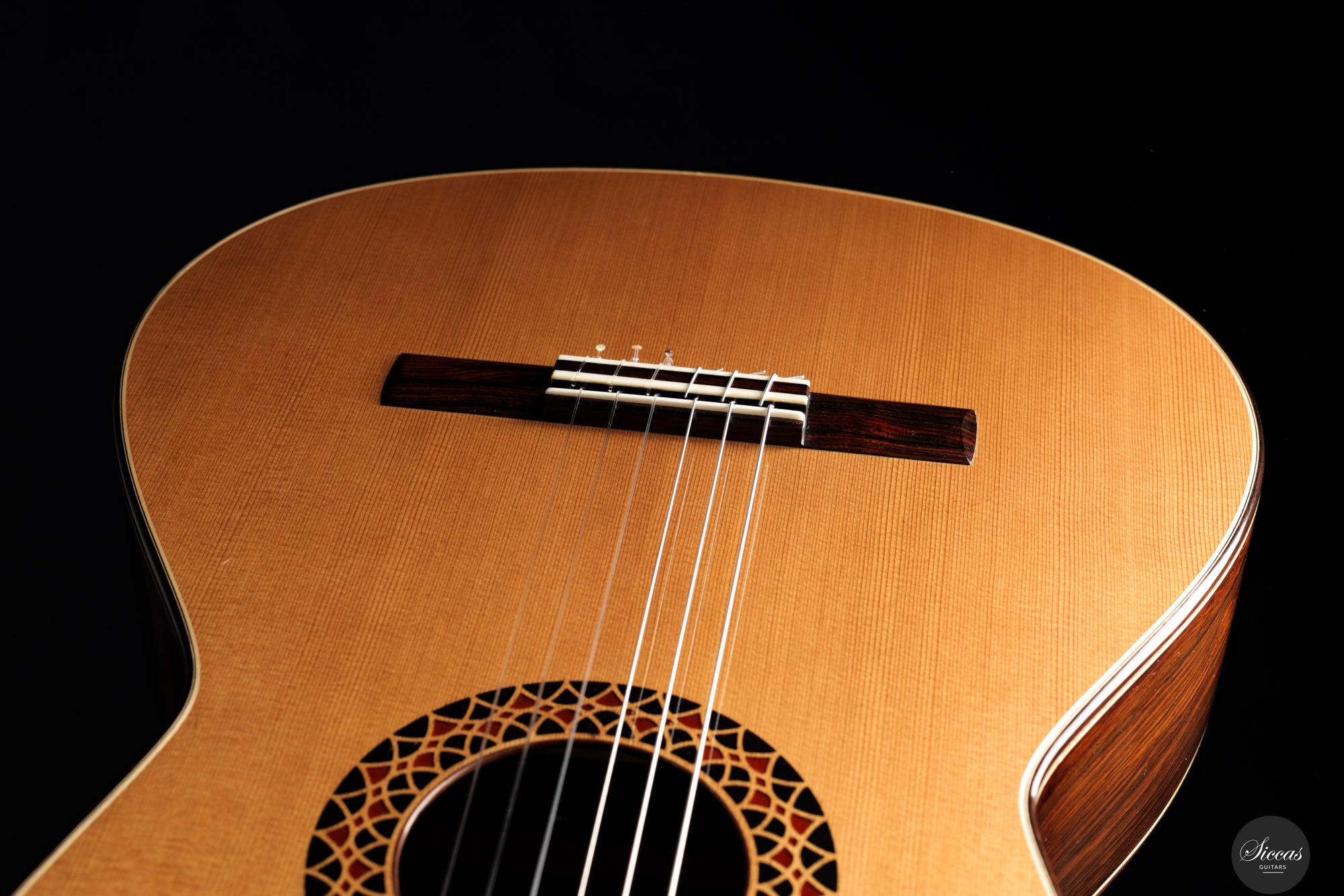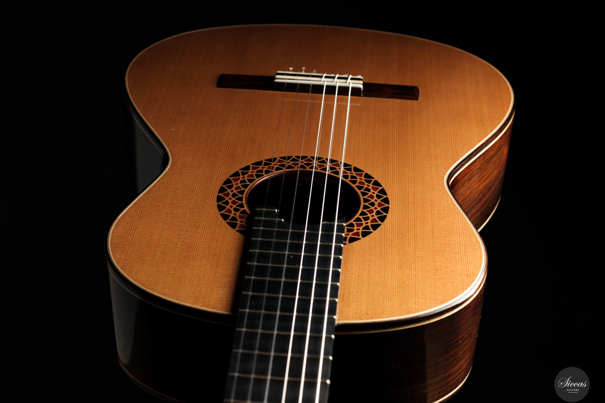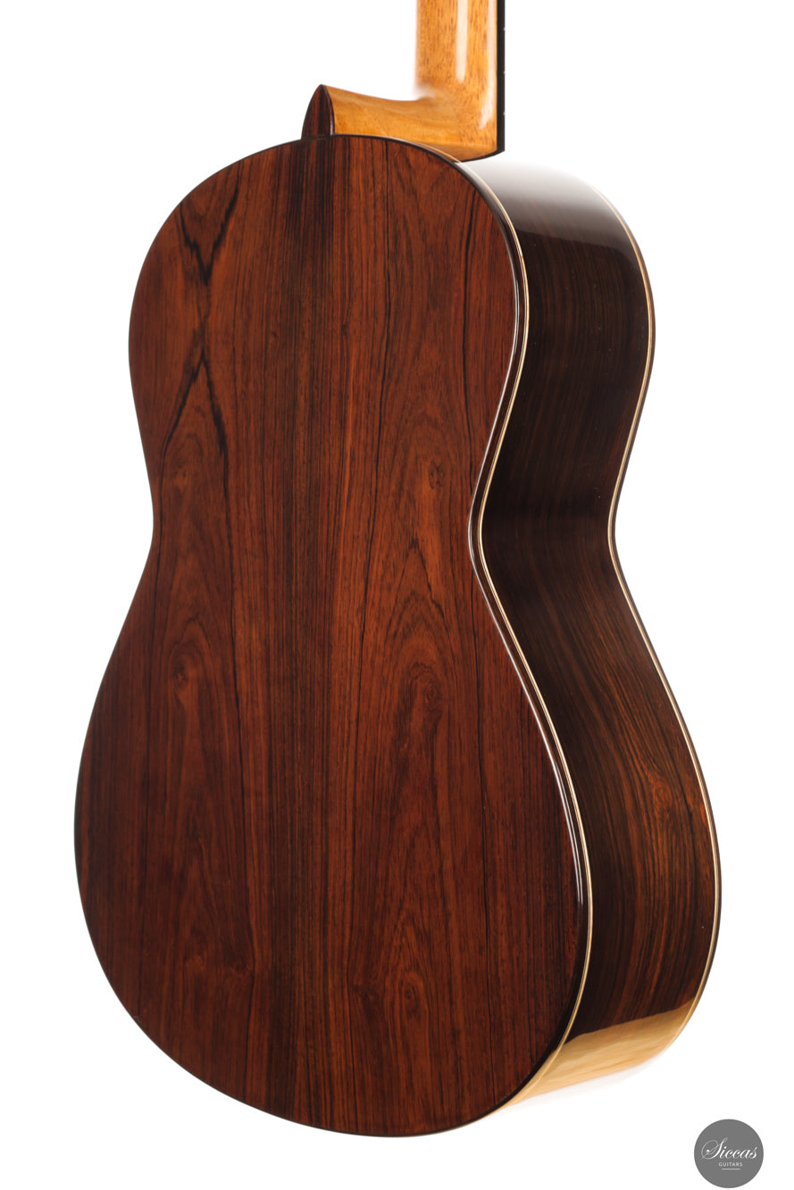 Klanglich überzeugt die Gitarre durch ein weiches, warmes Timbre mit reaktionsfreudiger Ansprache über alle Register hinweg. Die erste Saite glänzt durch ihren lebendigen, gesanglichen Charakter. Die Zederndecke sorgt für Wärme und Direktheit, während der madagassische Palisander die klangliche Tiefe und Projektion verstärkt. Trotz ihrer modernen Tragfähigkeit bleibt die Gitarre tonal der spanischen Klangtradition treu – mit klarer Stimmtrennung und farbenreicher Ausdruckskraft im Sinne der Granadiner Schule. Die Eigenresonanz liegt zwischen Fis und G und verleiht der Gitarre ein stabiles akustisches Fundament.
