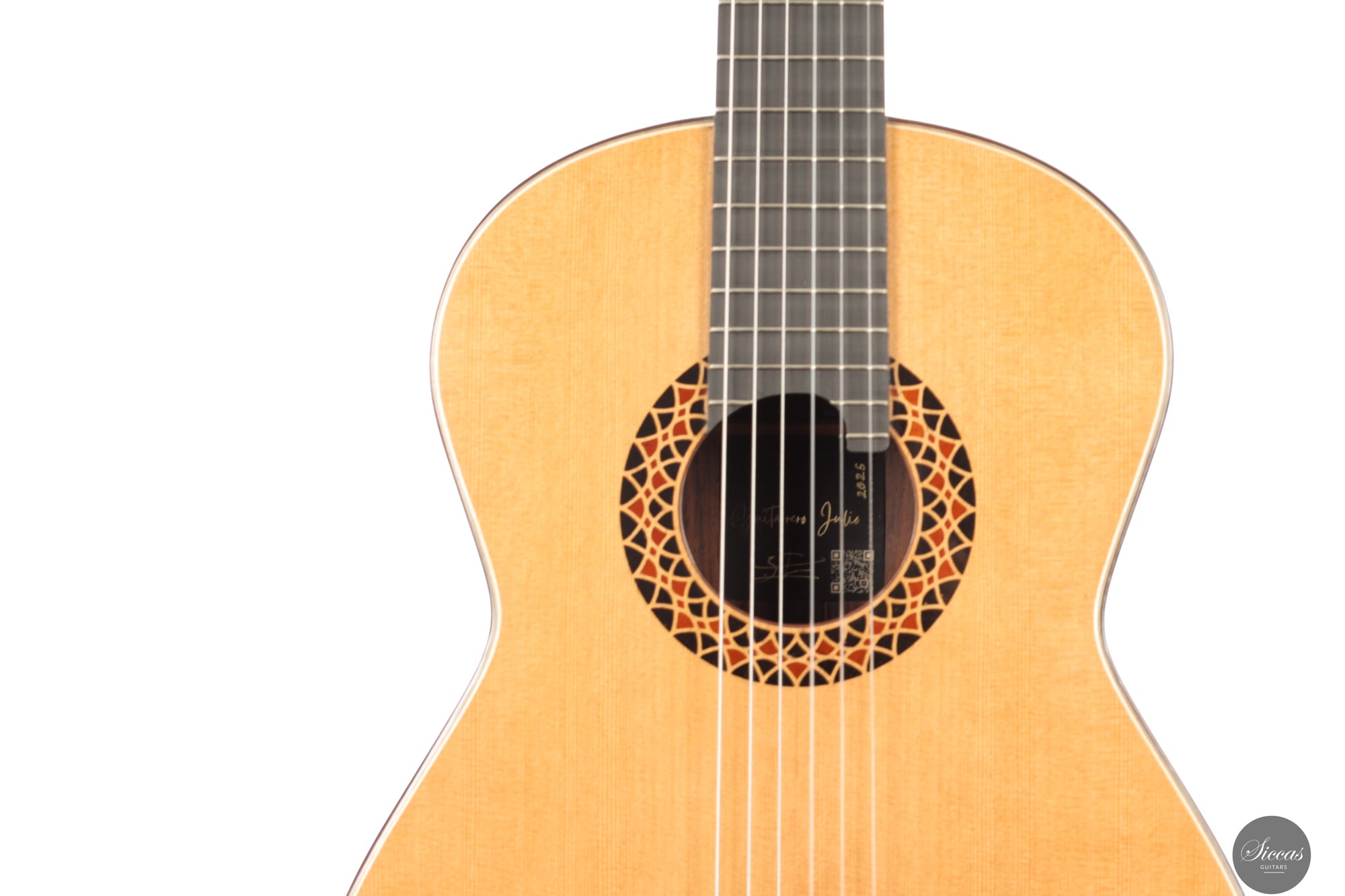 Julio Baarslag Espinosas Doubletop-Gitarre von 2025 vereint Granadiner Tradition mit moderner Projektion und Reaktionsfreude. Gesangliche Höhen, schnelle Ansprache und ein ausgewogenes Klangbild machen sie zu einem vielseitigen Konzertinstrument mit klassisch-spanischer Seele.