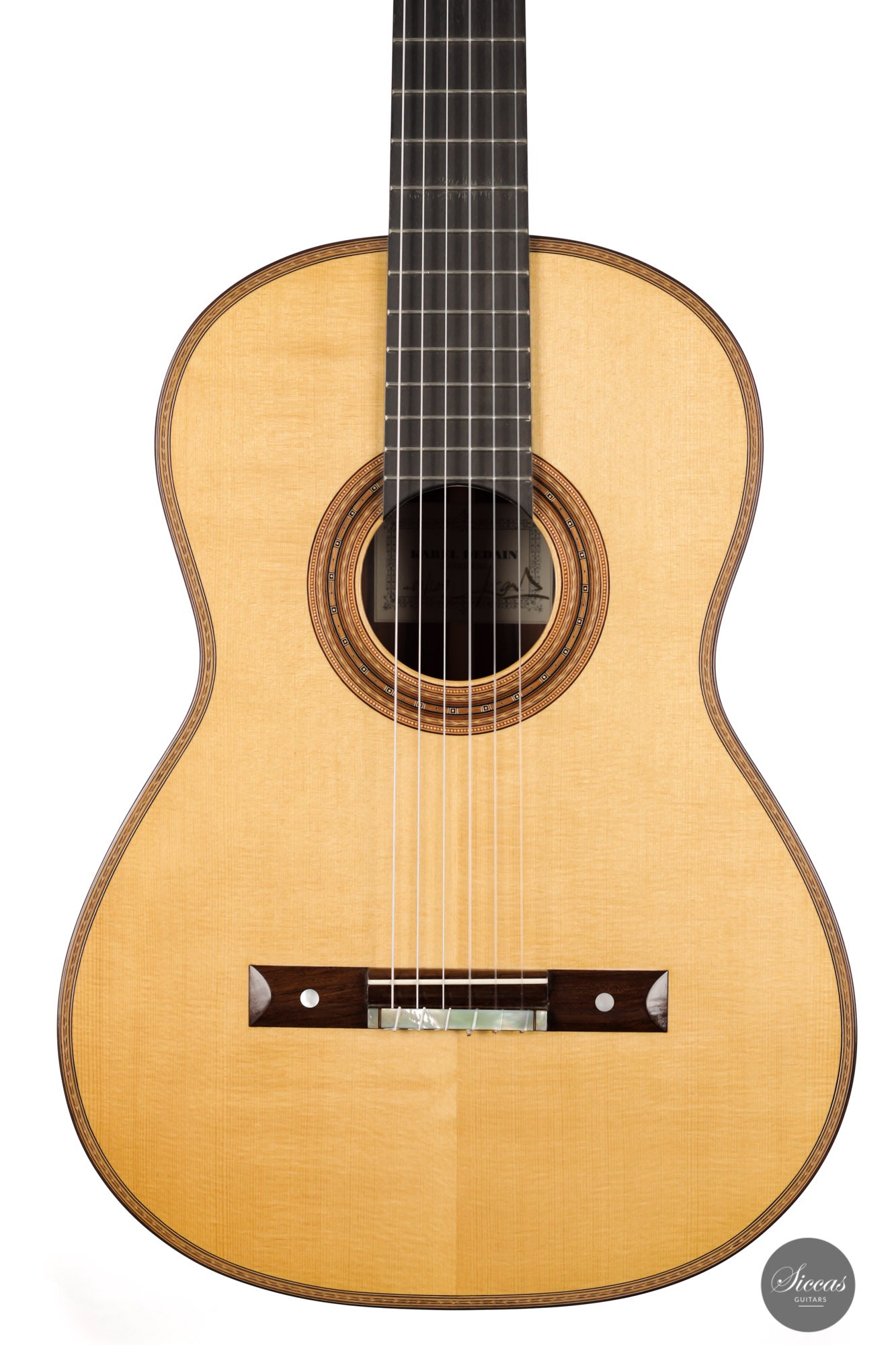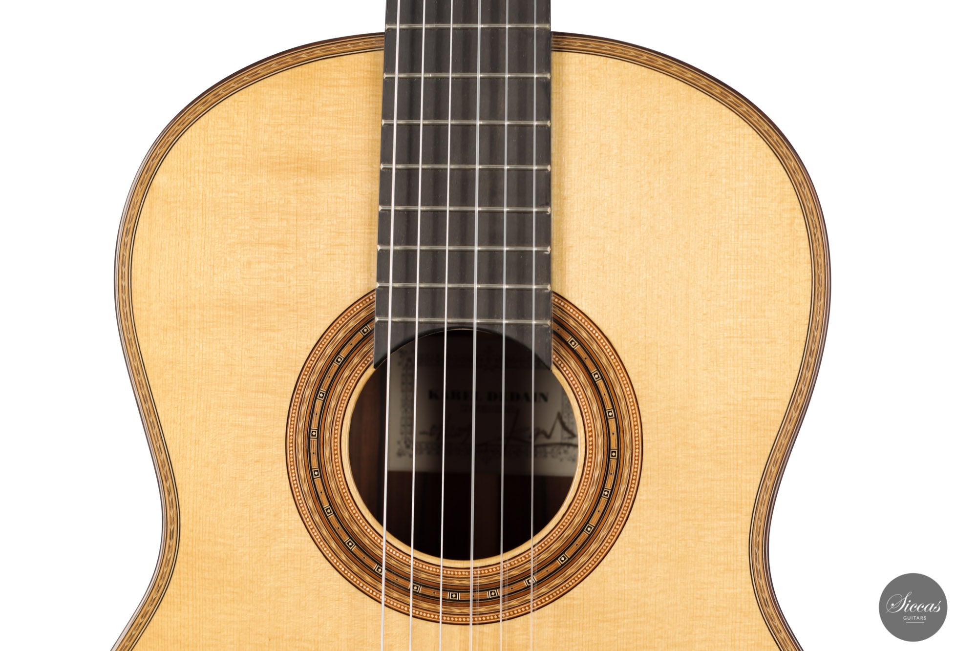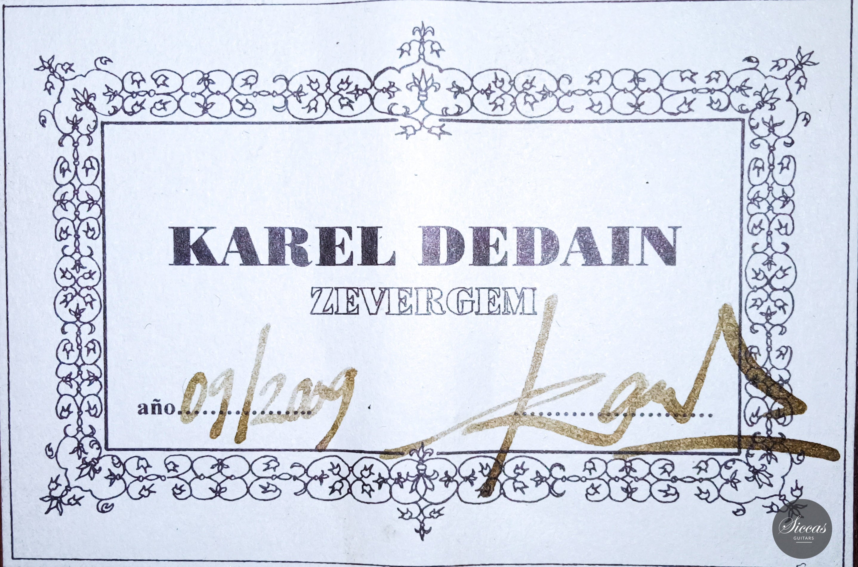 This beautiful and tastefully decorated guitar is inspired by the famous "La Suprema" made by Antonio de Torres in 1864, number 19 of his first era (FE). Built in 2009, it is in excellent condition (very few traces of playing). It is a masterpiece of craftsmanship and aesthetics. Karel Dedain gave special care to the quality of the woods, using a particularly elegant set of Madagascar rosewood for the back and sides, and a first-class quarter-sawn spruce for the top. The tonal balance and sustain are strikingly proportioned, and each note develops in an impressively elegant manner. The mature and open character has a distinctive Spanish timbre, and the overall excellent playing characteristics make this a delightful classical guitar.