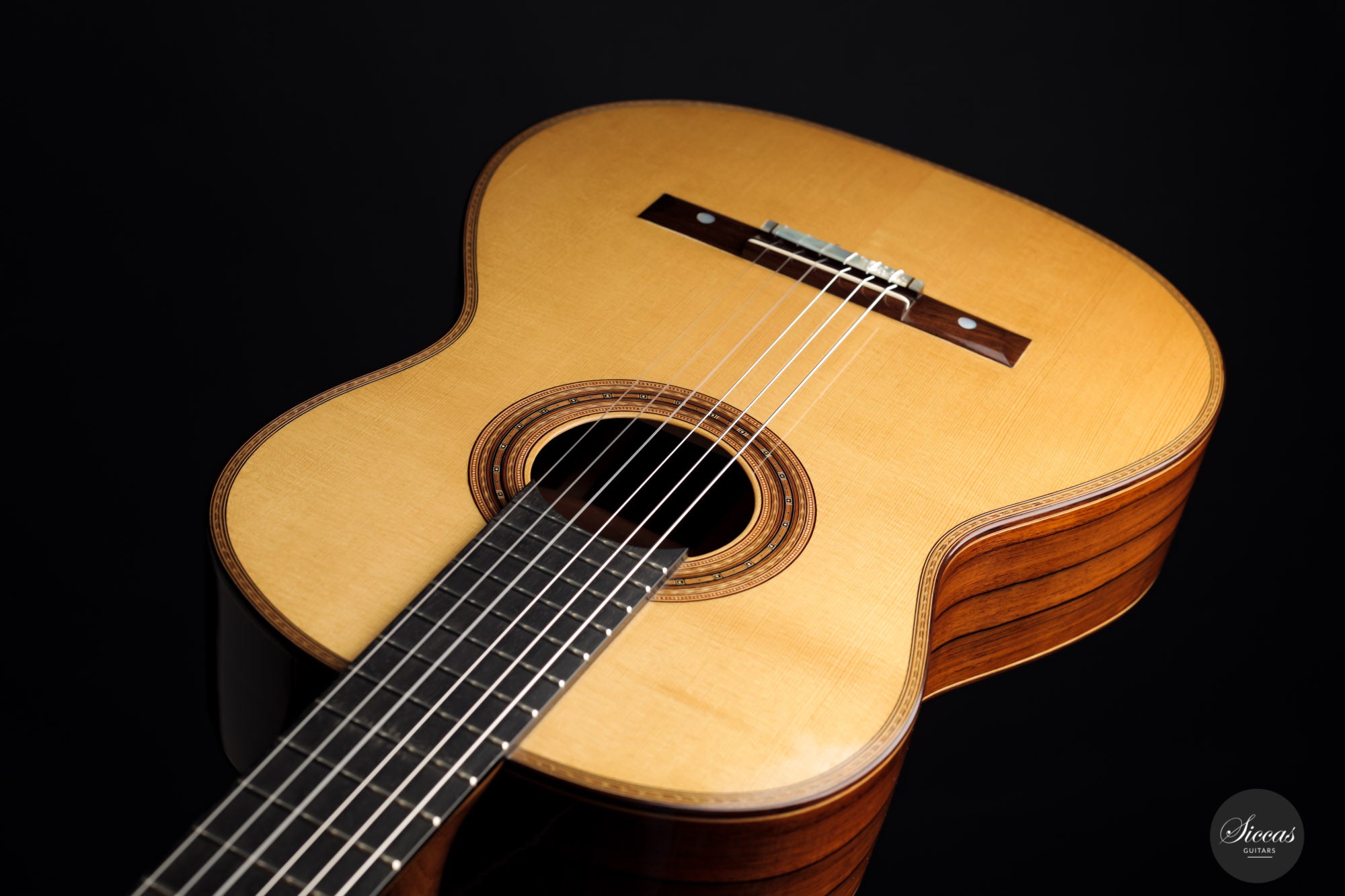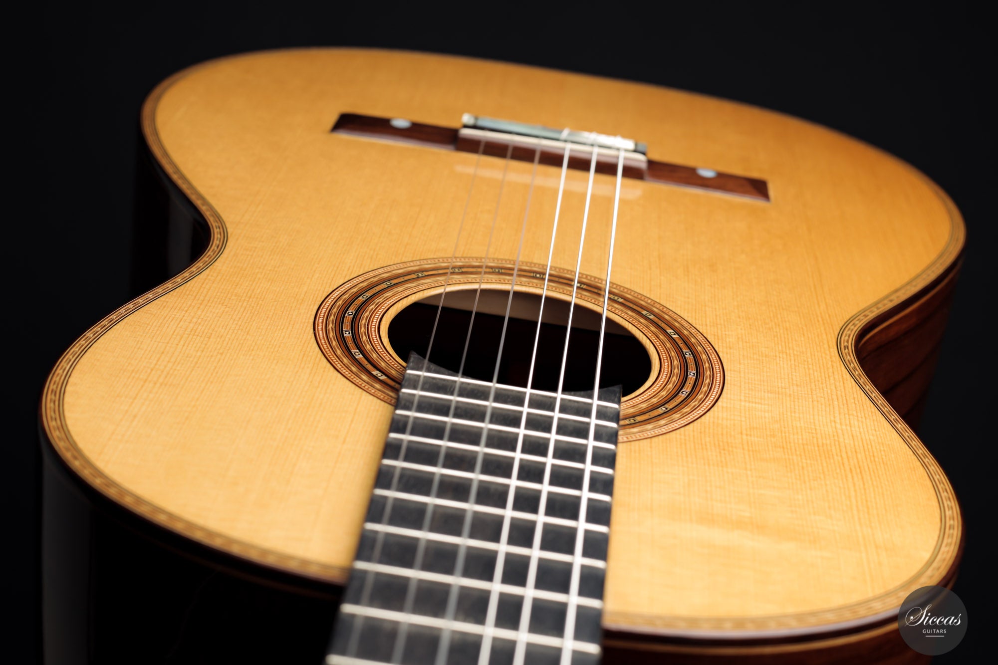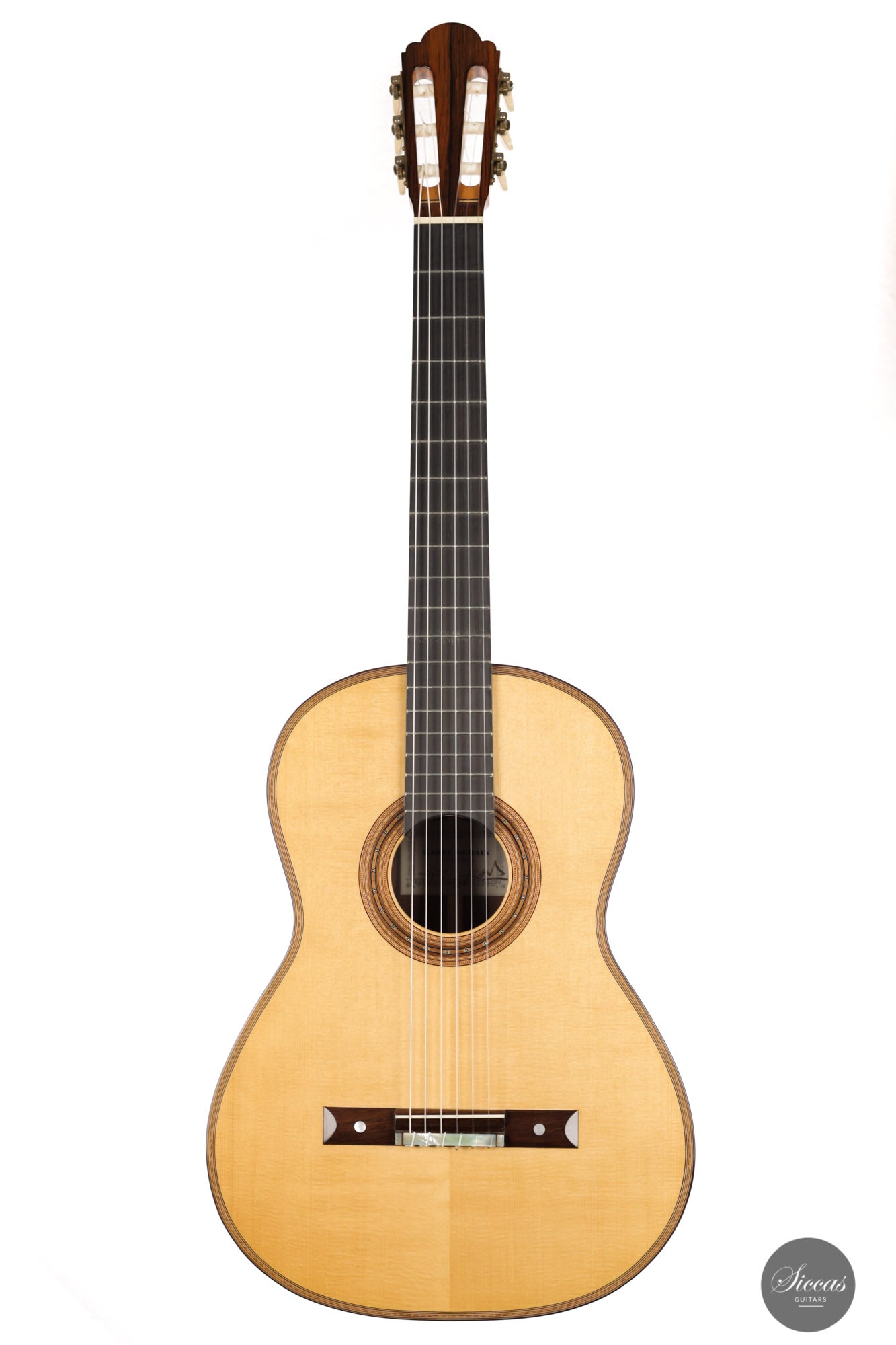 This beautiful and tastefully decorated guitar is inspired by the famous "La Suprema" made by Antonio de Torres in 1864, number 19 of his first era (FE). Built in 2009, it is in excellent condition (very few traces of playing). It is a masterpiece of craftsmanship and aesthetics. Karel Dedain gave special care to the quality of the woods, using a particularly elegant set of Madagascar rosewood for the back and sides, and a first-class quarter-sawn spruce for the top. The tonal balance and sustain are strikingly proportioned, and each note develops in an impressively elegant manner. The mature and open character has a distinctive Spanish timbre, and the overall excellent playing characteristics make this a delightful classical guitar.