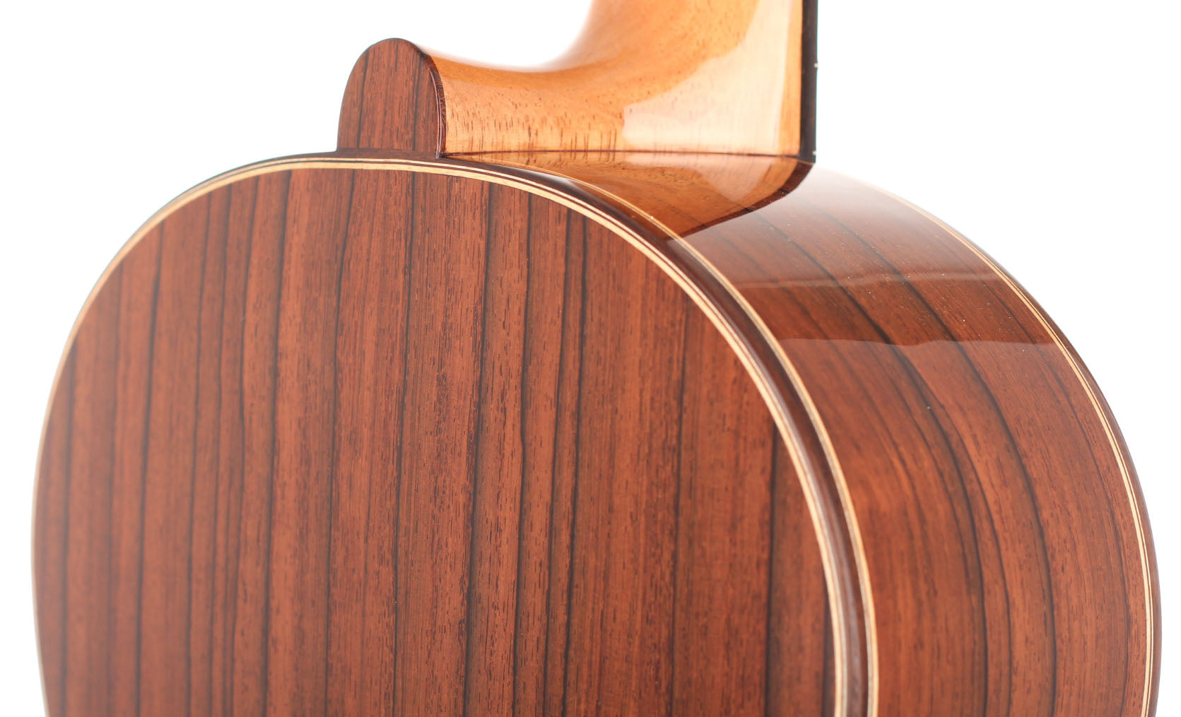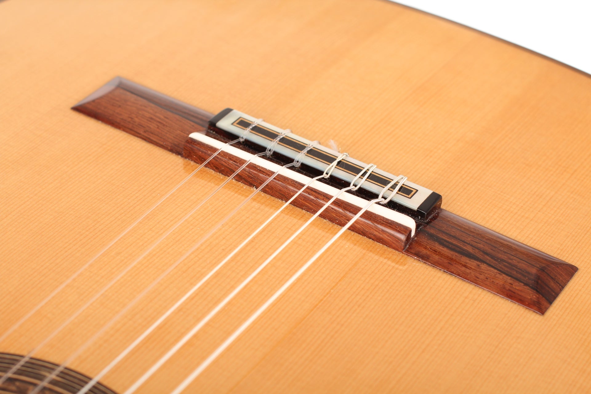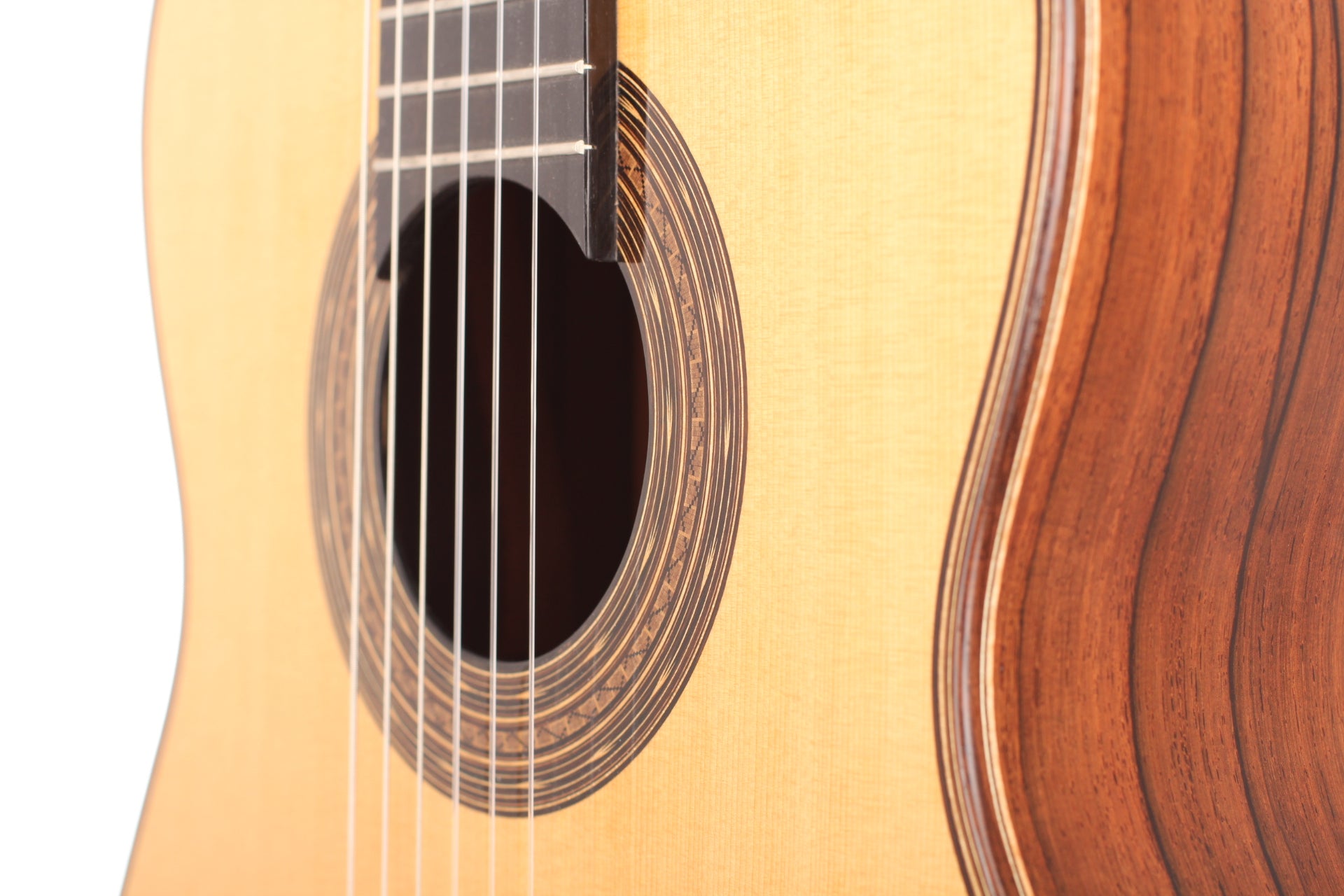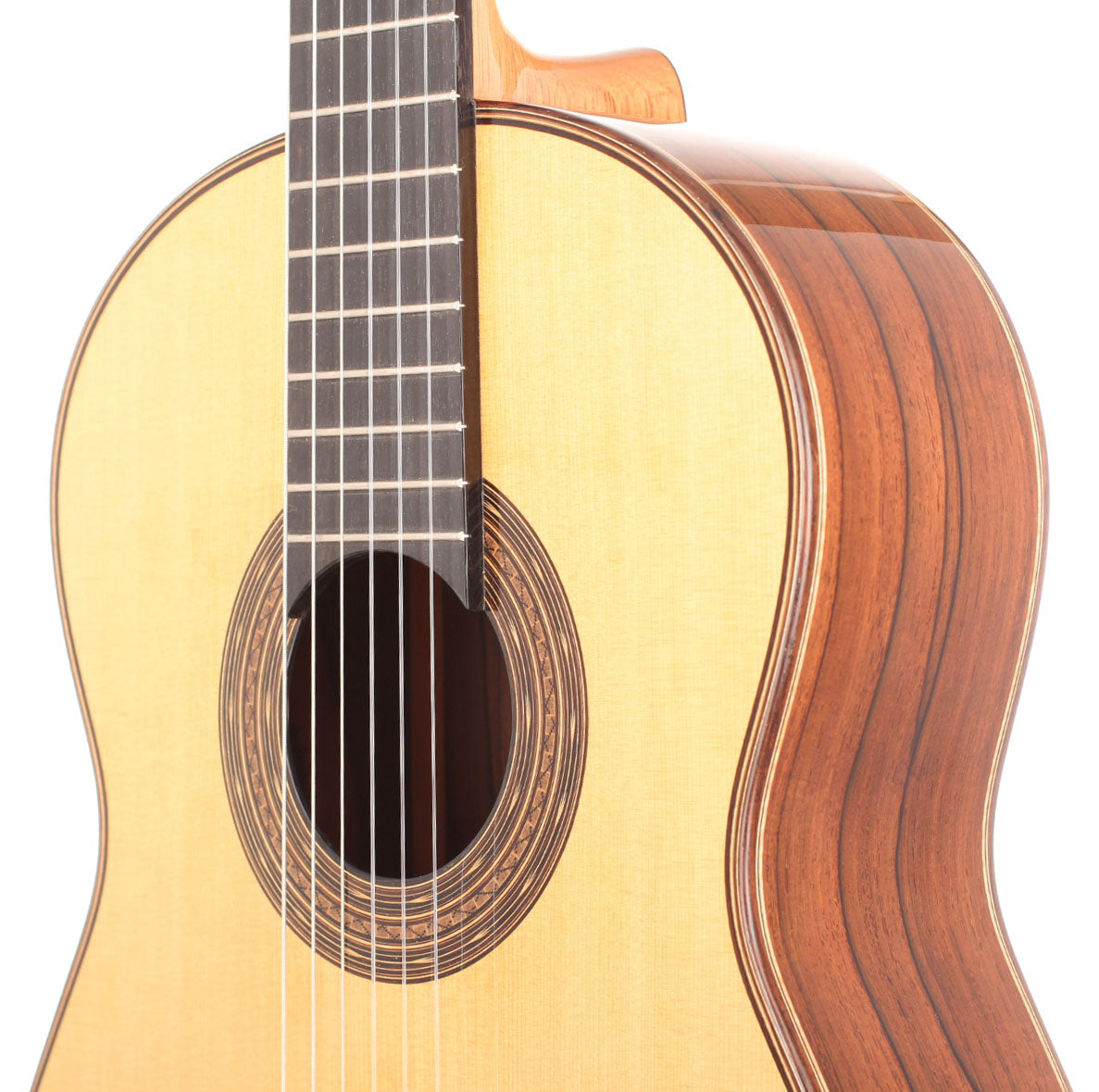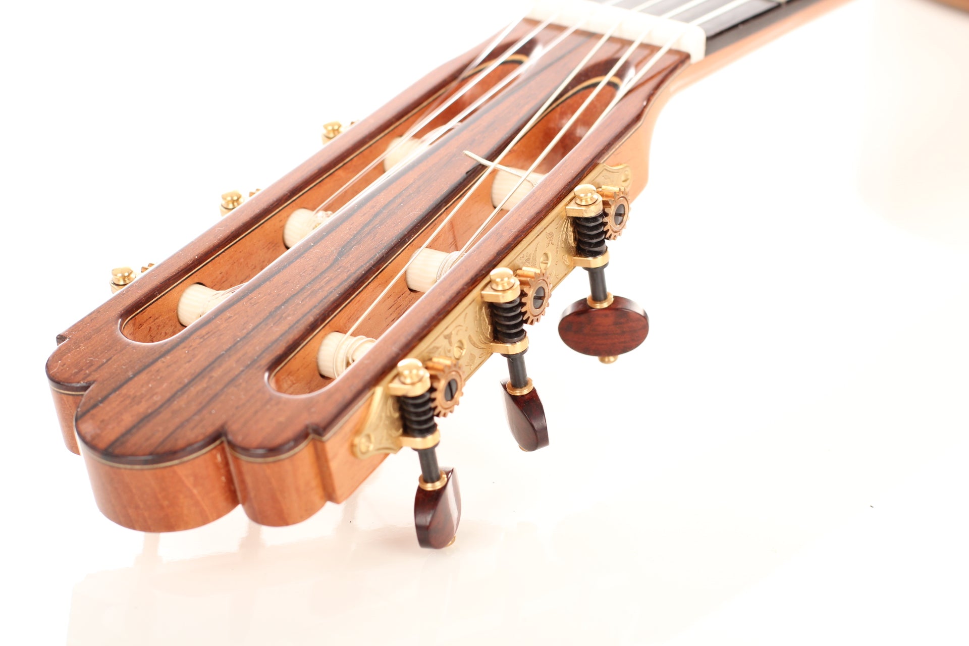 His philosophy in guitar construction is not to invent something 'new', but seek out what good examples that are from historical luthiers as Torres, Garcia, Arias, Hernandez and to start there. Trying to understand what these great makers did is a big challenge and a very good starting point for searching the own style and sound. This guitar is a beautiful Enrique Garcia copy with spruce top and Ziricote back and sides. The sound is very charming and lyrical old world sound. A true masterpiece! All French polished. The high quality tuners are made by Klaus Scheller. A Hiscox Pro II case is included.