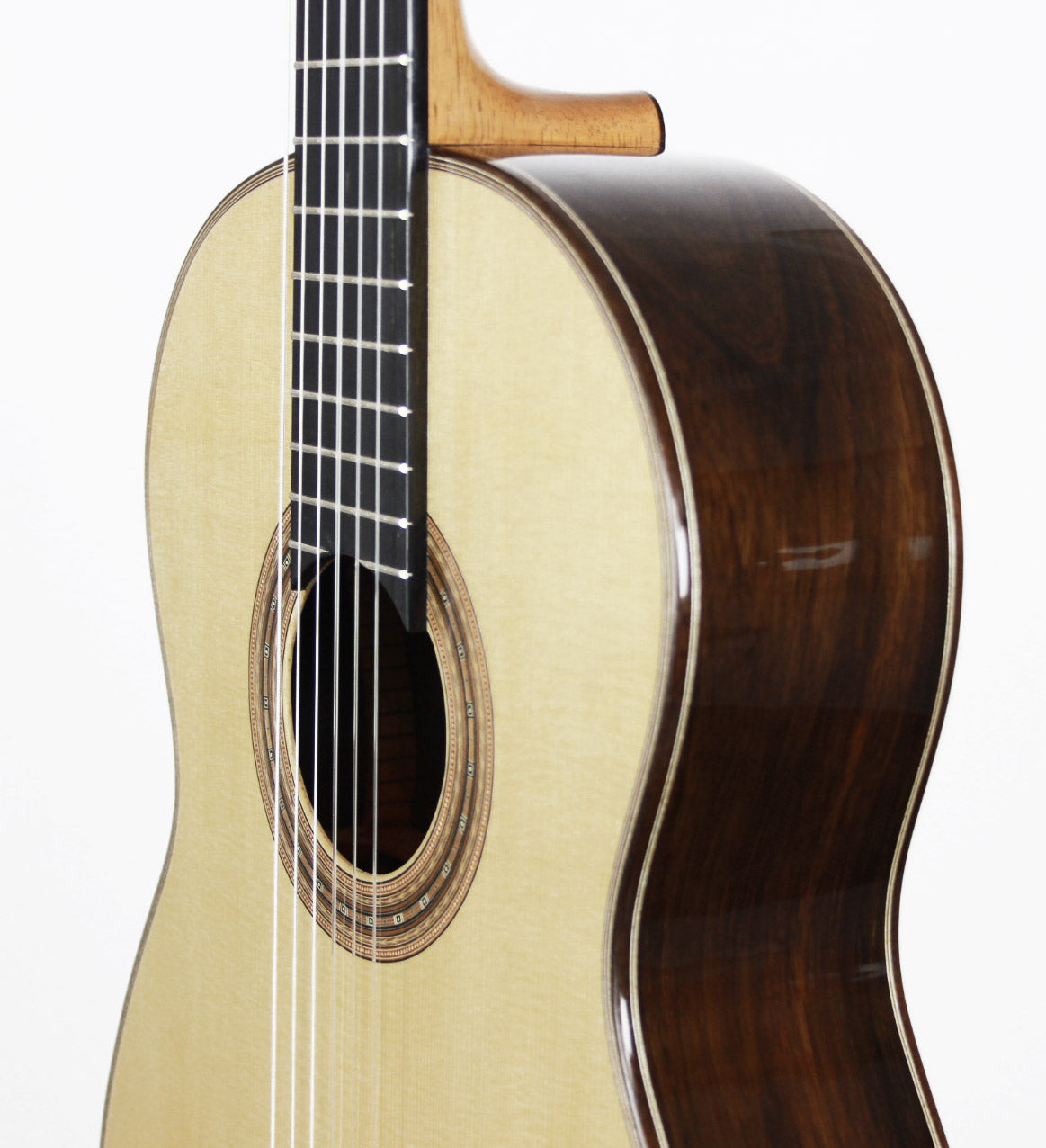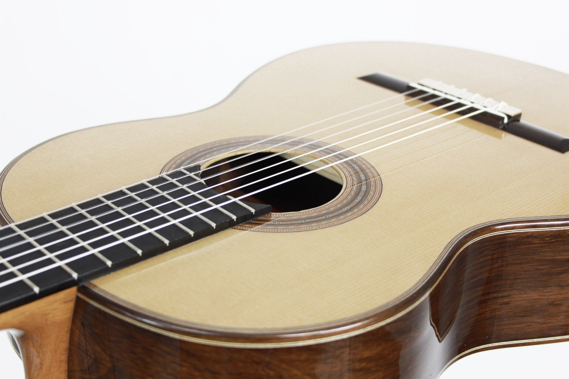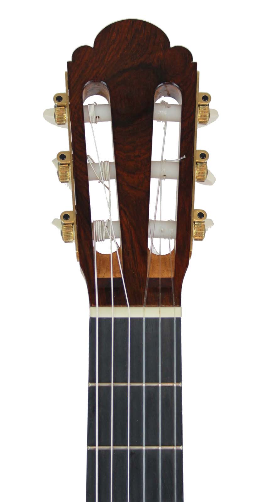 His philosophy in guitar construction is not to invent something 'new', but seek out what good examples there are from historical luthiers as Torres, Garcia, Arias, Hernandez and to start there. Trying to understand what these great makers did is a big challenge and a very good starting point for searching the own style and sound. This guitar is a Antonio de Torres copy and has seven fan bars. The tuning machines are made by Rubner.