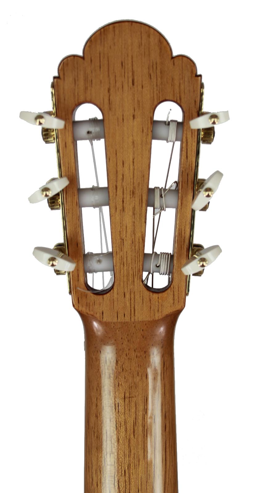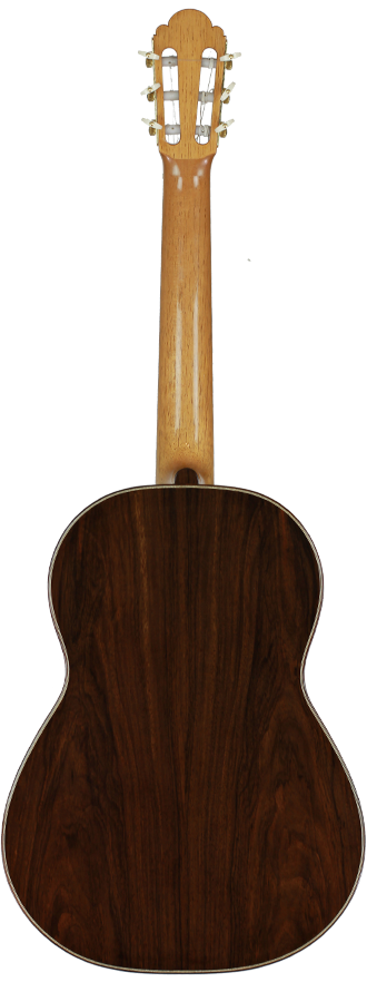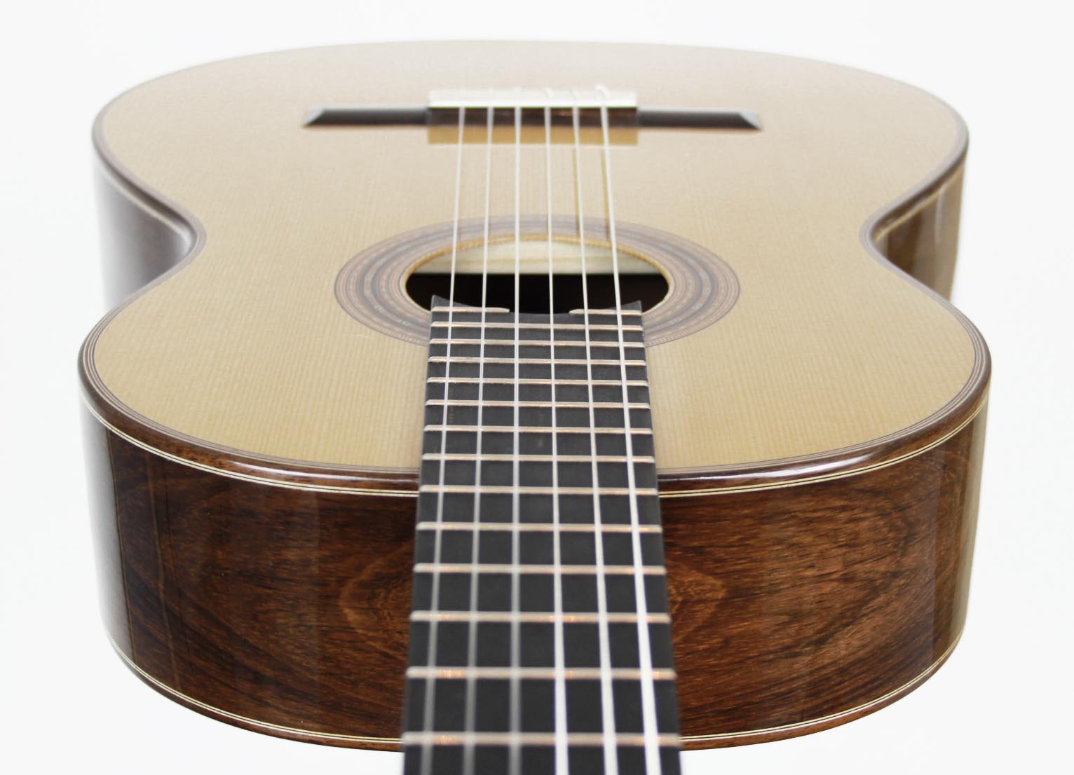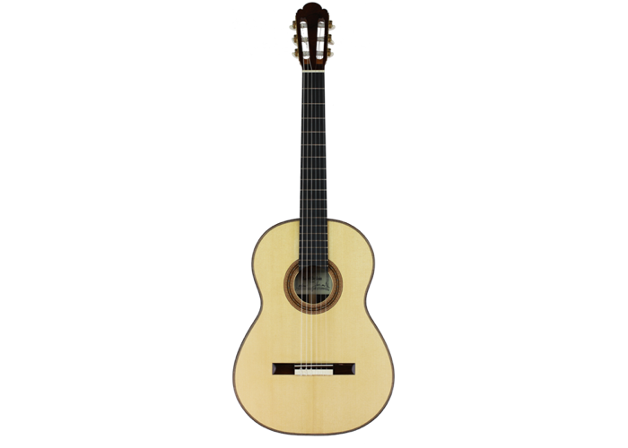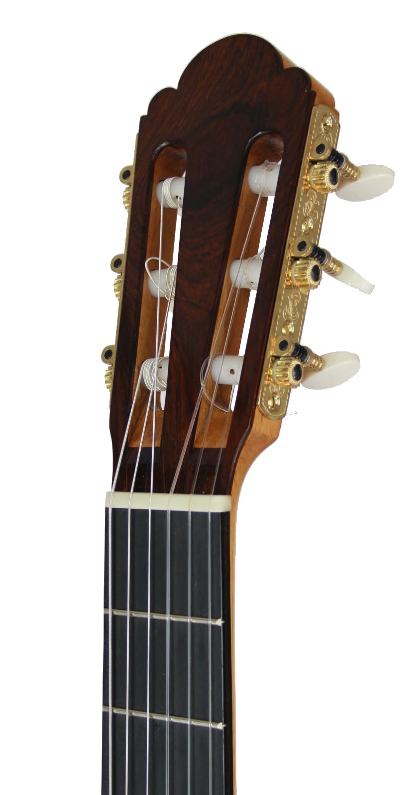 His philosophy in guitar construction is not to invent something 'new', but seek out what good examples there are from historical luthiers as Torres, Garcia, Arias, Hernandez and to start there. Trying to understand what these great makers did is a big challenge and a very good starting point for searching the own style and sound. This guitar is a Antonio de Torres copy and has seven fan bars. The tuning machines are made by Rubner.