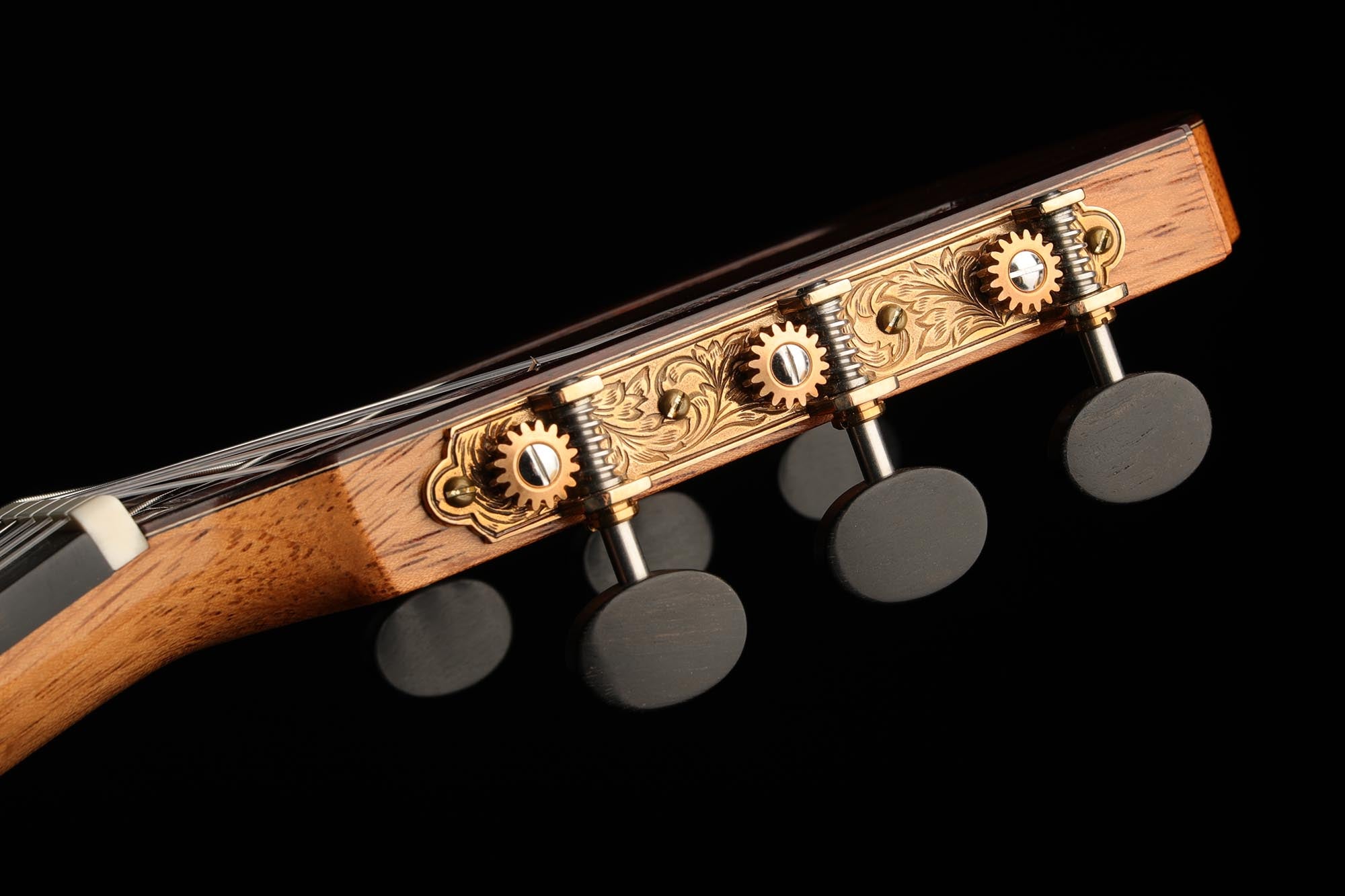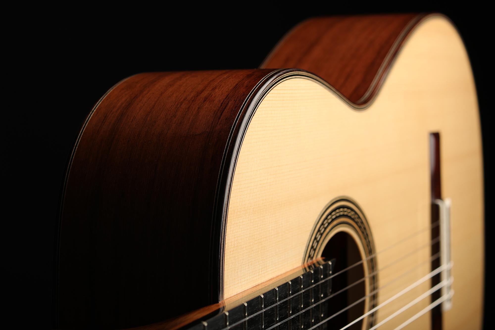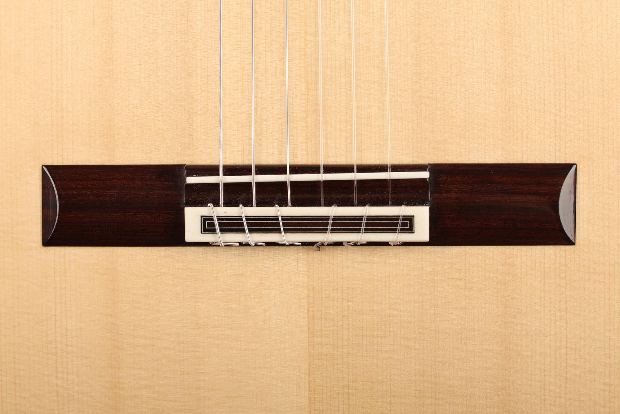This guitar, built in 2020 especially for Siccas Guitars, has a lot of unique and exciting features. Together with Karel we aimed to create an instrument that combines excellent playability with a rich, powerful and traditional sound. As a result, this guitar has a 64 cm scale length, which provides a comfortable playing feel for the left hand, and a slightly raised fingerboard, which makes playing in the high registers more comfortable.The top is made of the highest quality Italian spruce and has a 7-fan bracing with a very thin transverse bar, a so-called "Barre d'âme", a construction element adopted from the famous luthier Robert Bouchet. For the back and sides, Karel has also used an excellent rosewood from Madagascar. The latter has a fine and distinct grain, which gives this guitar a unique look and personality. As always, Karel's work is flawless.