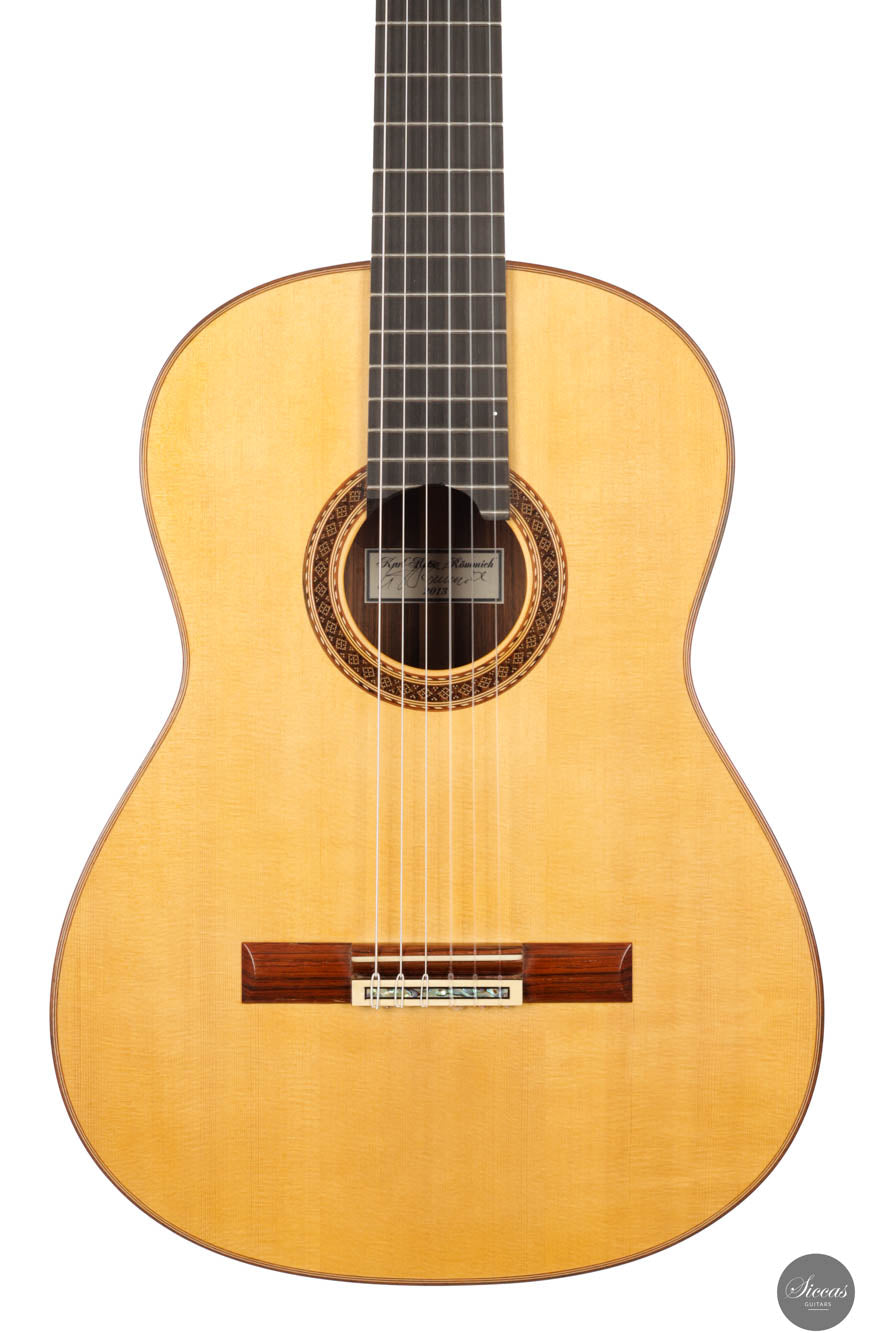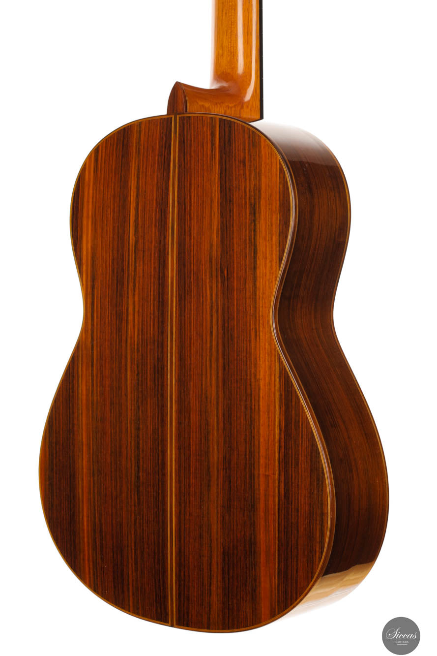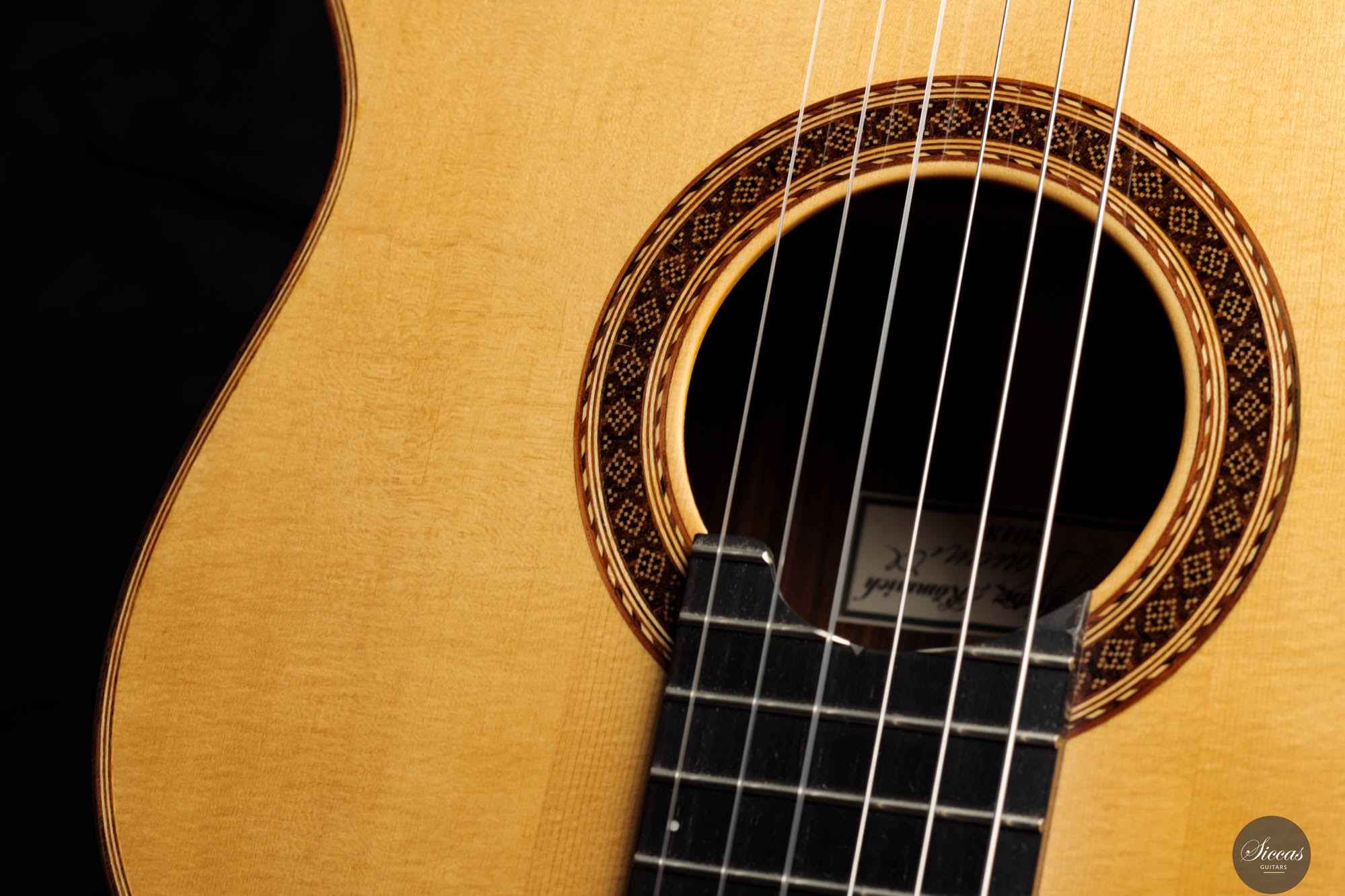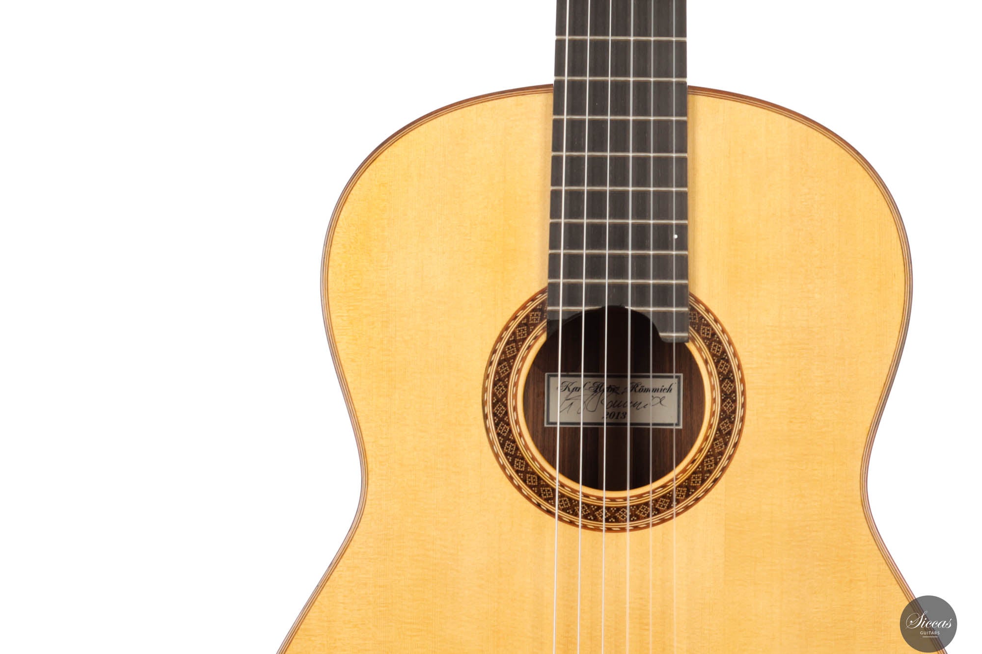 Gefertigt von Karl-Heinz Römmich, einem der besten Gitarrenbauer Deutschlands, zeichnet sich diese Gitarre als ein schönes Instrument aus, das sowohl ästhetisch als auch klanglich hervorragend ist. Sie erreicht eine bemerkenswerte Balance und Vielseitigkeit in ihrem Klang, mit lyrischen Höhen, die außergewöhnliche Ausdrucksmöglichkeiten bieten. Diese Höhen ermöglichen es Musikern, die subtilen Nuancen jeder Komposition einzufangen, wunderbar ergänzt durch starke, solide Bässe, die eine robuste Grundlage für den Gesamtklang der Gitarre legen. Dieses dynamische Zusammenspiel zwischen den Höhen und Bässen ermöglicht eine reiche tonale Erkundung und macht die Gitarre geeignet für eine breite Vielfalt musikalischer Ausdrucksformen und Stile. Ihre starke Projektion ist in der Lage, jeden Konzertsaal zu füllen, was sie zu einer idealen Wahl für professionelle Auftritte macht. Obwohl es sich um ein gebrauchtes Instrument handelt, befindet es sich noch immer in einem großartigen Zustand und zeigt nur geringfügige Gebrauchsspuren.