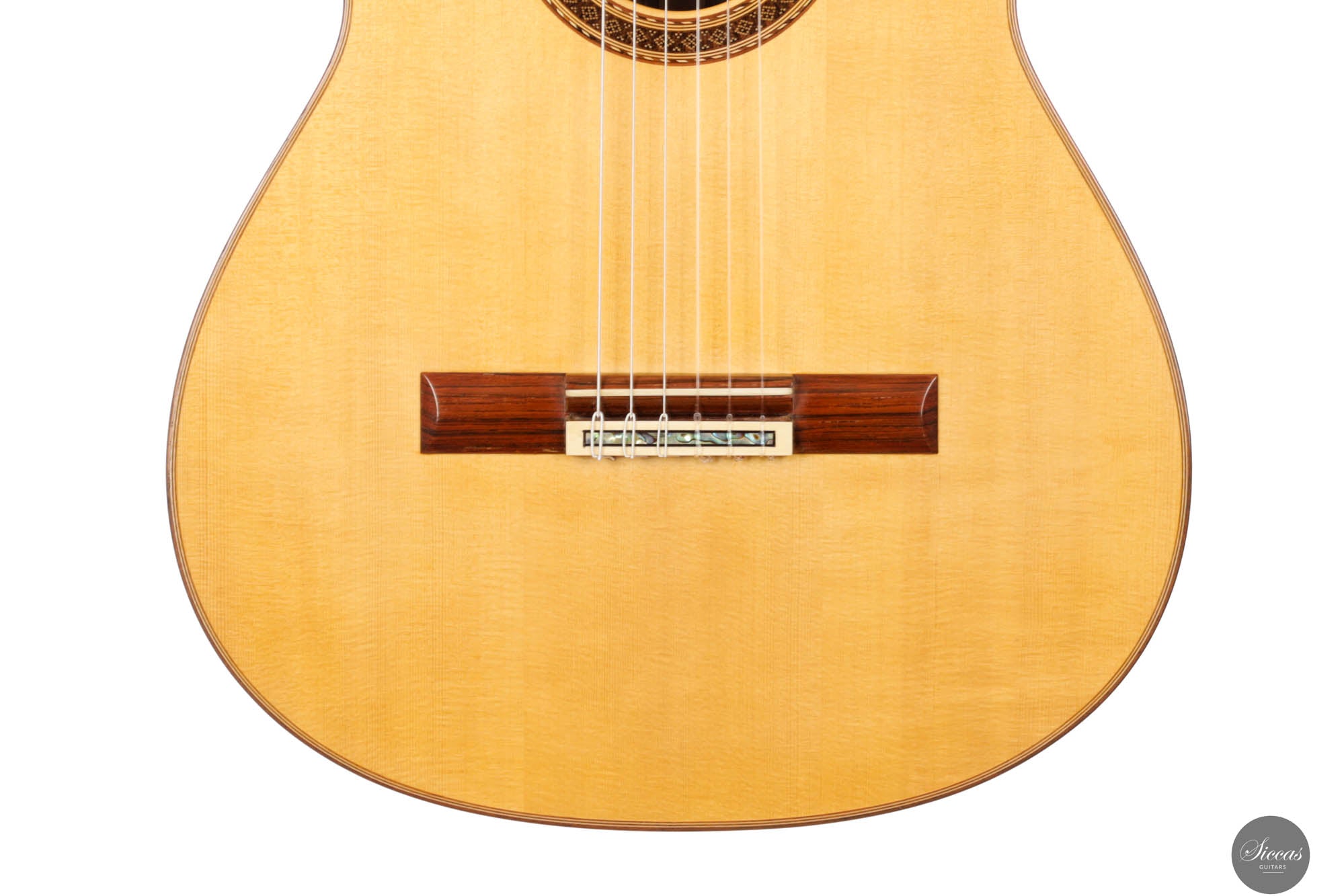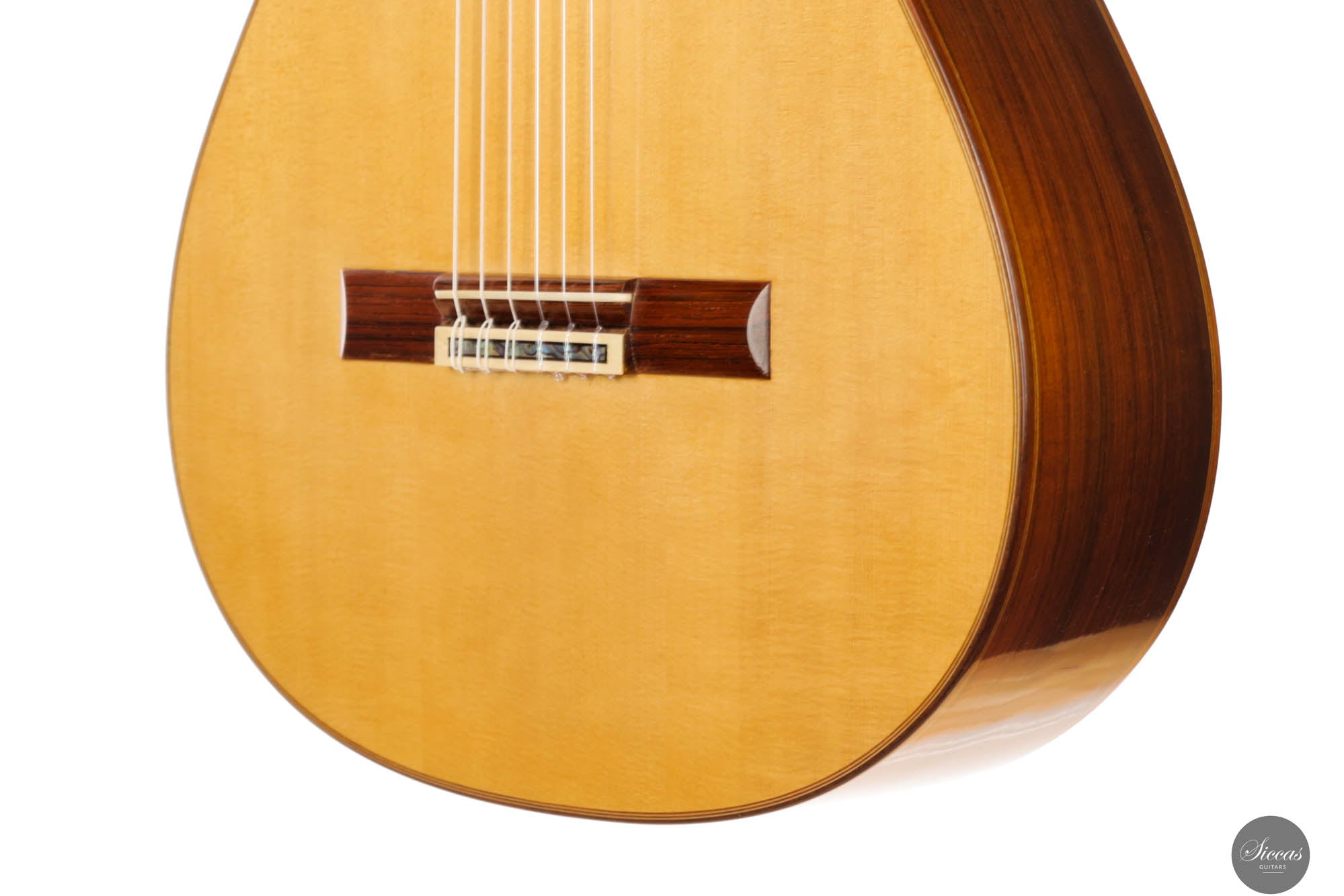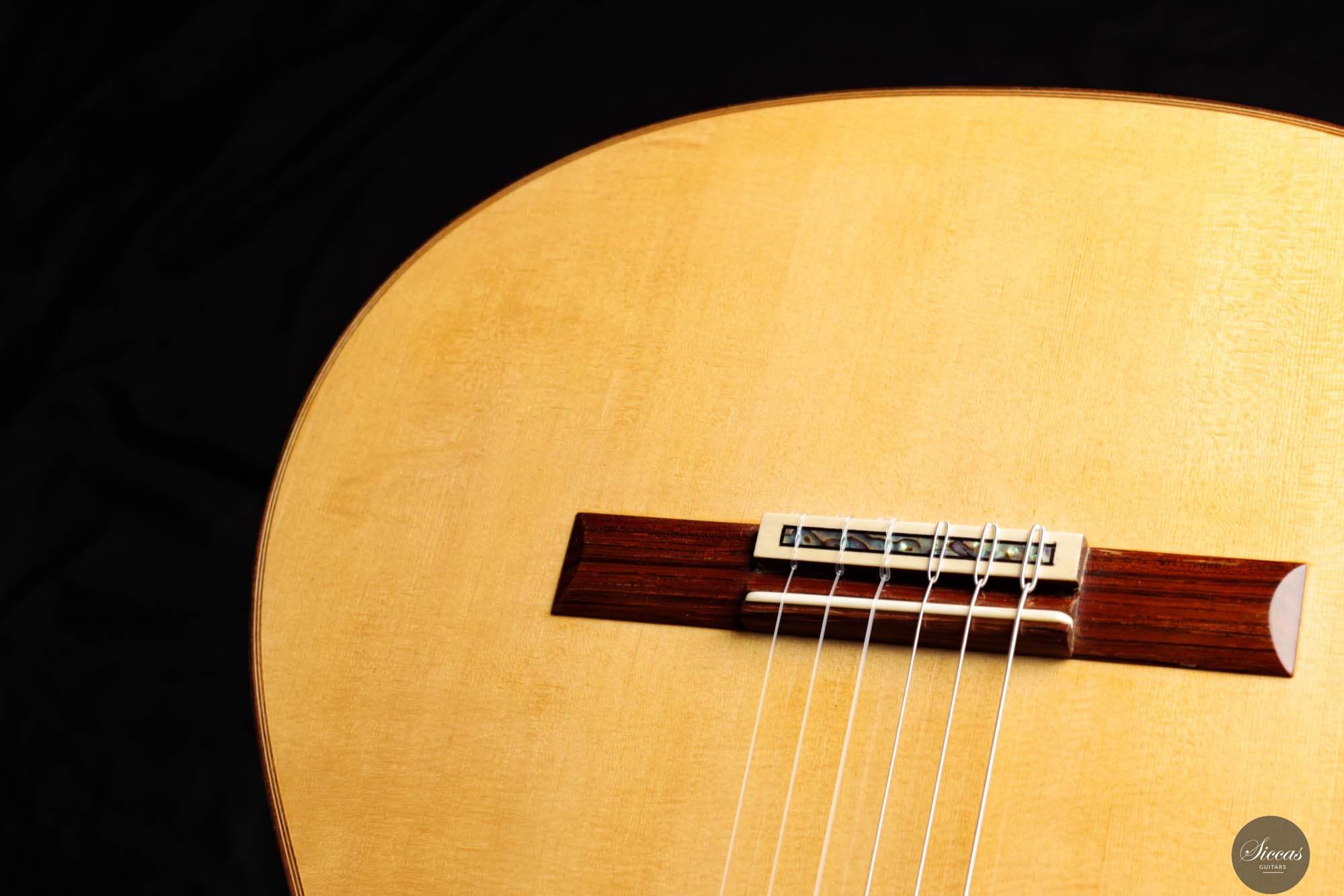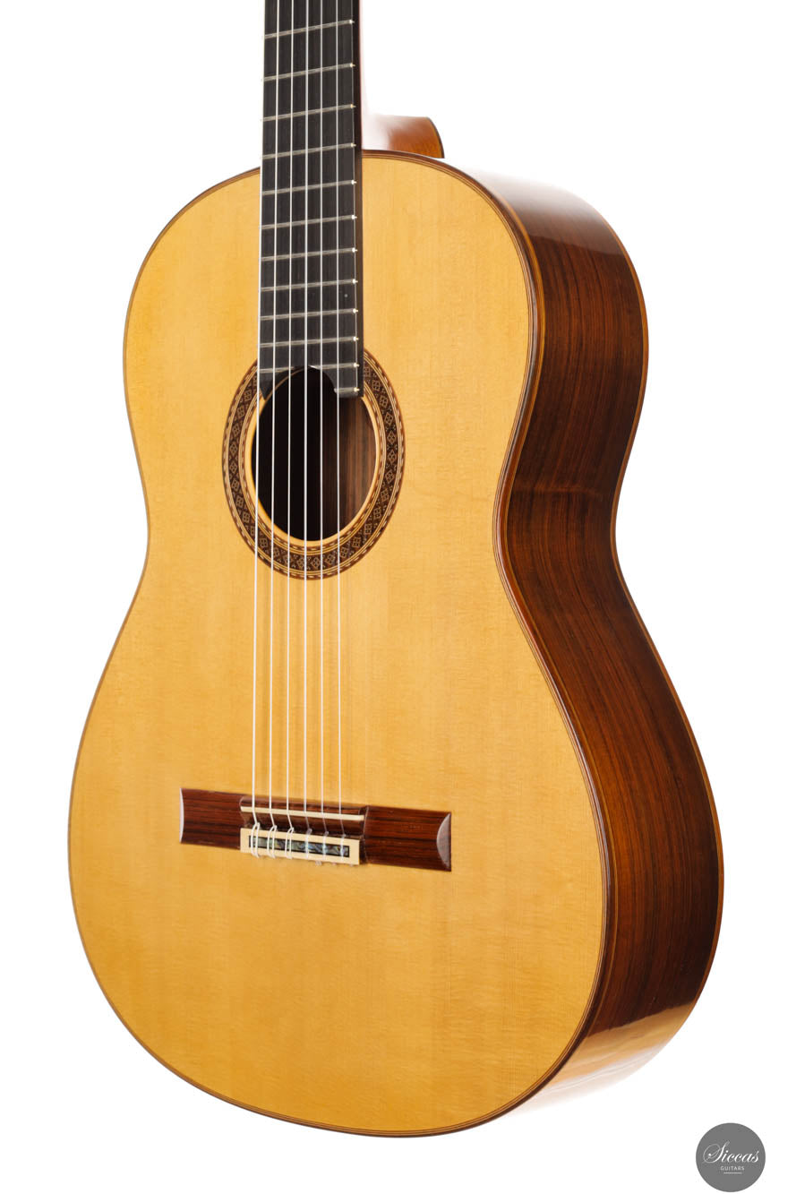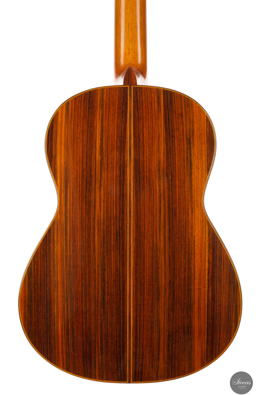Gefertigt von Karl-Heinz Römmich, einem der besten Gitarrenbauer Deutschlands, zeichnet sich diese Gitarre als ein schönes Instrument aus, das sowohl ästhetisch als auch klanglich hervorragend ist. Sie erreicht eine bemerkenswerte Balance und Vielseitigkeit in ihrem Klang, mit lyrischen Höhen, die außergewöhnliche Ausdrucksmöglichkeiten bieten. Diese Höhen ermöglichen es Musikern, die subtilen Nuancen jeder Komposition einzufangen, wunderbar ergänzt durch starke, solide Bässe, die eine robuste Grundlage für den Gesamtklang der Gitarre legen. Dieses dynamische Zusammenspiel zwischen den Höhen und Bässen ermöglicht eine reiche tonale Erkundung und macht die Gitarre geeignet für eine breite Vielfalt musikalischer Ausdrucksformen und Stile. Ihre starke Projektion ist in der Lage, jeden Konzertsaal zu füllen, was sie zu einer idealen Wahl für professionelle Auftritte macht. Obwohl es sich um ein gebrauchtes Instrument handelt, befindet es sich noch immer in einem großartigen Zustand und zeigt nur geringfügige Gebrauchsspuren.