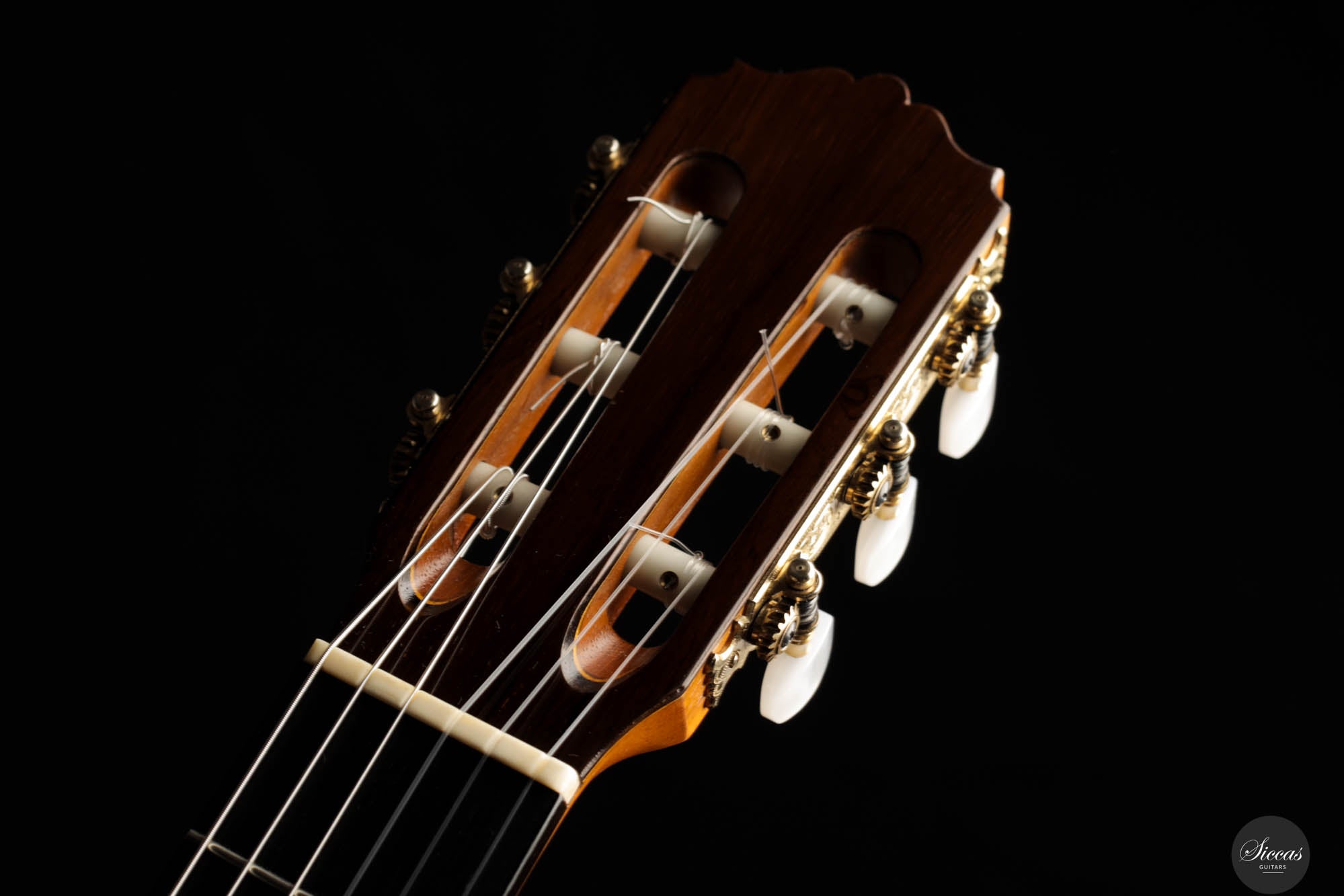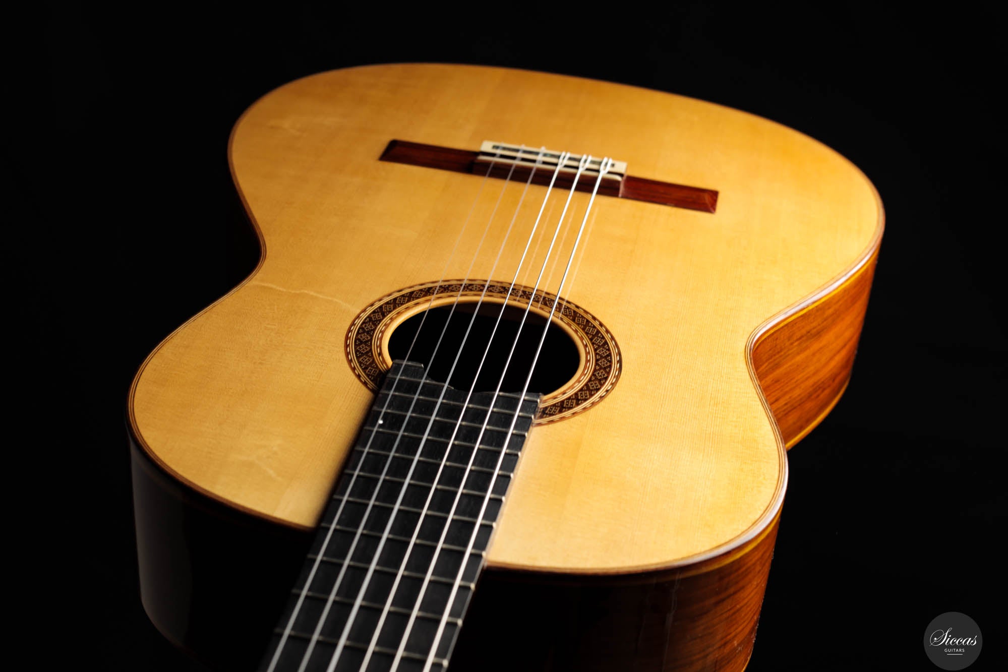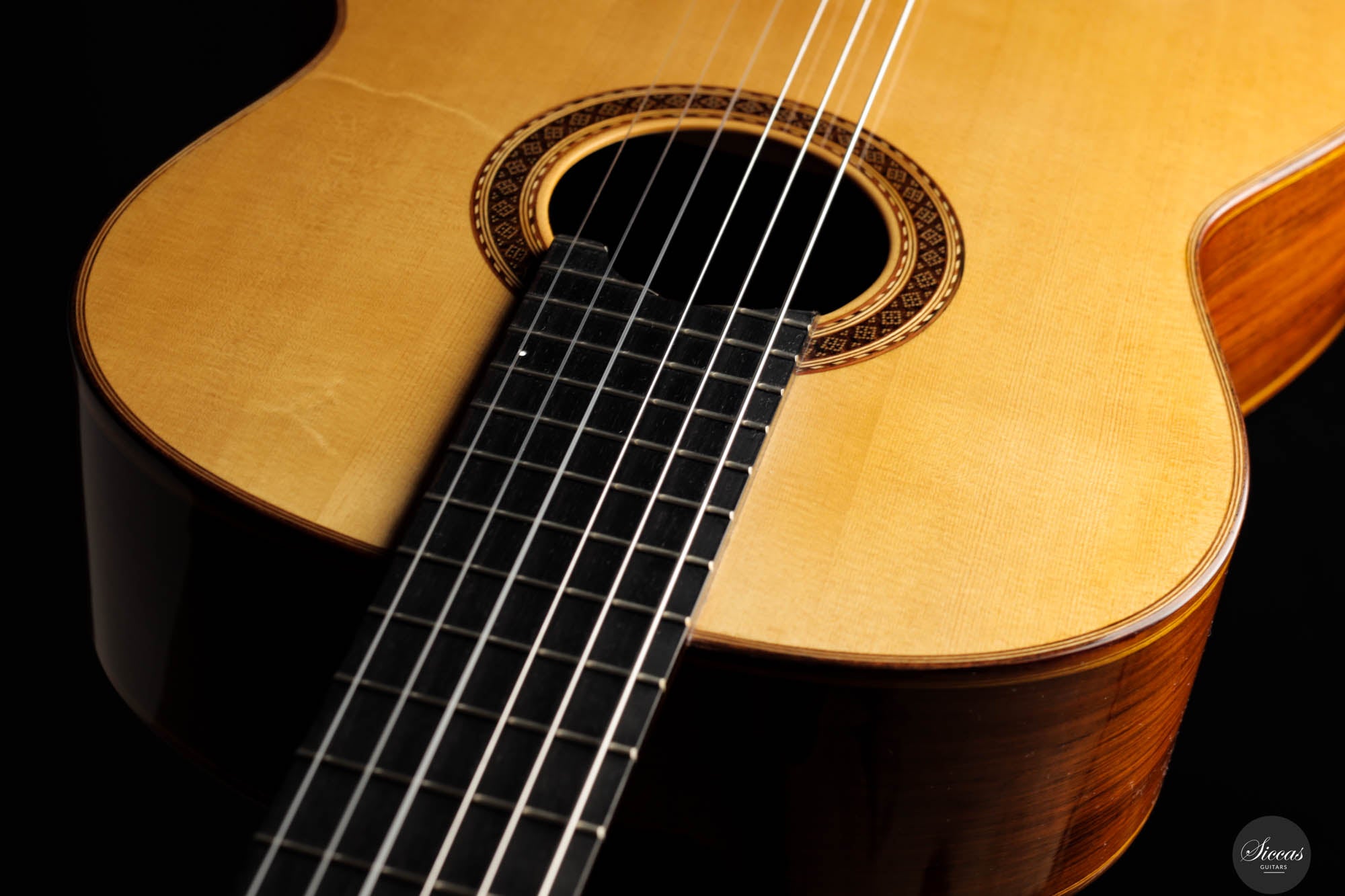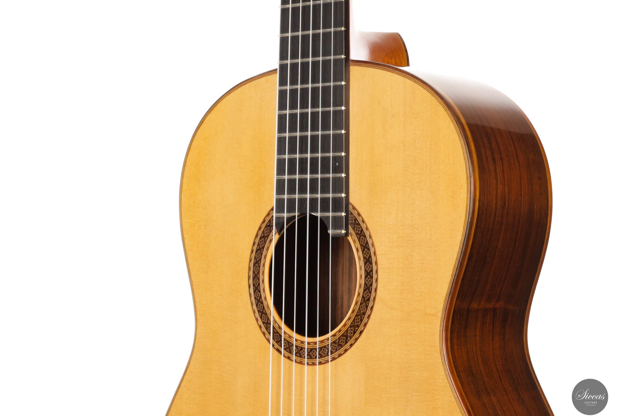Gefertigt von Karl-Heinz Römmich, einem der besten Gitarrenbauer Deutschlands, zeichnet sich diese Gitarre als ein schönes Instrument aus, das sowohl ästhetisch als auch klanglich hervorragend ist. Sie erreicht eine bemerkenswerte Balance und Vielseitigkeit in ihrem Klang, mit lyrischen Höhen, die außergewöhnliche Ausdrucksmöglichkeiten bieten. Diese Höhen ermöglichen es Musikern, die subtilen Nuancen jeder Komposition einzufangen, wunderbar ergänzt durch starke, solide Bässe, die eine robuste Grundlage für den Gesamtklang der Gitarre legen. Dieses dynamische Zusammenspiel zwischen den Höhen und Bässen ermöglicht eine reiche tonale Erkundung und macht die Gitarre geeignet für eine breite Vielfalt musikalischer Ausdrucksformen und Stile. Ihre starke Projektion ist in der Lage, jeden Konzertsaal zu füllen, was sie zu einer idealen Wahl für professionelle Auftritte macht. Obwohl es sich um ein gebrauchtes Instrument handelt, befindet es sich noch immer in einem großartigen Zustand und zeigt nur geringfügige Gebrauchsspuren.