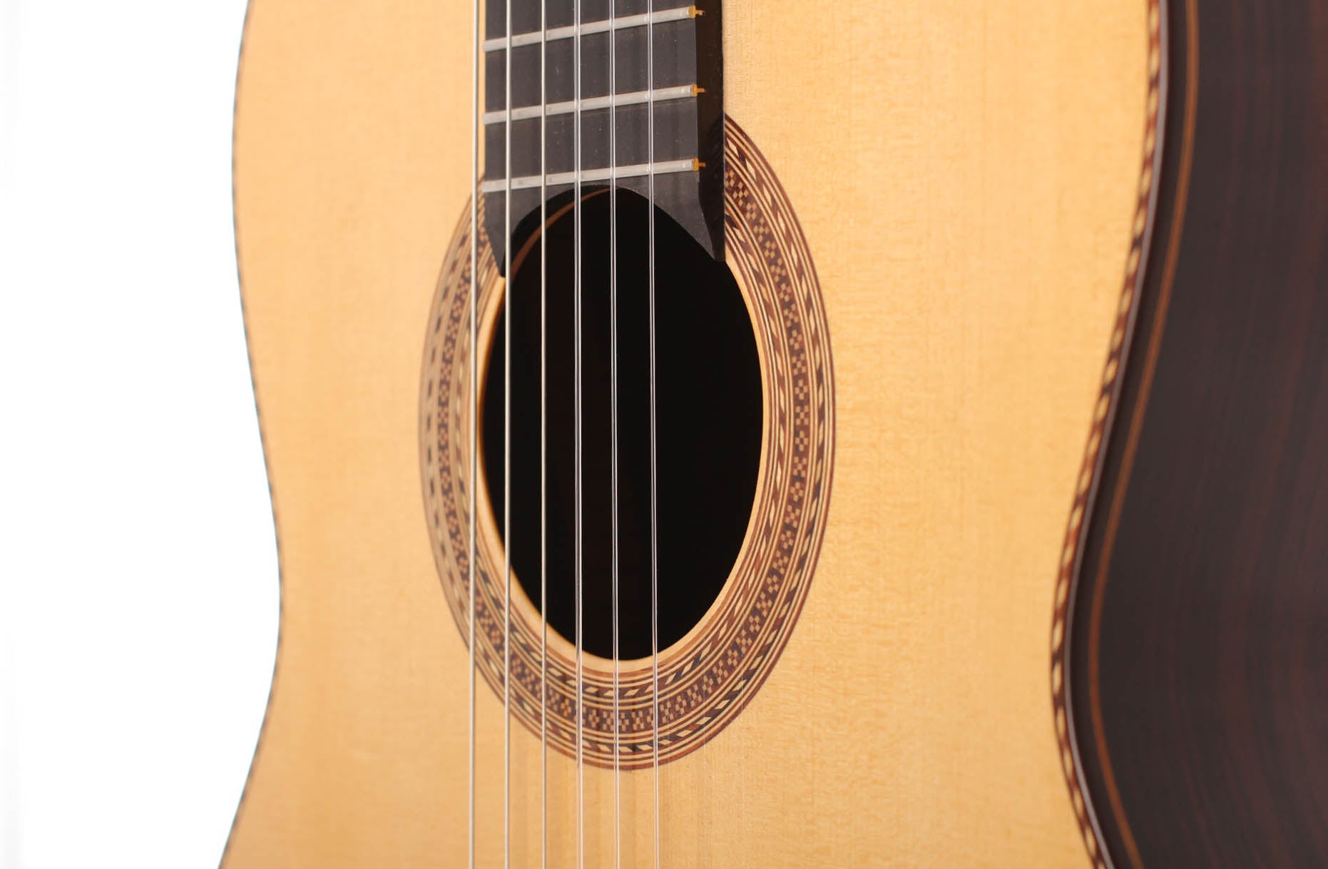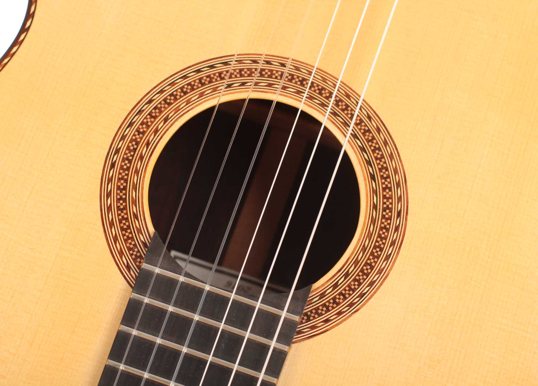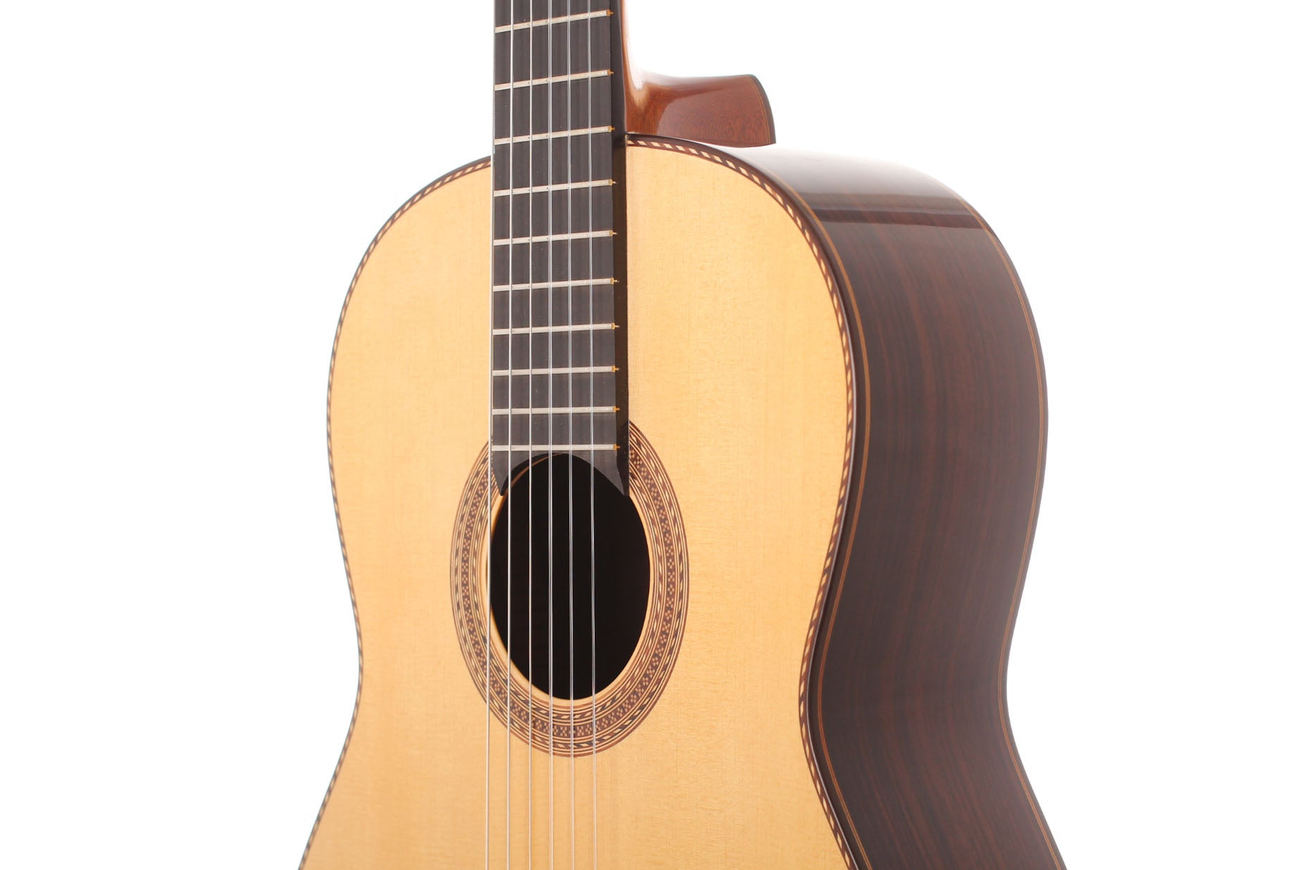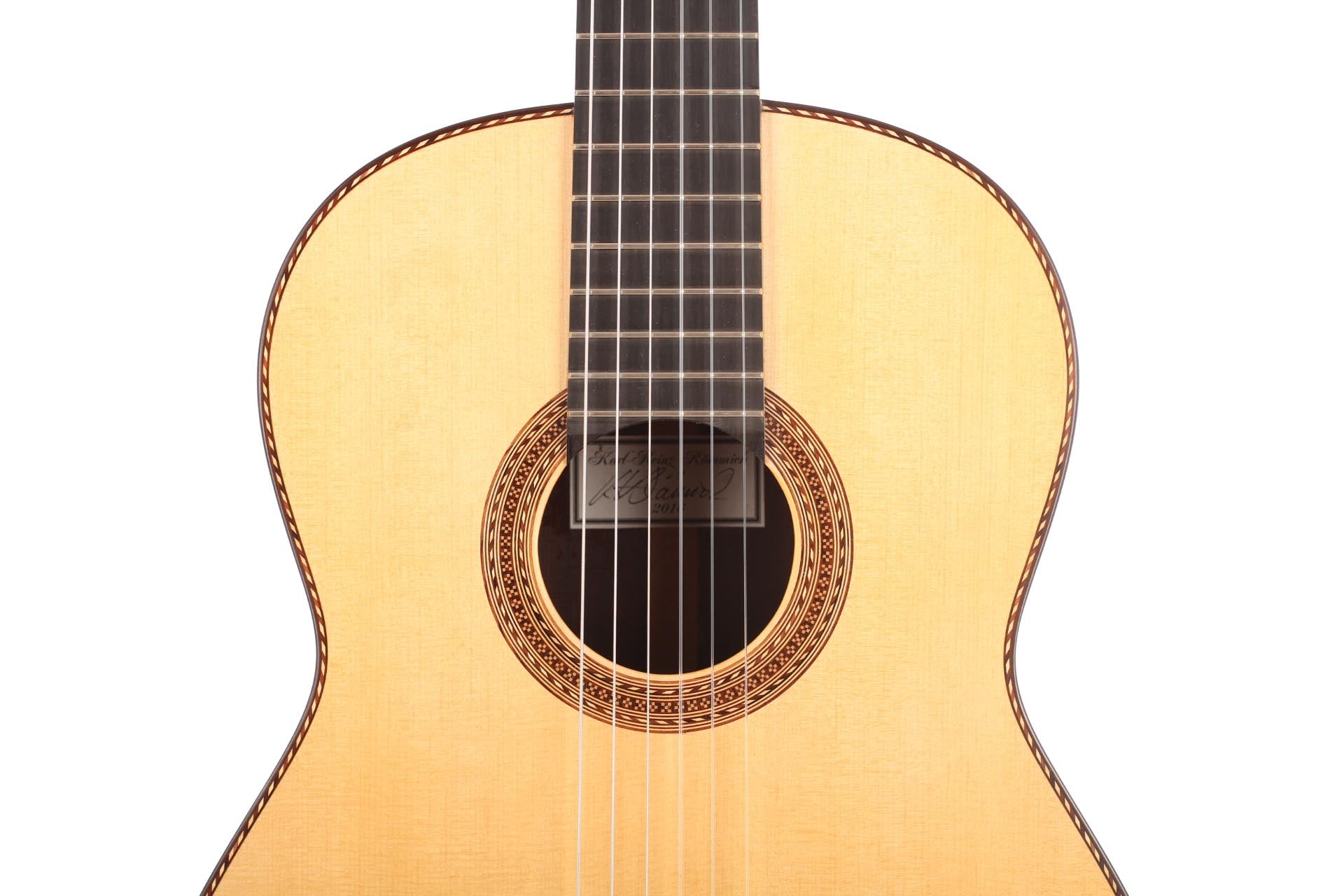 Karl-Heinz Römmich wurde 1953 geboren und baut seit über 30 Jahren Gitarren. Berühmte Gitarristen wie Xuefei Yang und Roman Viazovskiy spielen seine Gitarren. Karl-Heinzs Gitarren sind ganz dem spanischen Gitarrenbaustil gewidmet. Beste natürliche Materialien und nur beste Hölzer, die über 40 Jahre lang gelagert wurden verwendet Karl-Heinz für seine Gitarren. Veredelt werden alle seine Gitarren mit einer Schellackpolitur. Die Decke dieser Gitarre besteht aus feinster Fichte und der Boden sowie die Zargen sind aus indischem Palisander. Die Mechaniken sind von Fustero. Ein Hiscox Pro II Hartschalenkoffer ist inklusive.