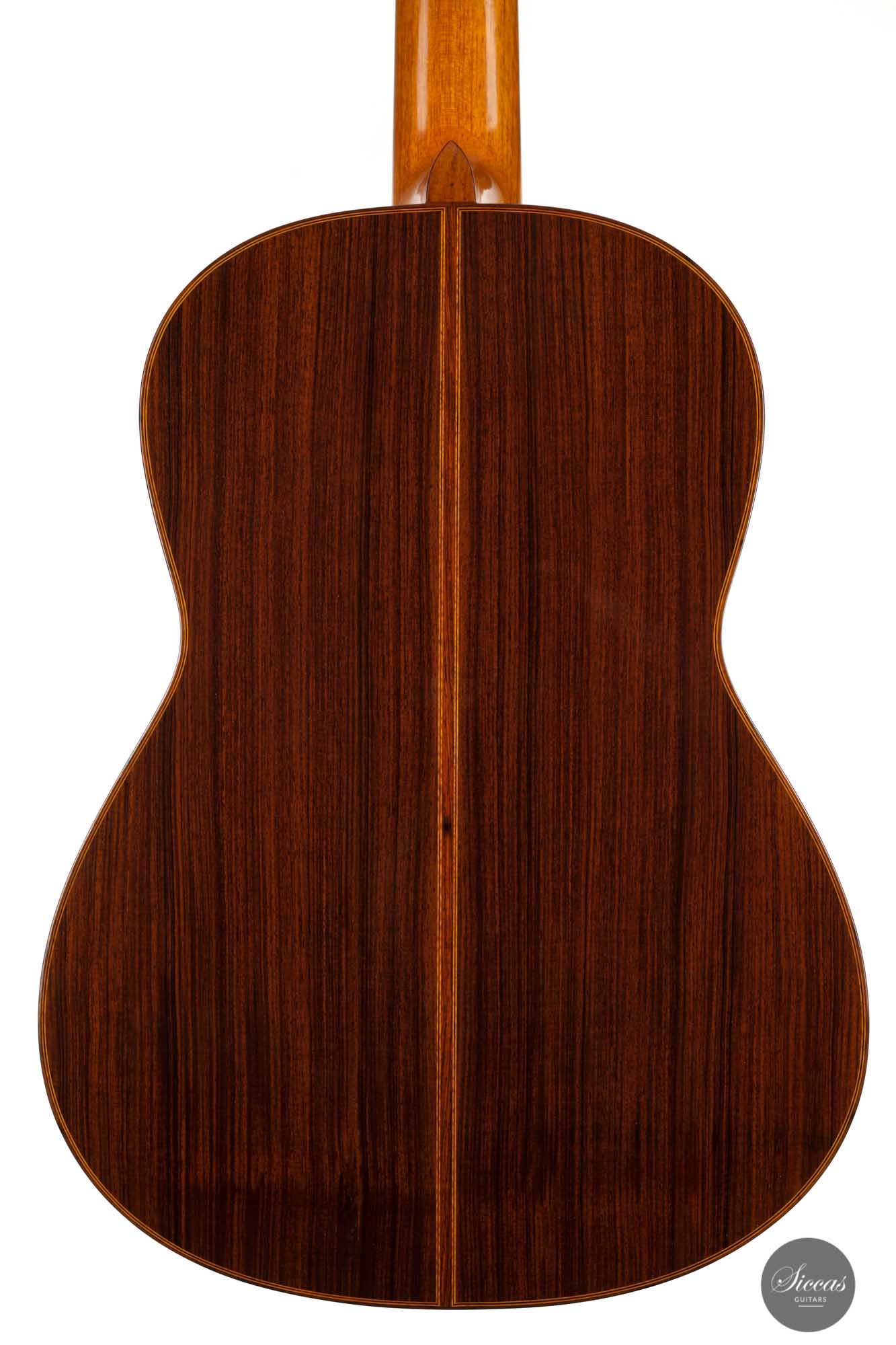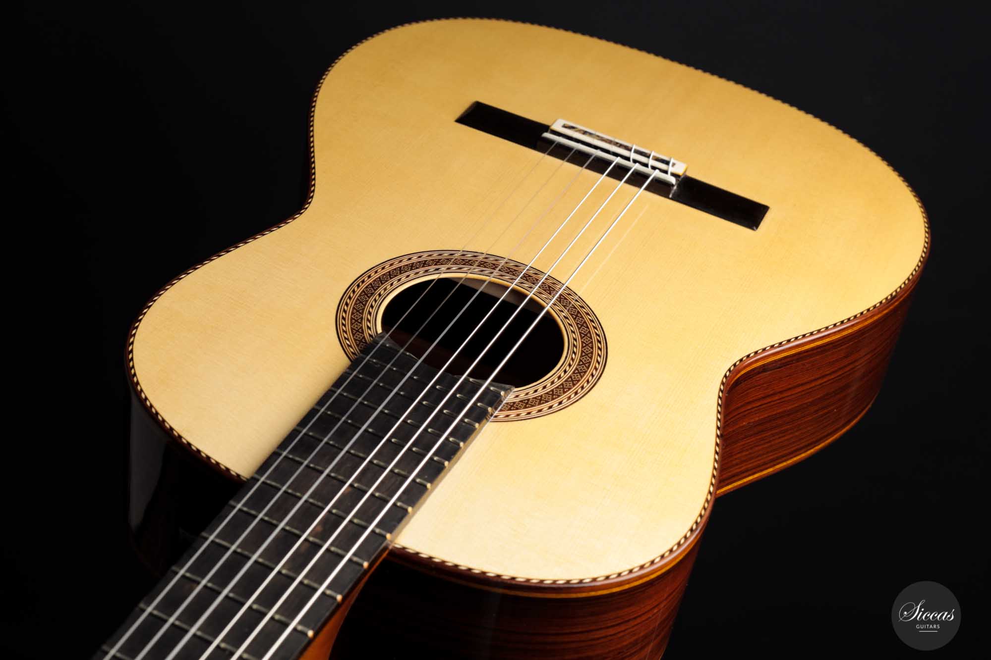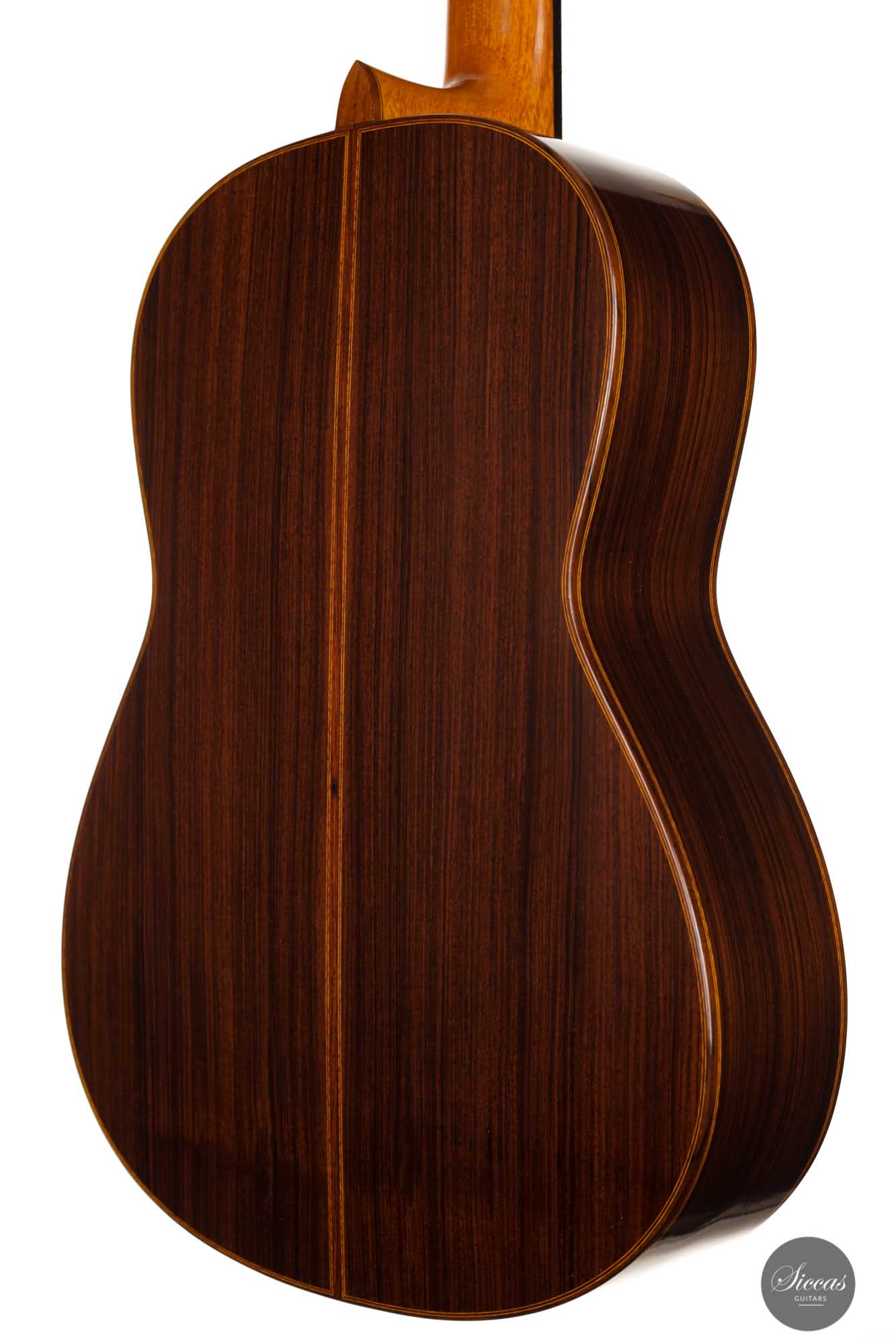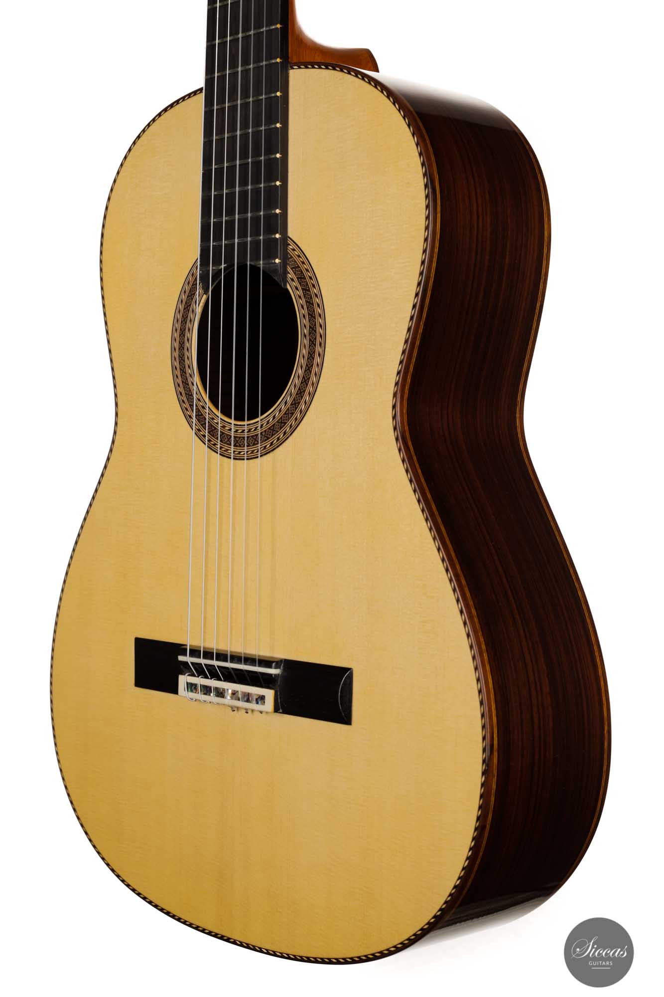 This very fine spruce/Indian rosewood guitar is a real gem. The thickness and lyricism of the trebles are outstanding, and this instrument's responsiveness recalls the openness of the Madrilenian guitar's sound. The sustain in the high register is impressive, and the notes develop an exceptional harmonic density. Moreover, the ability of the trebles to connect and make melodies sing is fascinating. With its well-profiled neck, effortless for the left hand, and excellent volume, it is the ideal guitar for both concerts, recordings, and home practice on a world-class guitar.