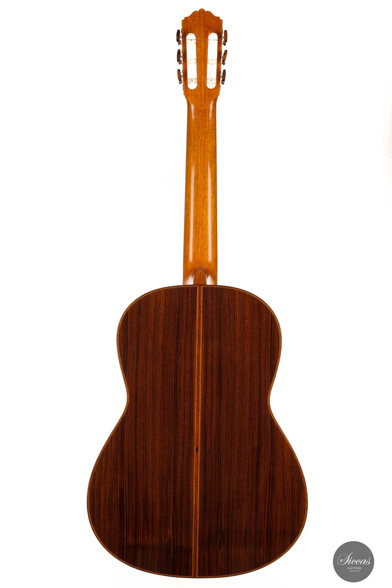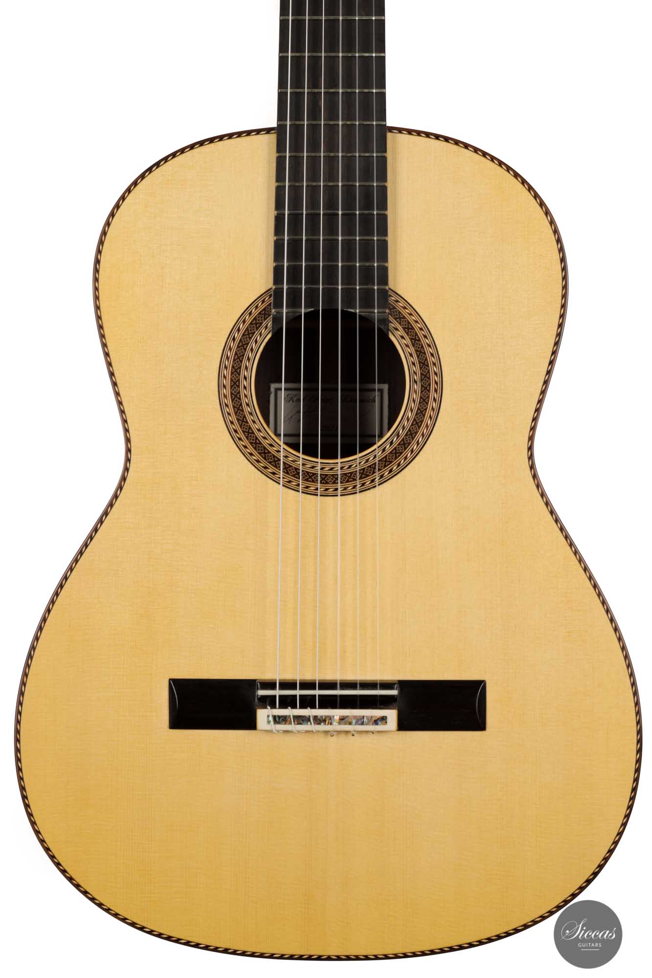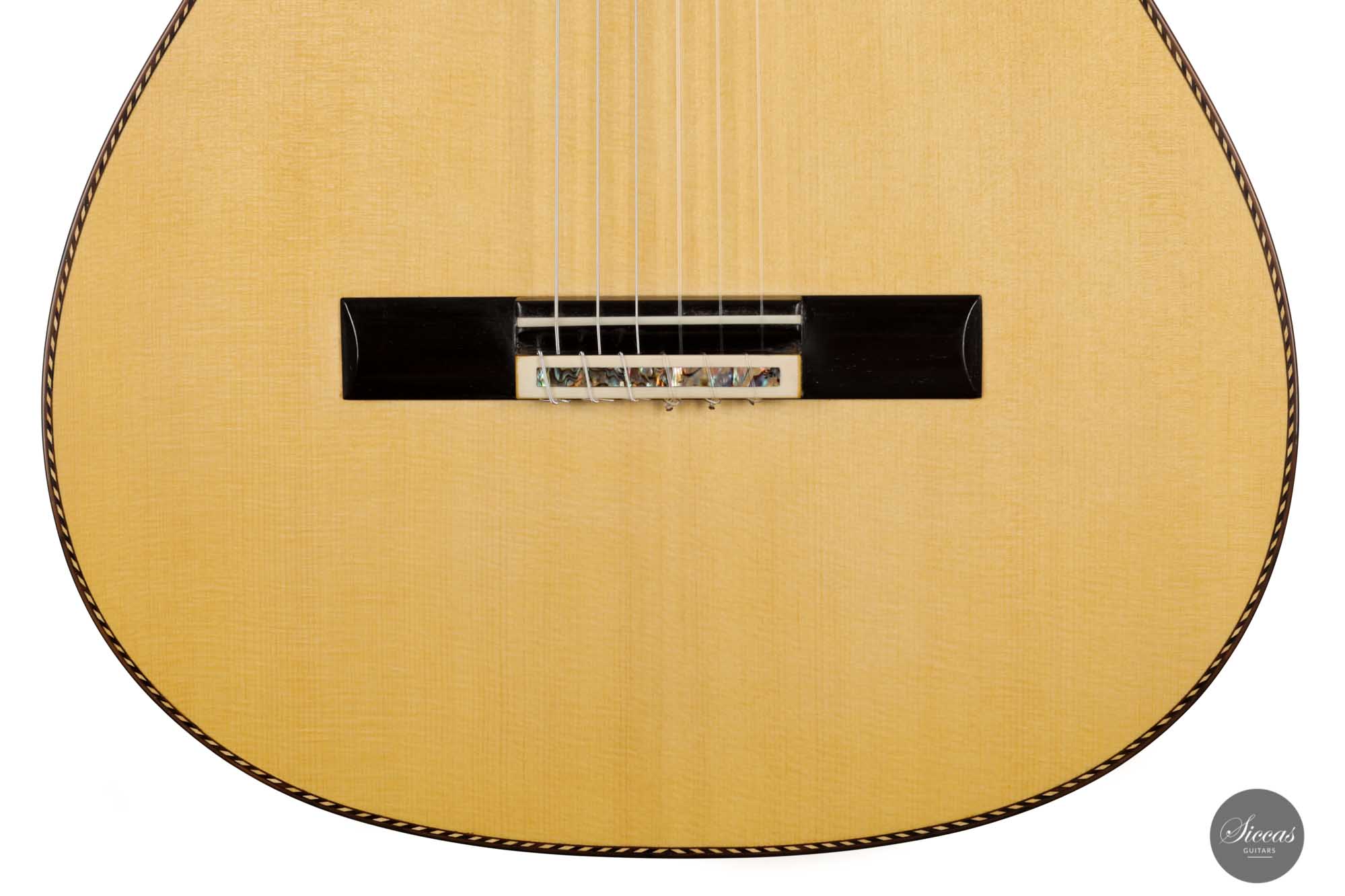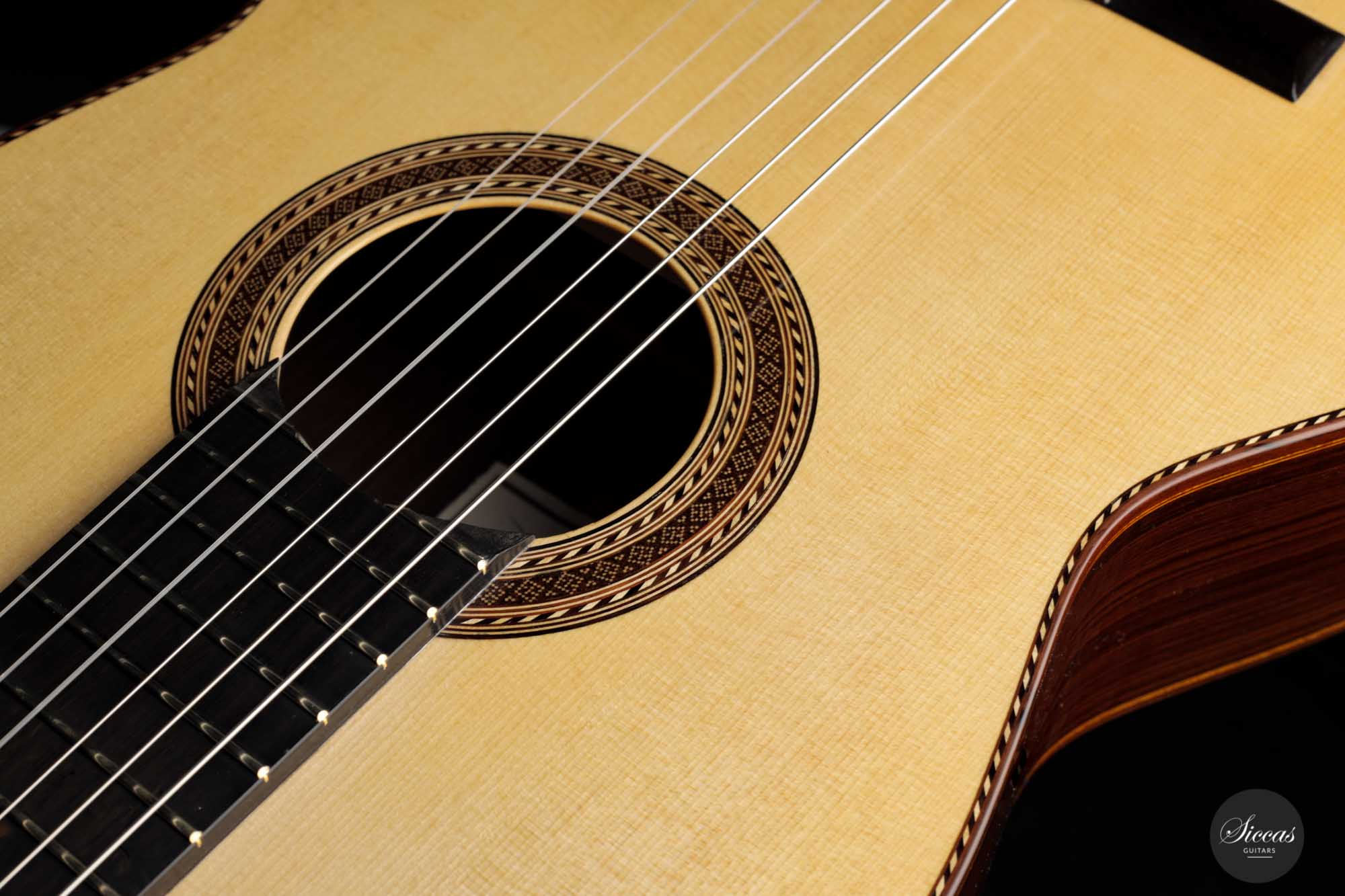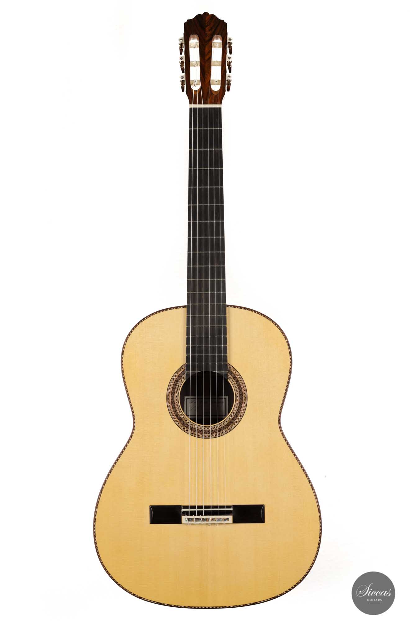 This very fine spruce/Indian rosewood guitar is a real gem. The thickness and lyricism of the trebles are outstanding, and this instrument's responsiveness recalls the openness of the Madrilenian guitar's sound. The sustain in the high register is impressive, and the notes develop an exceptional harmonic density. Moreover, the ability of the trebles to connect and make melodies sing is fascinating. With its well-profiled neck, effortless for the left hand, and excellent volume, it is the ideal guitar for both concerts, recordings, and home practice on a world-class guitar.