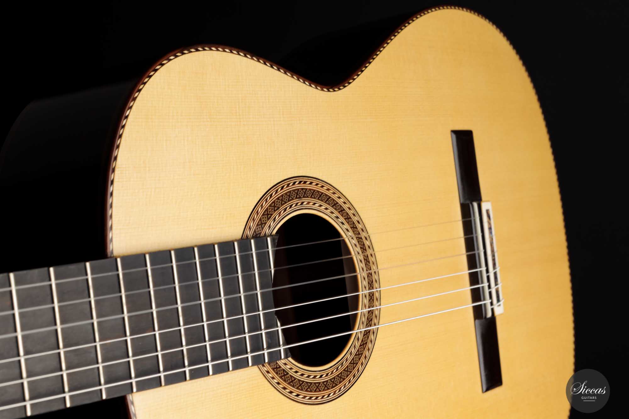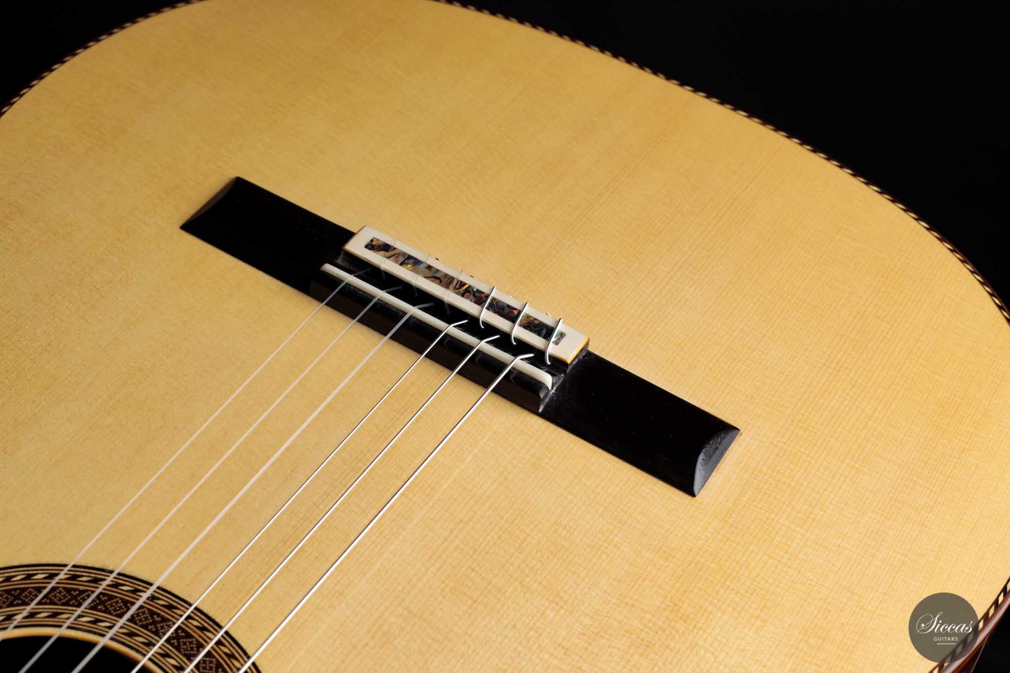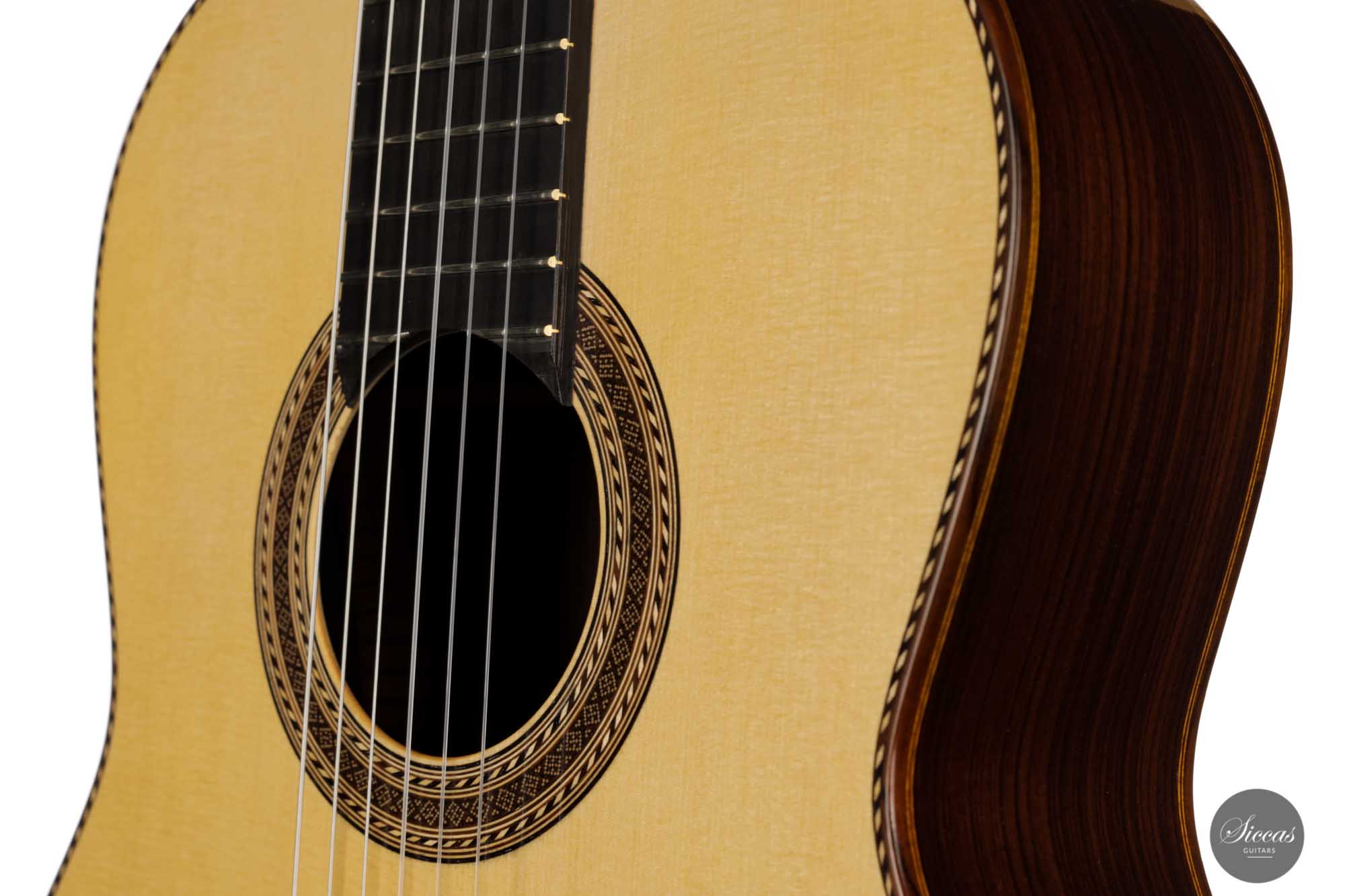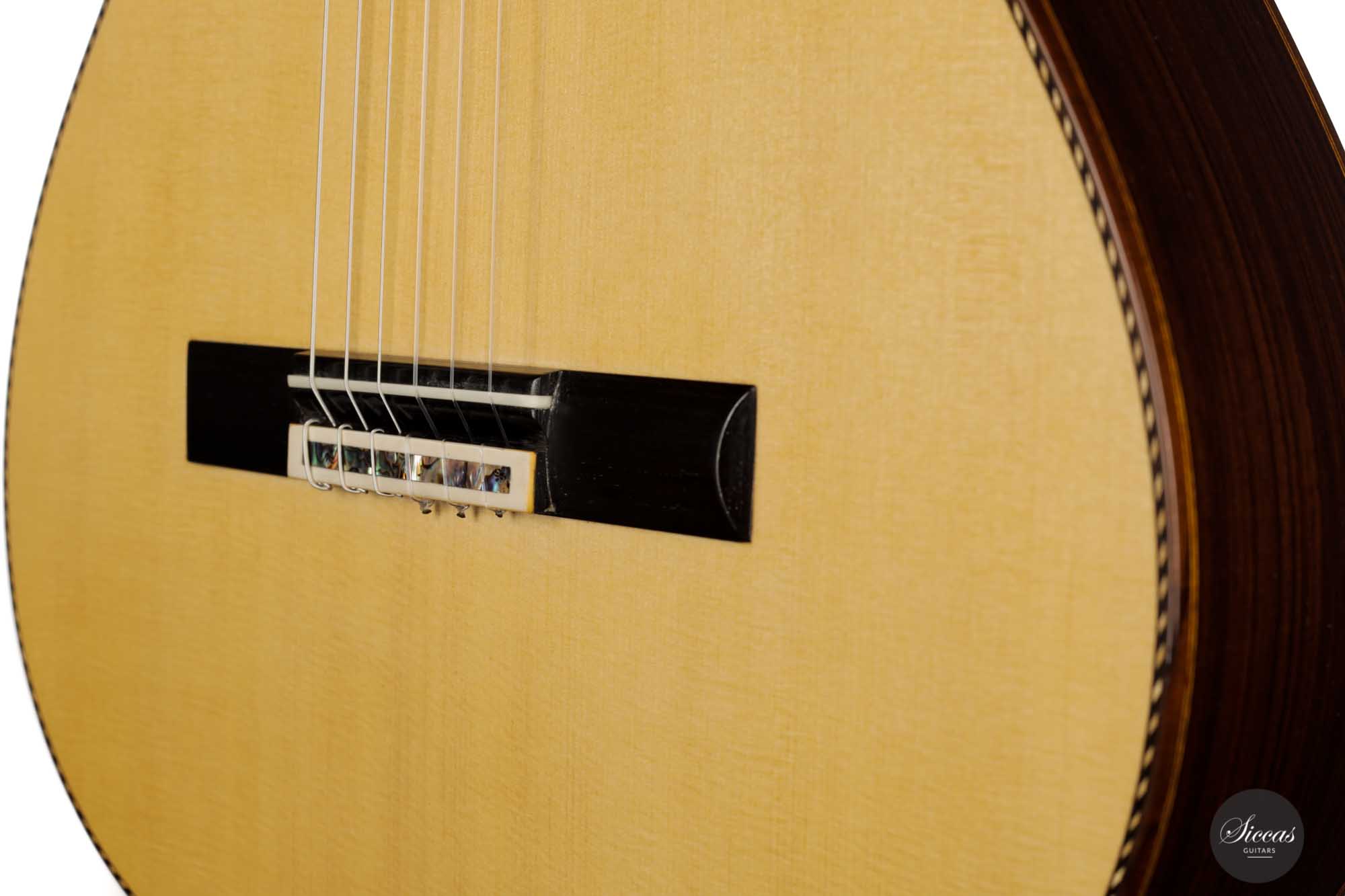 This very fine spruce/Indian rosewood guitar is a real gem. The thickness and lyricism of the trebles are outstanding, and this instrument's responsiveness recalls the openness of the Madrilenian guitar's sound. The sustain in the high register is impressive, and the notes develop an exceptional harmonic density. Moreover, the ability of the trebles to connect and make melodies sing is fascinating. With its well-profiled neck, effortless for the left hand, and excellent volume, it is the ideal guitar for both concerts, recordings, and home practice on a world-class guitar.