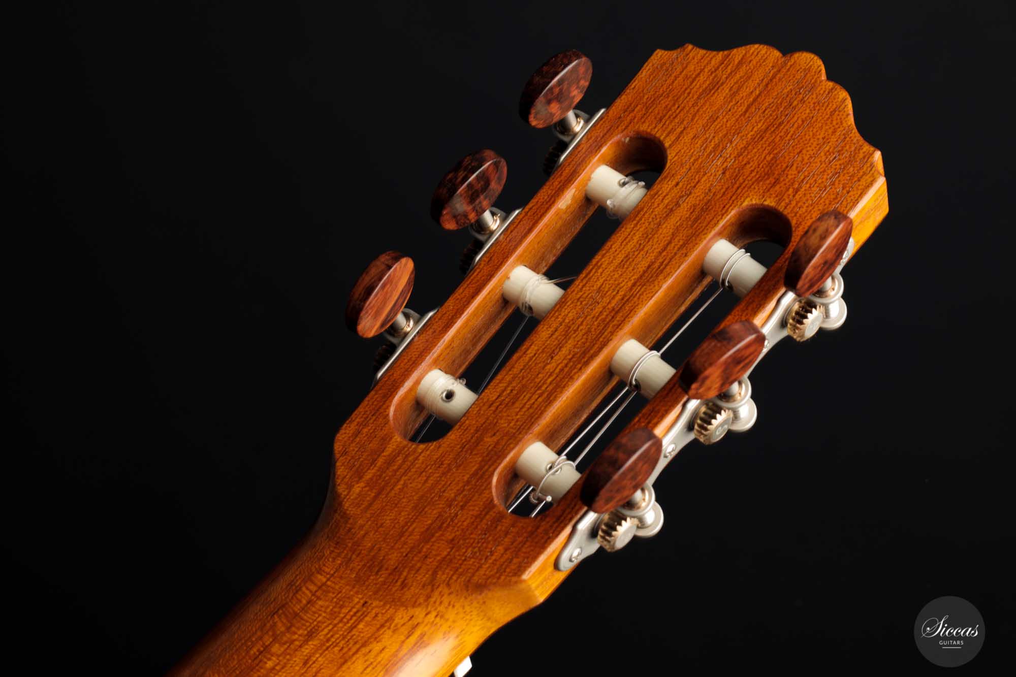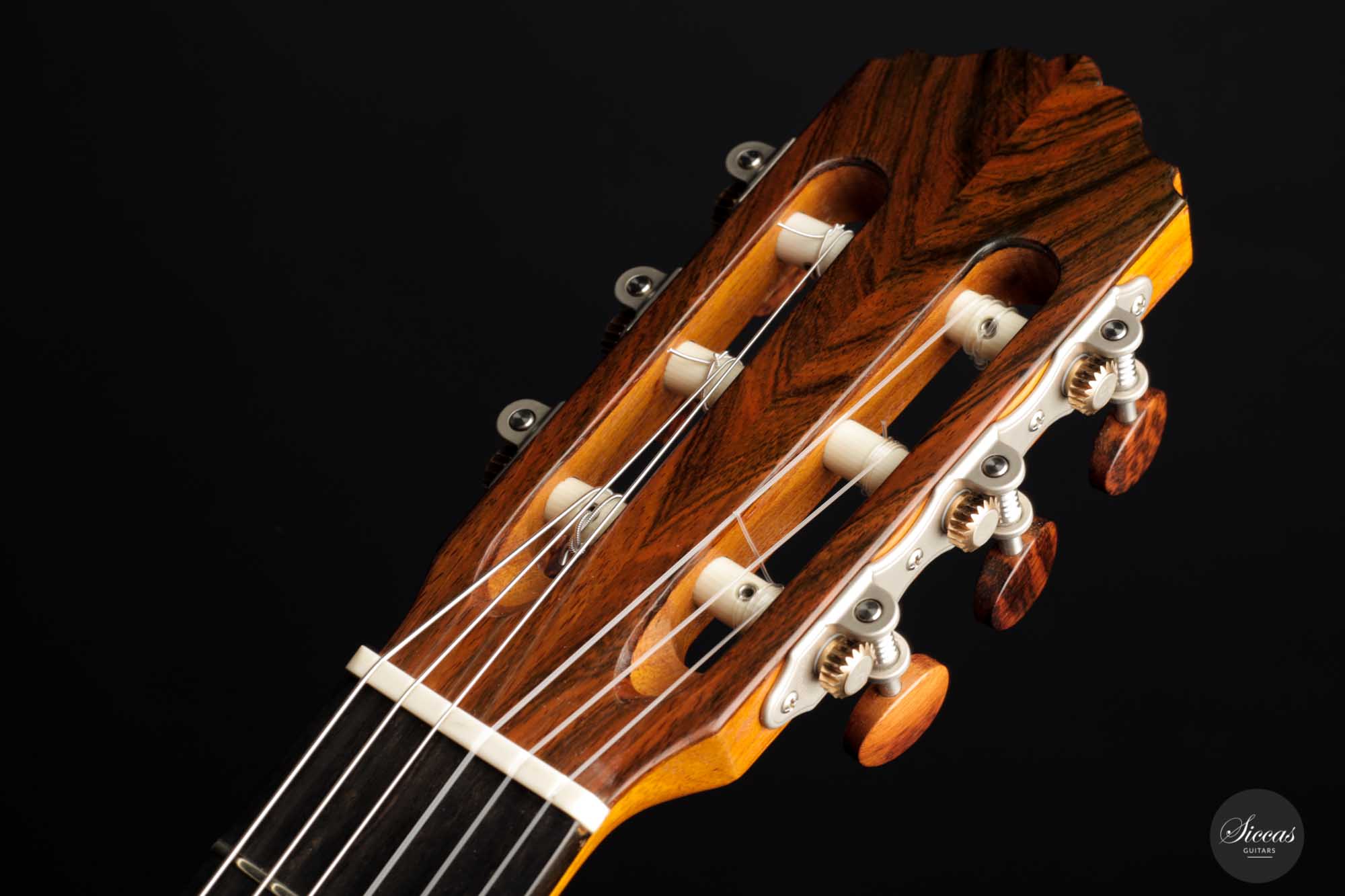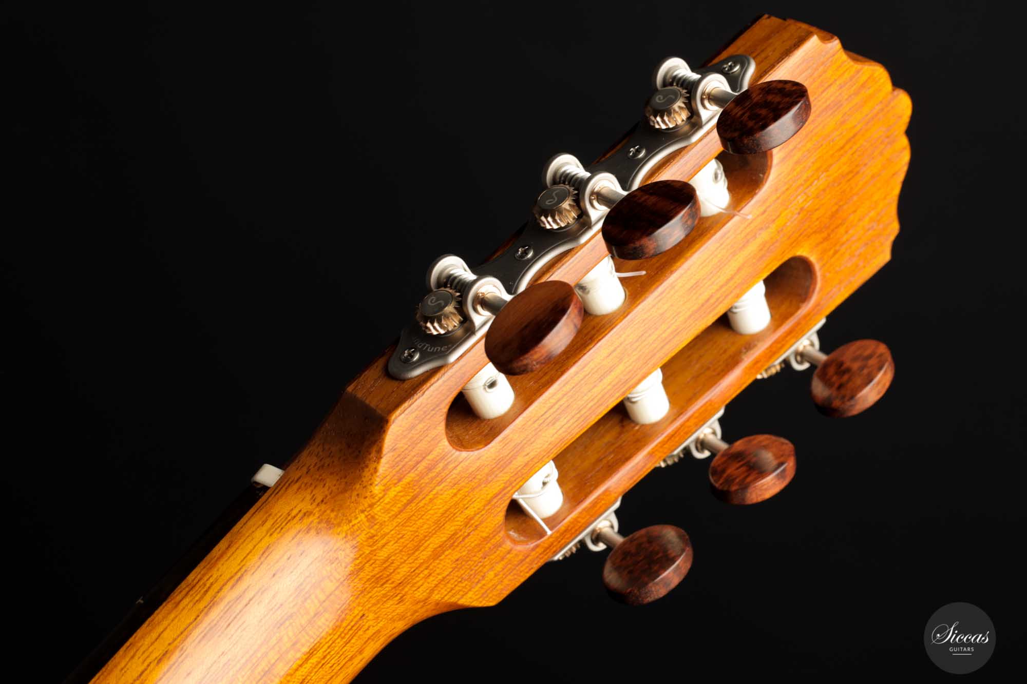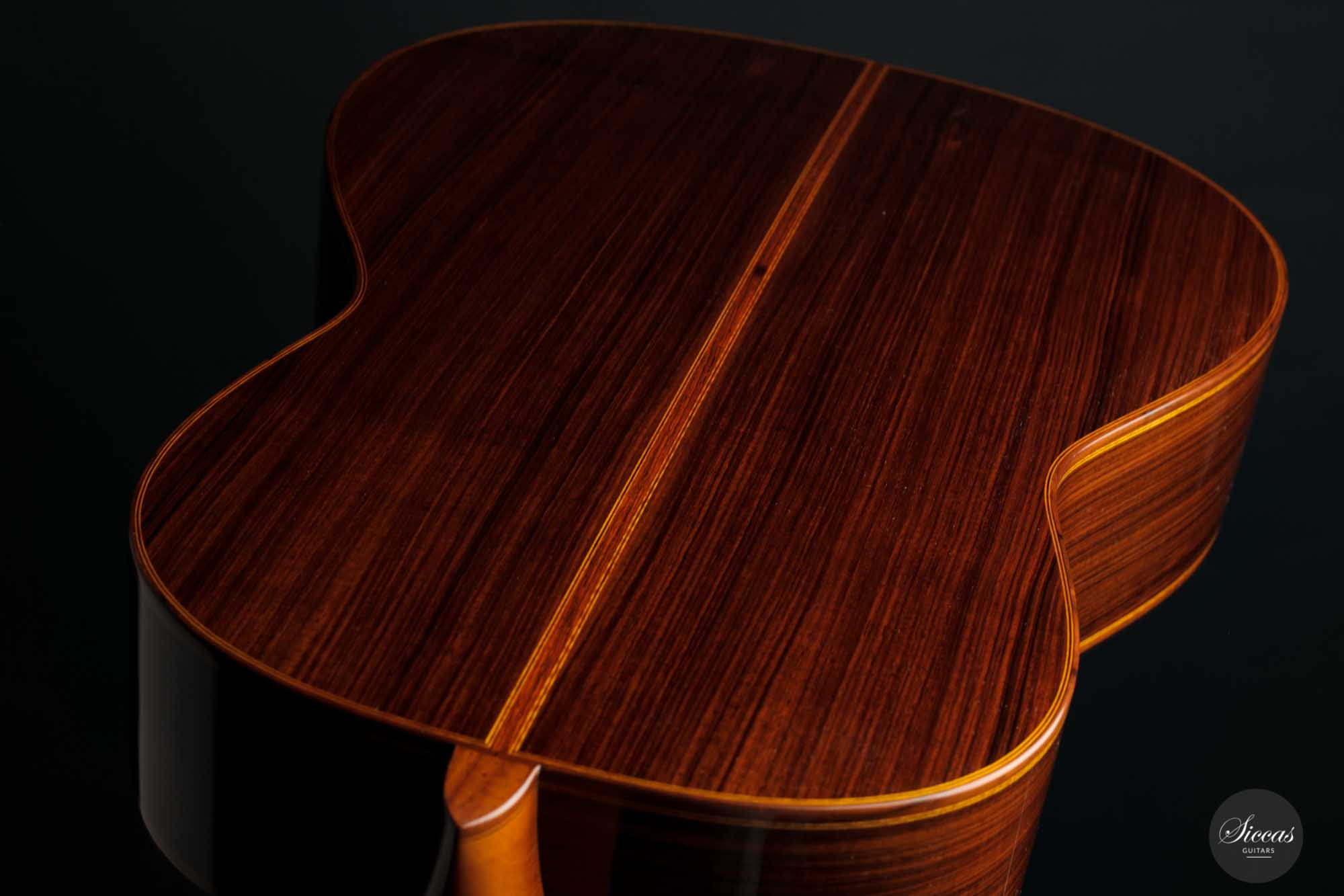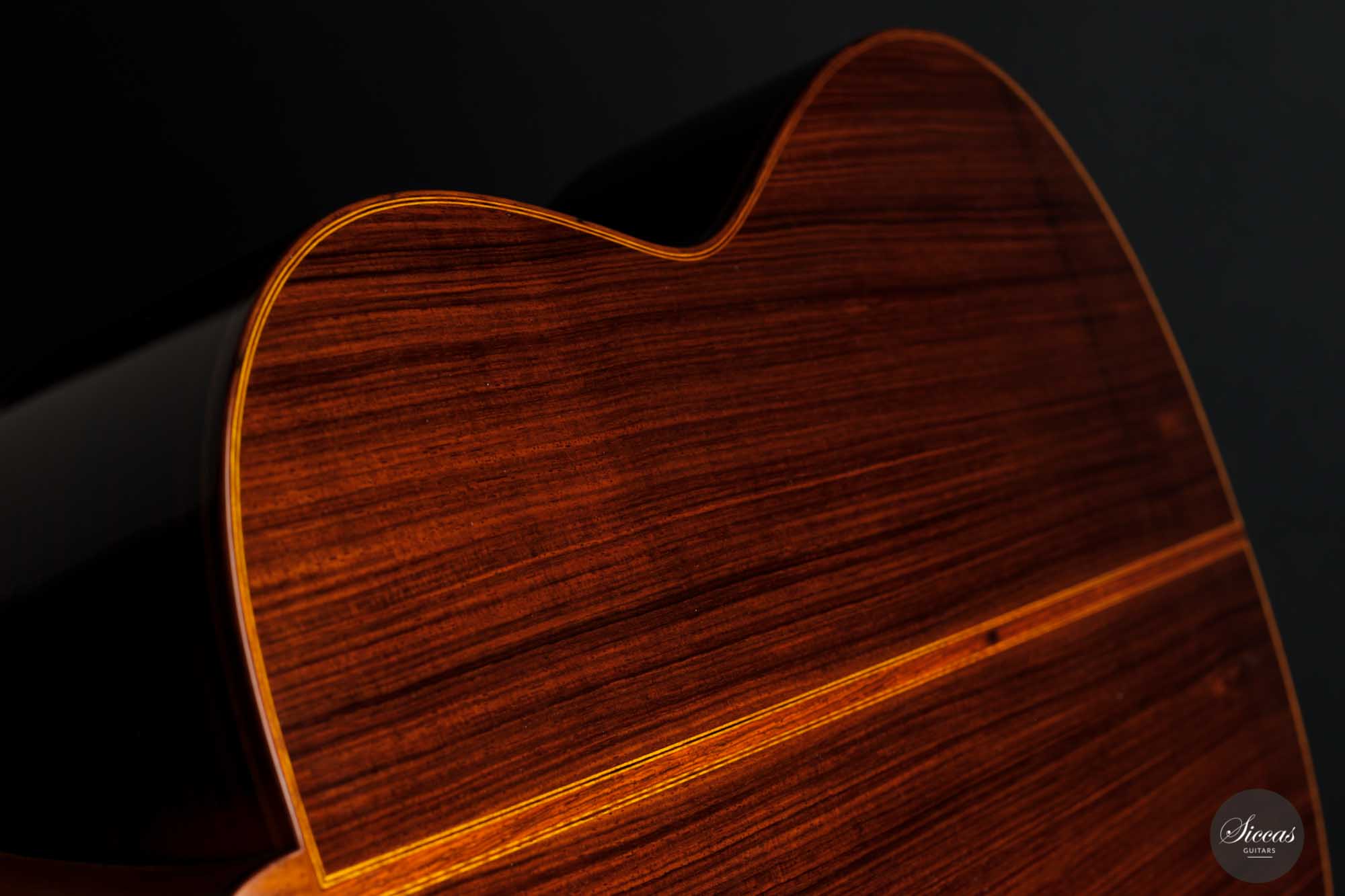 This very fine spruce/Indian rosewood guitar is a real gem. The thickness and lyricism of the trebles are outstanding, and this instrument's responsiveness recalls the openness of the Madrilenian guitar's sound. The sustain in the high register is impressive, and the notes develop an exceptional harmonic density. Moreover, the ability of the trebles to connect and make melodies sing is fascinating. With its well-profiled neck, effortless for the left hand, and excellent volume, it is the ideal guitar for both concerts, recordings, and home practice on a world-class guitar.