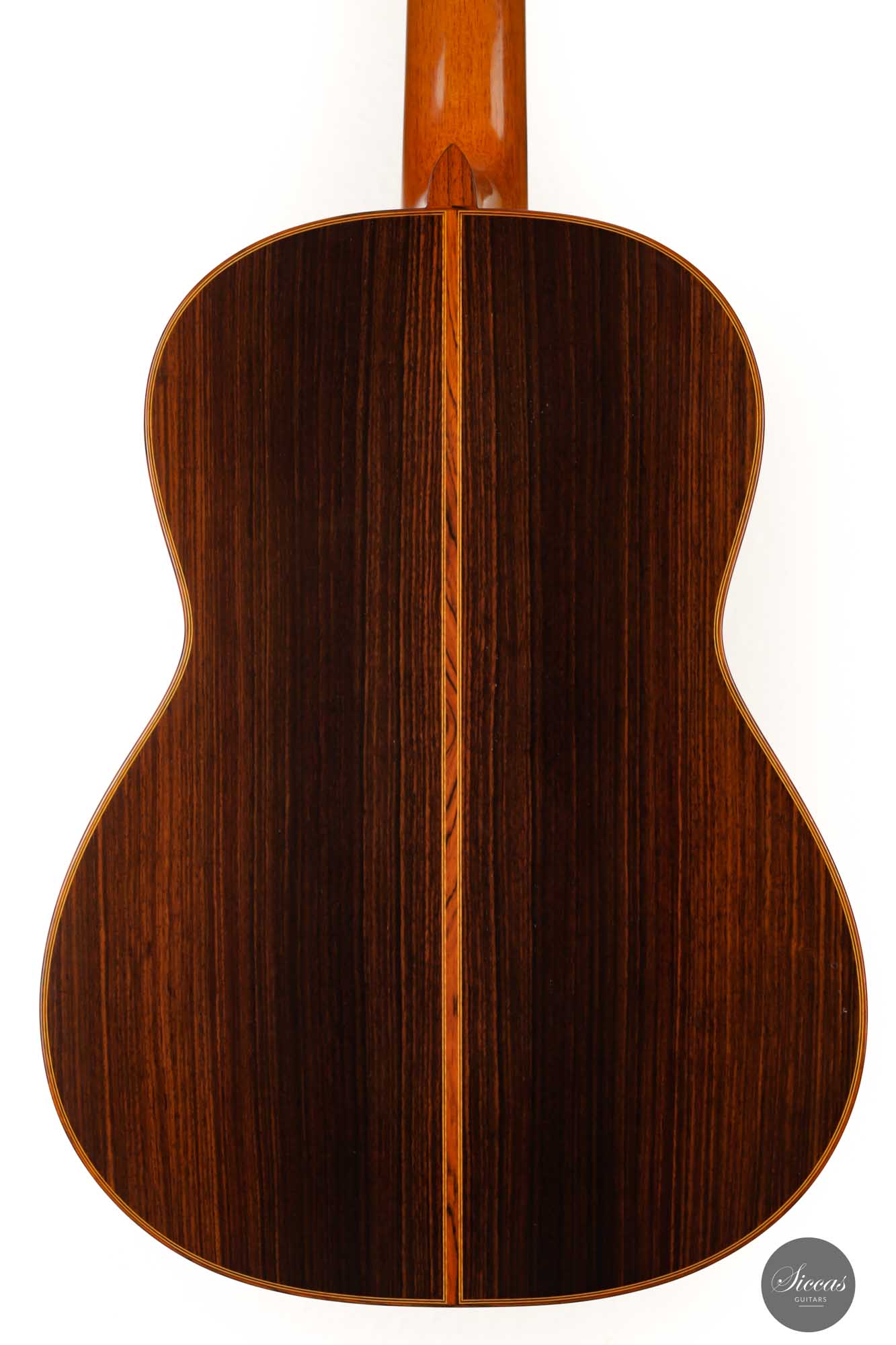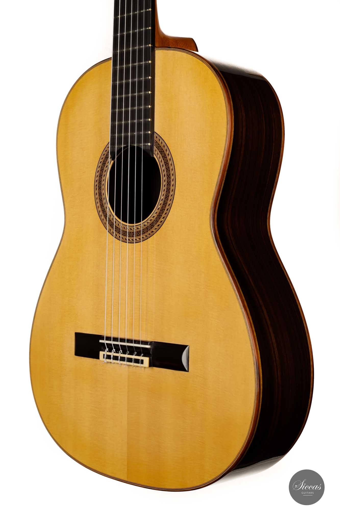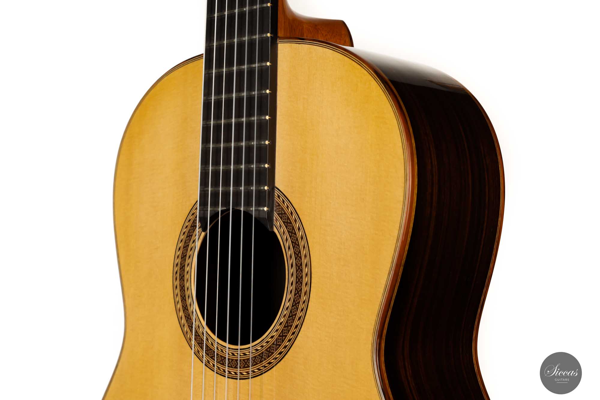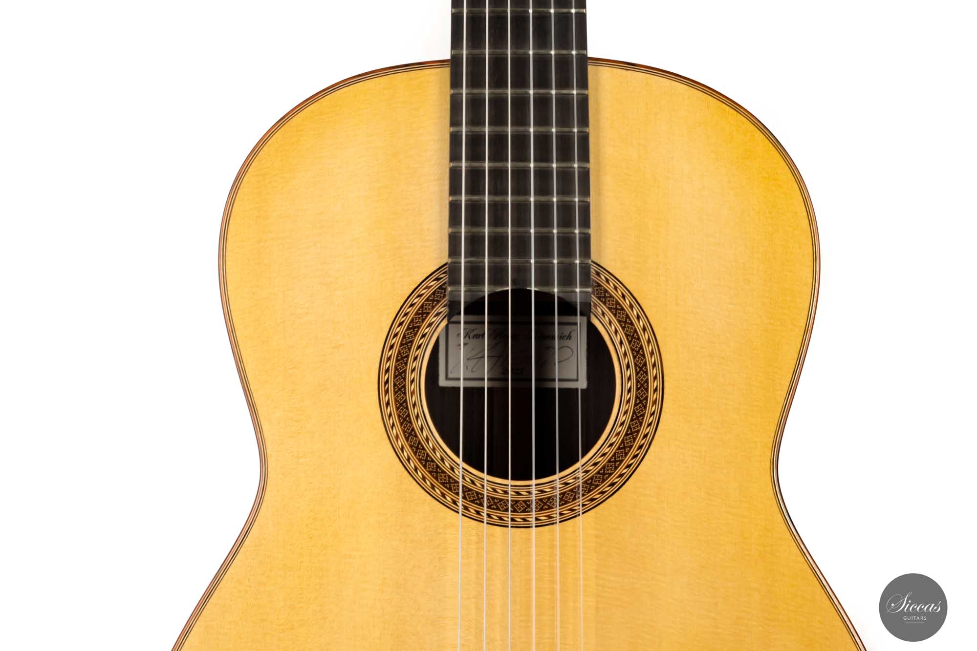 Diese schöne Gitarre von Karl-Heinz Römmich aus dem Jahr 2022 besticht durch ihre Lyrik. Die Fichtendecke und der Boden und die Zargen aus indischem Palisander, kombiniert mit klassischer, exquisiter und einfacher Verzierung, machen diese Gitarre zu einer Augenweide. Mit der hervorragenden Balance zwischen den lyrischen Höhen und den kräftigen, soliden Bässen bietet dieses feine Instrument unendliche Möglichkeiten im Bereich der klanglichen Erkundung, die mühelos jeden Konzertsaal füllen werden.