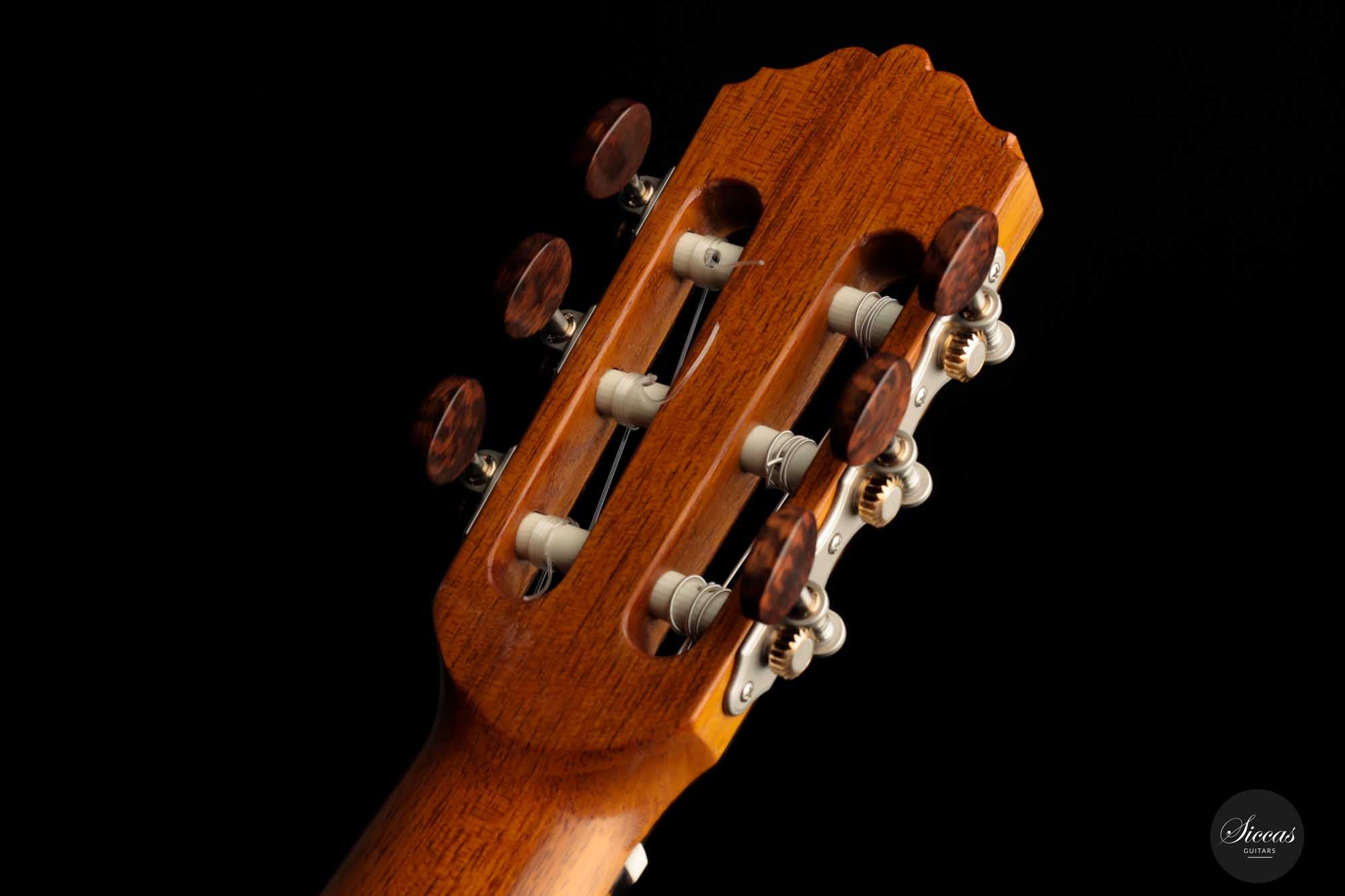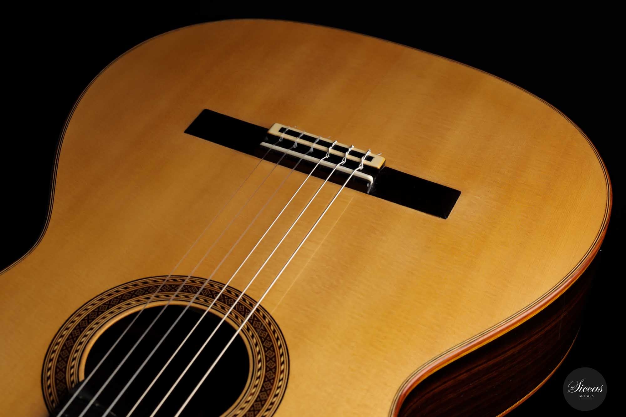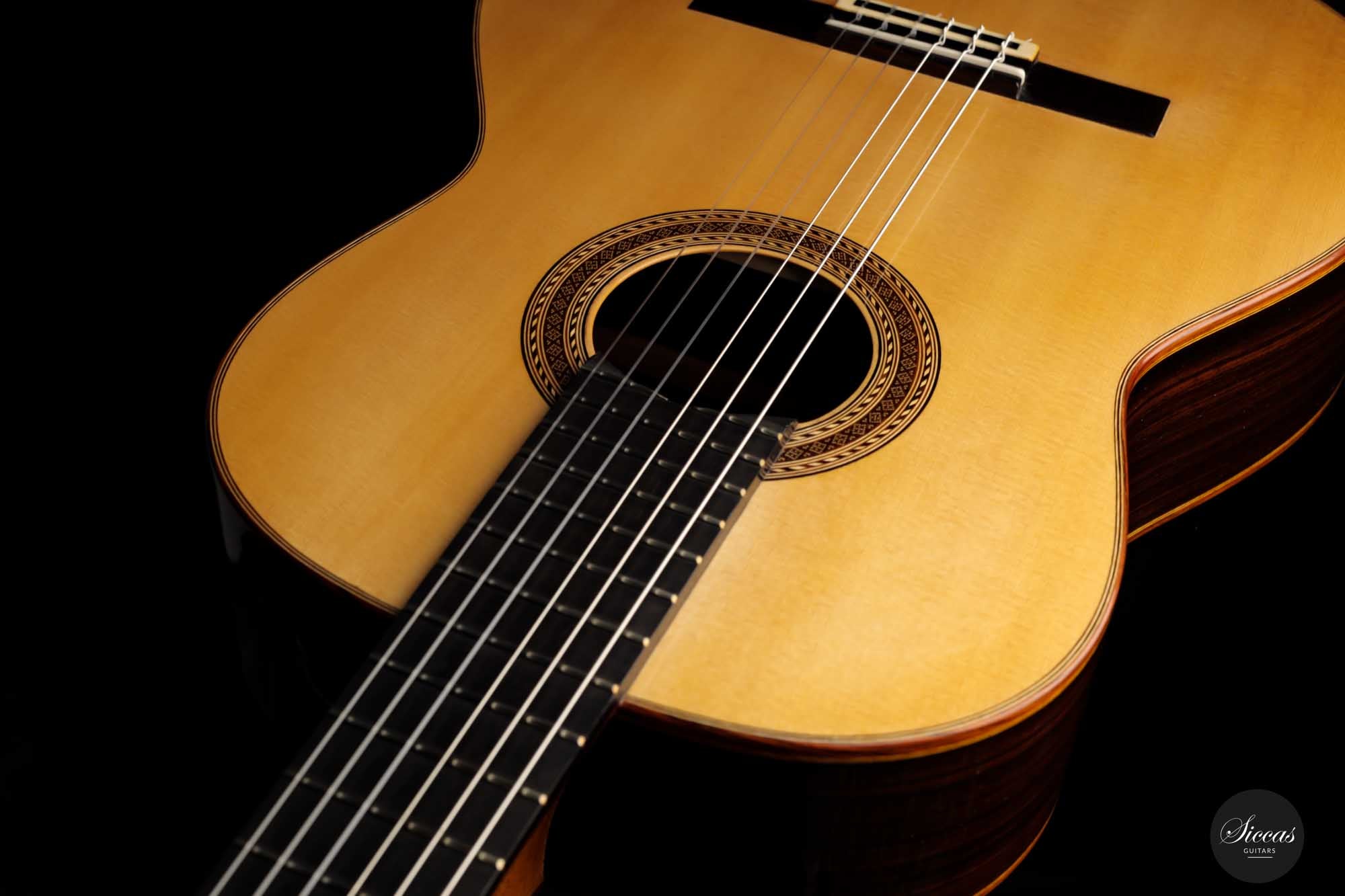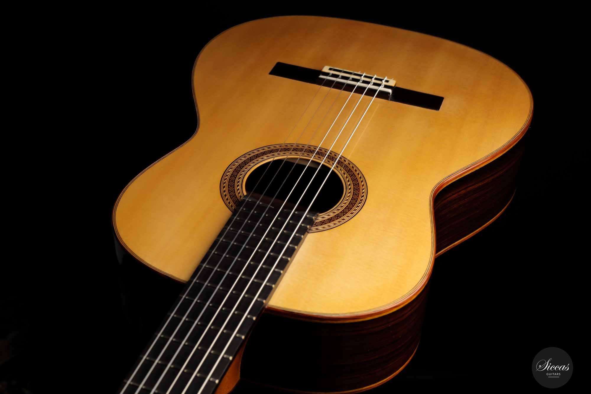 Diese schöne Gitarre von Karl-Heinz Römmich aus dem Jahr 2022 besticht durch ihre Lyrik. Die Fichtendecke und der Boden und die Zargen aus indischem Palisander, kombiniert mit klassischer, exquisiter und einfacher Verzierung, machen diese Gitarre zu einer Augenweide. Mit der hervorragenden Balance zwischen den lyrischen Höhen und den kräftigen, soliden Bässen bietet dieses feine Instrument unendliche Möglichkeiten im Bereich der klanglichen Erkundung, die mühelos jeden Konzertsaal füllen werden.
