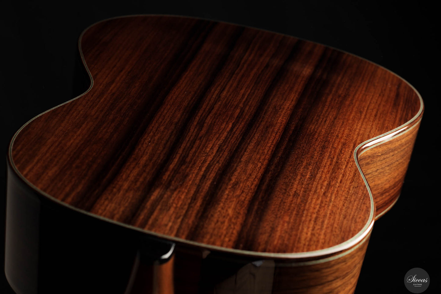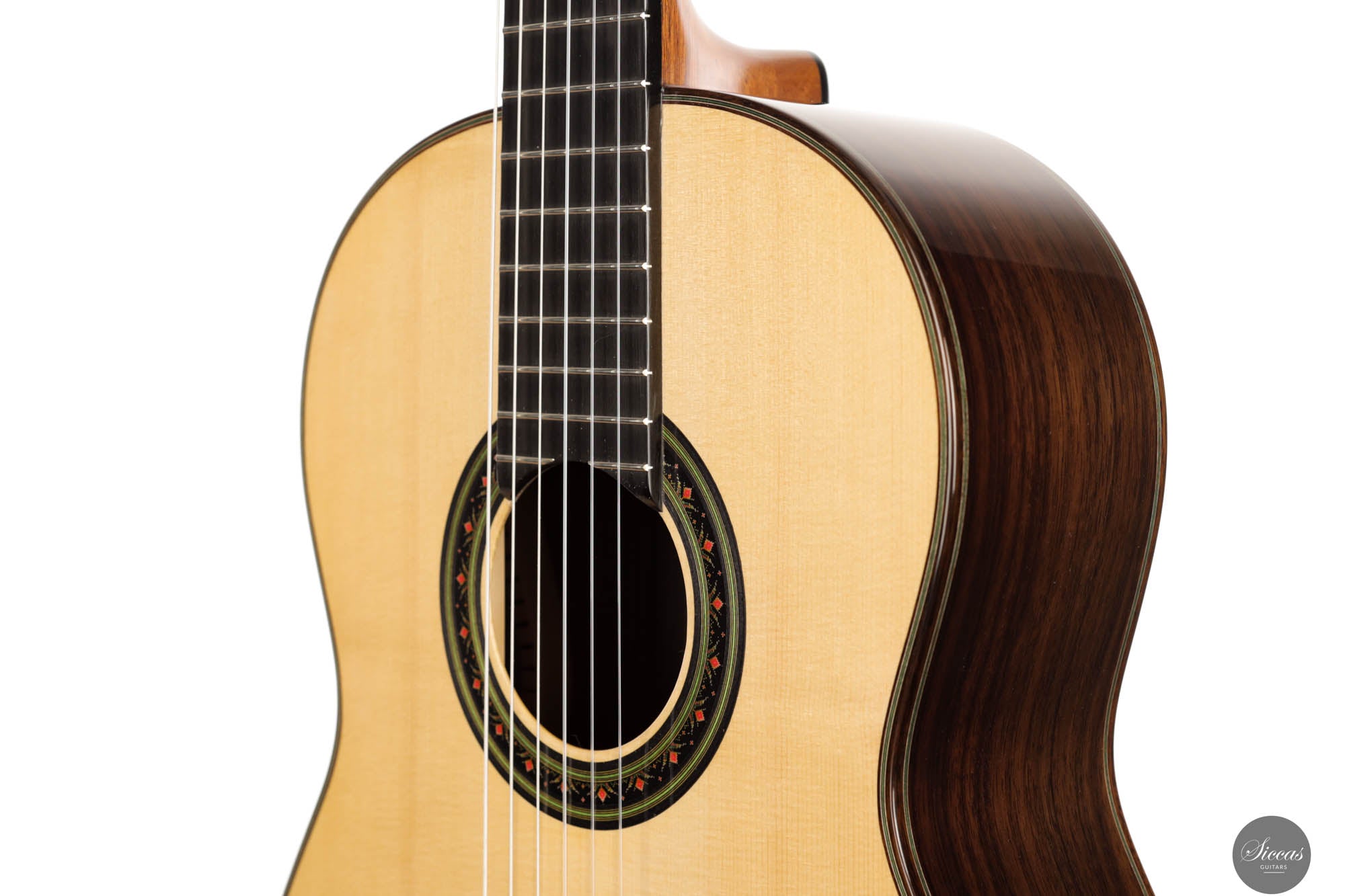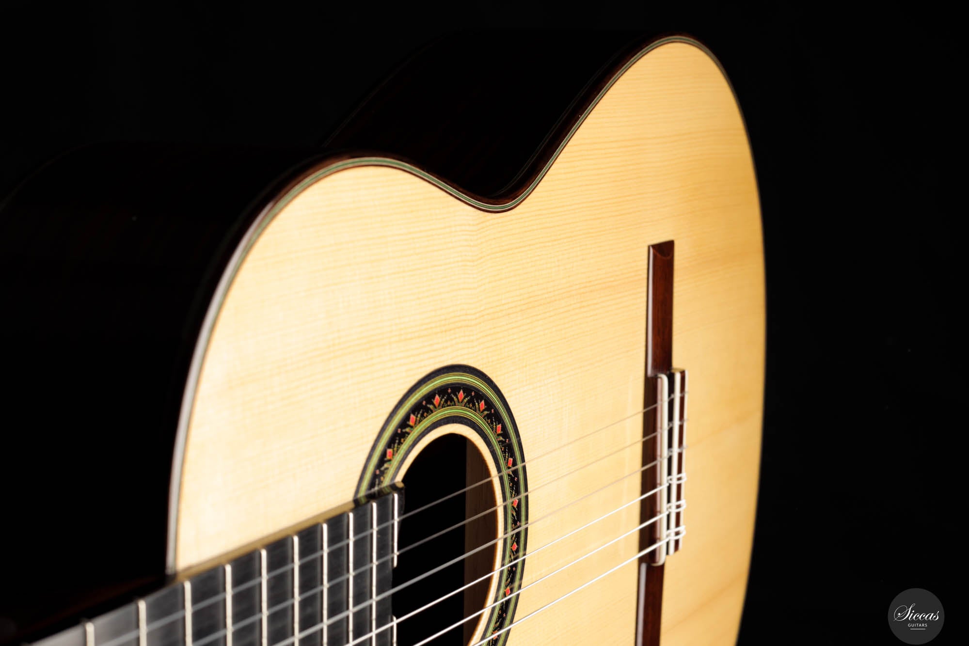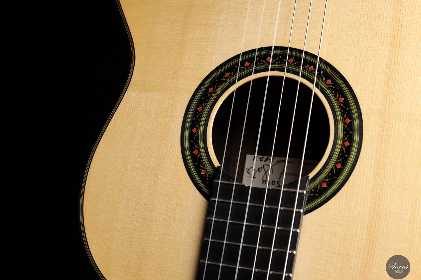 Diese exquisite Gitarre verfügt über eine Decke aus feinstem Alpenfichtenholz, bekannt für seine hervorragende Klangqualität, die wunderschön mit dem ästhetisch ansprechenden und klangvollen indischen Palisander für Rücken und Seiten kombiniert ist. Das Gesamterscheinungsbild strahlt eine verfeinerte Eleganz aus, die durch das Schellack-Finish verstärkt wird, das nicht nur schützt, sondern der Gitarre auch einen glänzenden Schimmer verleiht. Weitere Ergänzungen zu ihrem anspruchsvollen Design sind die Alessi-Mechaniken, bekannt für ihre Präzision und Zuverlässigkeit, die zum Premium-Feeling der Gitarre und zur Leichtigkeit des Stimmens beitragen.