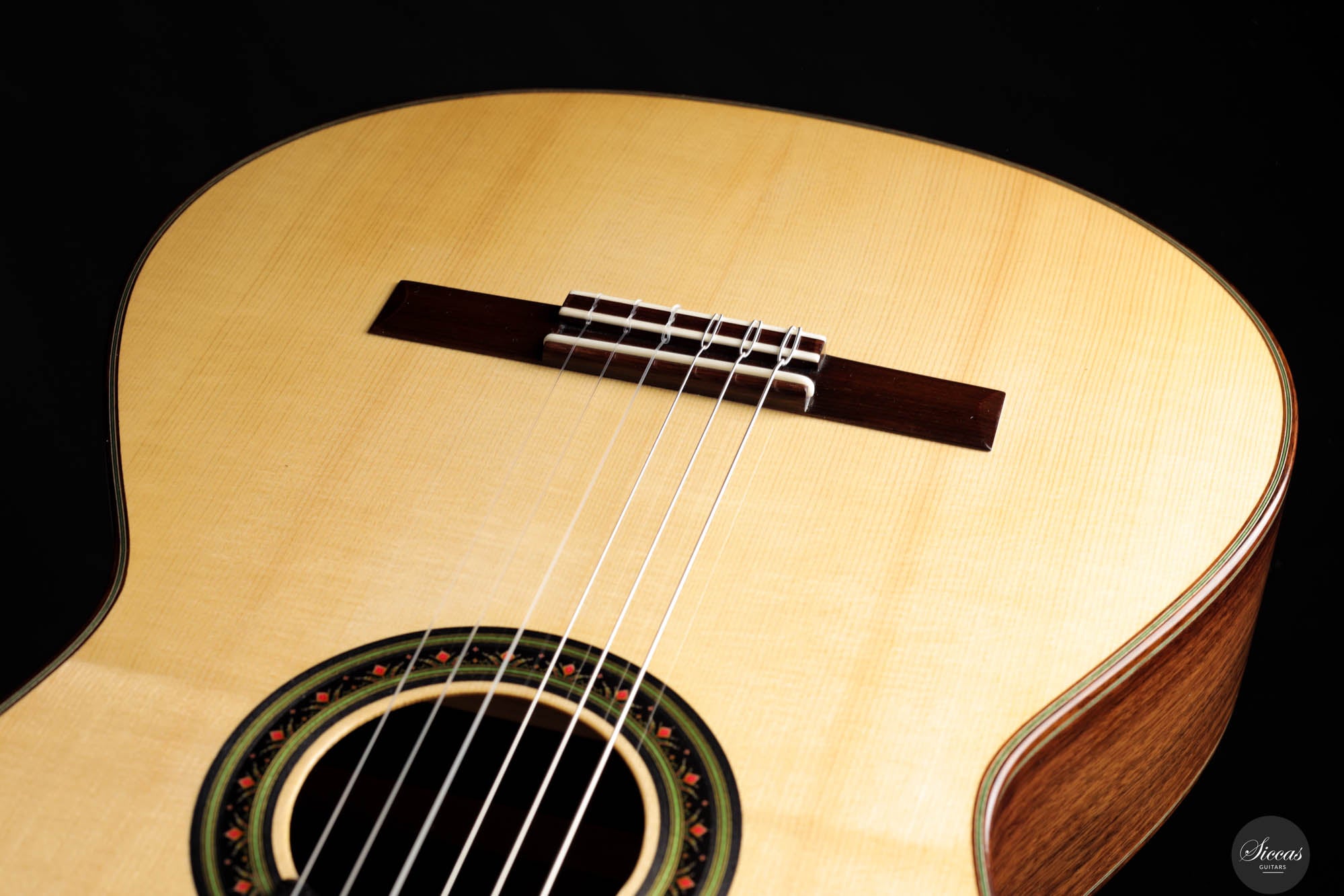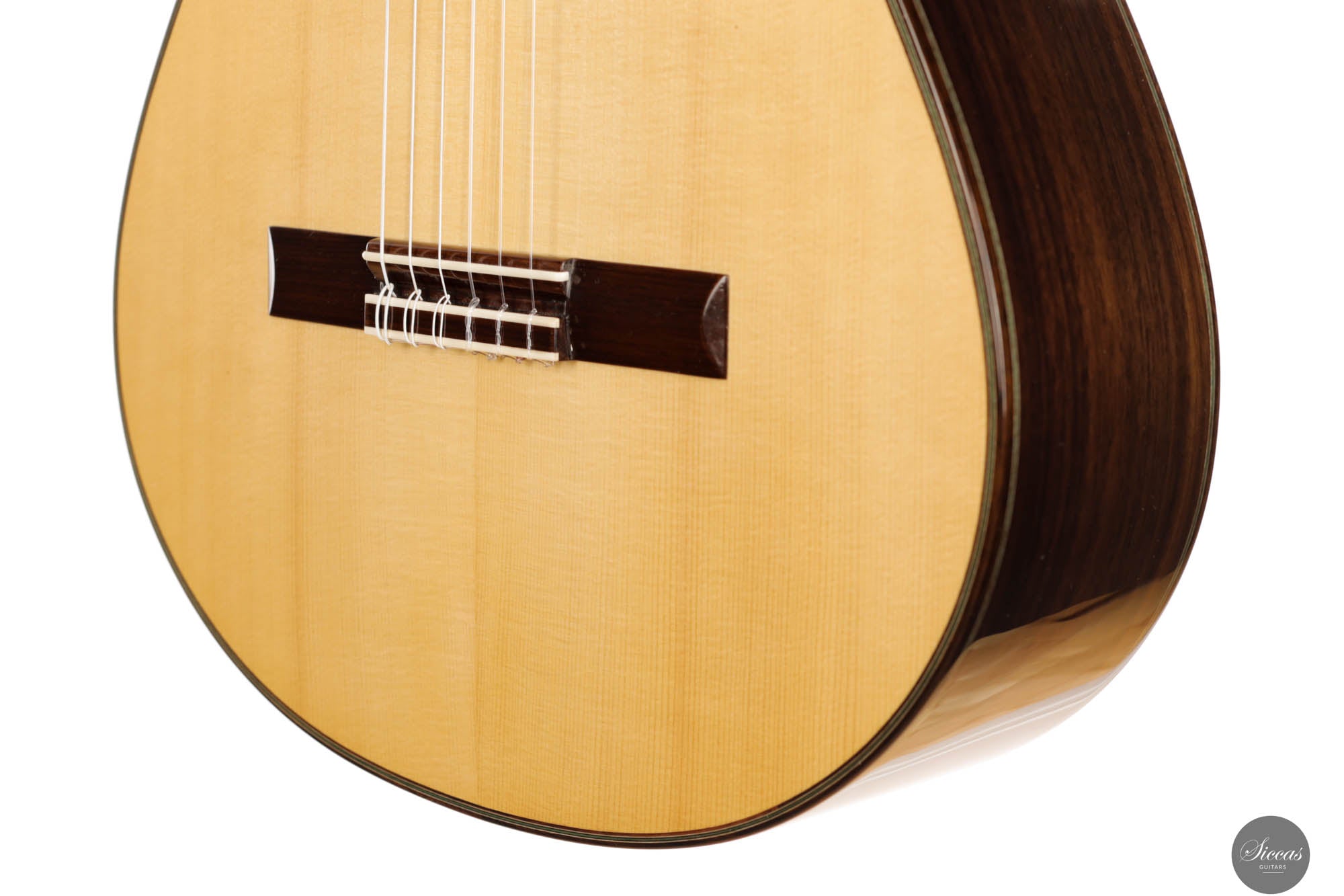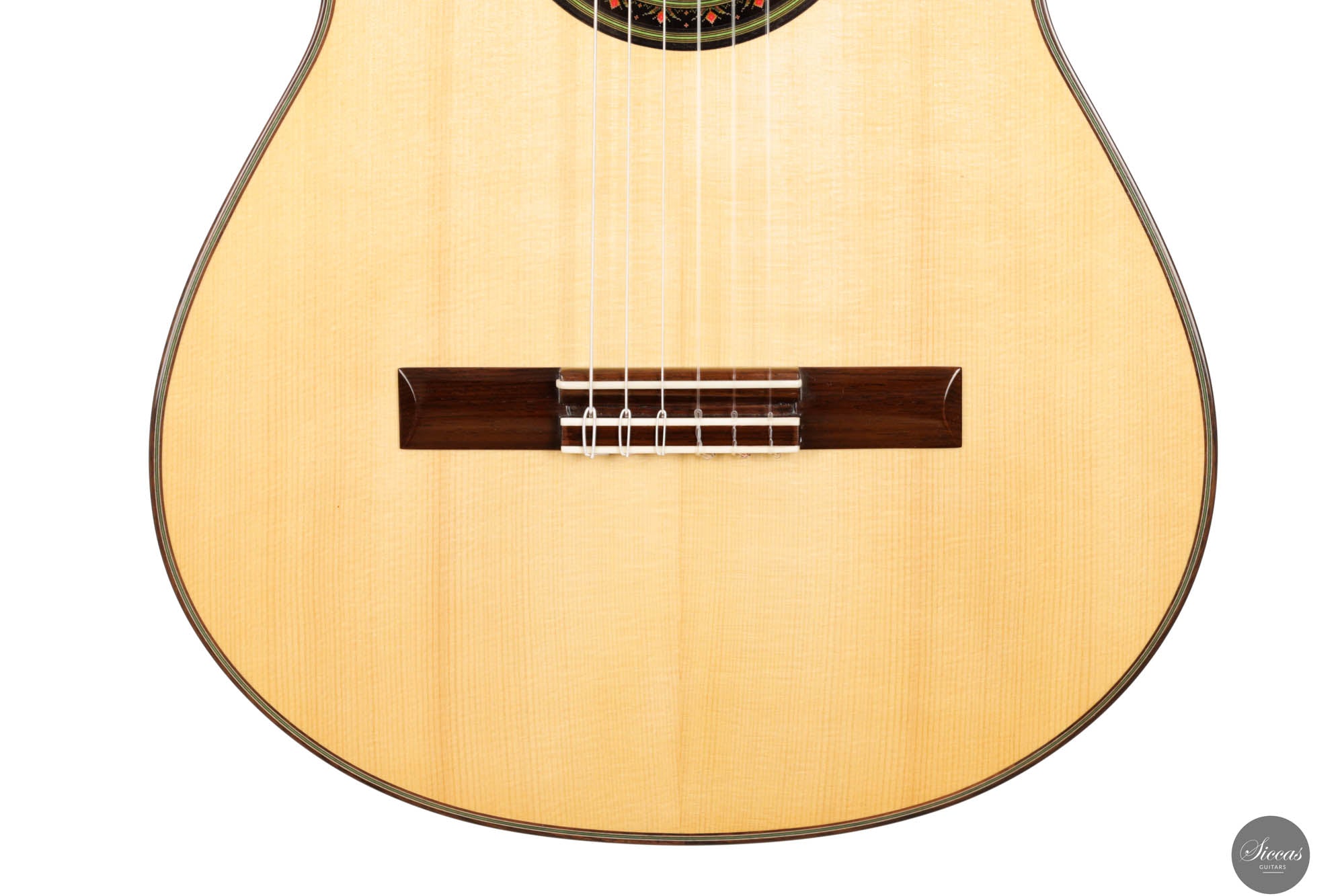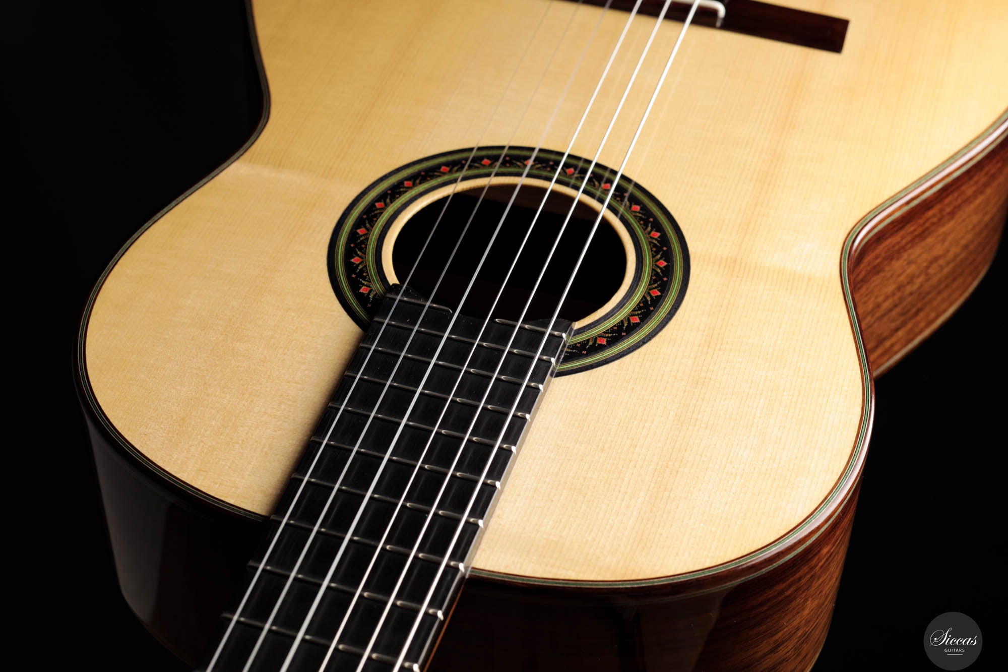 Diese exquisite Gitarre verfügt über eine Decke aus feinstem Alpenfichtenholz, bekannt für seine hervorragende Klangqualität, die wunderschön mit dem ästhetisch ansprechenden und klangvollen indischen Palisander für Rücken und Seiten kombiniert ist. Das Gesamterscheinungsbild strahlt eine verfeinerte Eleganz aus, die durch das Schellack-Finish verstärkt wird, das nicht nur schützt, sondern der Gitarre auch einen glänzenden Schimmer verleiht. Weitere Ergänzungen zu ihrem anspruchsvollen Design sind die Alessi-Mechaniken, bekannt für ihre Präzision und Zuverlässigkeit, die zum Premium-Feeling der Gitarre und zur Leichtigkeit des Stimmens beitragen.