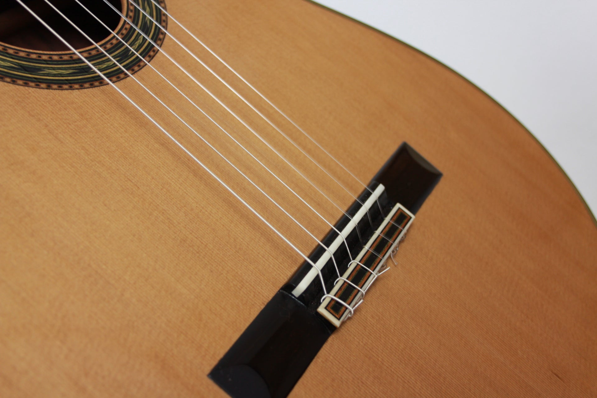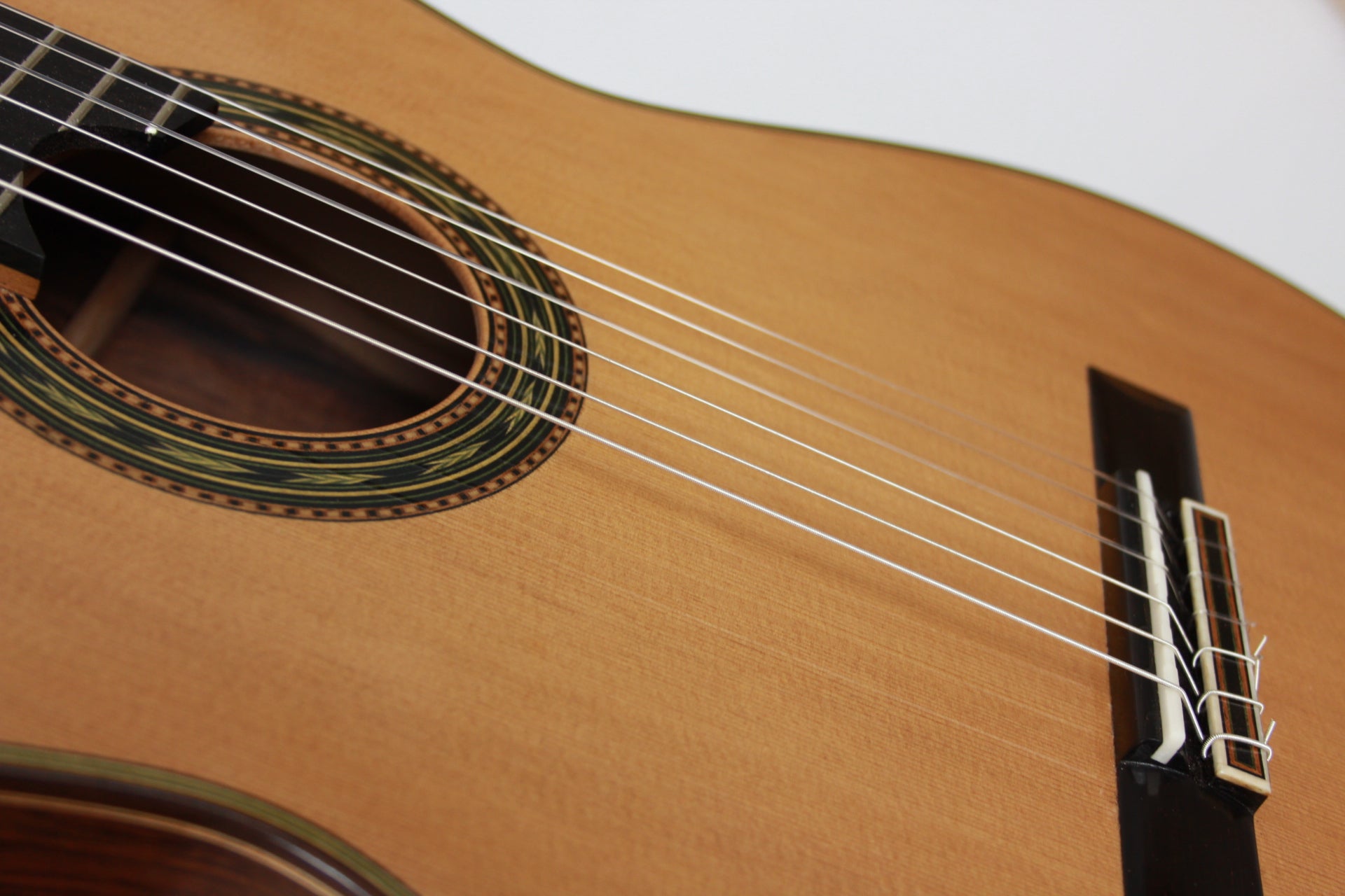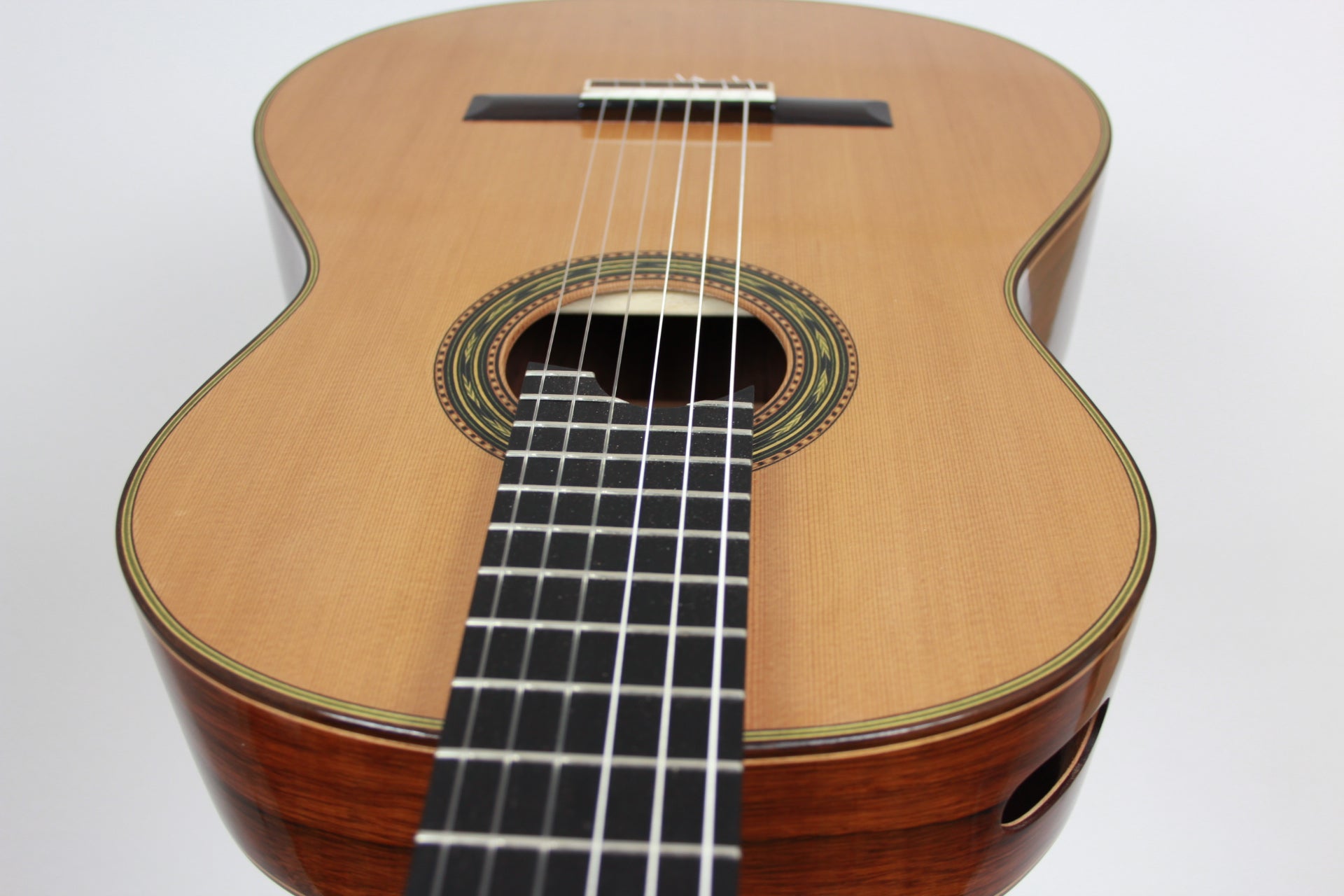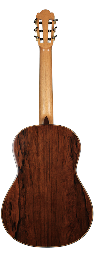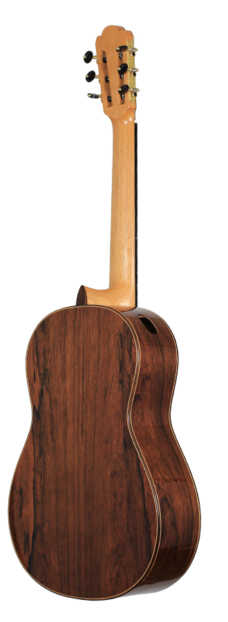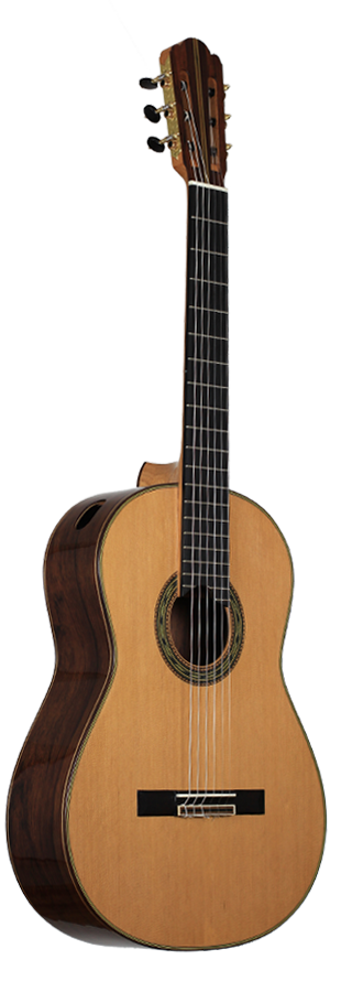 Cedar double top number 70 with Madagascar rosewood back and sides, 650 mm scale, elevated fingerboard, Alessi tuning machines, 12 hole bridge, oval soundport. D'Addario Pro Arte medium tension strings (except G which is Oasis carbon string). Included is a Hiscox PRO-GCL case.