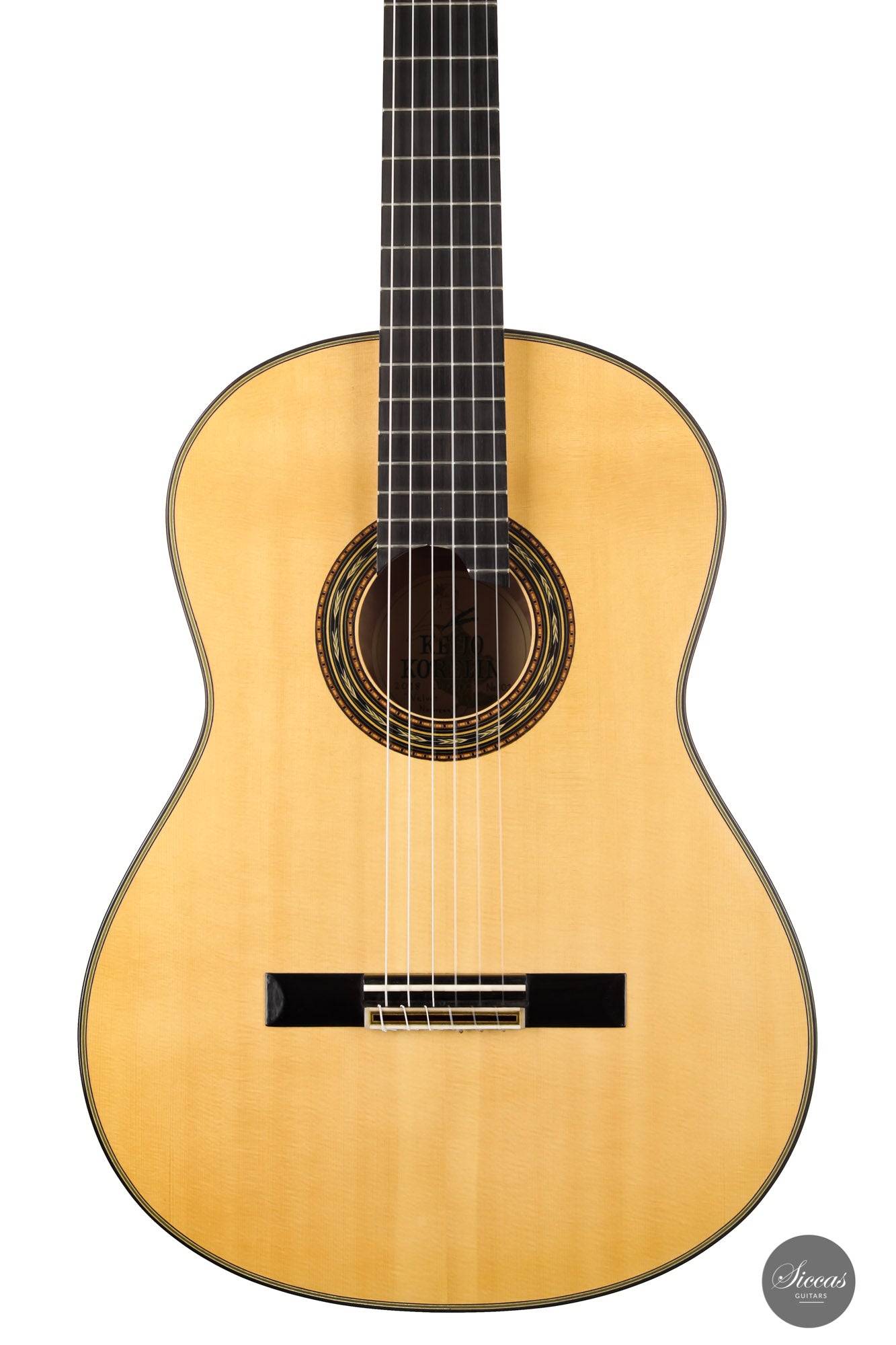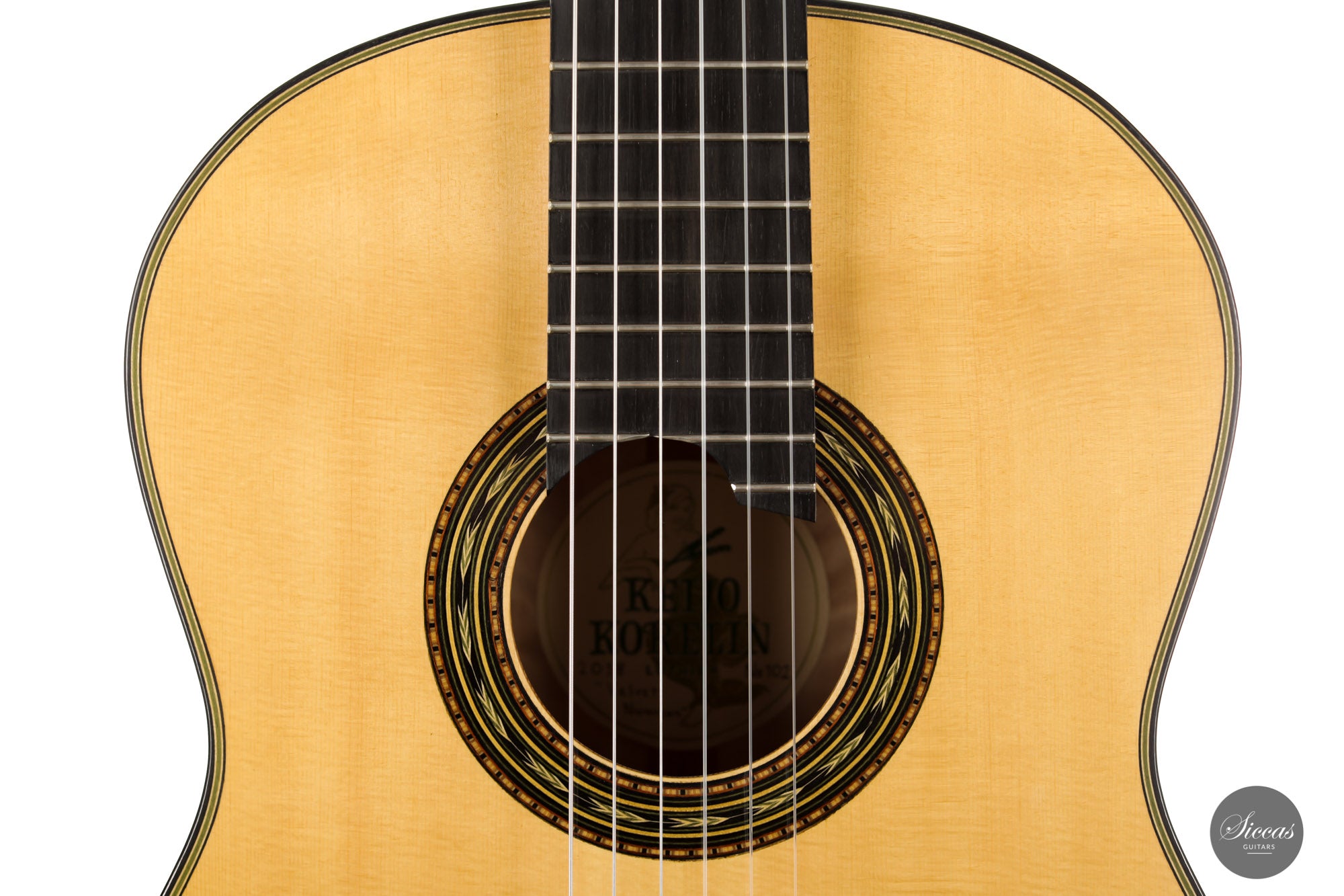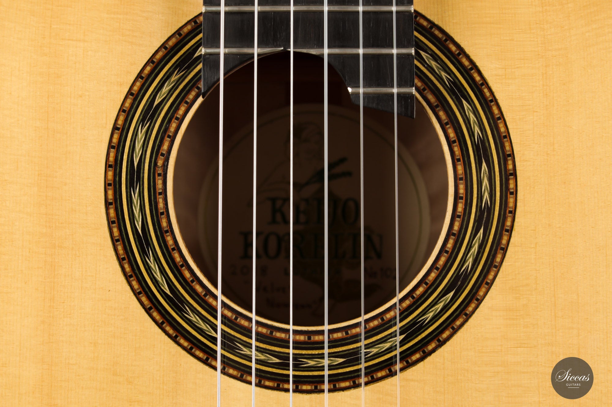 This beautiful "Triticum" double top concert guitar is a very special instrument. It is a combination of Antonio de Torres' legacy, Korelin's own ideas, and modern building techniques. For example, it features a Nomex double top and a raised fingerboard, combined with a more traditional fan bracing. Interestingly, the outside of the top is made of spruce, while the inner part is made of cedar. This combination provides a warm and accurate tone, with great timbres and superb sustain. Keijo has been striving for years to replace all exotic woods with local ones, and this guitar is a perfect example of succeeding. The back and sides are made of Arctic birch, a fantastic tonewood, as this guitar proves. The instrument was built in 2018, served as a reference guitar, and therefore has not had a previous owner.