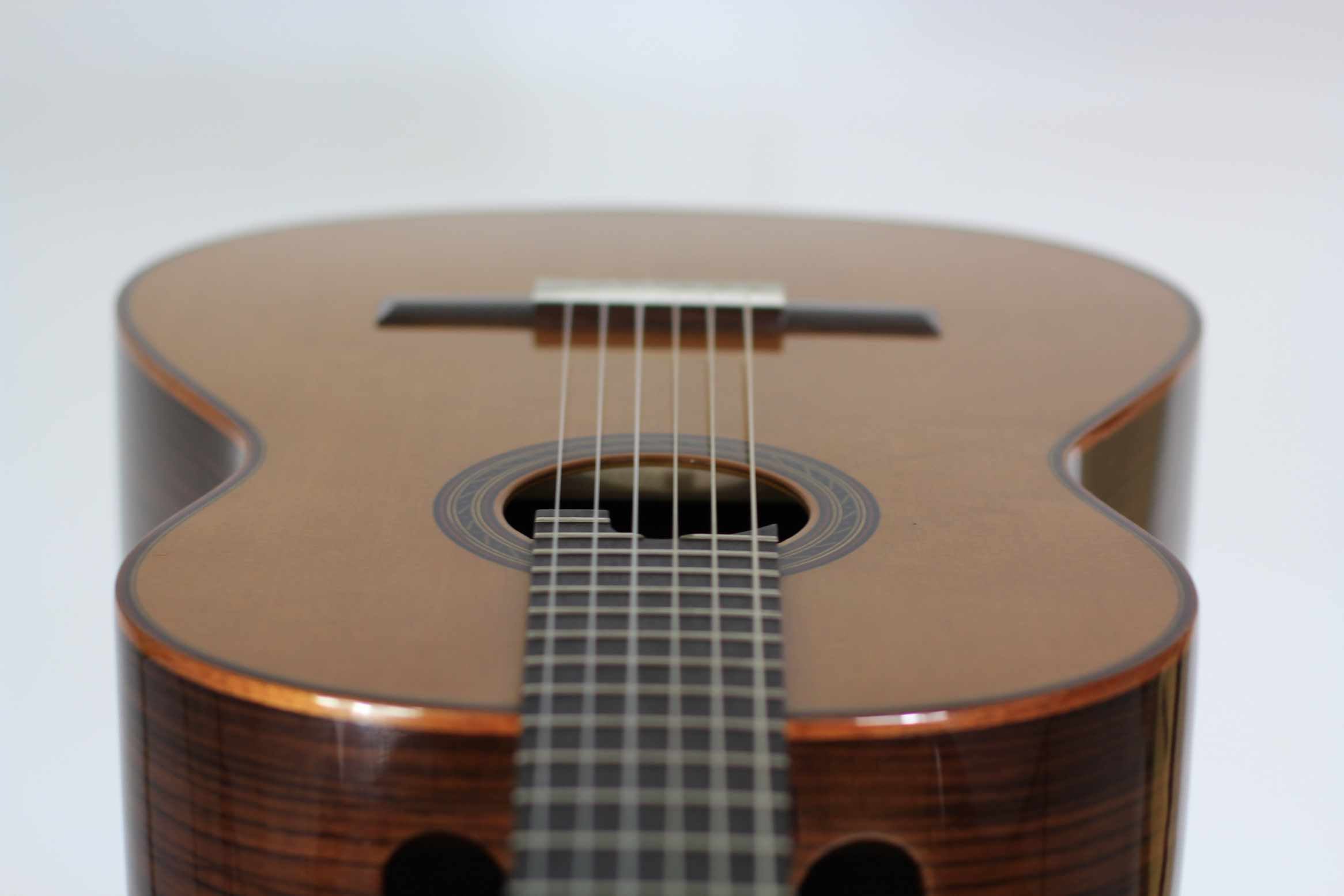 As President of Hill Guitar Company,Inc., Kenny continues to develop the Hill Guitar line in Santa Cruz building fine classical guitars for the world market. This is the location where luthiers are making the entire range of Signature, and Performance model guitars. Kenny Hill has written many articles for various guitar publications, including Acoustic Guitar, Soundboard, and American Lutherie. This guitar is designed for the player desiring a nylon string instrument with easy left hand reach. It has a double top made of two very thin layers of cedar, Nomex and spruce. In this case the cedar is facing out and gives the sound its dominant character, while the inner layer flavours it.